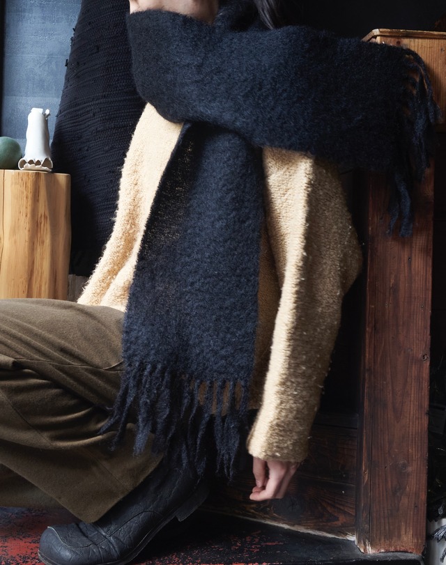 ブラックのモヘア素材を使用したロングヘアーのマフラー。 アンゴラヤギの毛から作られる天然繊維で、絹のような光沢と長い毛足が特徴的なモヘア。 柔らかい肌触りが特徴の高級素材です。 保温性・吸湿性・通気性に優れ冬にこれまた首元寂しい方へ。 素晴らしい気持ちを演出してくれるマフラー。 ファッションのコーディネートへもなり。 冬のレイヤード素材としても使えそうです。 そばに七味を入れる。 そんな感覚でしょうか。 年越しマフラーどうでしょうか。 実寸:平置き 総丈 155cm 横幅 22cm ブランド:80s euro カラー:ブラック 生産国:euro 素材:モヘア100%