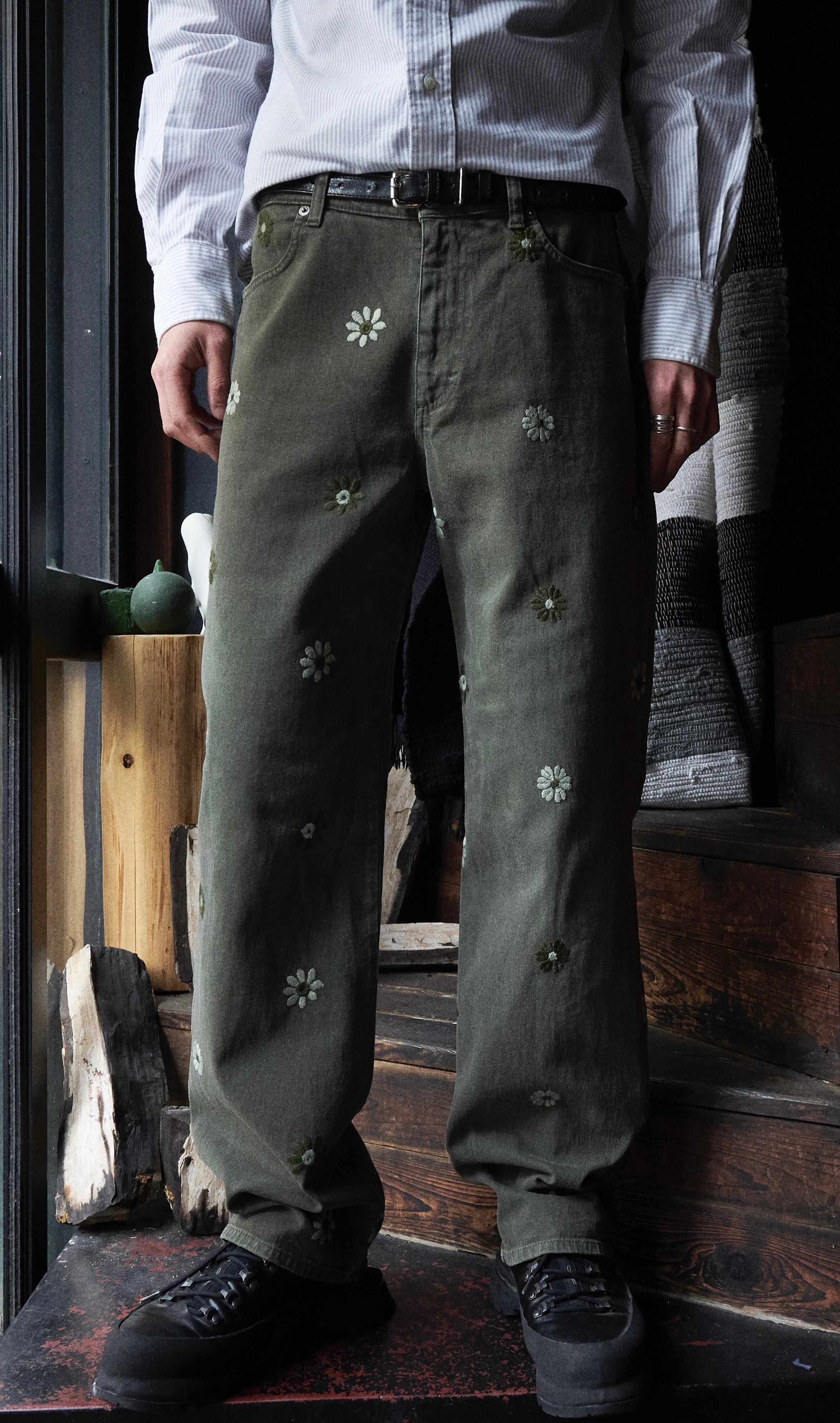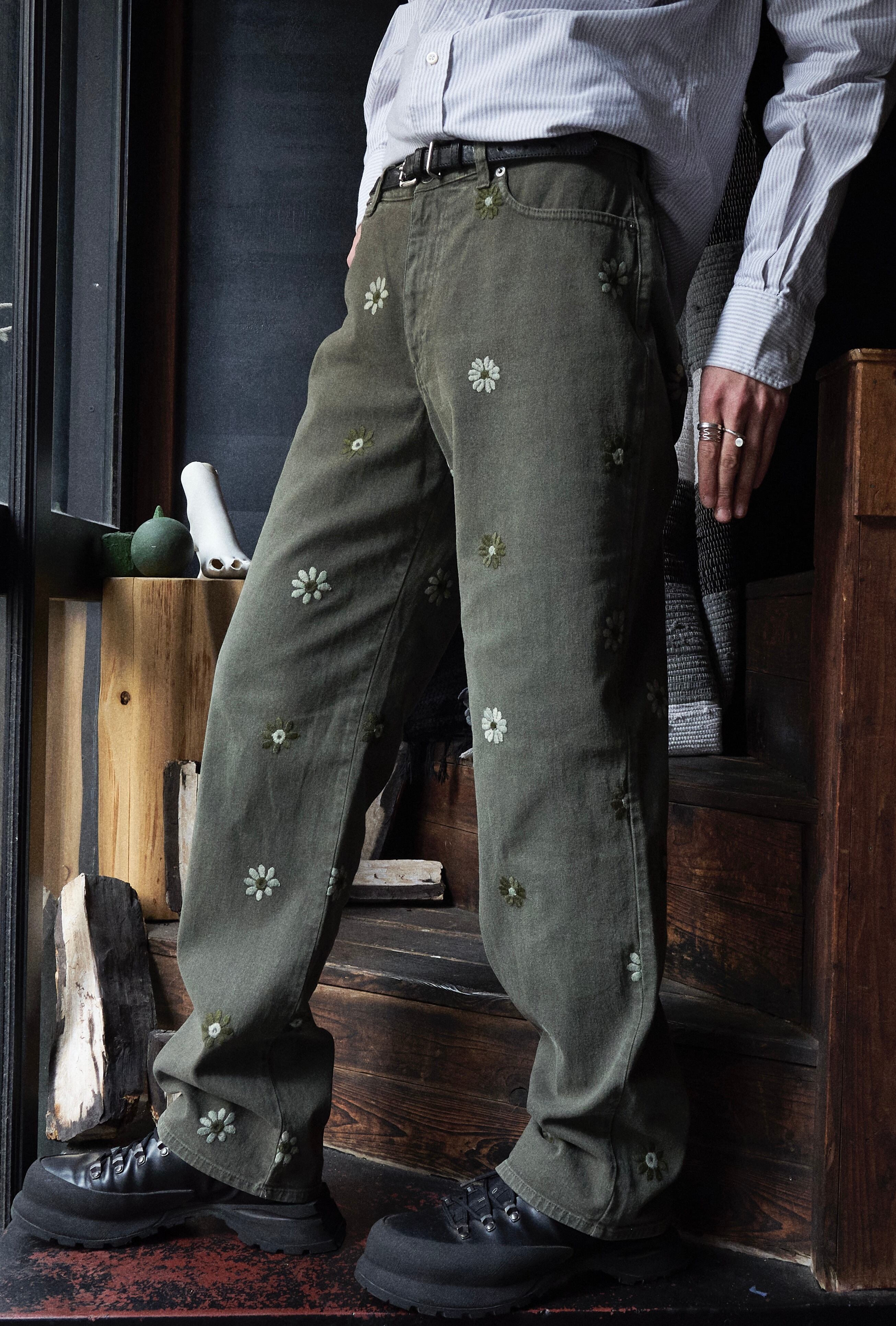 early 2000s euro faded green floral embroidered denim