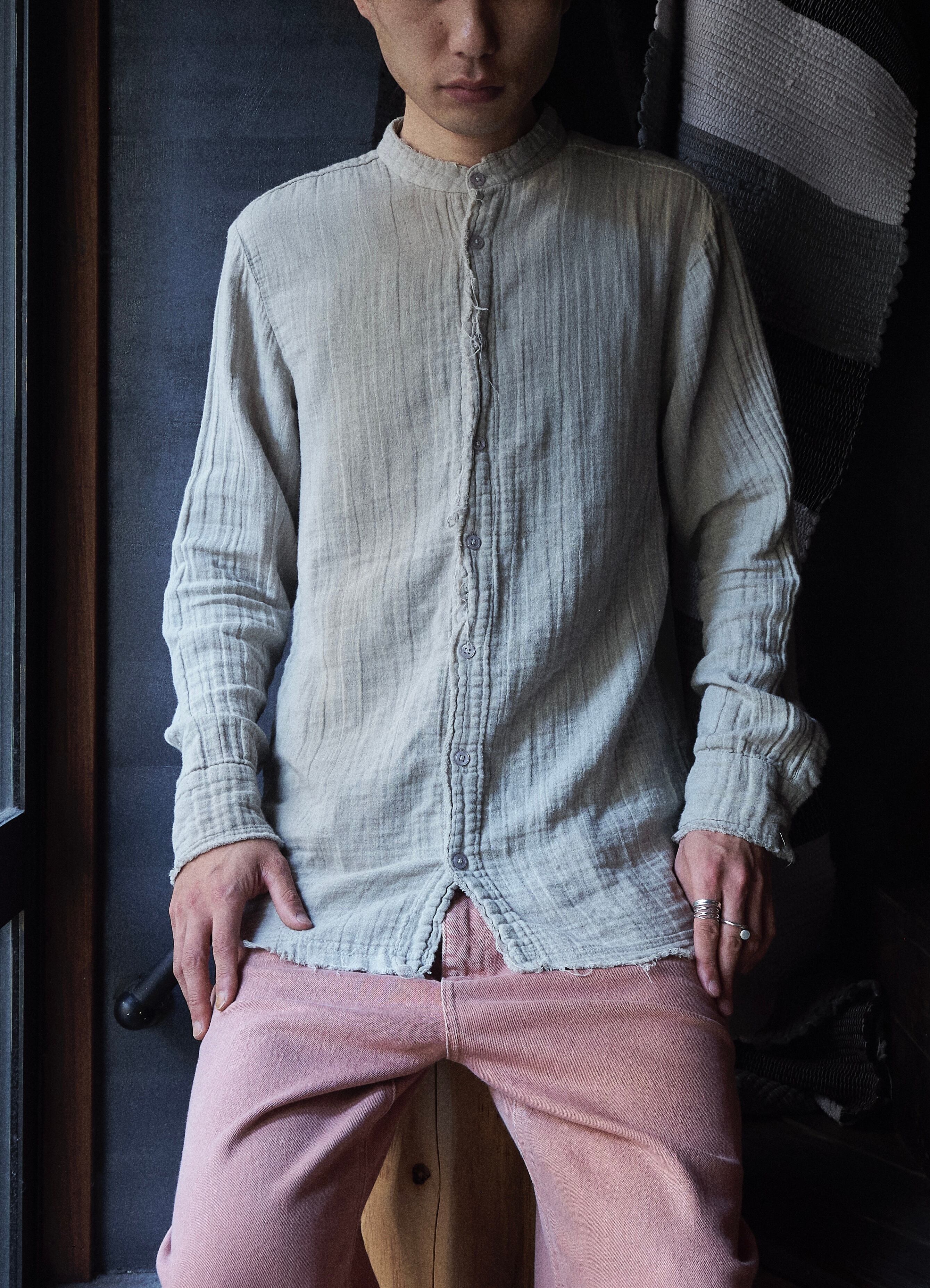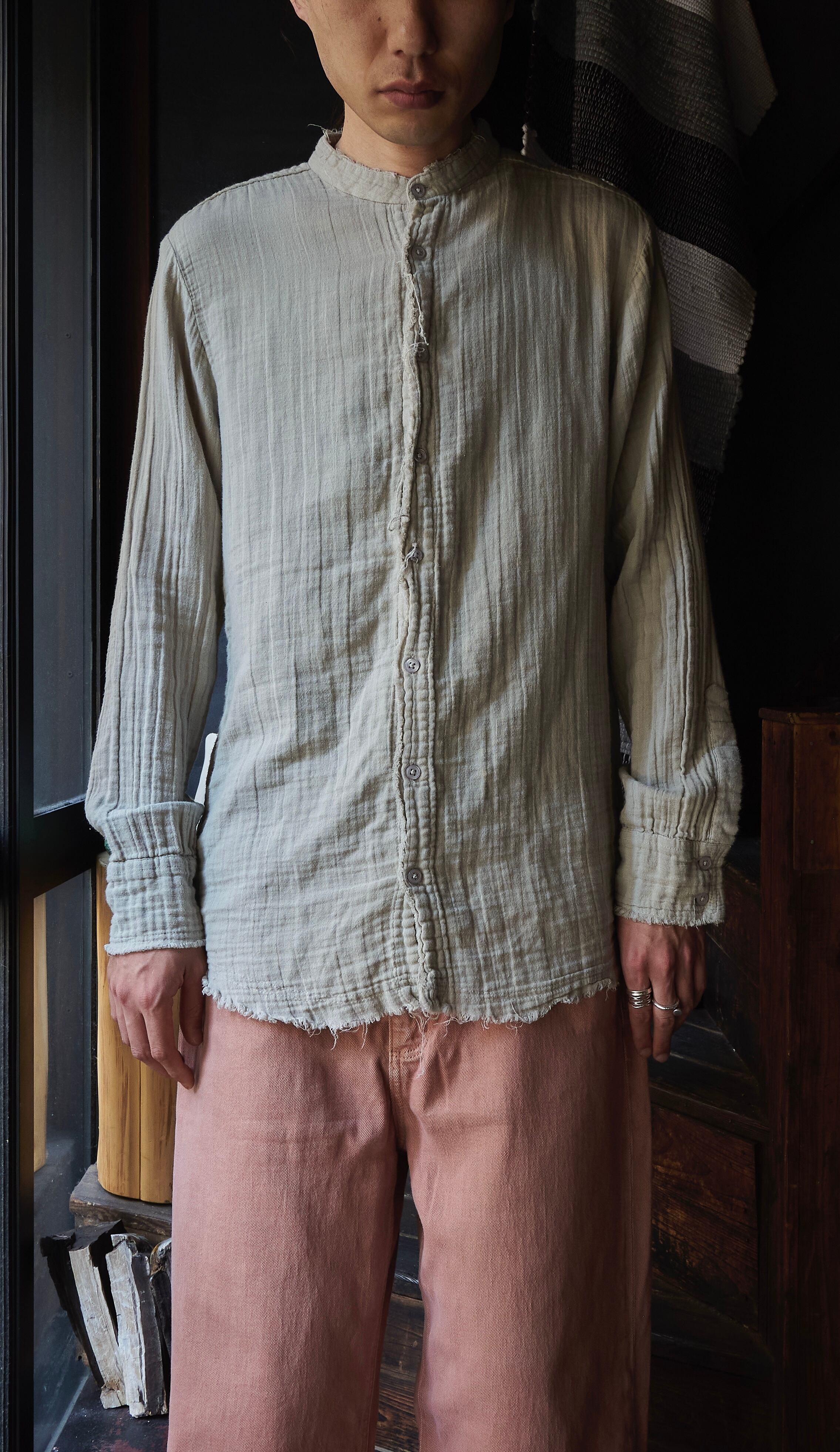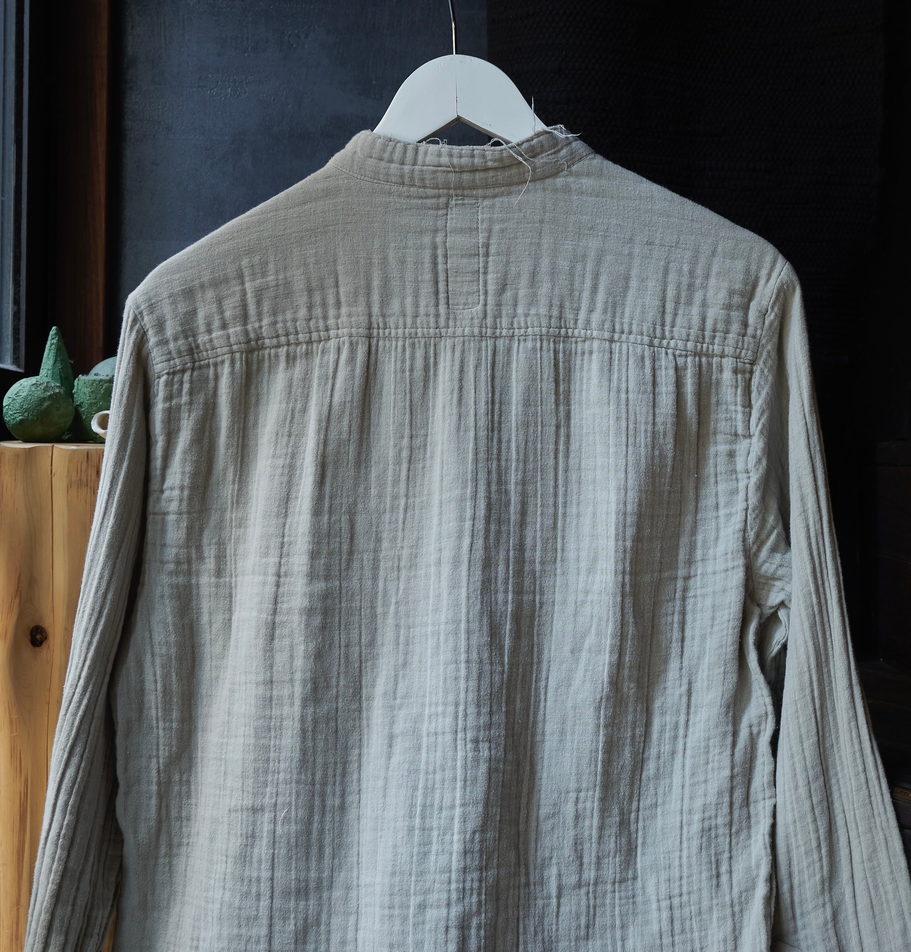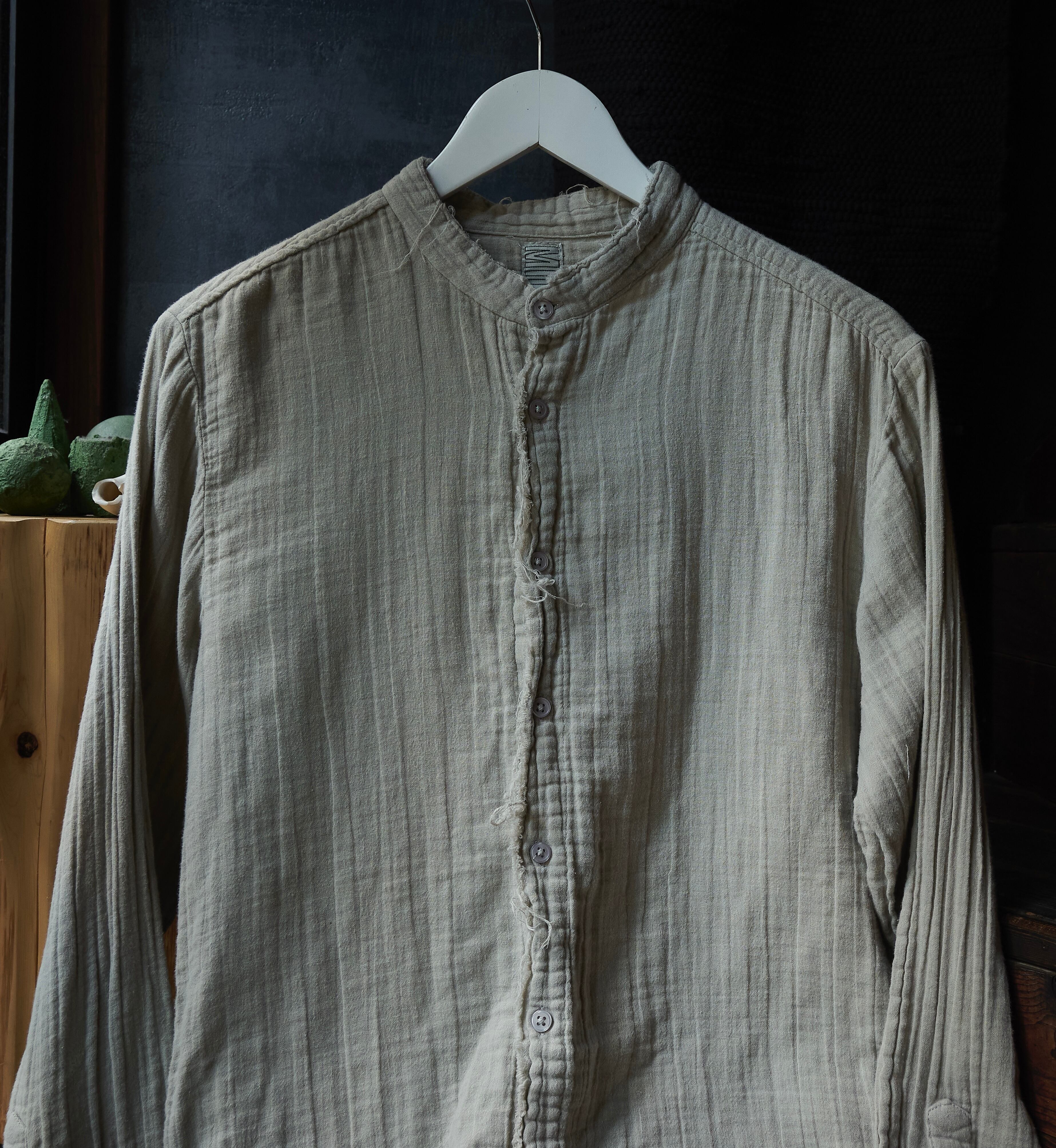 US 2000s Cut-off design Wrinkled Khadi Cotton Stand Collar Shirt