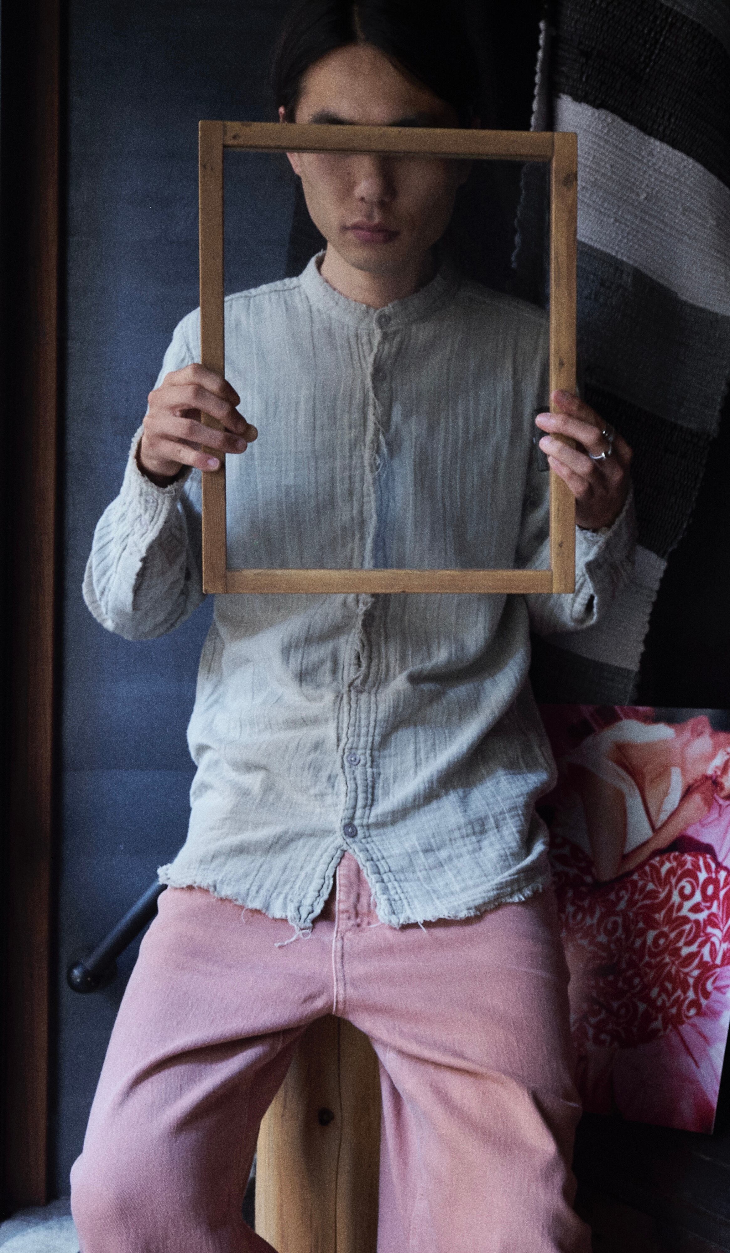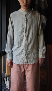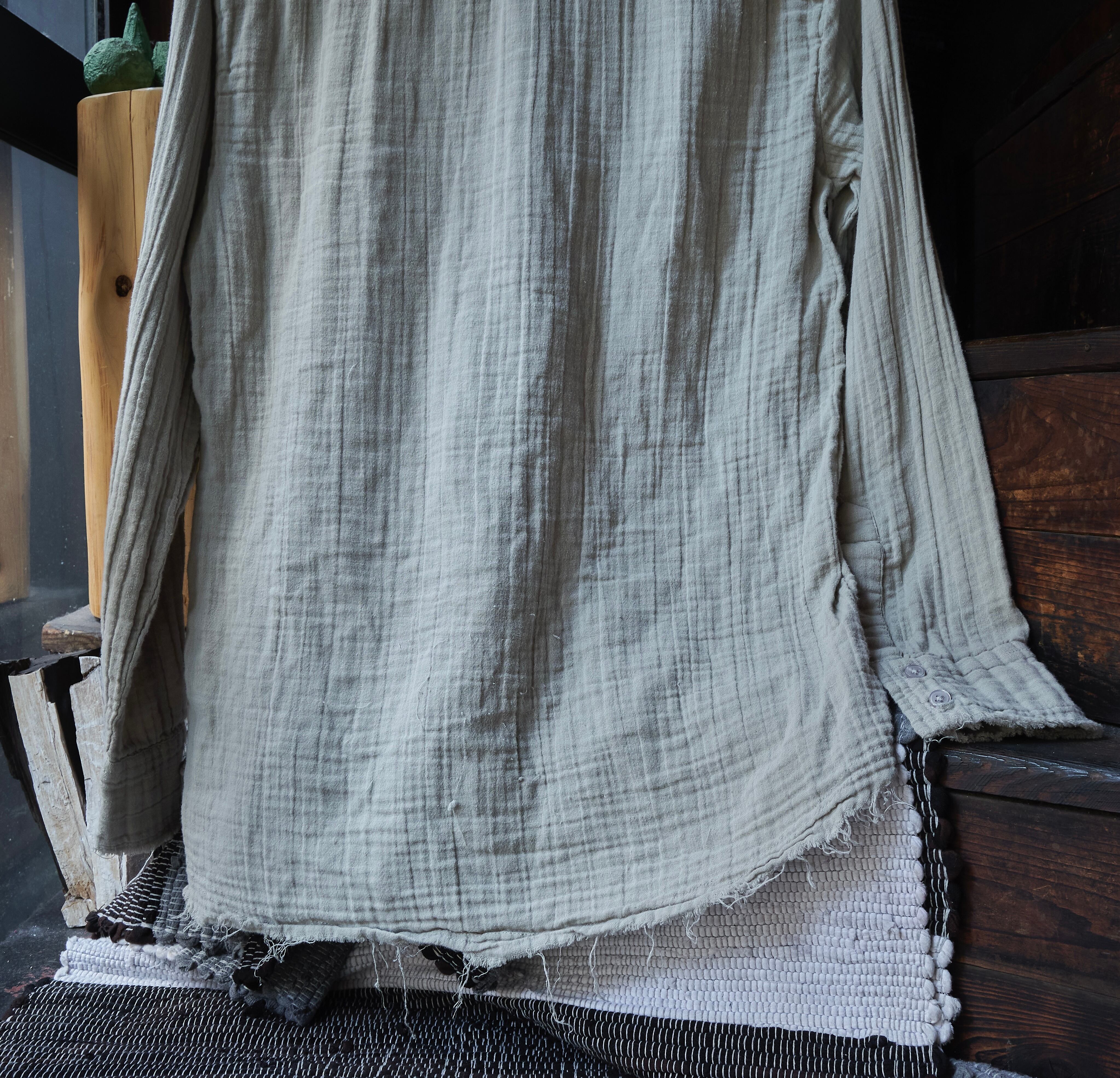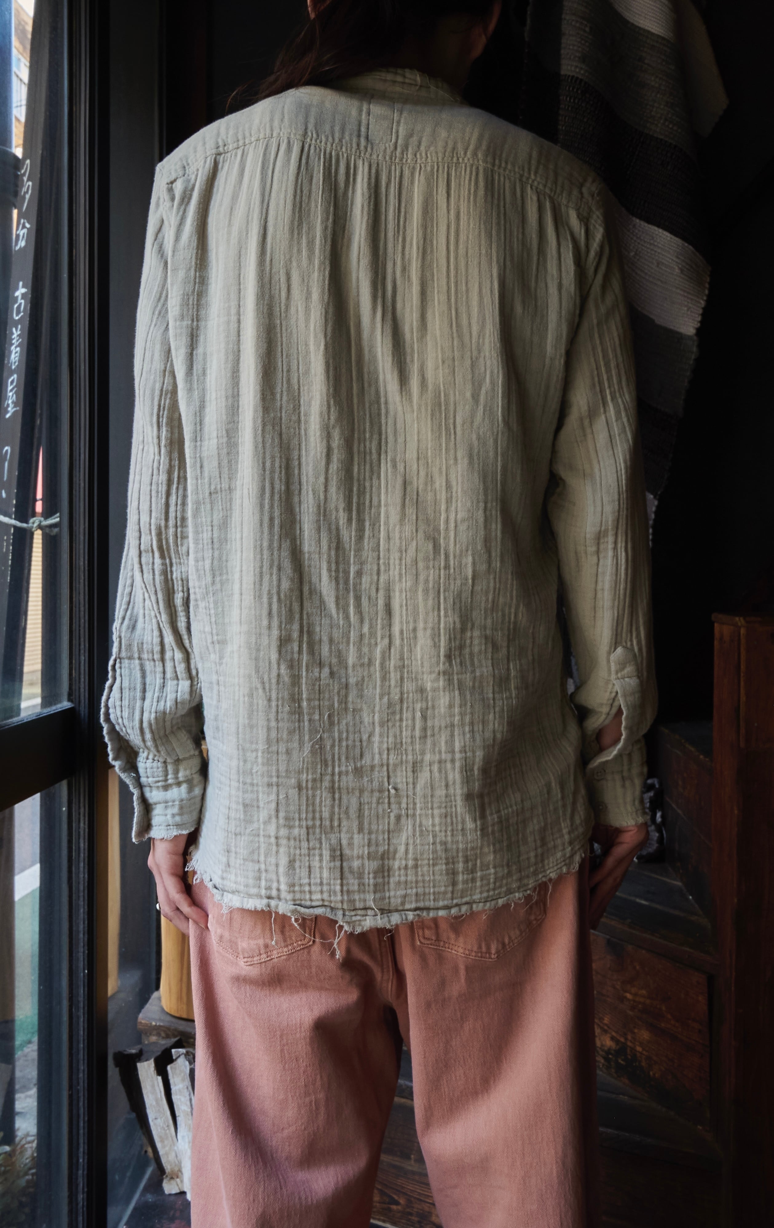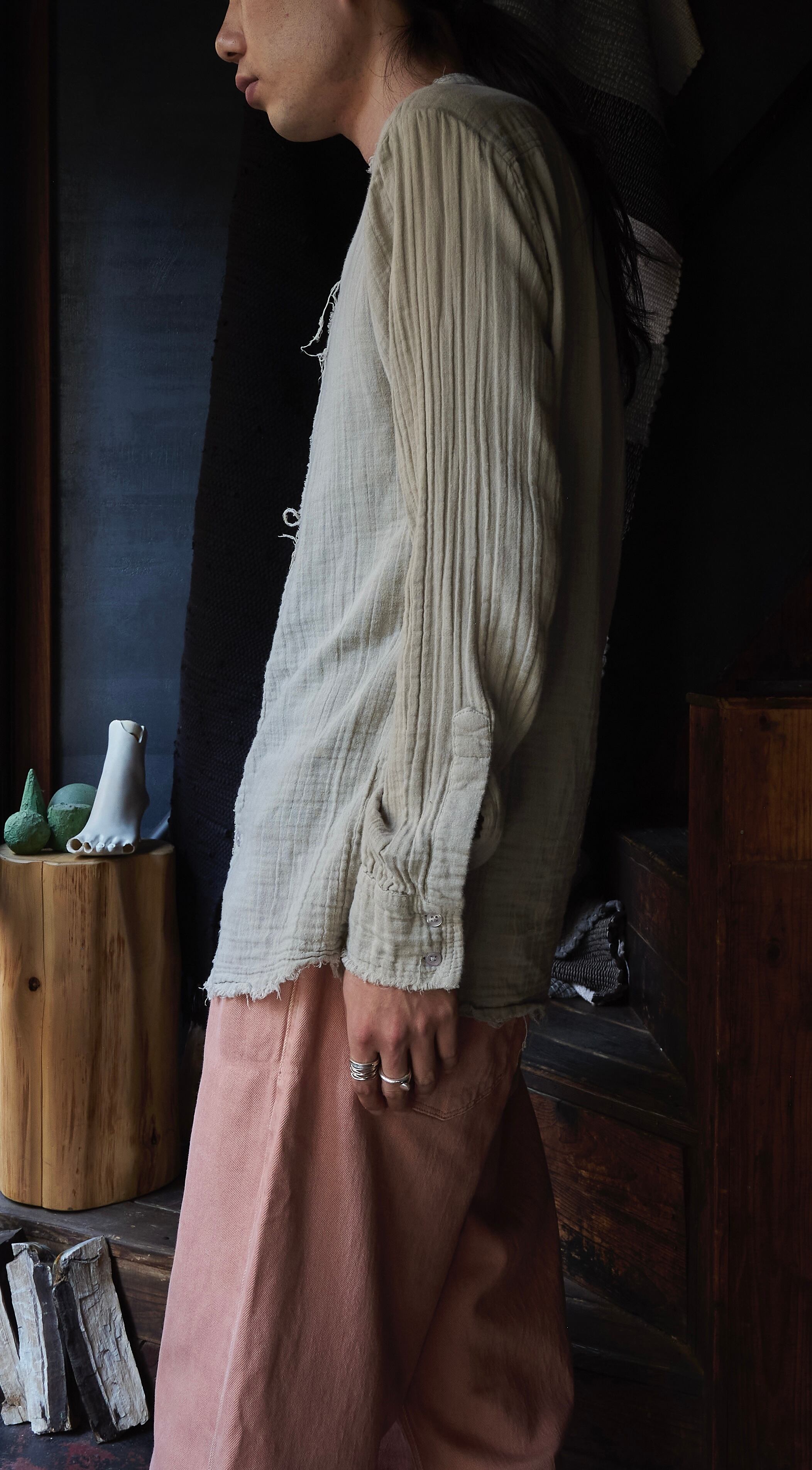 US 2000s Cut-off design Wrinkled Khadi Cotton Stand Collar Shirt