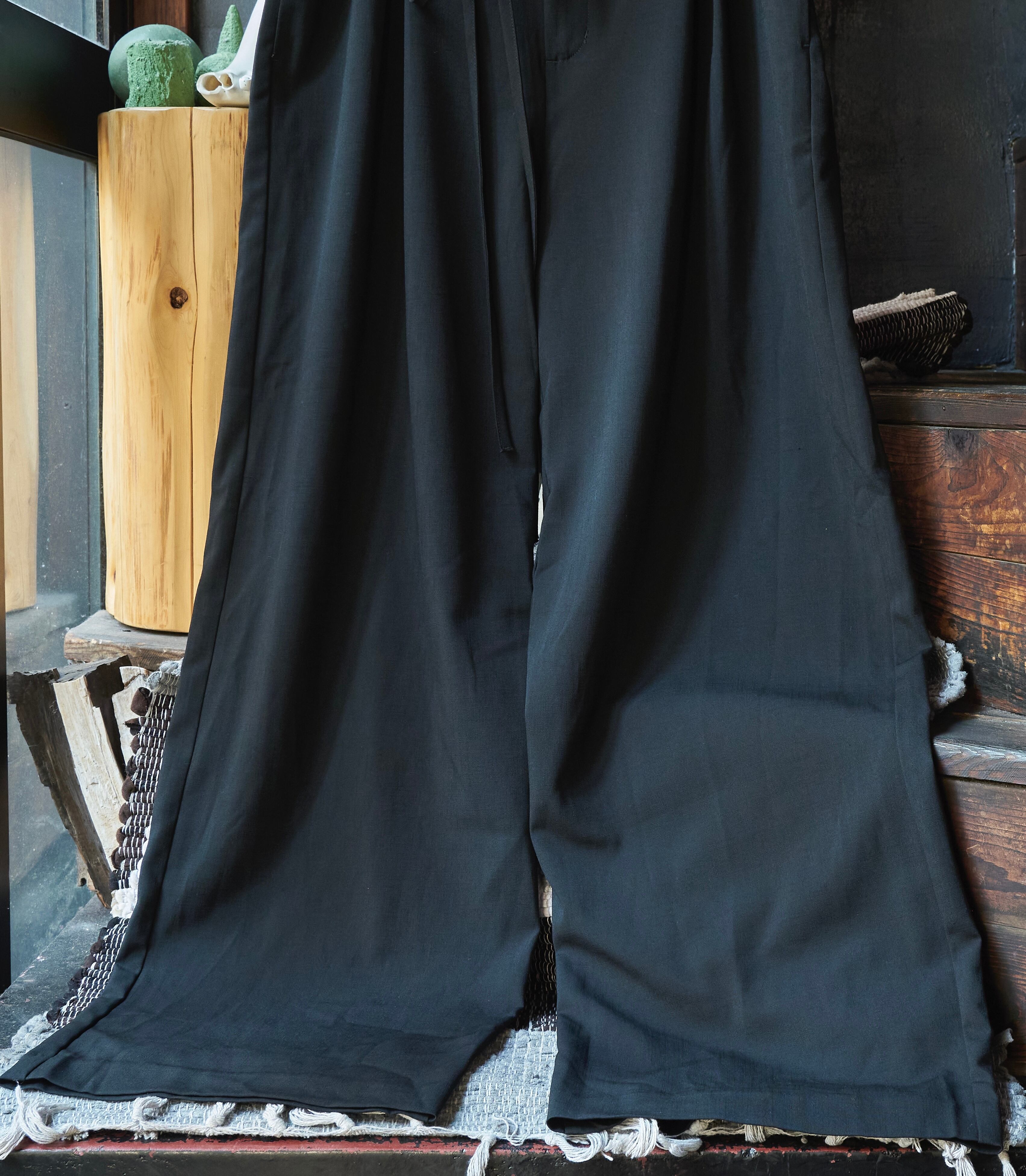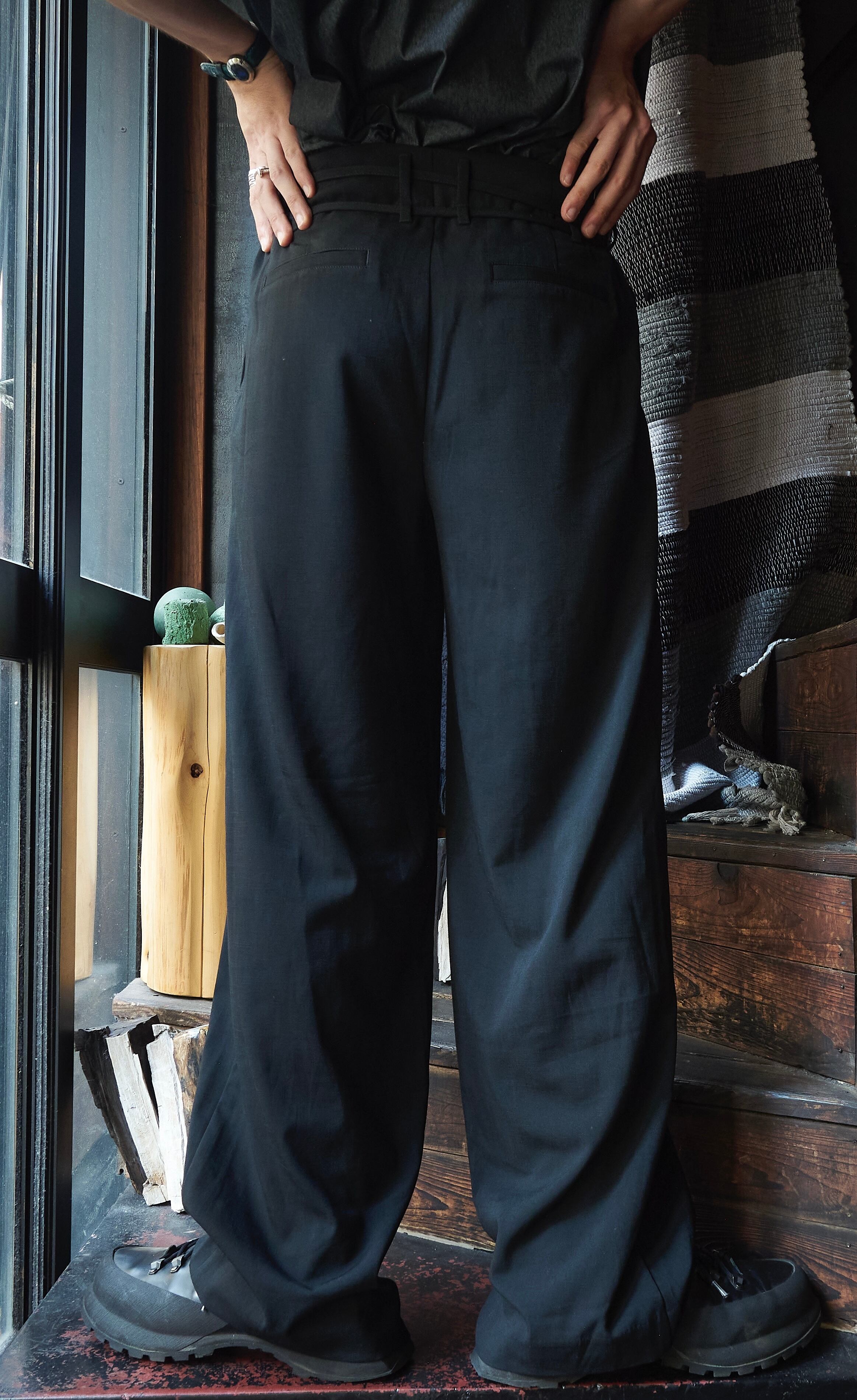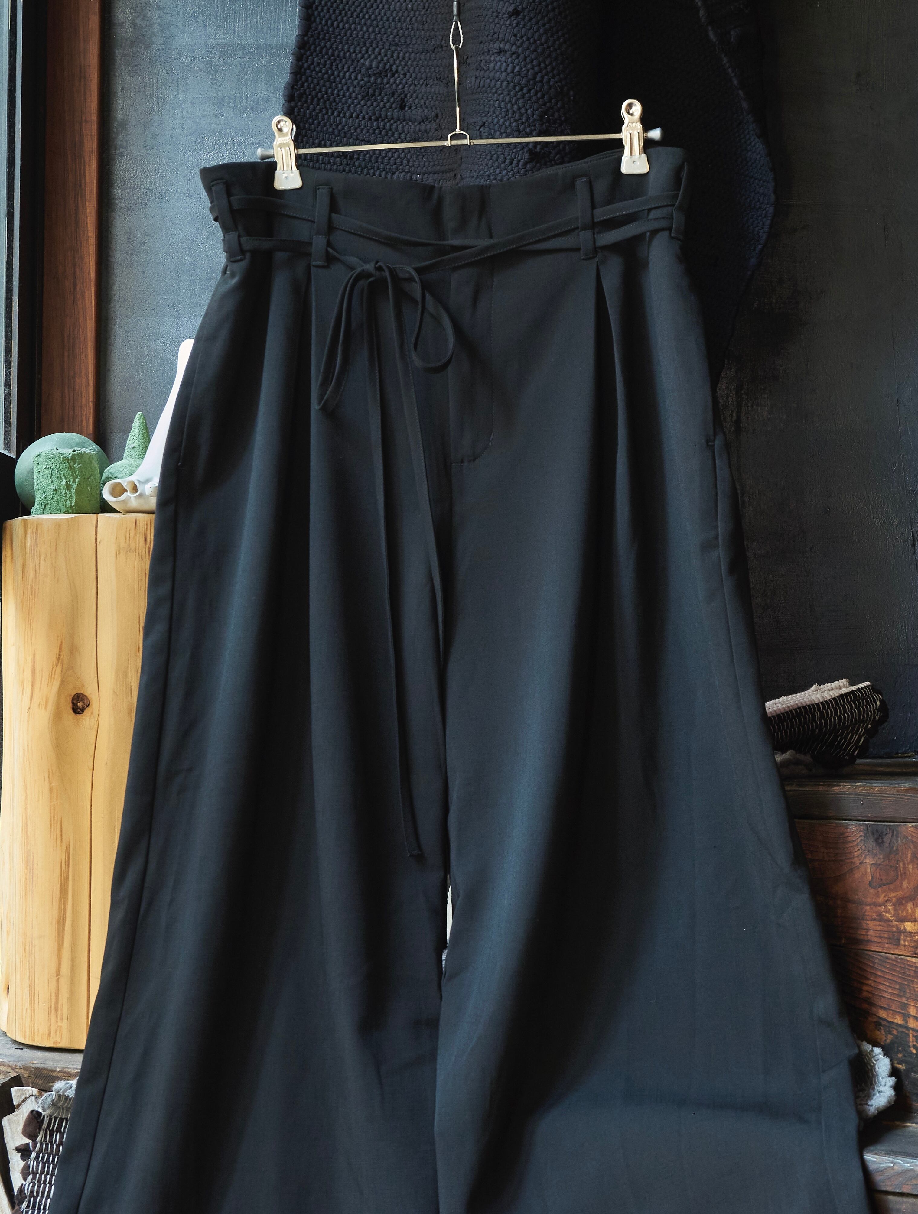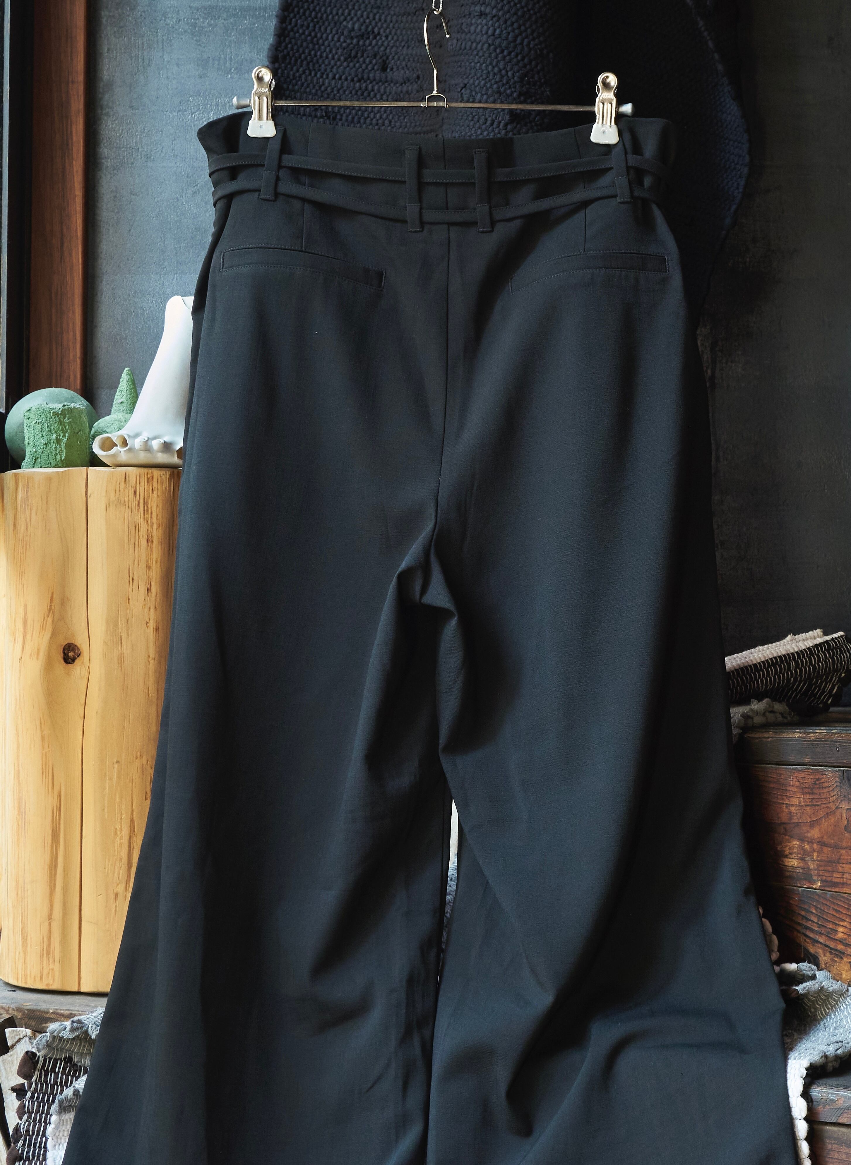 US 2010s Black deep tuck long drawcord belted design wide flared slacks