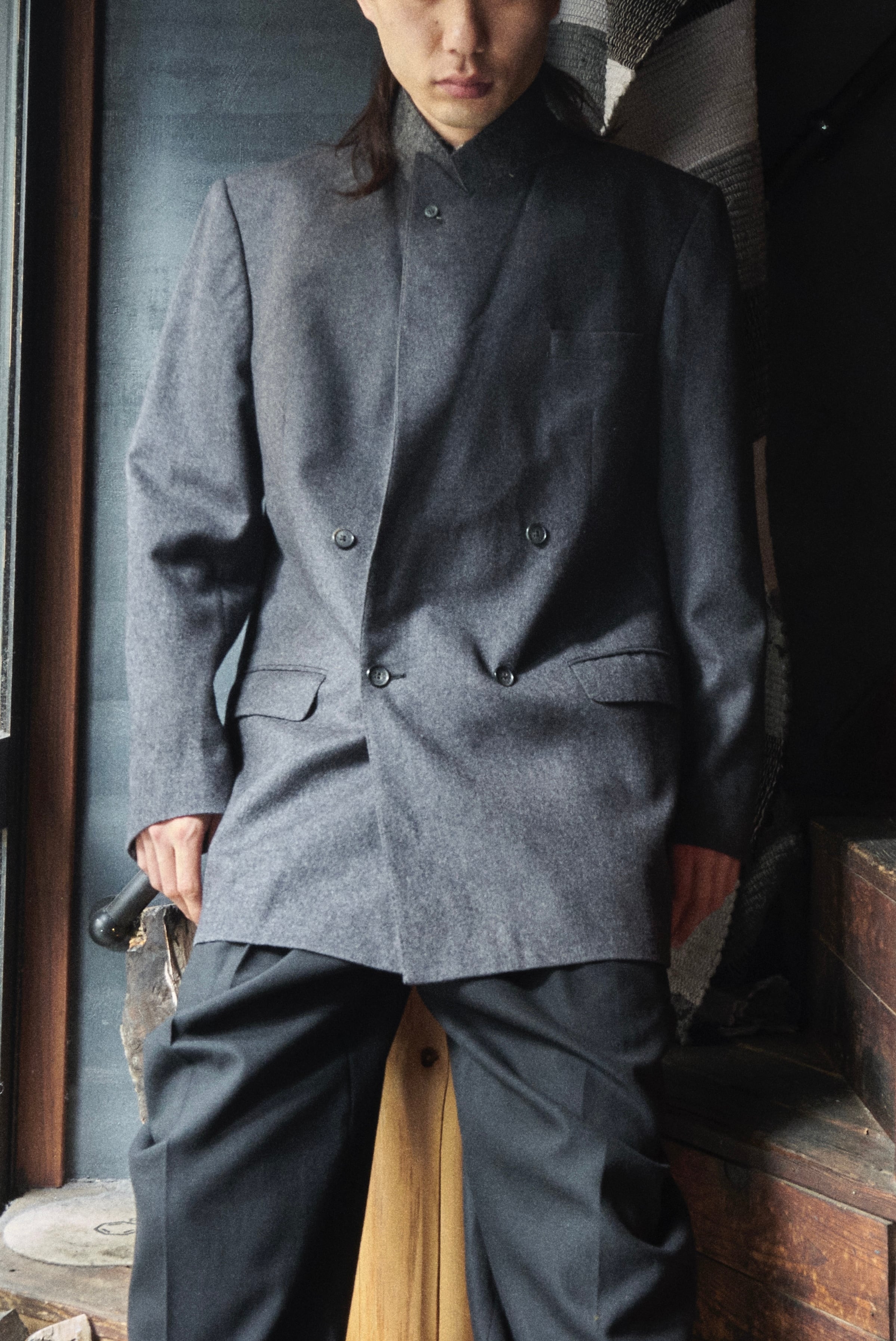 80s England Grey wool double breasted strap tailored jacket