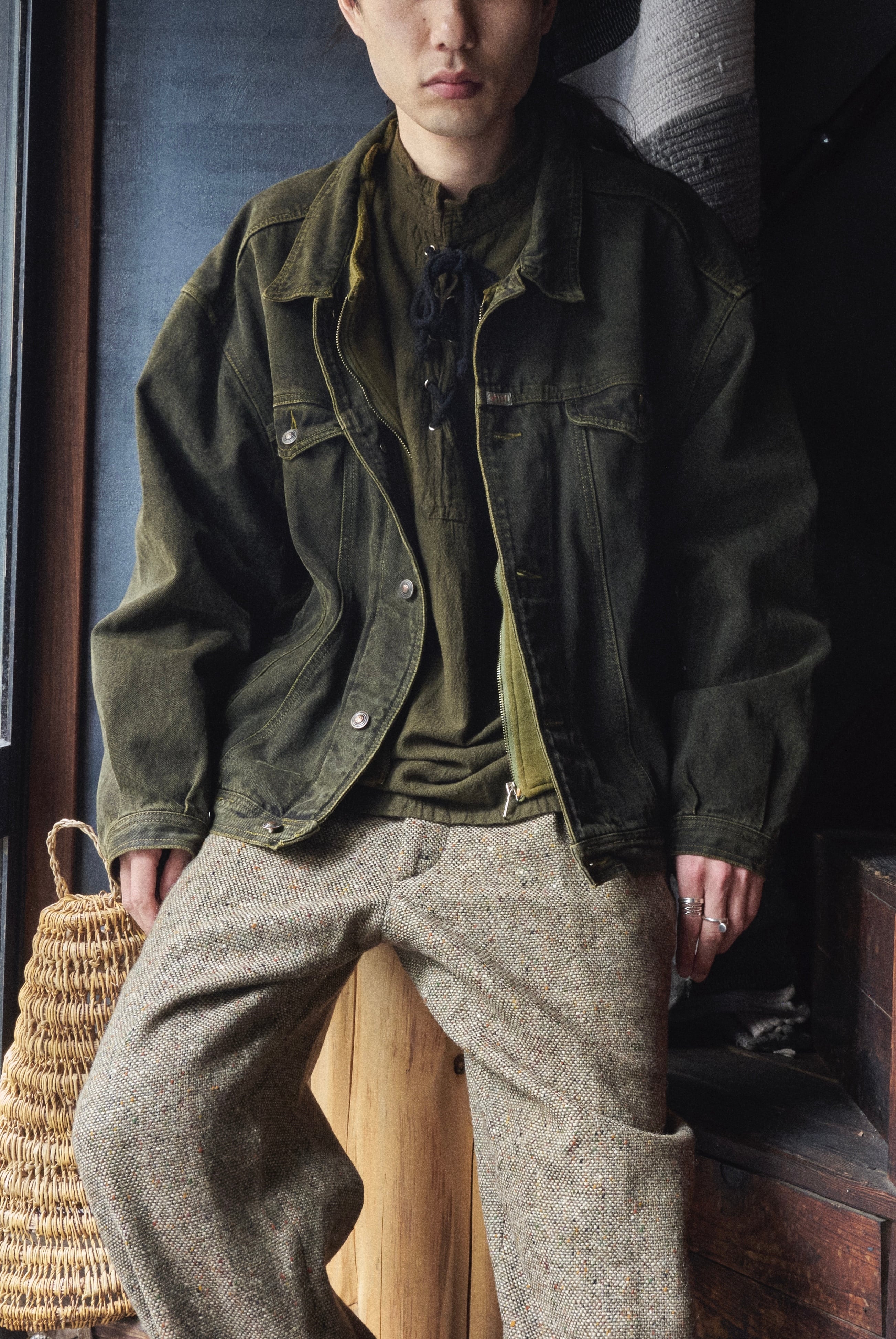 US 2000s Overdyed faded green sweat docking pattern denim jacket