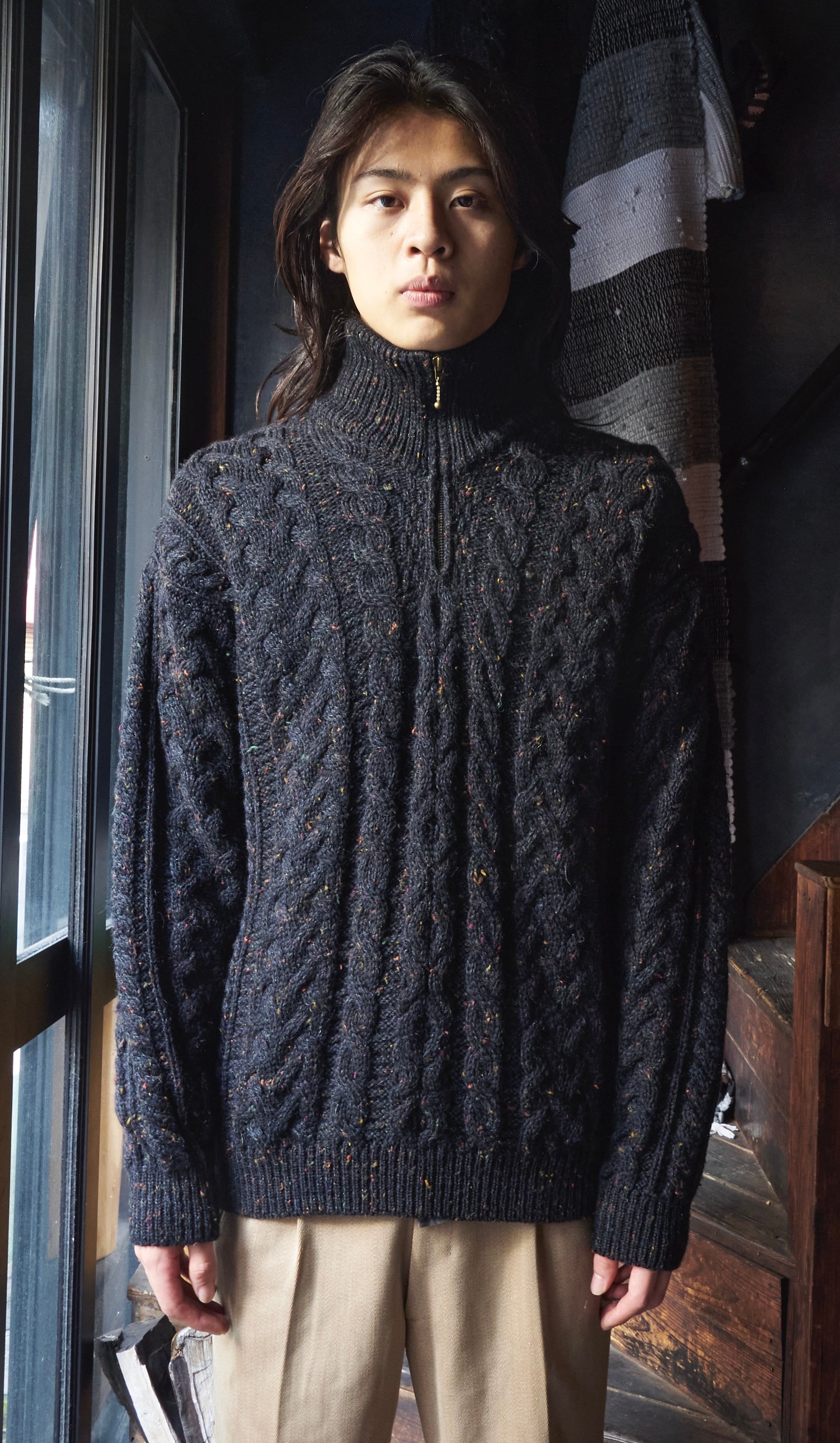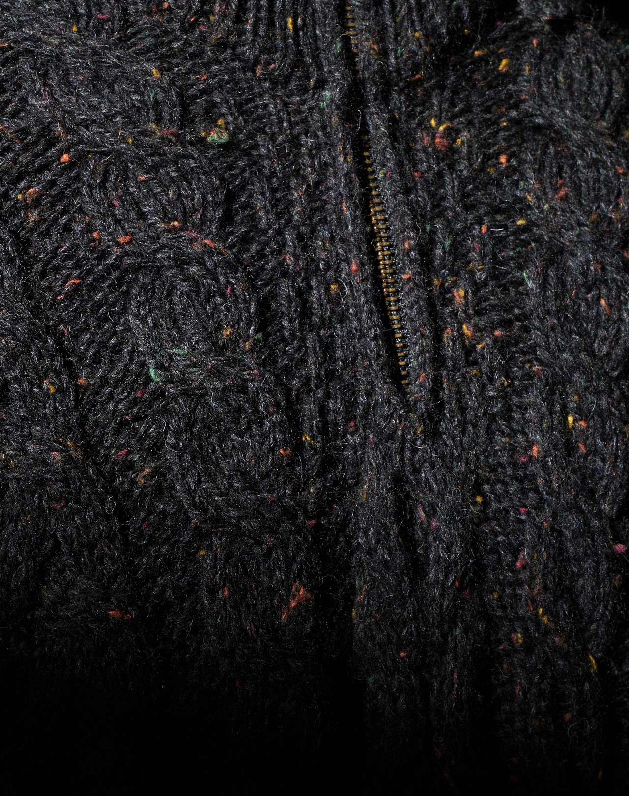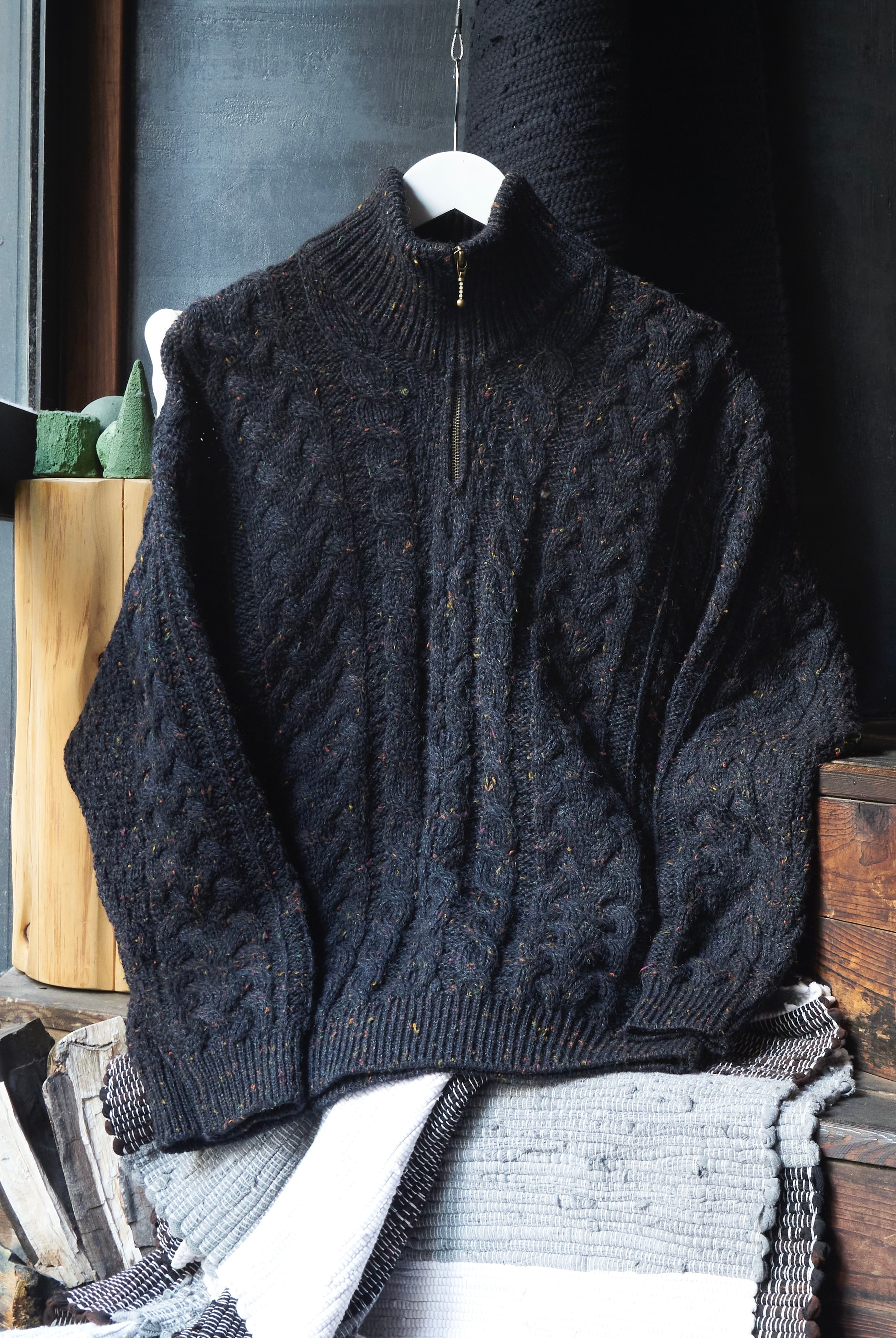 80s Ireland Black Wool Mix Color Nep Half Zip Aran Sweater