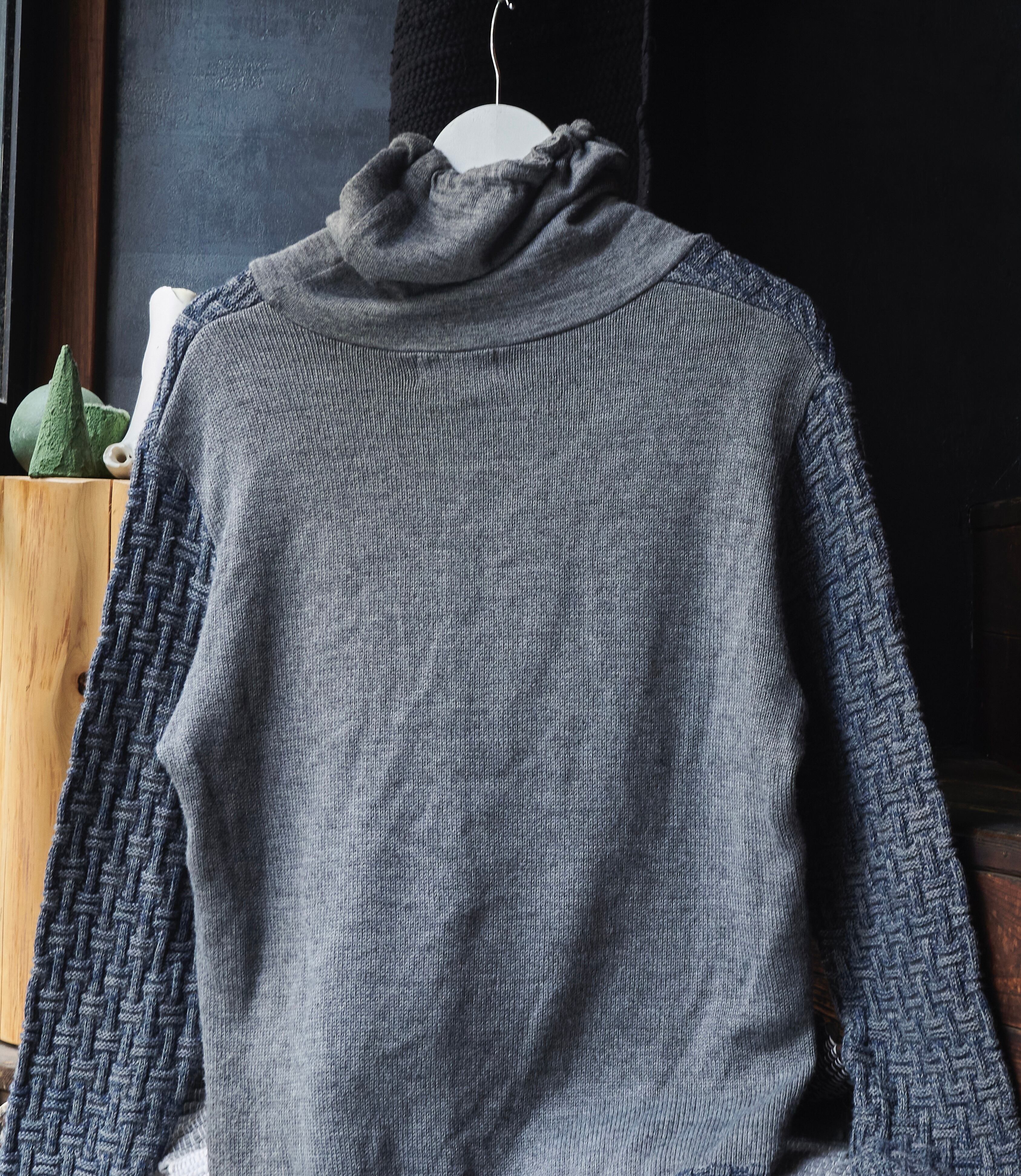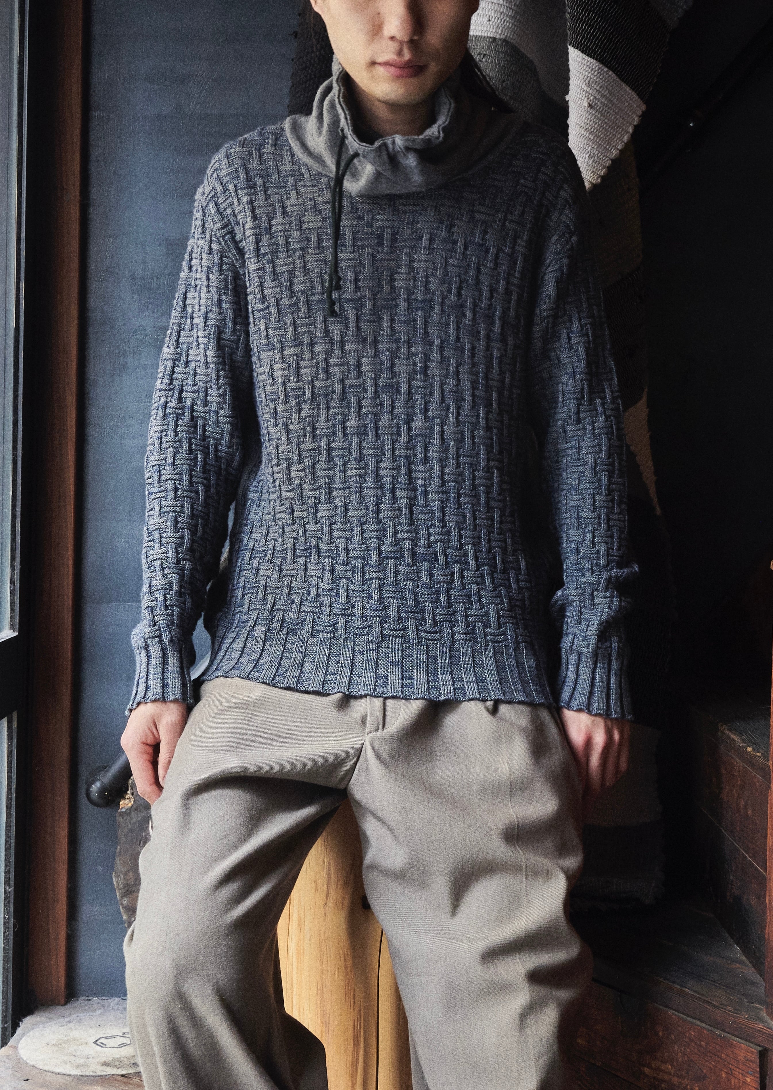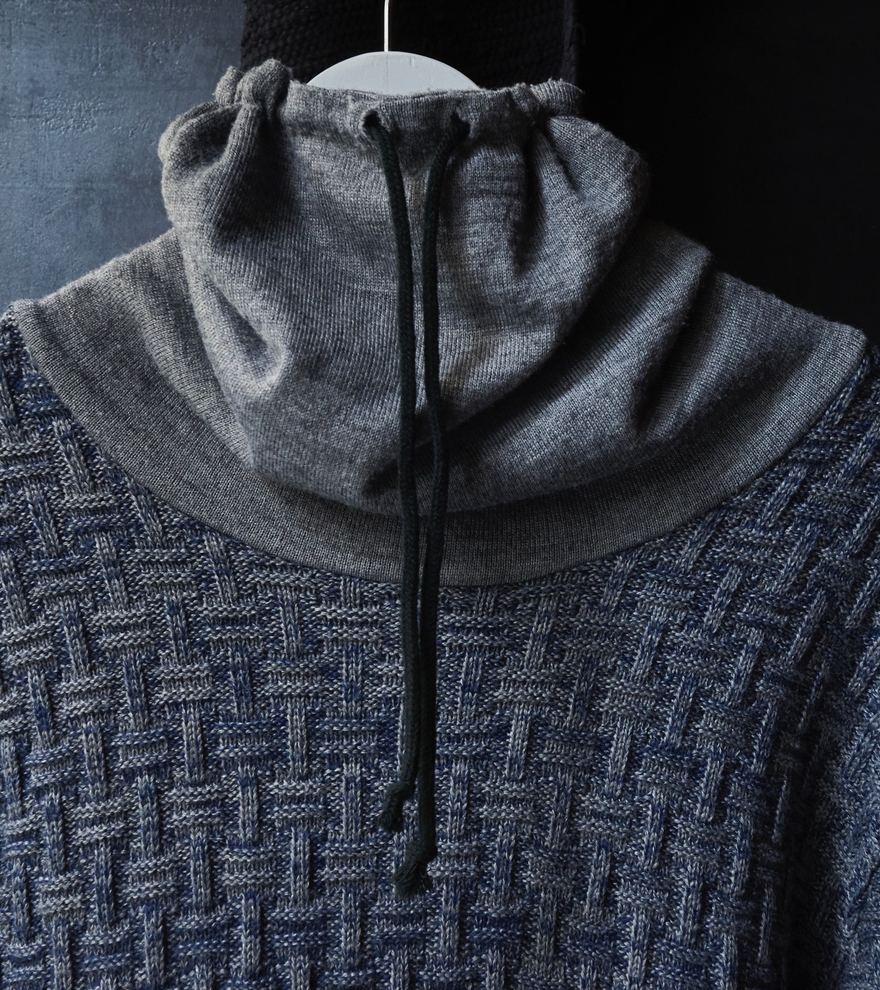 80s ITALY Merino wool x Dralon Fabric High-neck drawcord pattern knit