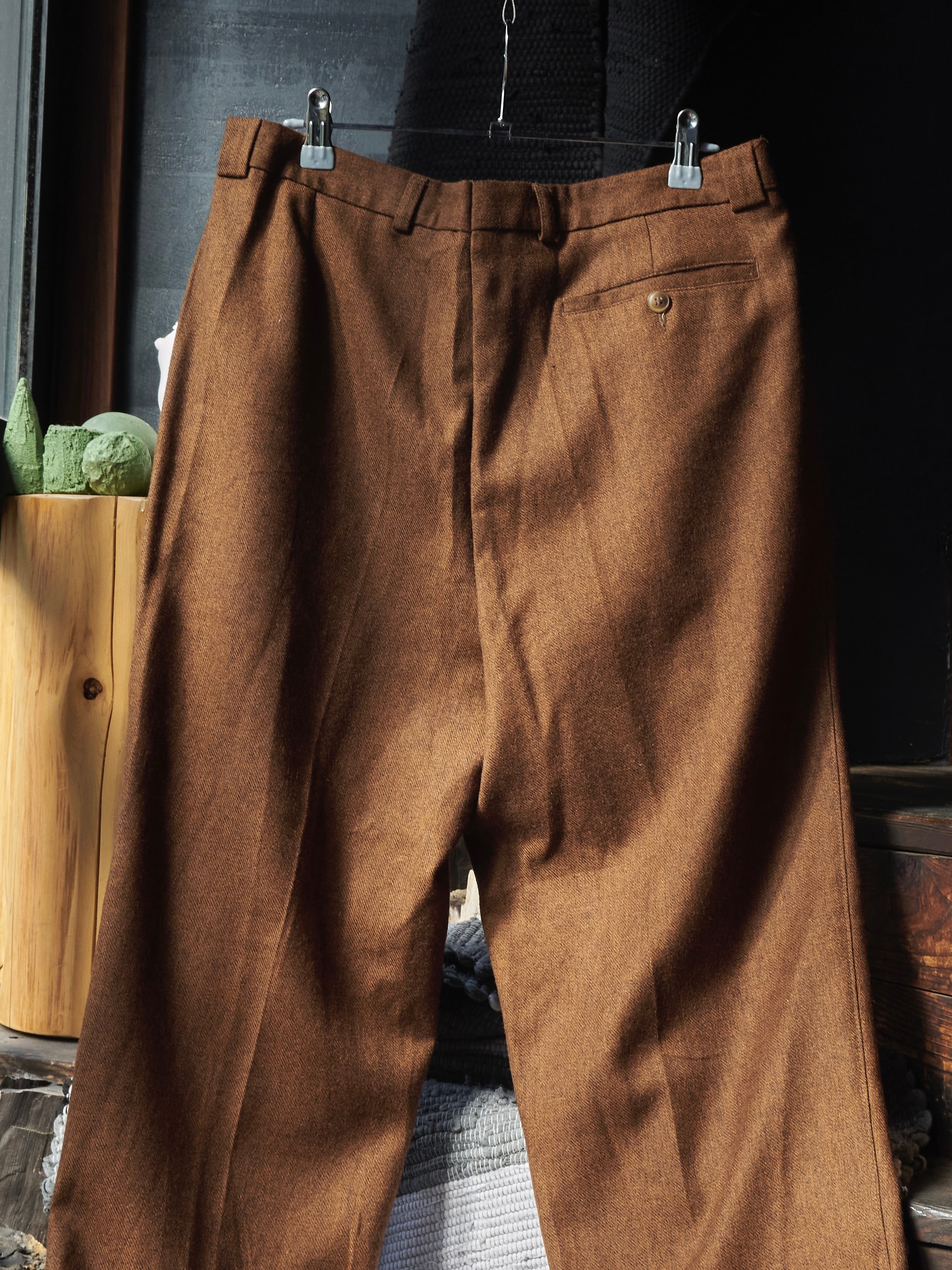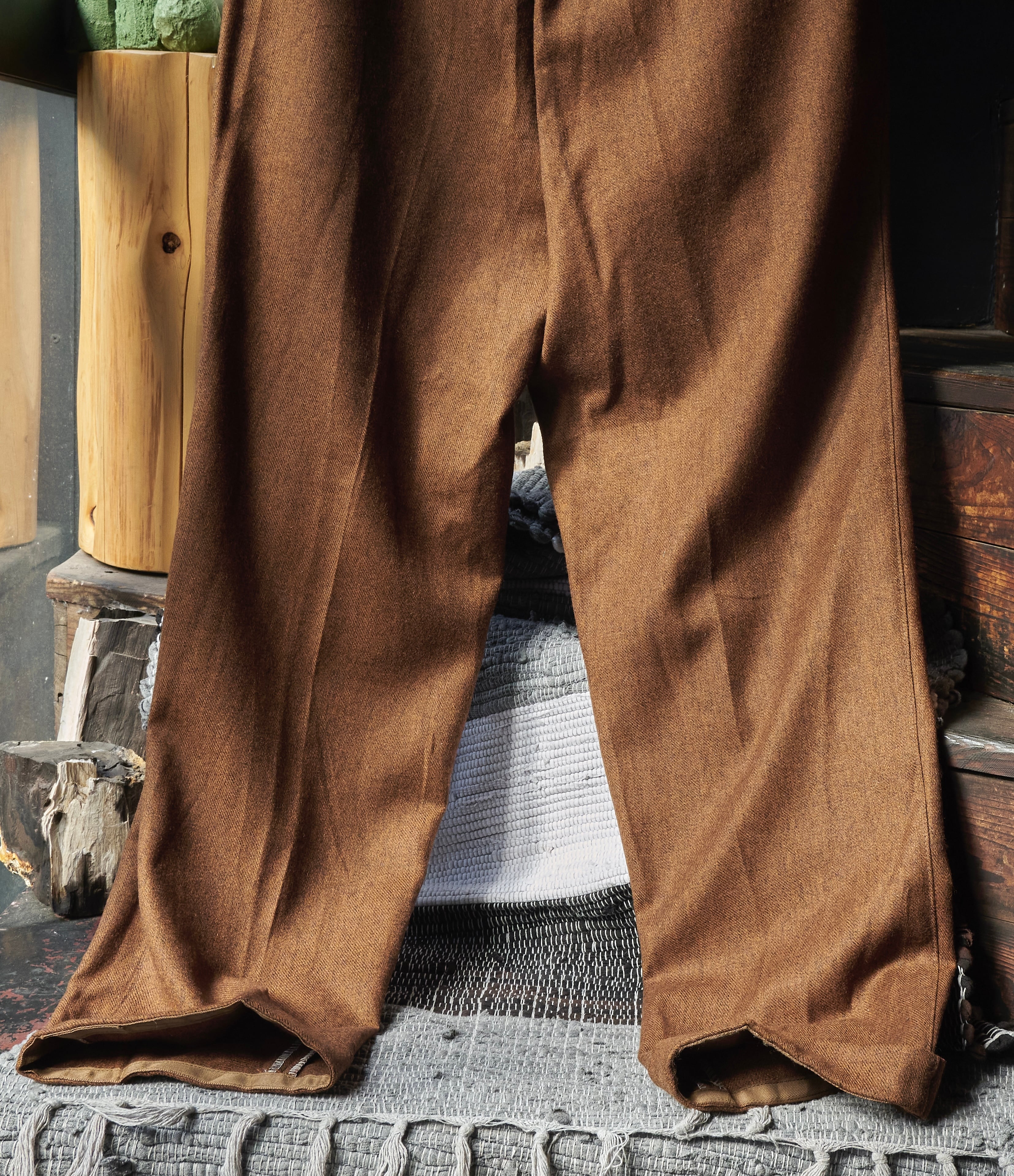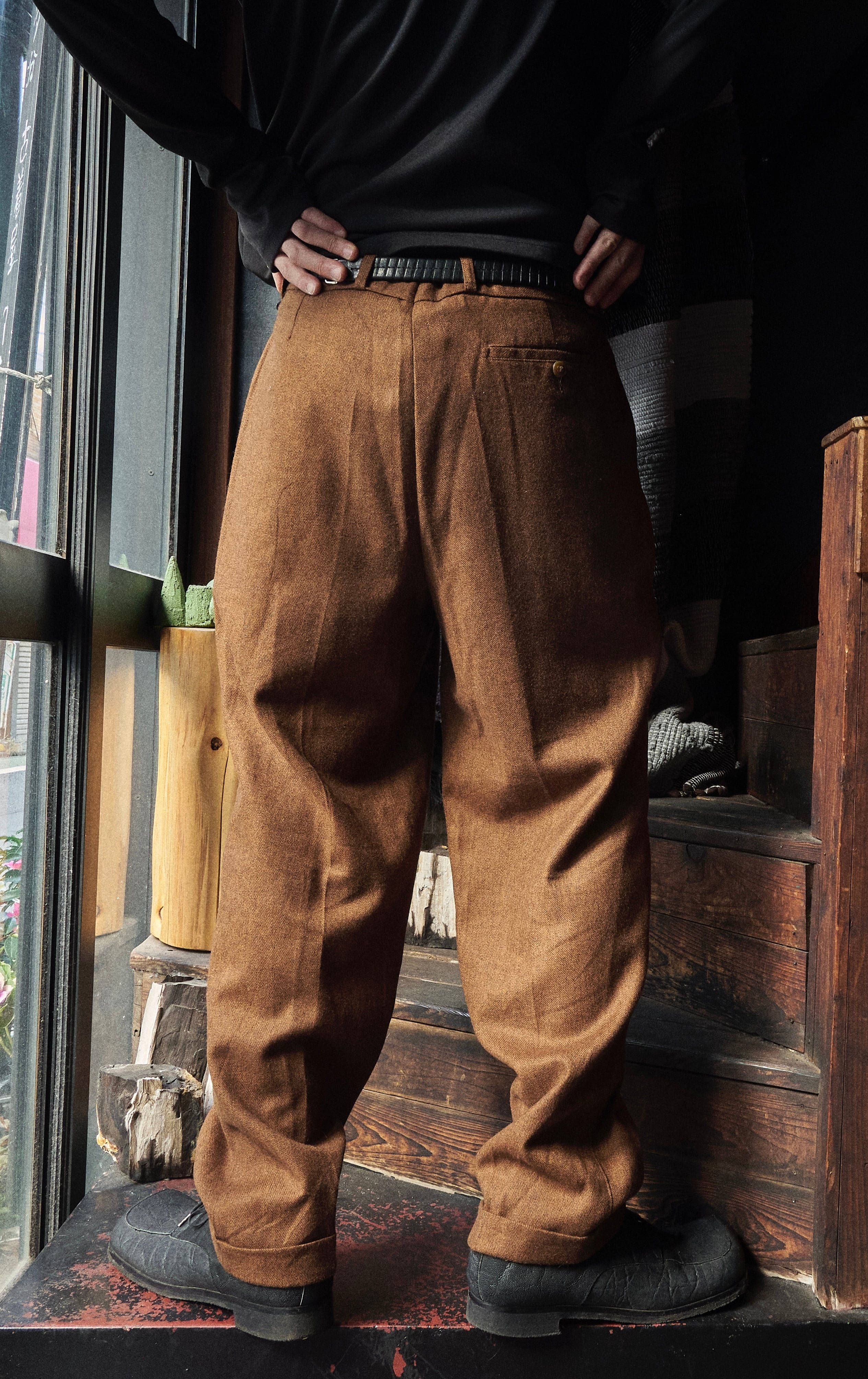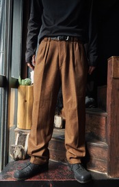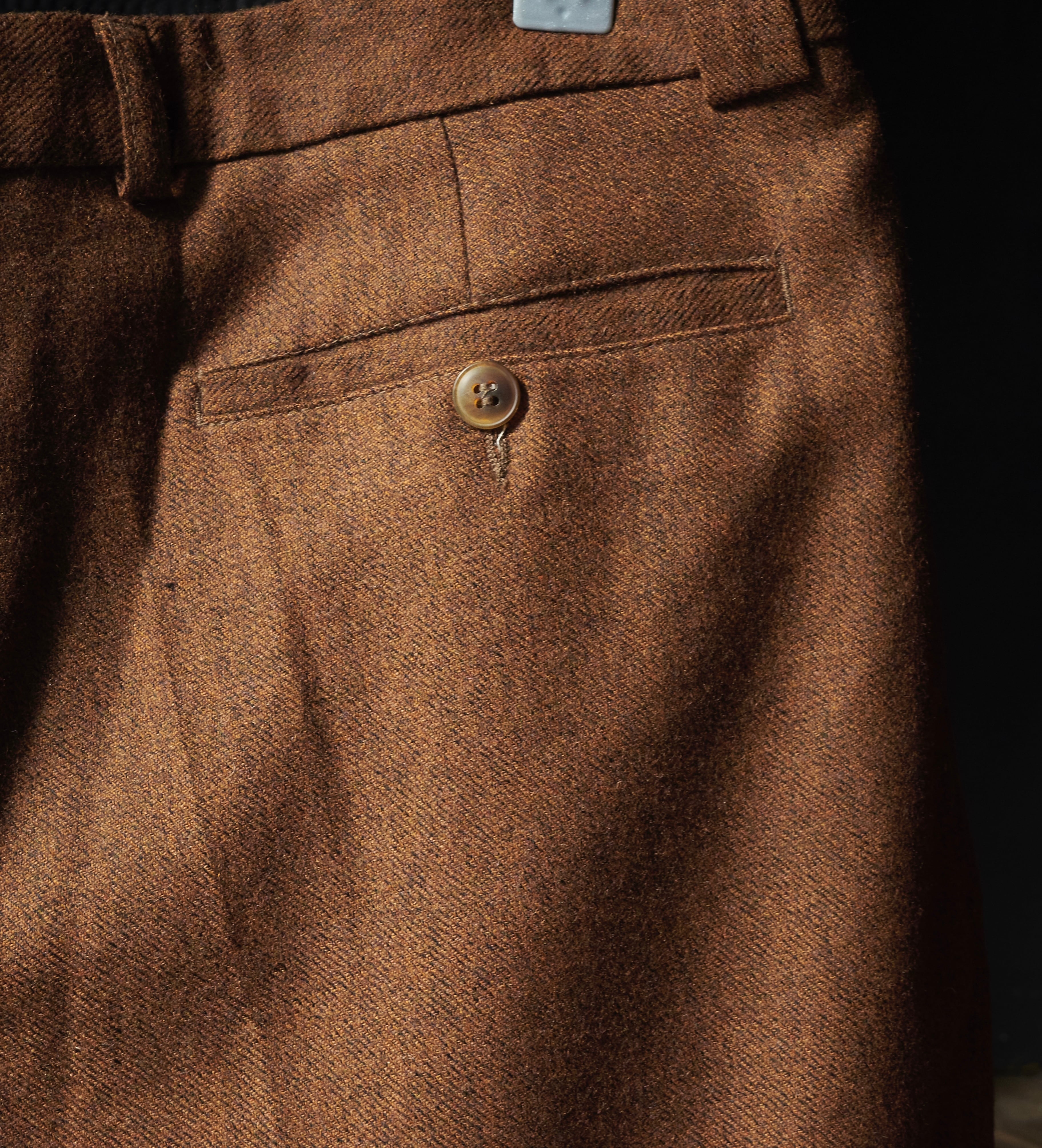 ドイツ製のオレンジベースカラーに黒い糸が入り乱れブラッドオレンジカラーになったスラックス。