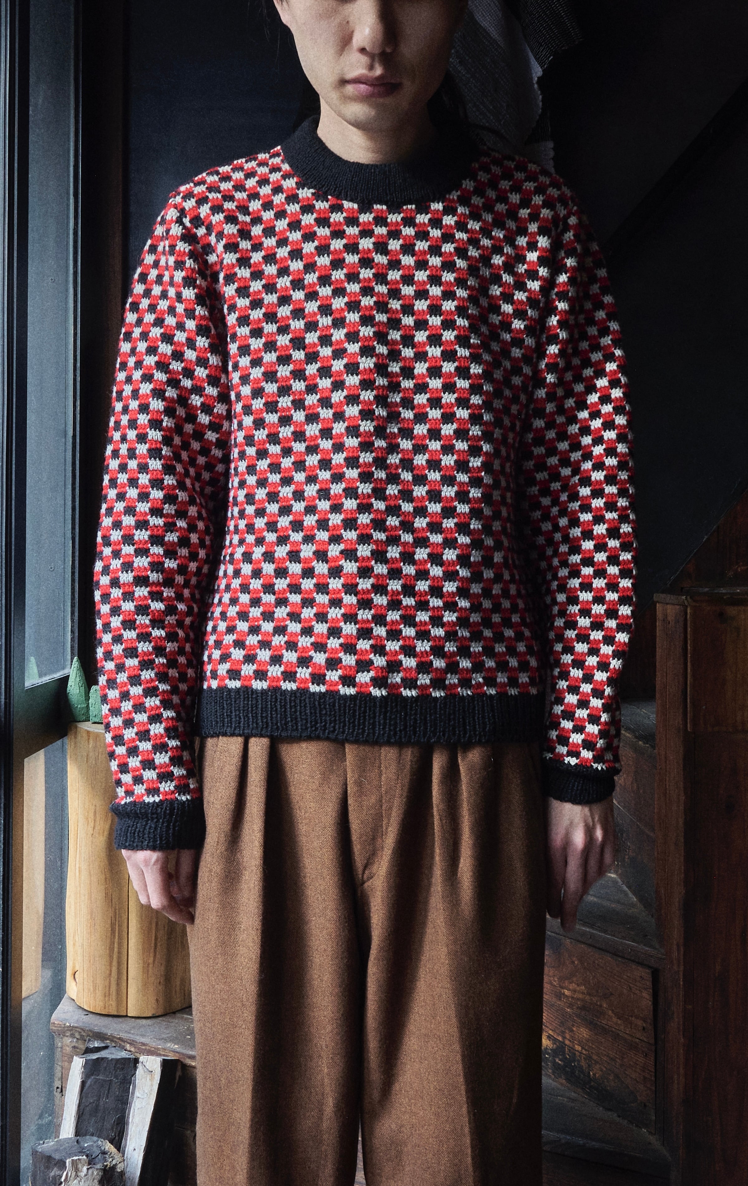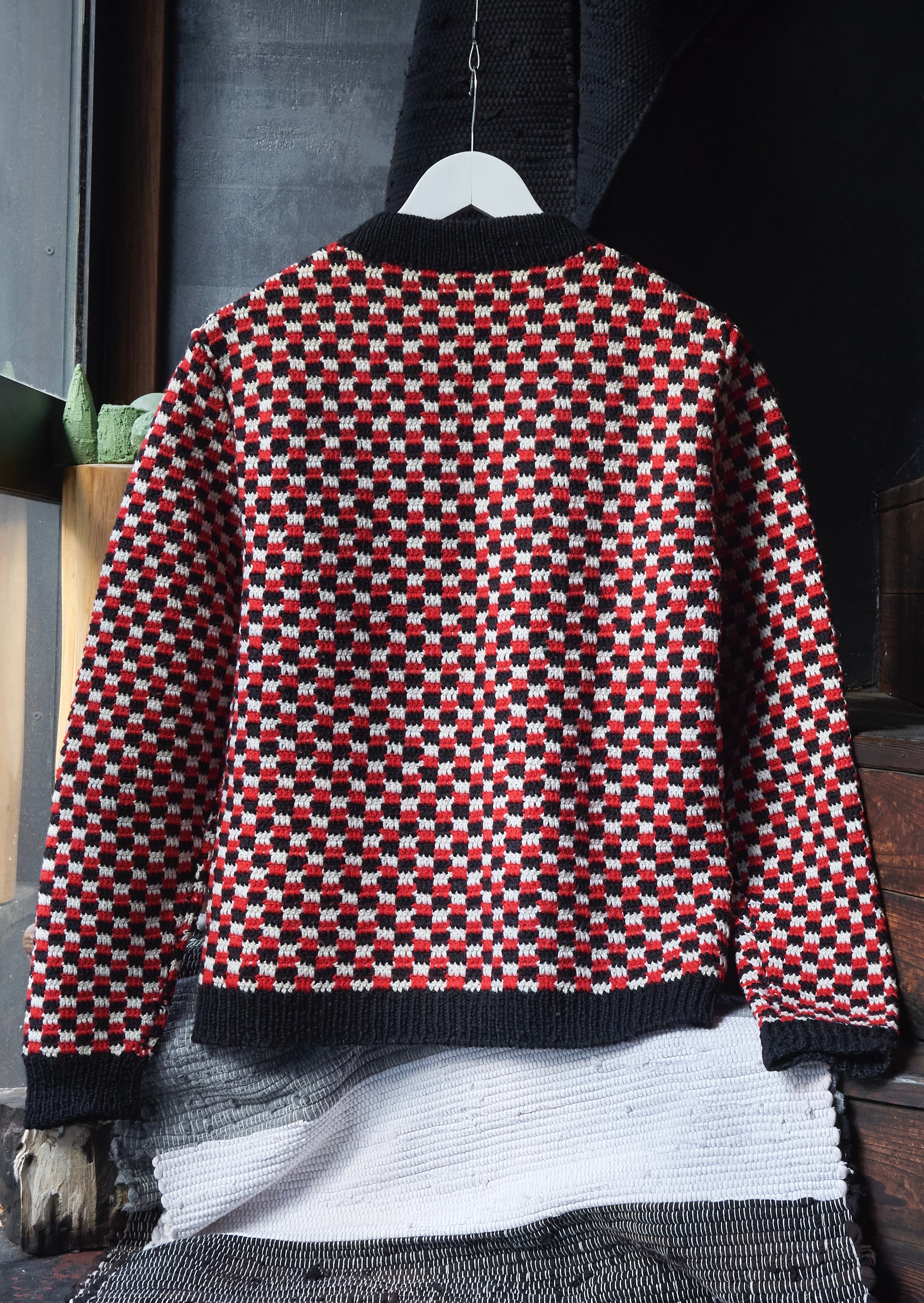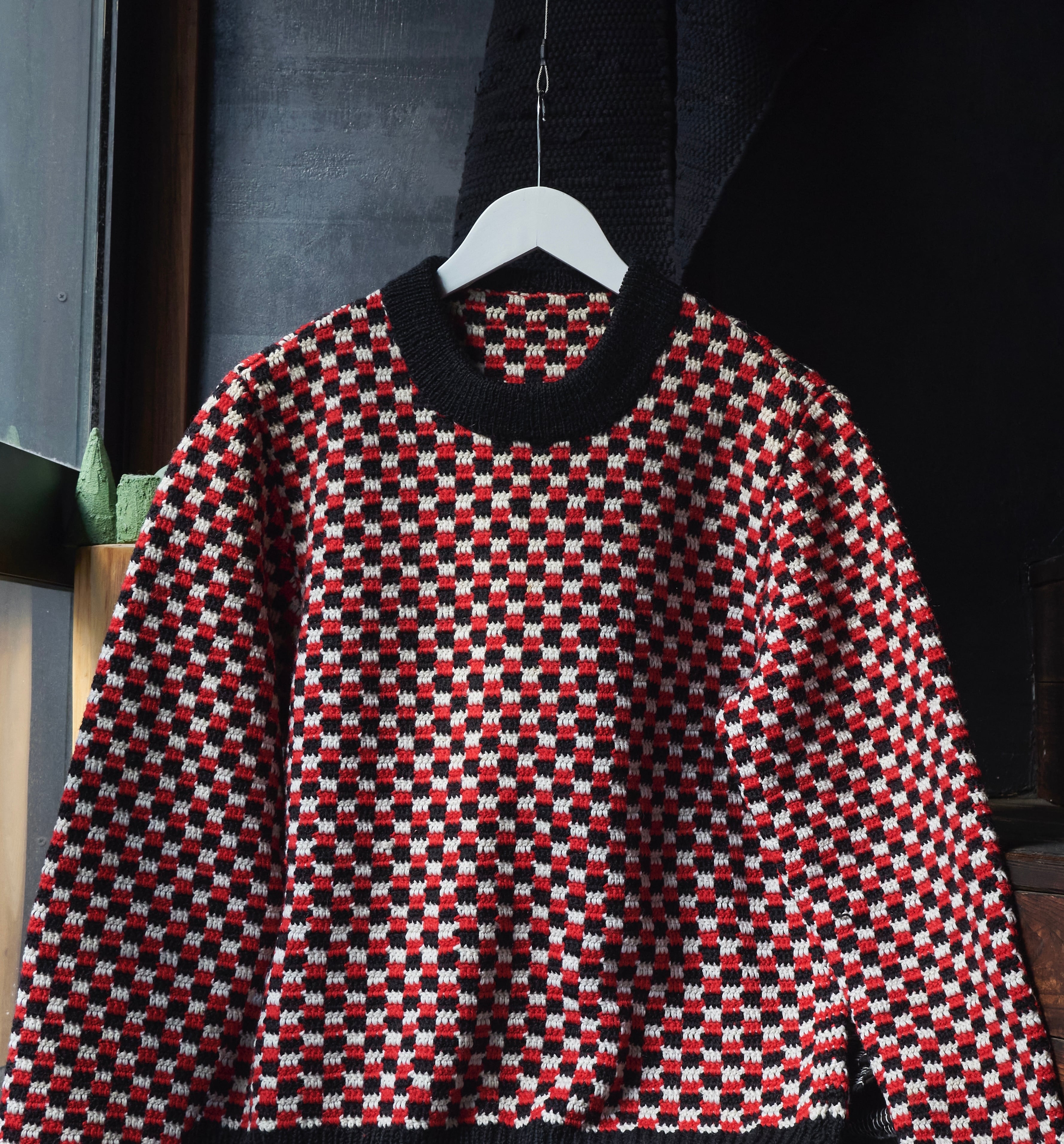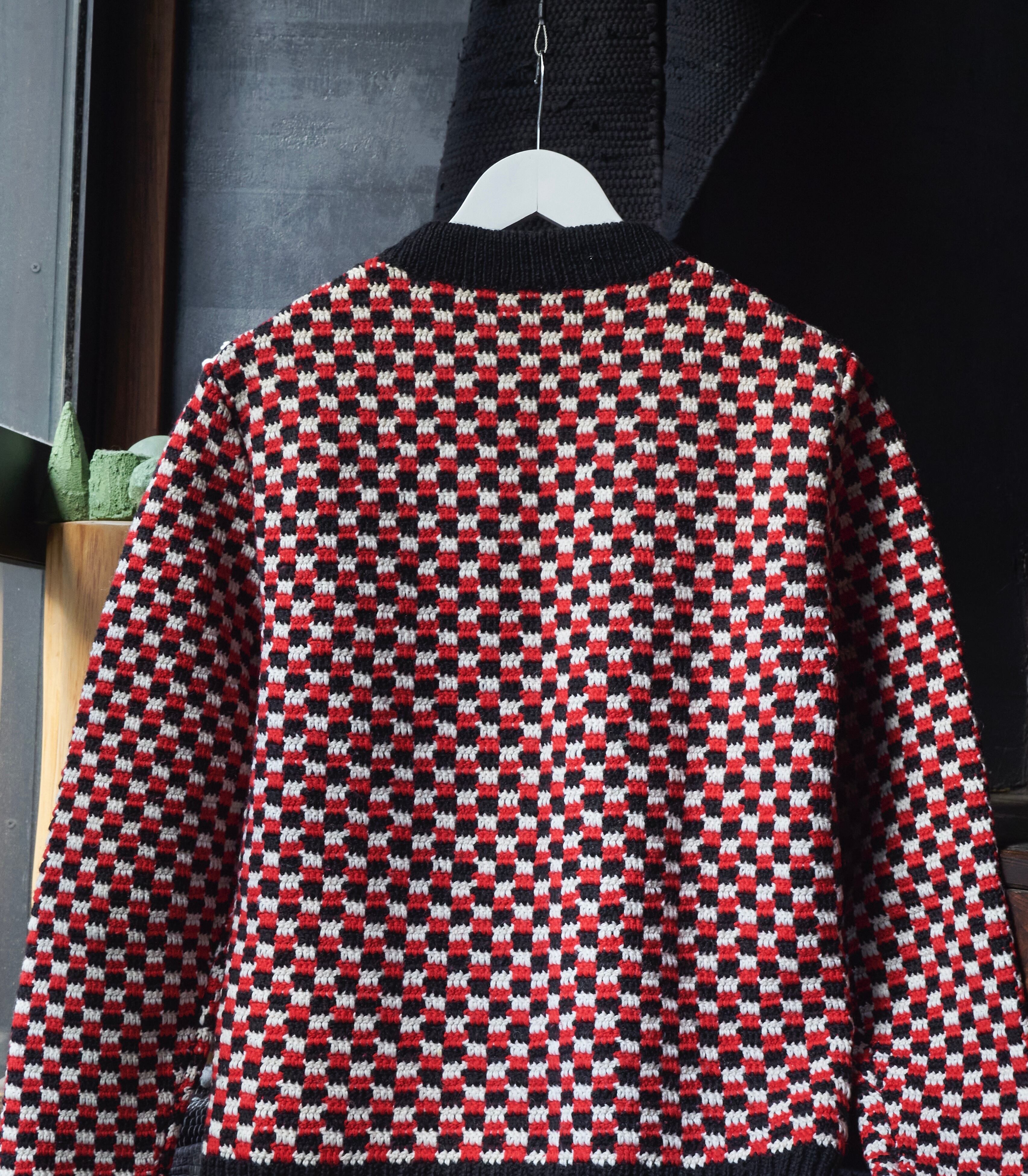 そんなチェッカーフラッグのような編みが描かれたニット。