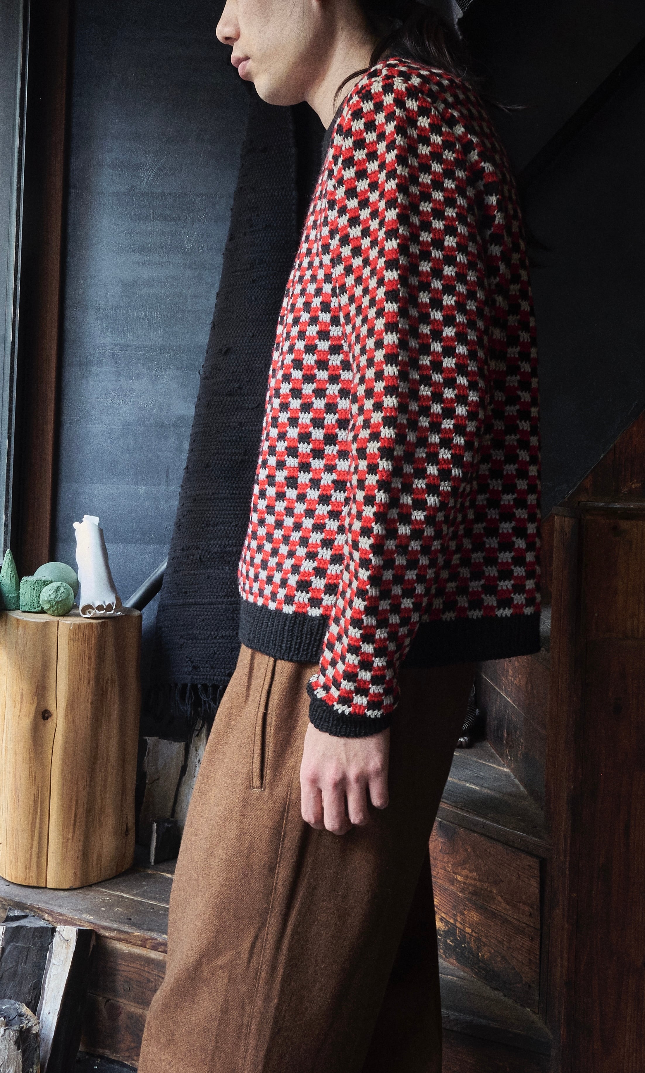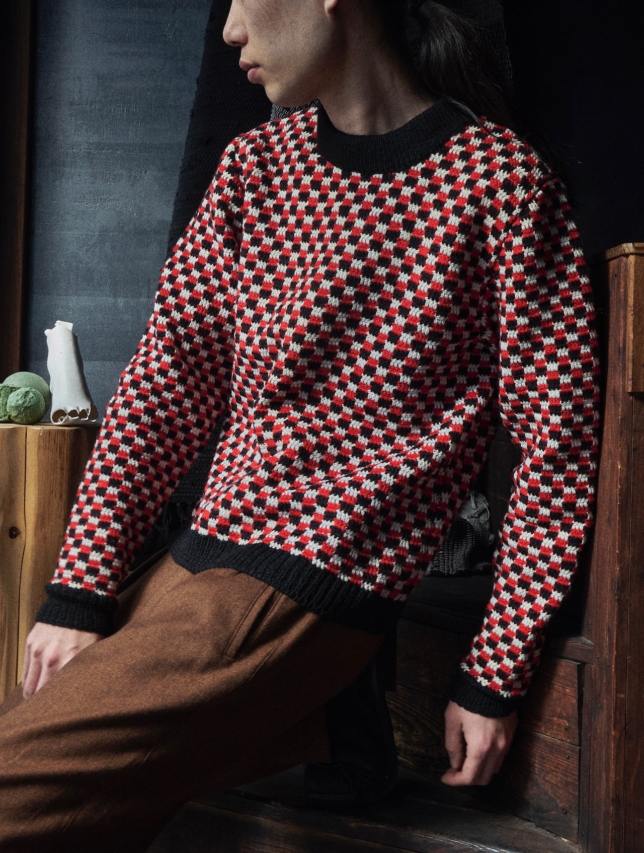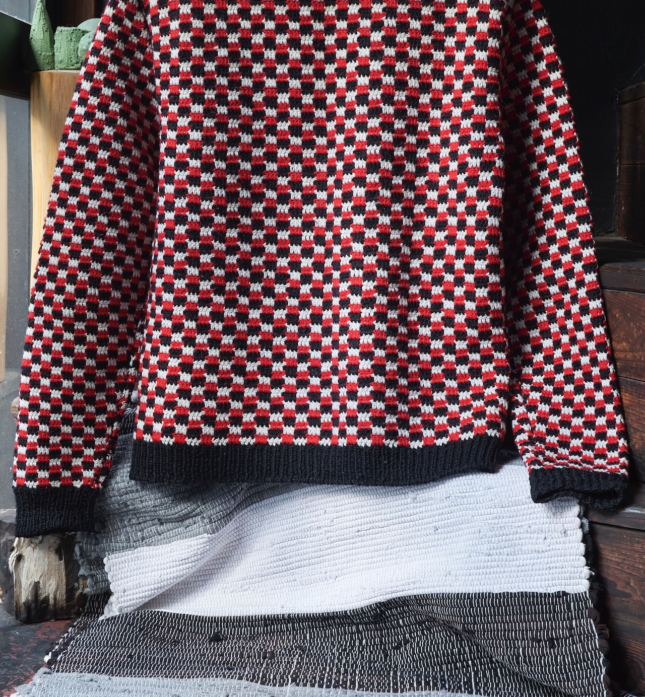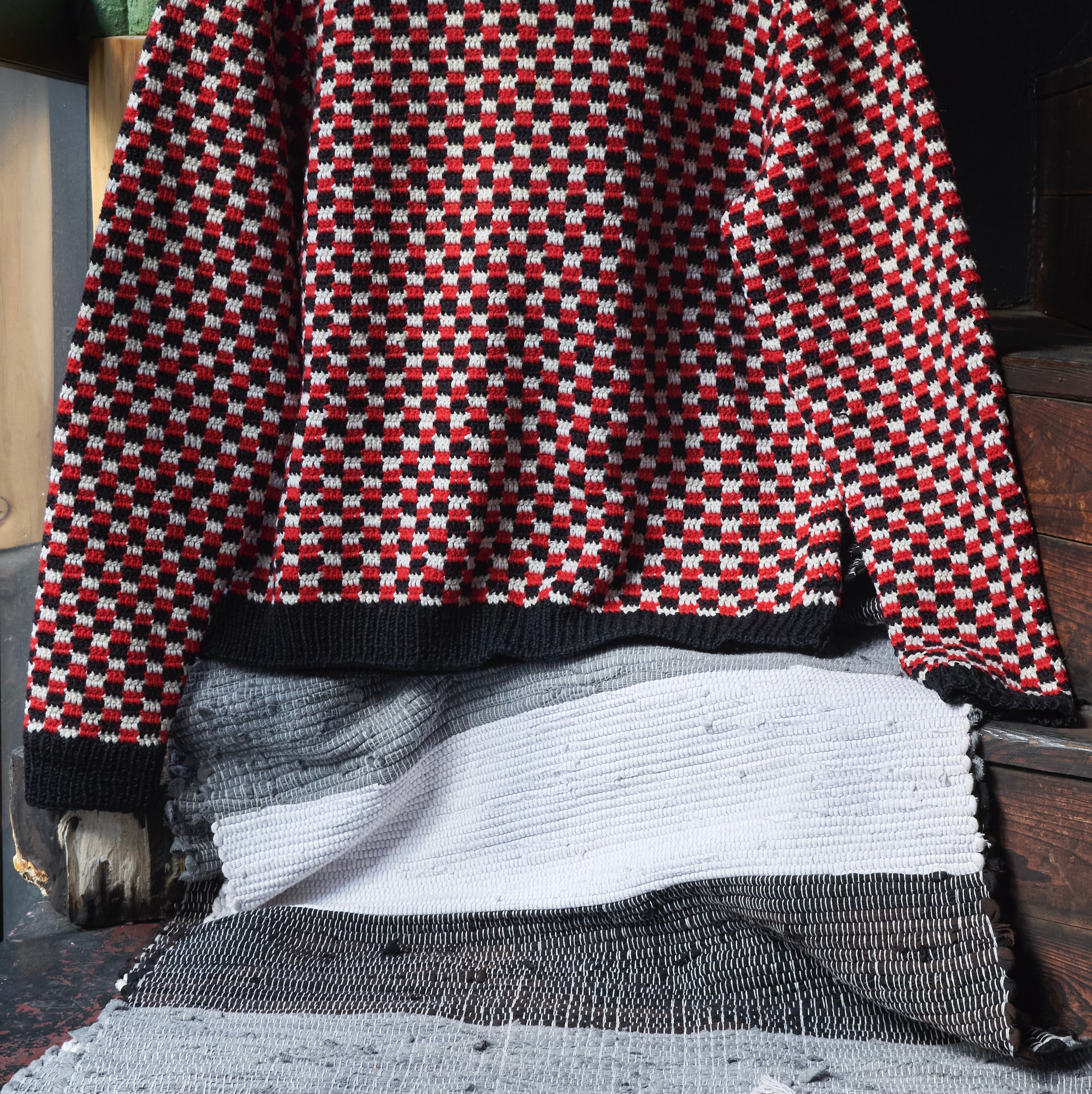 そんなチェッカーフラッグのような編みが描かれたニット。