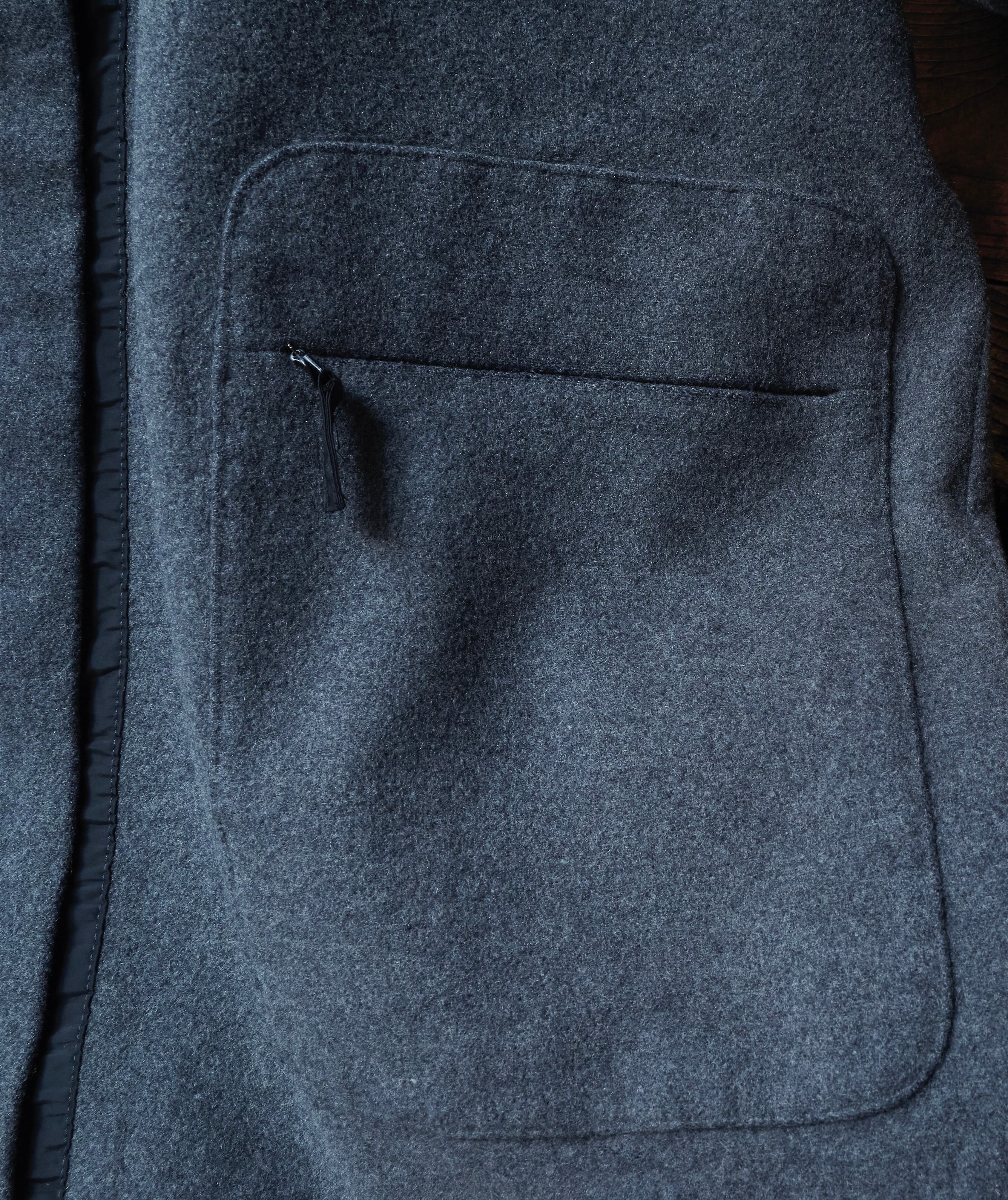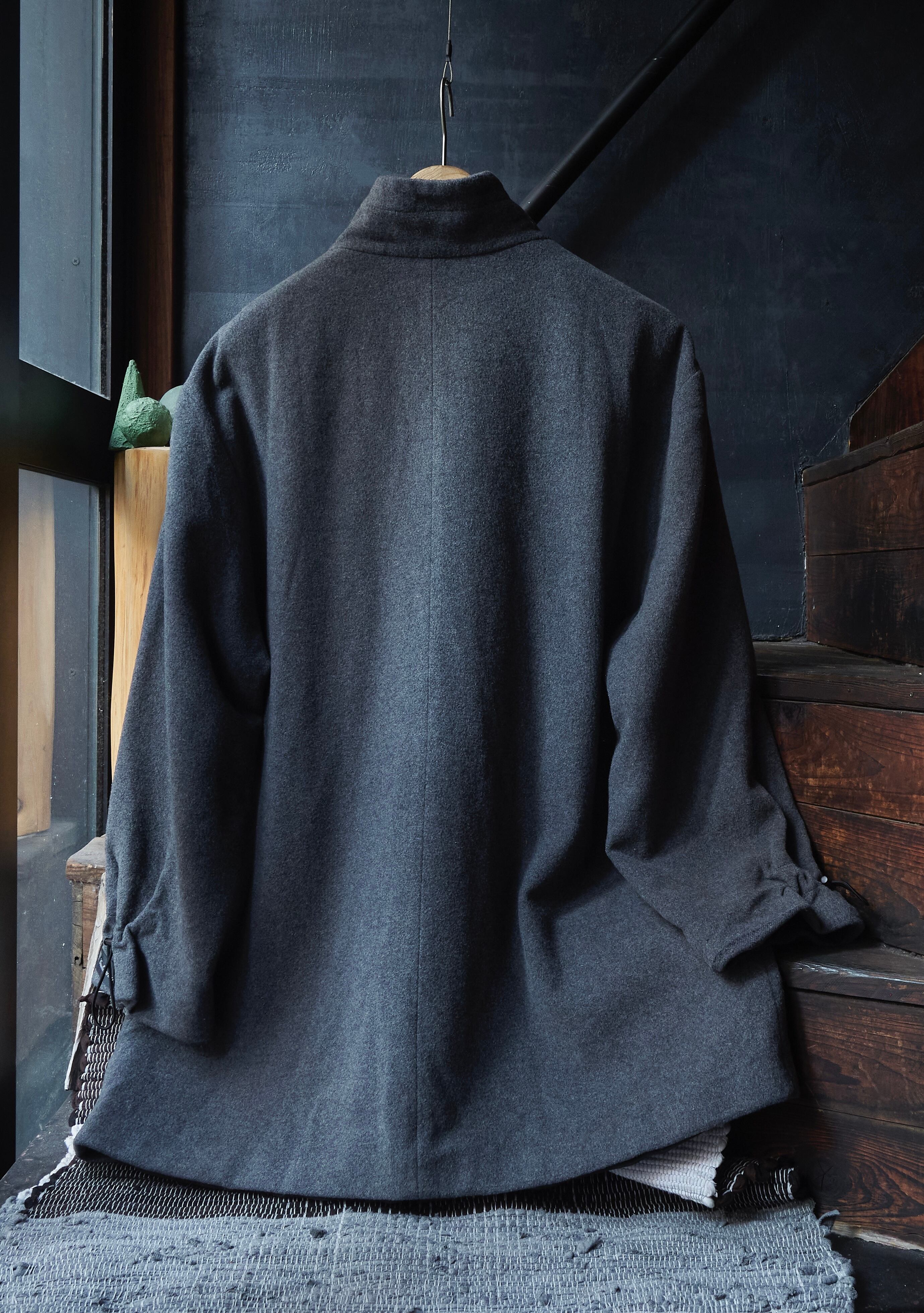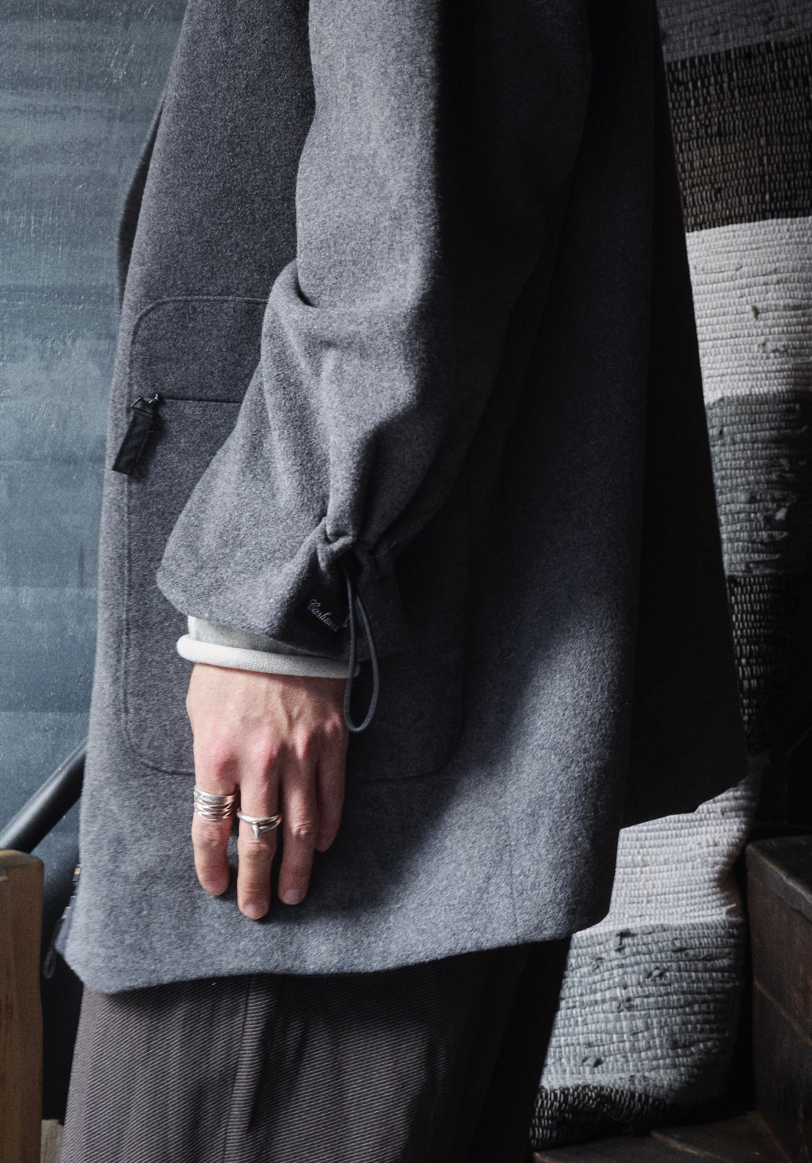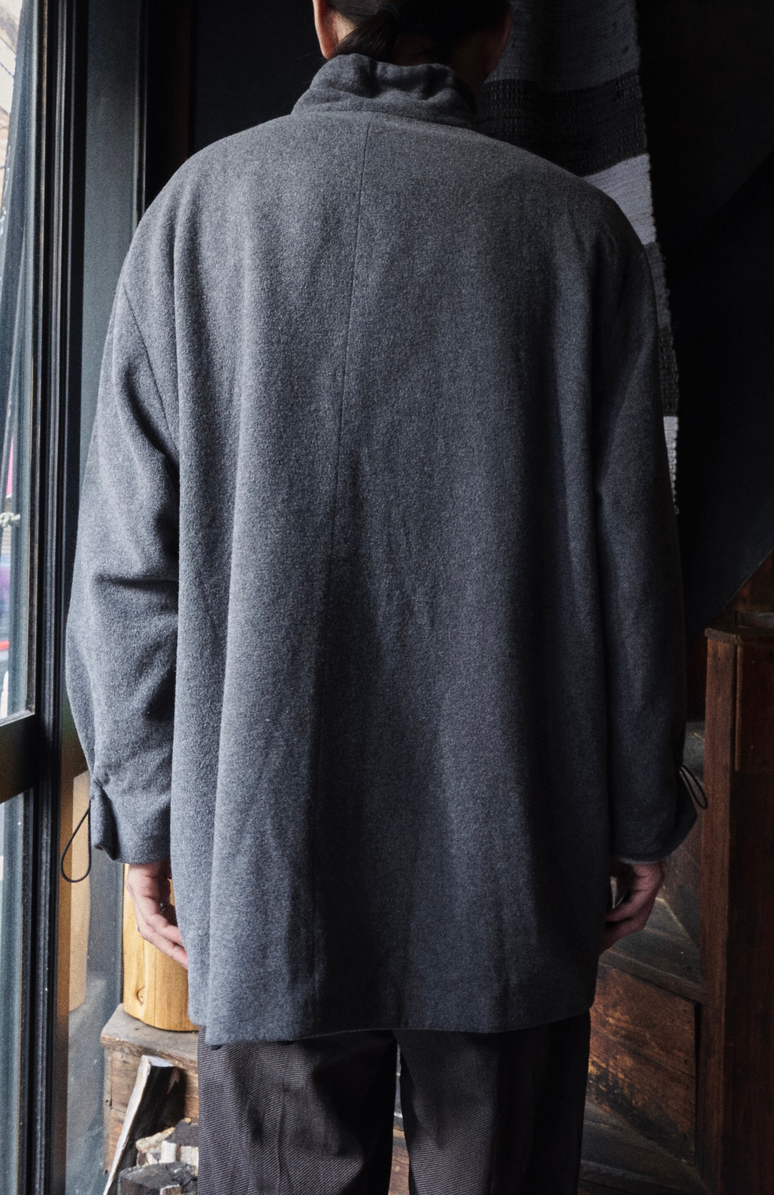 ウールナイロンカシミヤ混紡生地を使用した面白いデザインのジャケット。