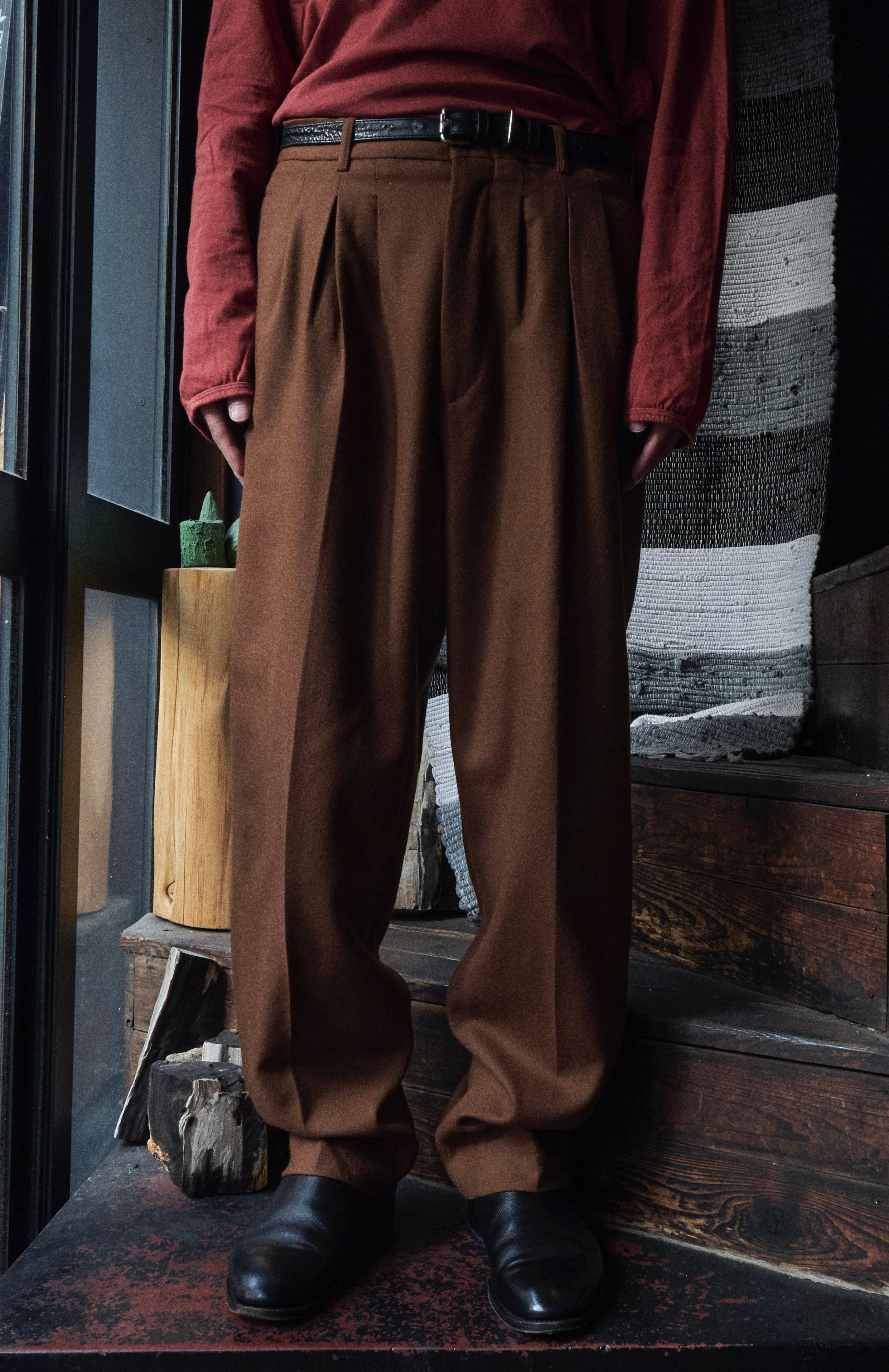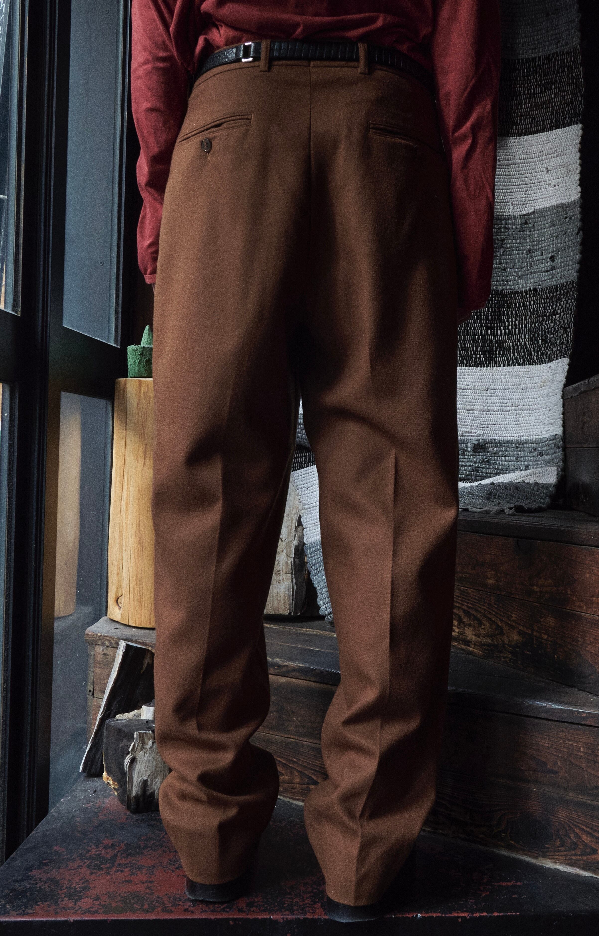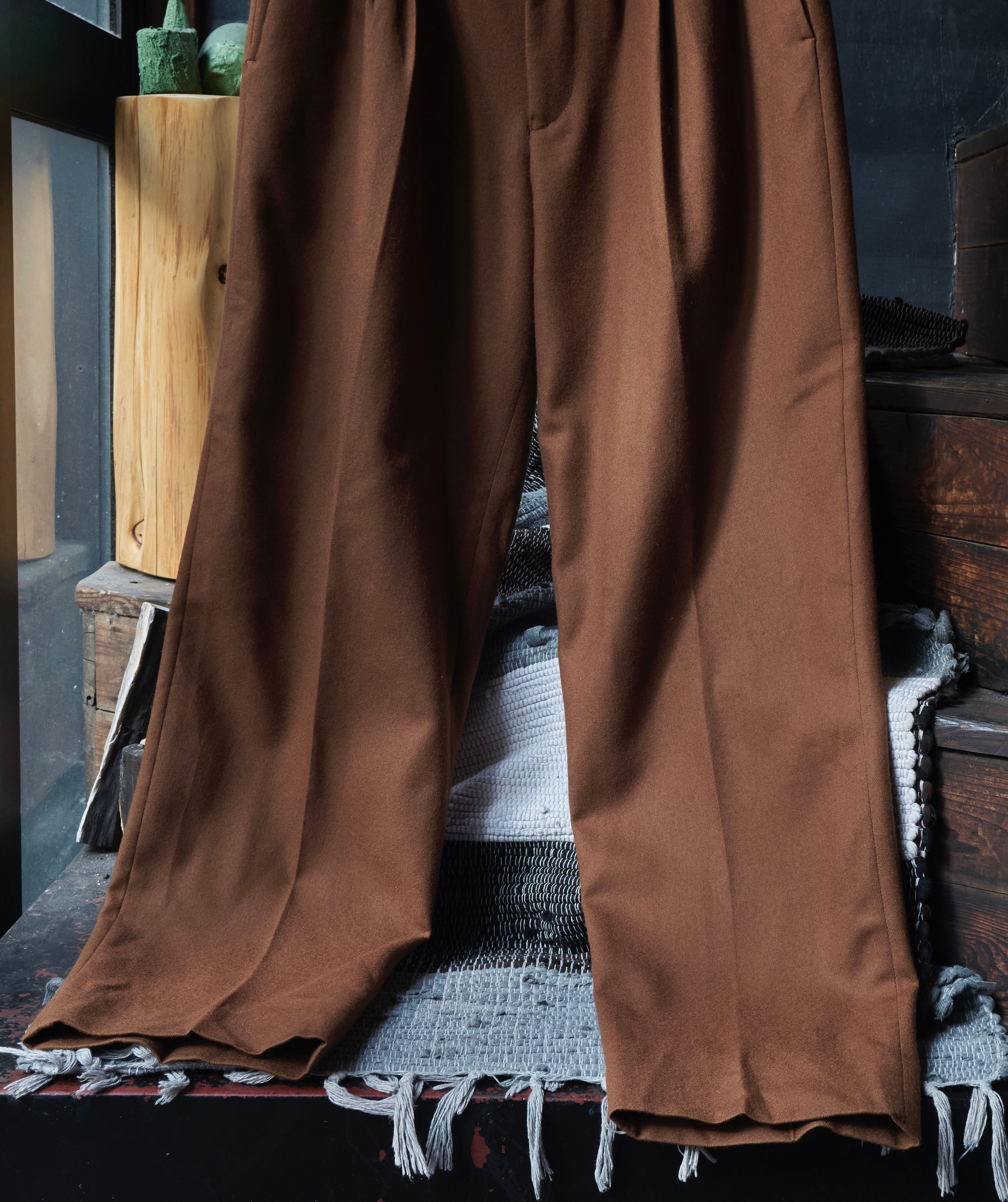 こちらも深いタックが響き渡るマスタードカラーのスラックス。