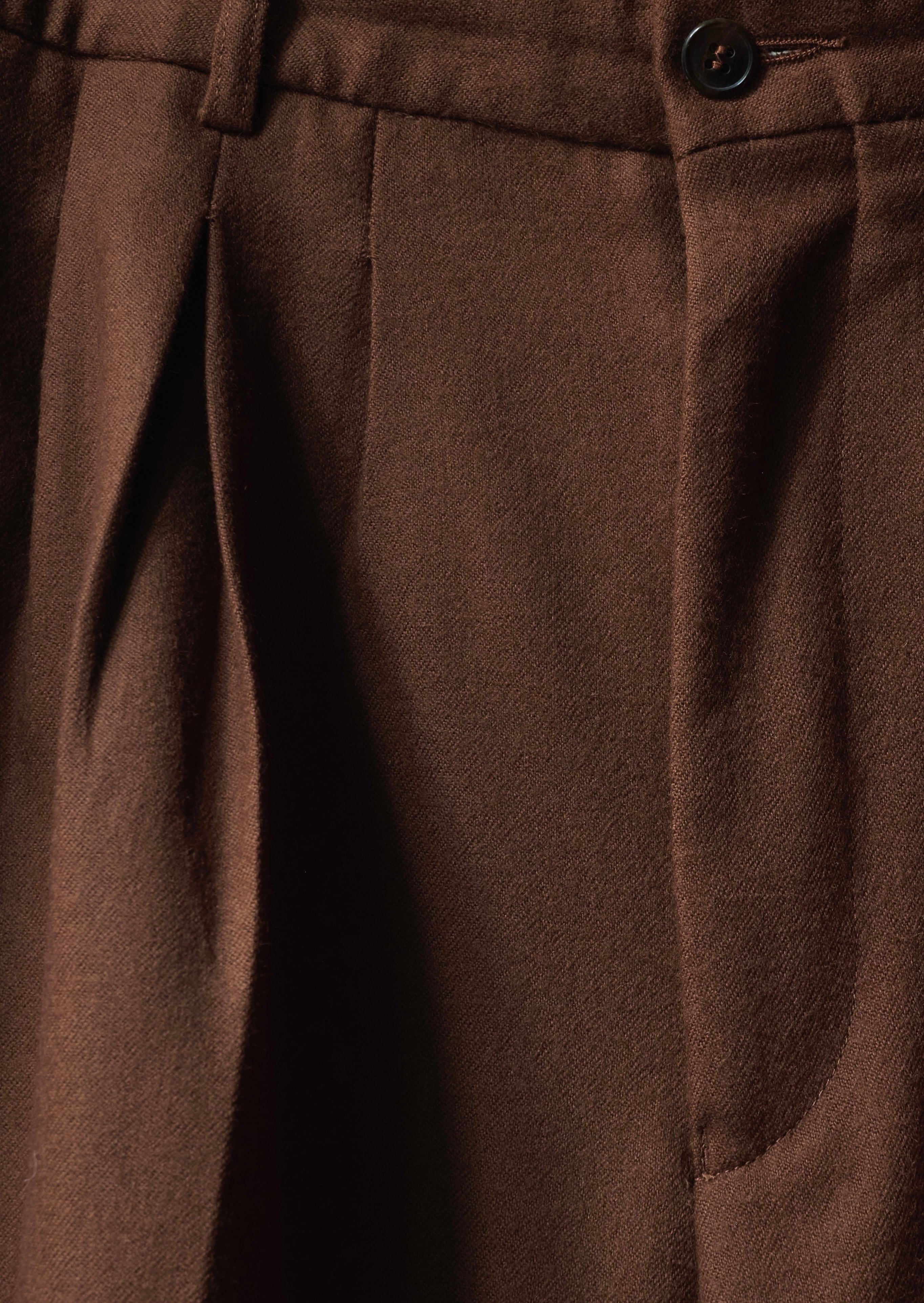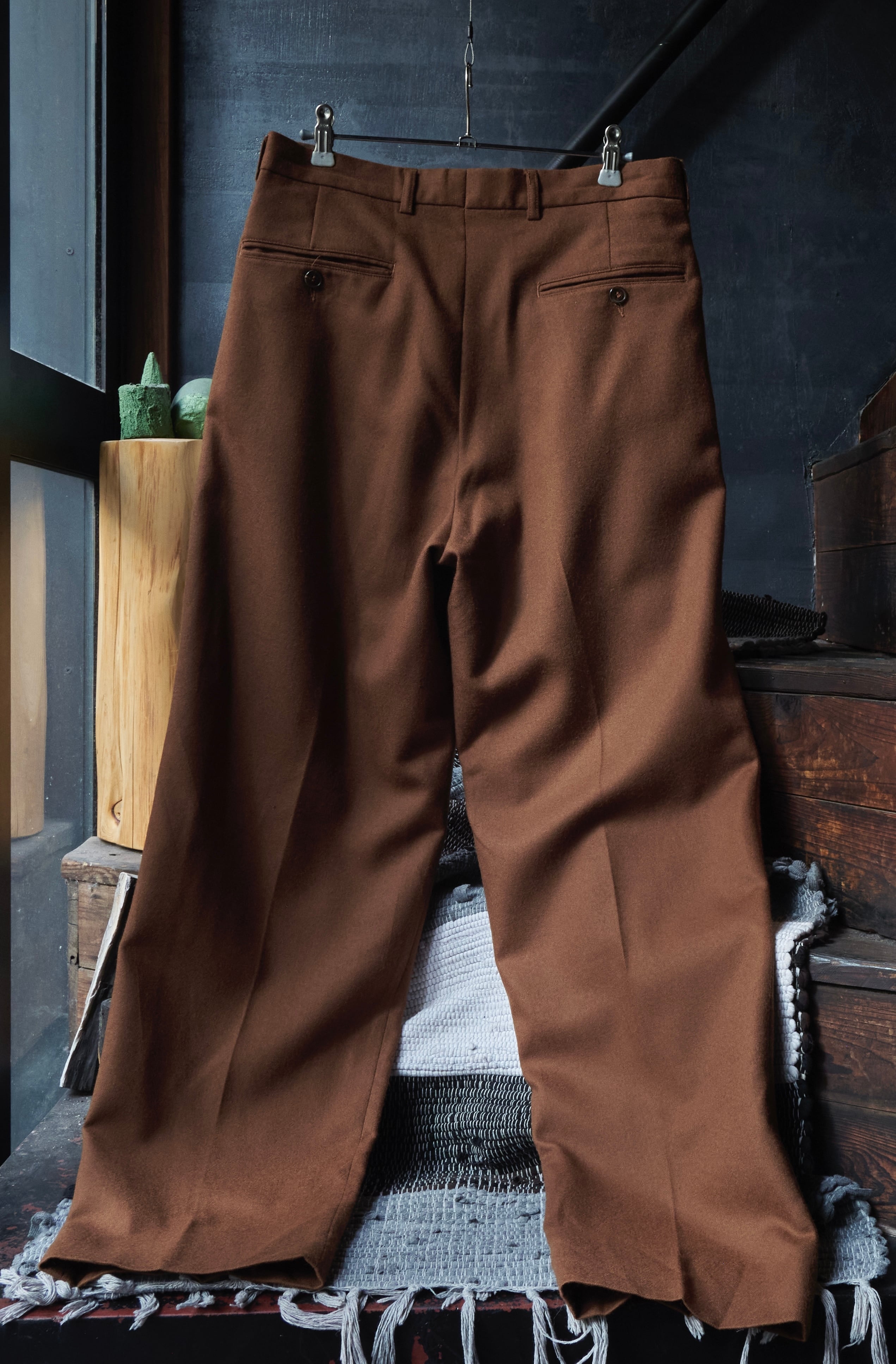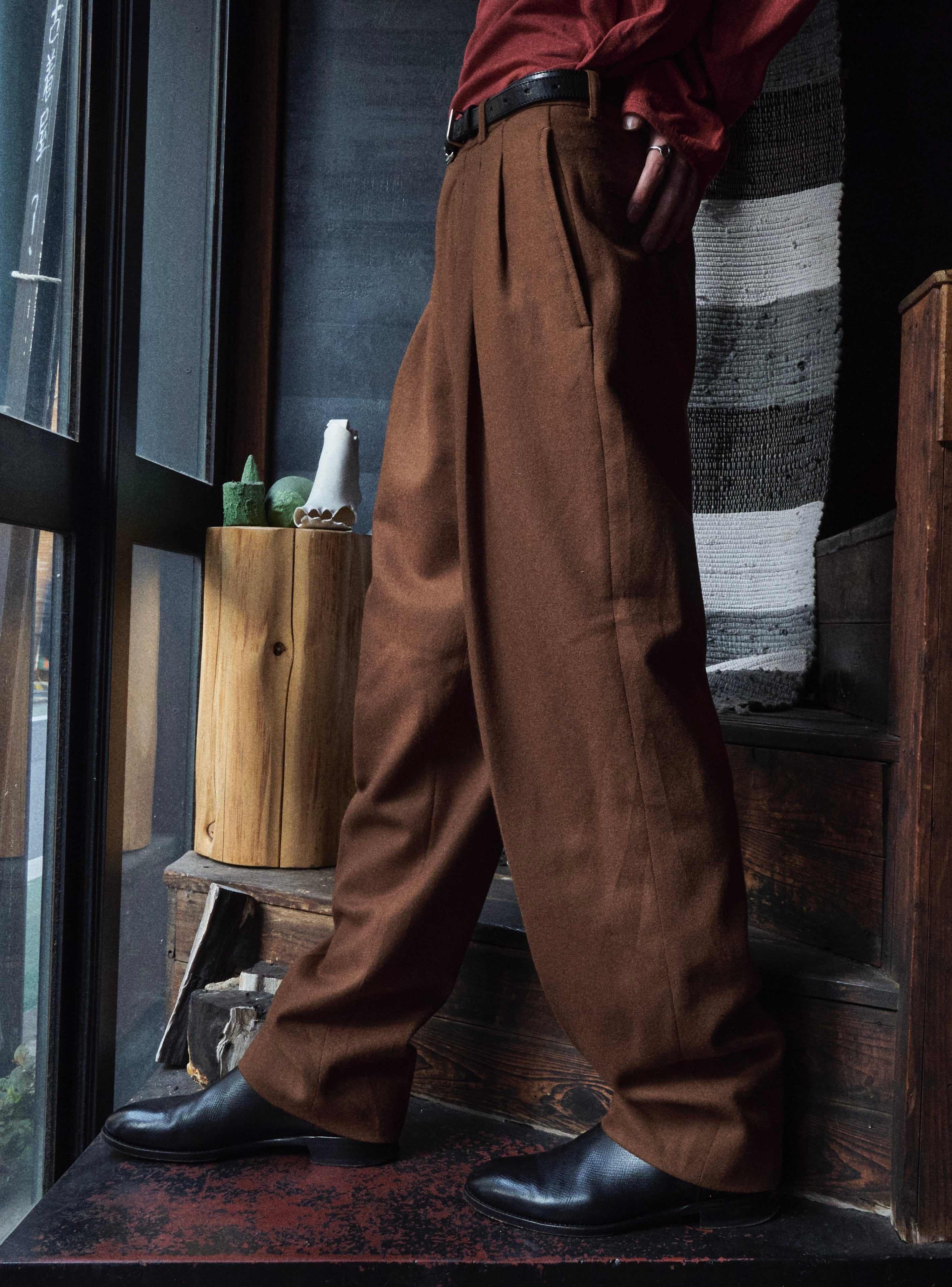こちらも深いタックが響き渡るマスタードカラーのスラックス。