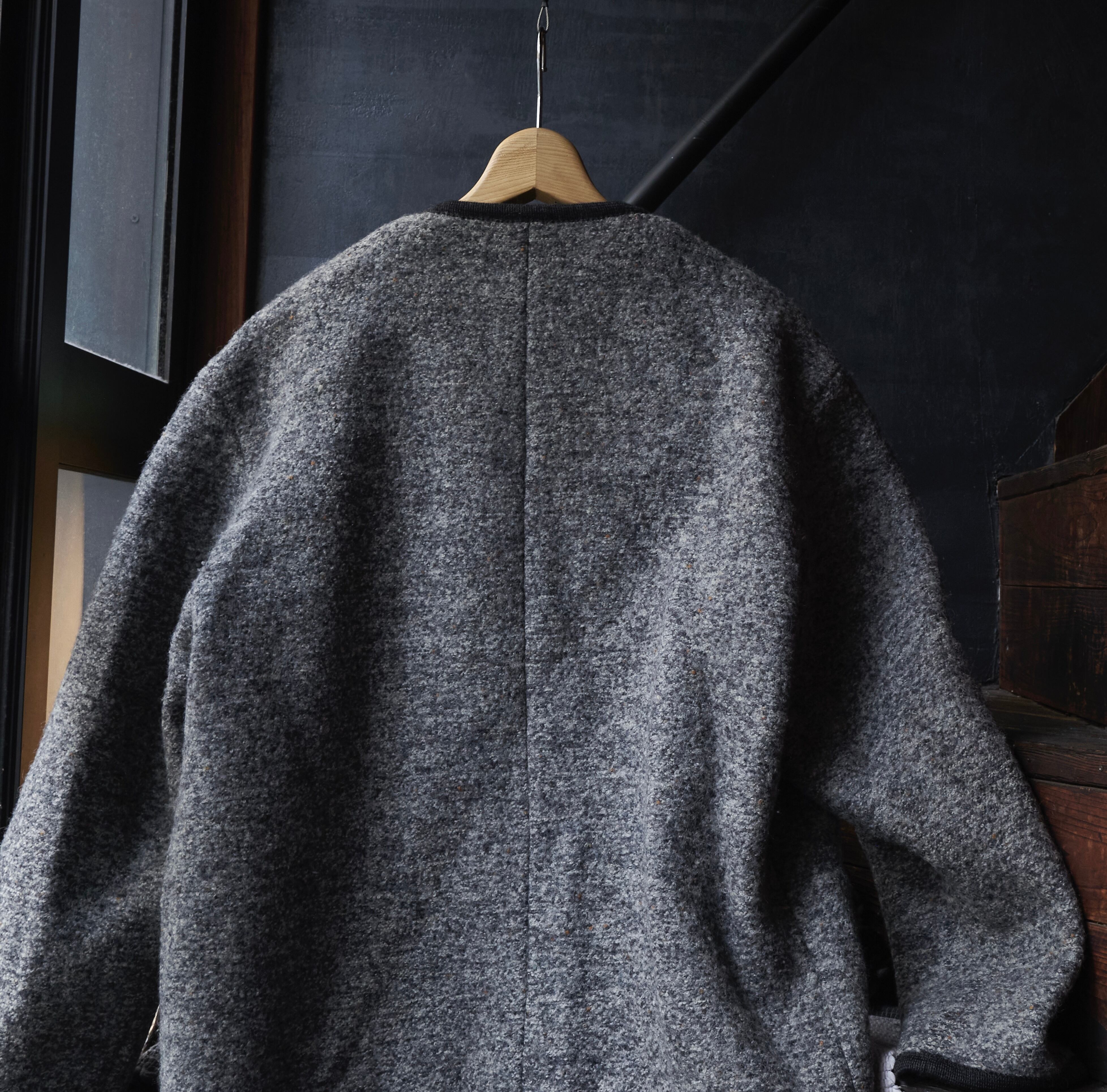そんなボイルドウールを使用して、ベースカラーはグレーに対してオレンジのネップなどが混ざり合う生地となってます。