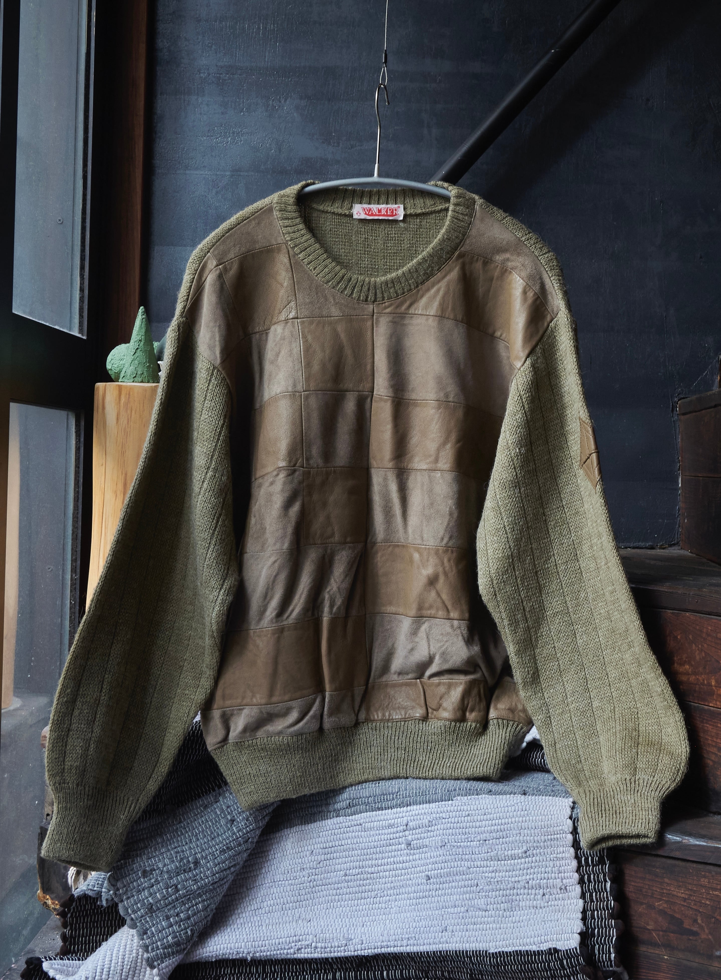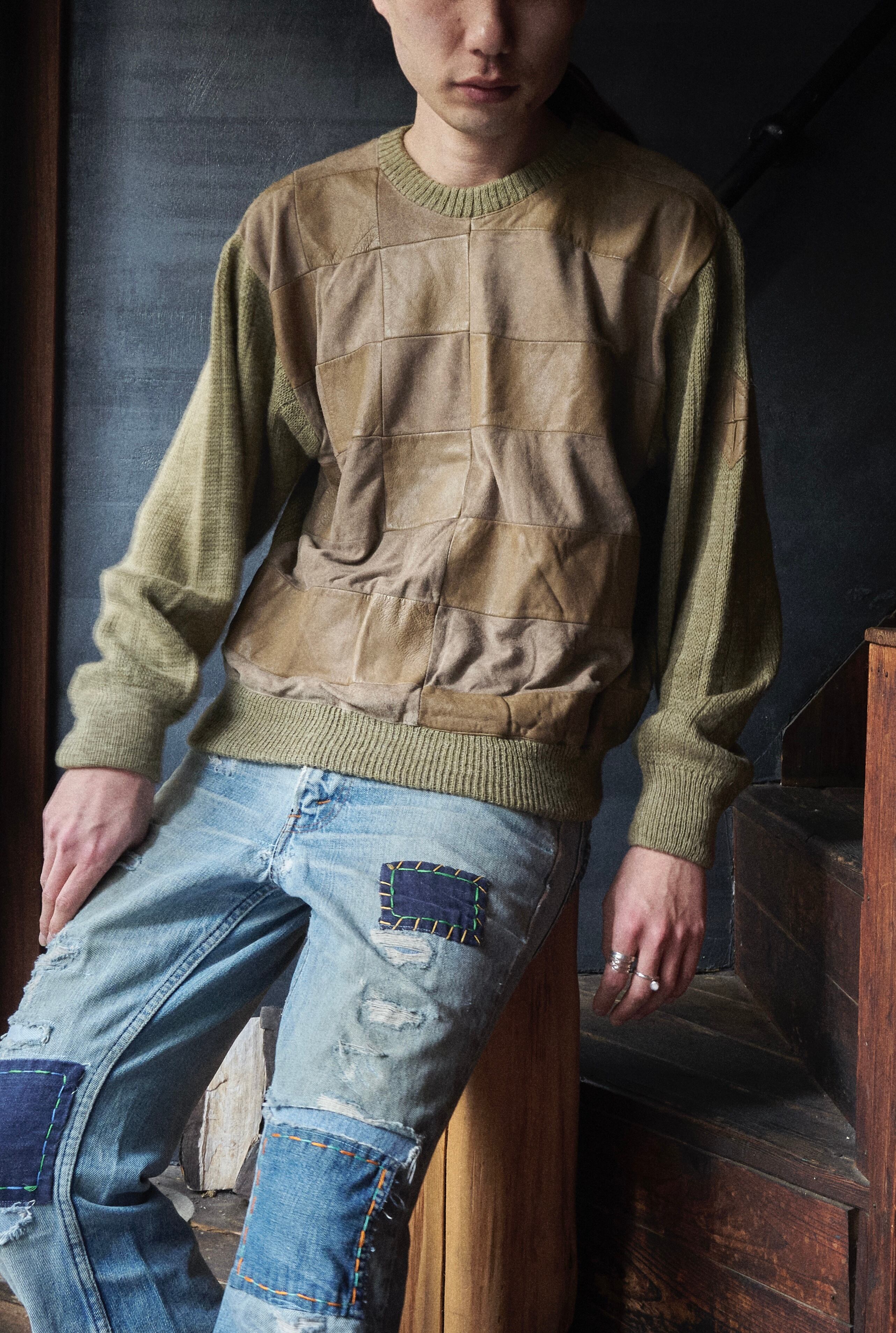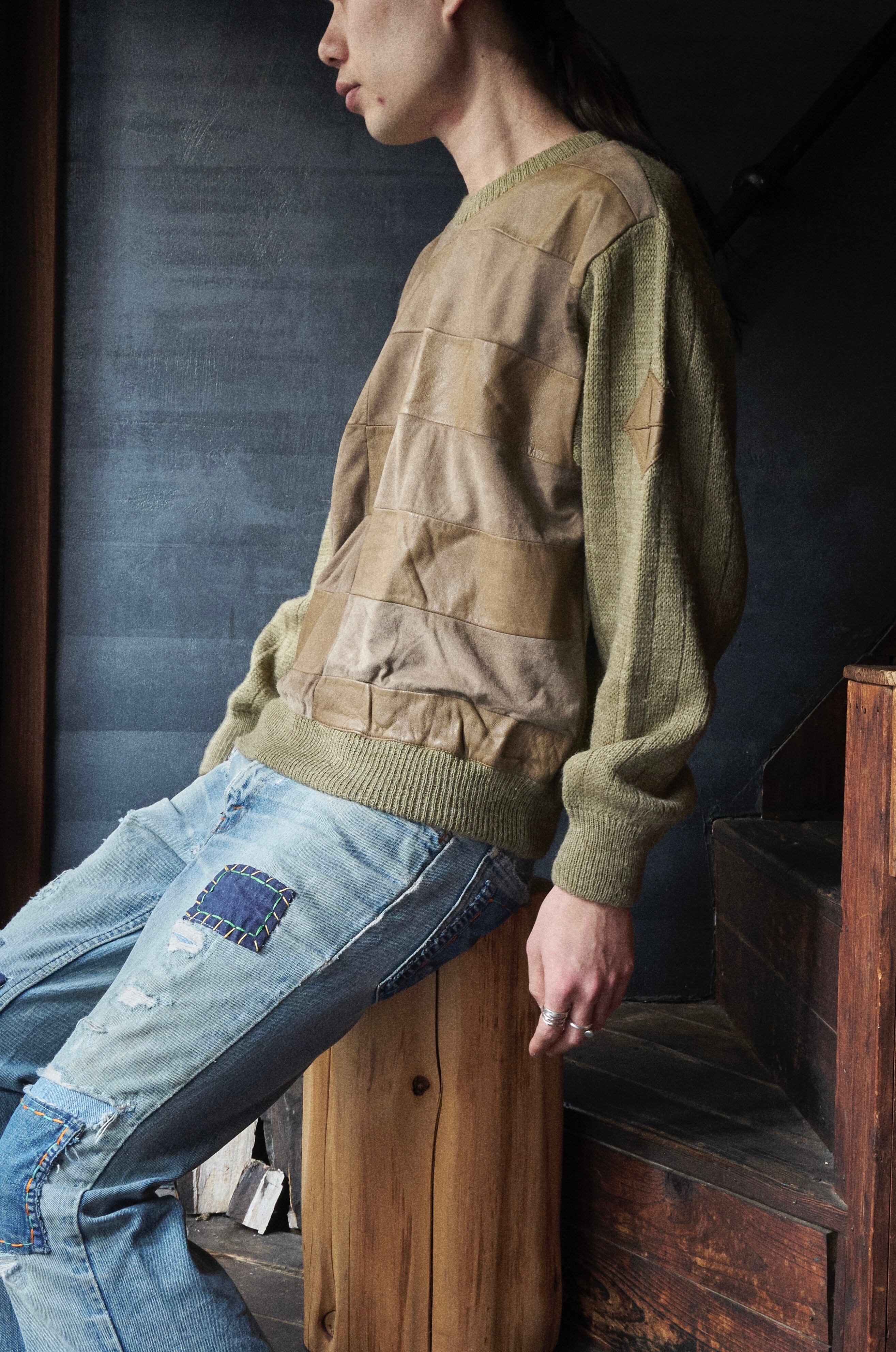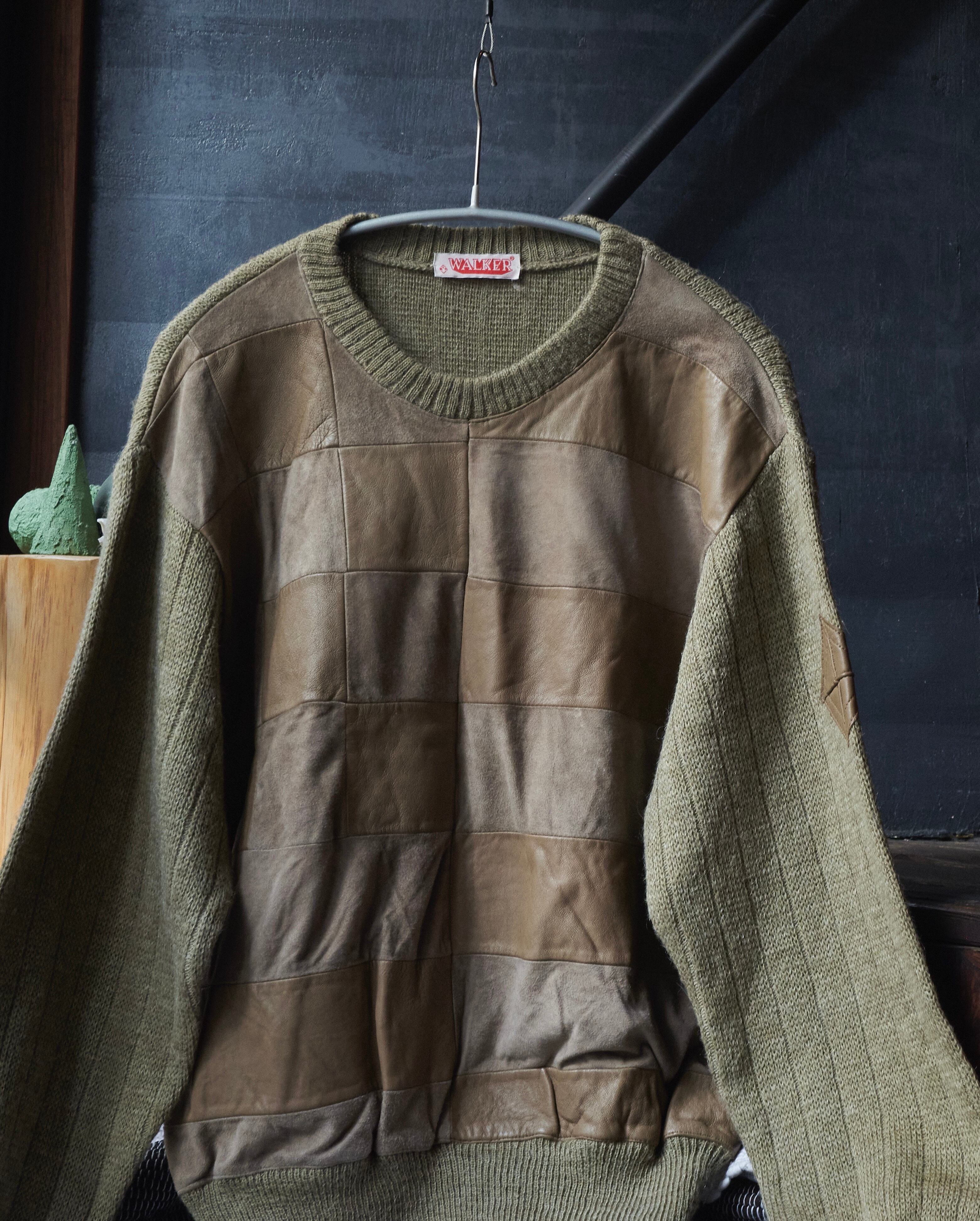 80s euro Leather x suede leather panel docking wool knit