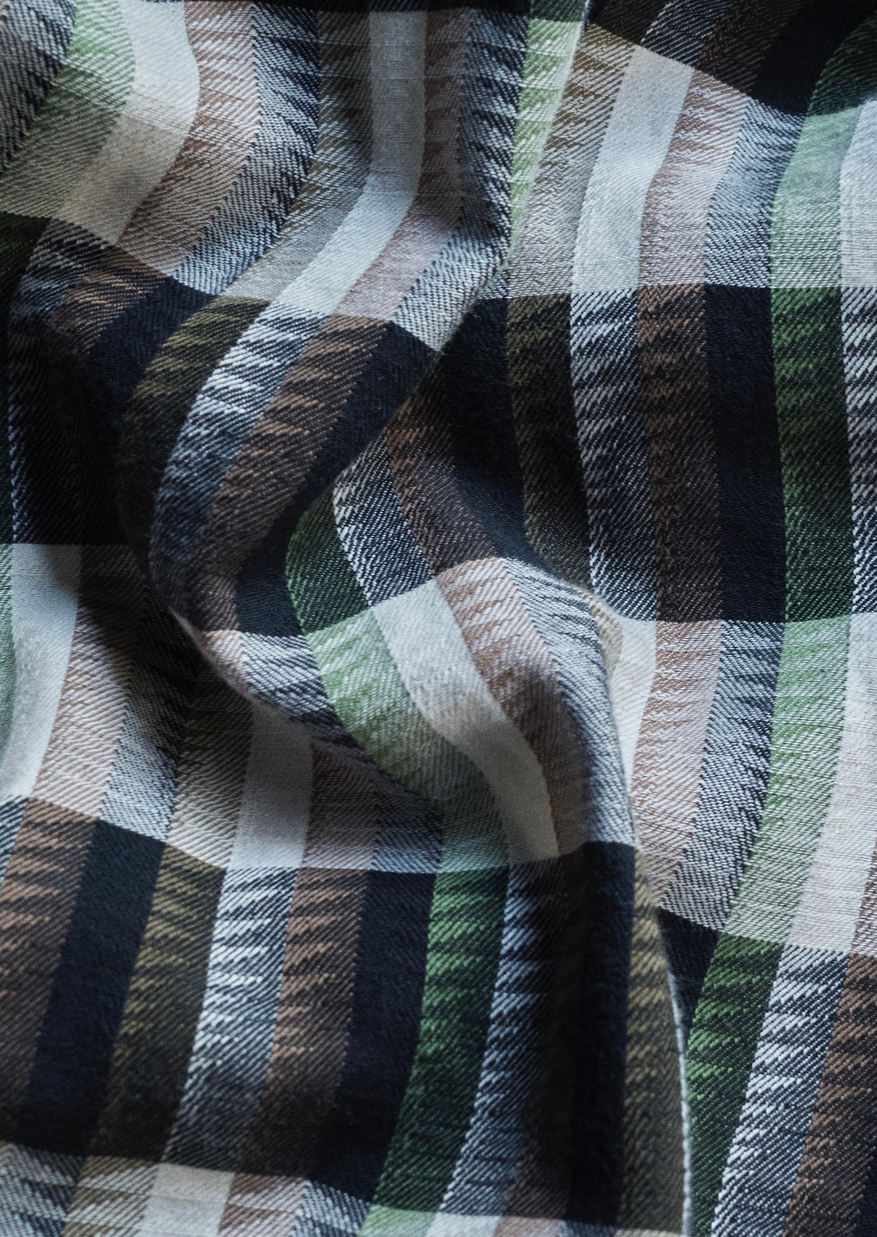白×緑×ブラウン×ブラックから構成された色合いと普遍的な三角の柄で構成されたデザインは。