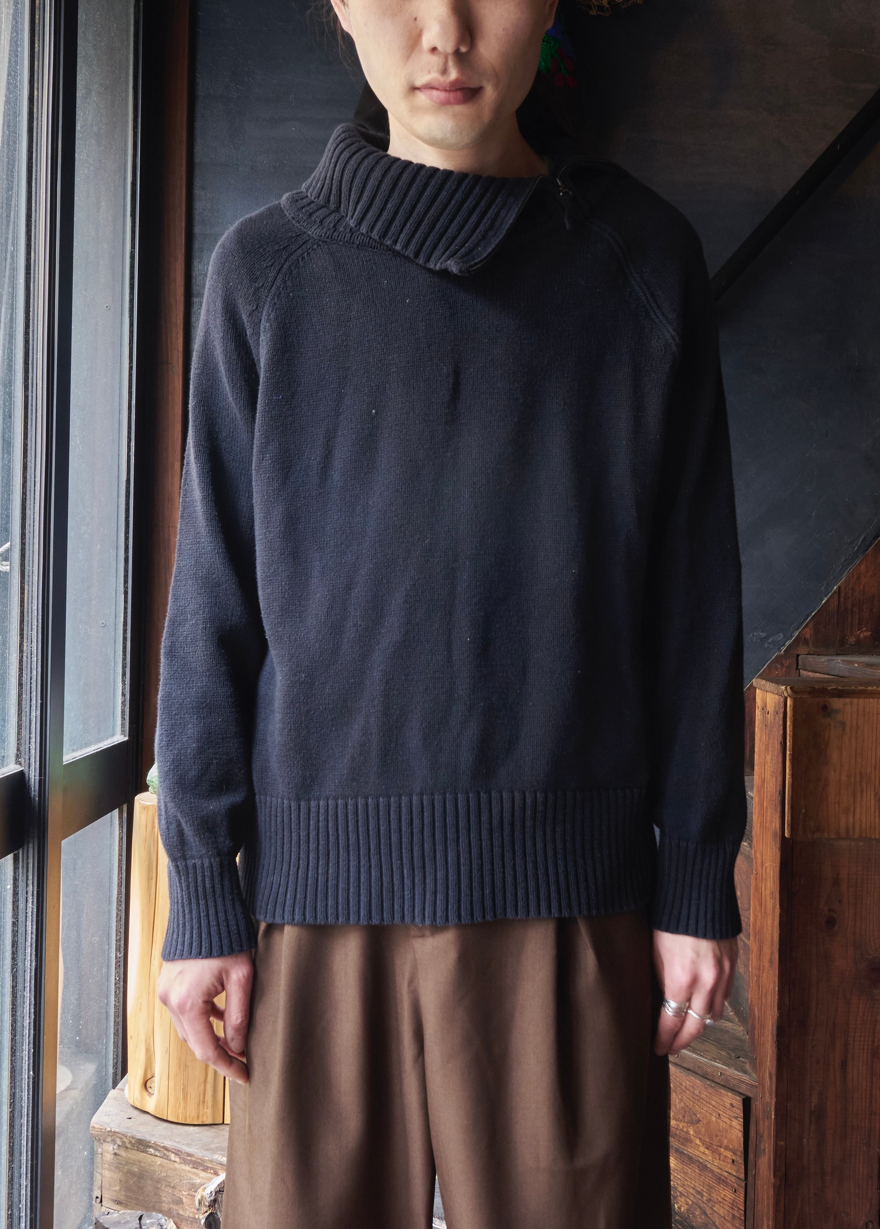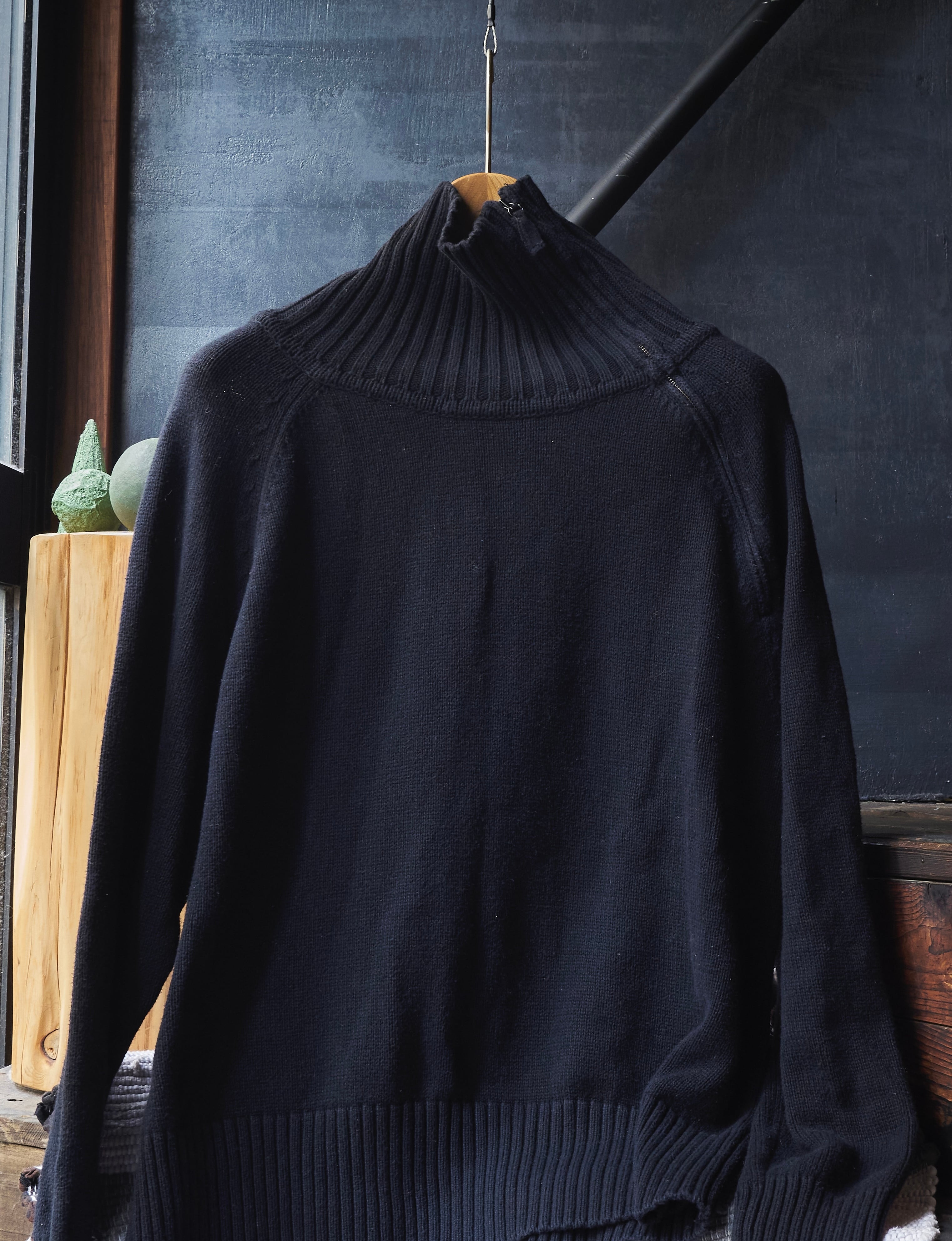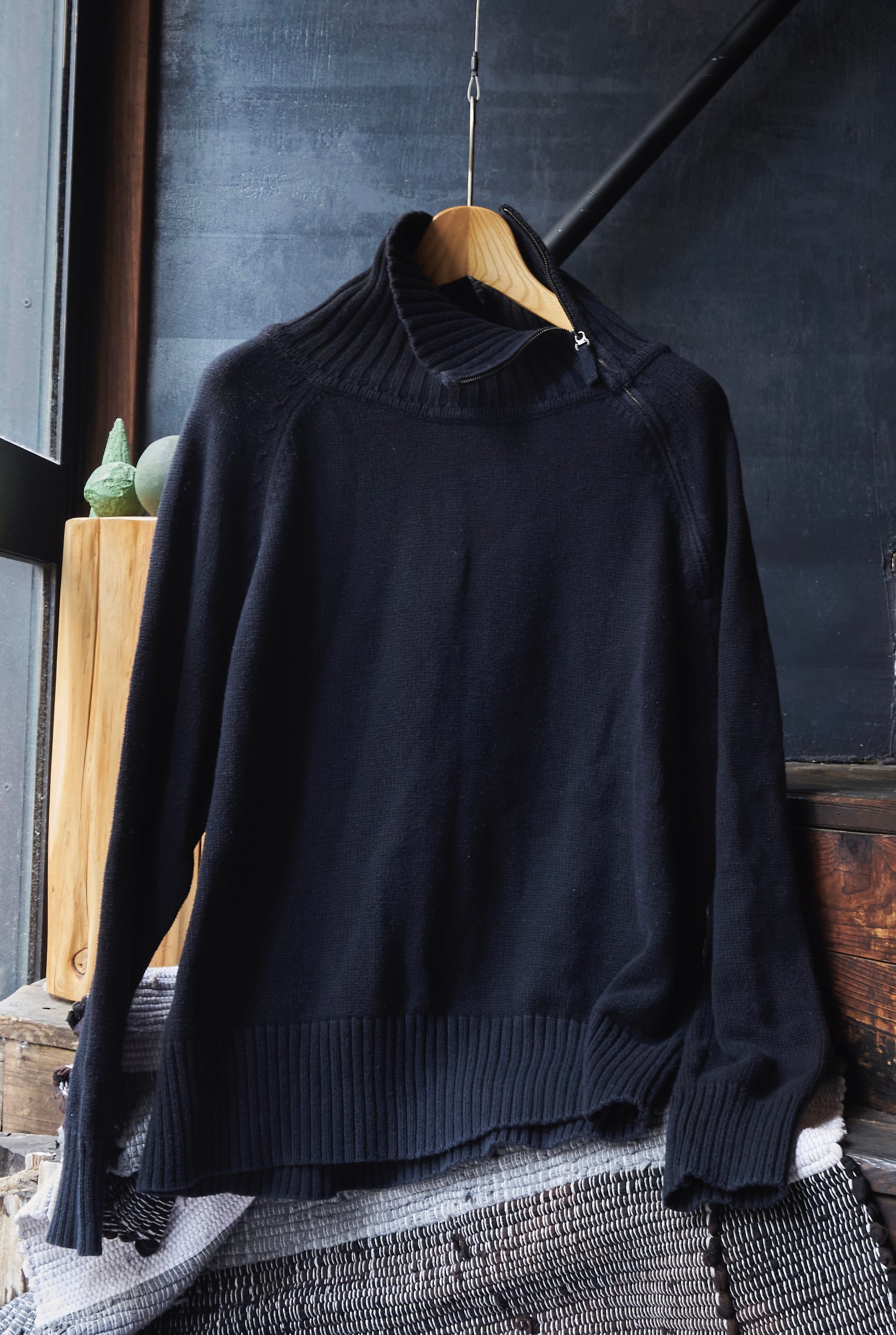 US 2000s High-neck diagonal zip black cotton knit