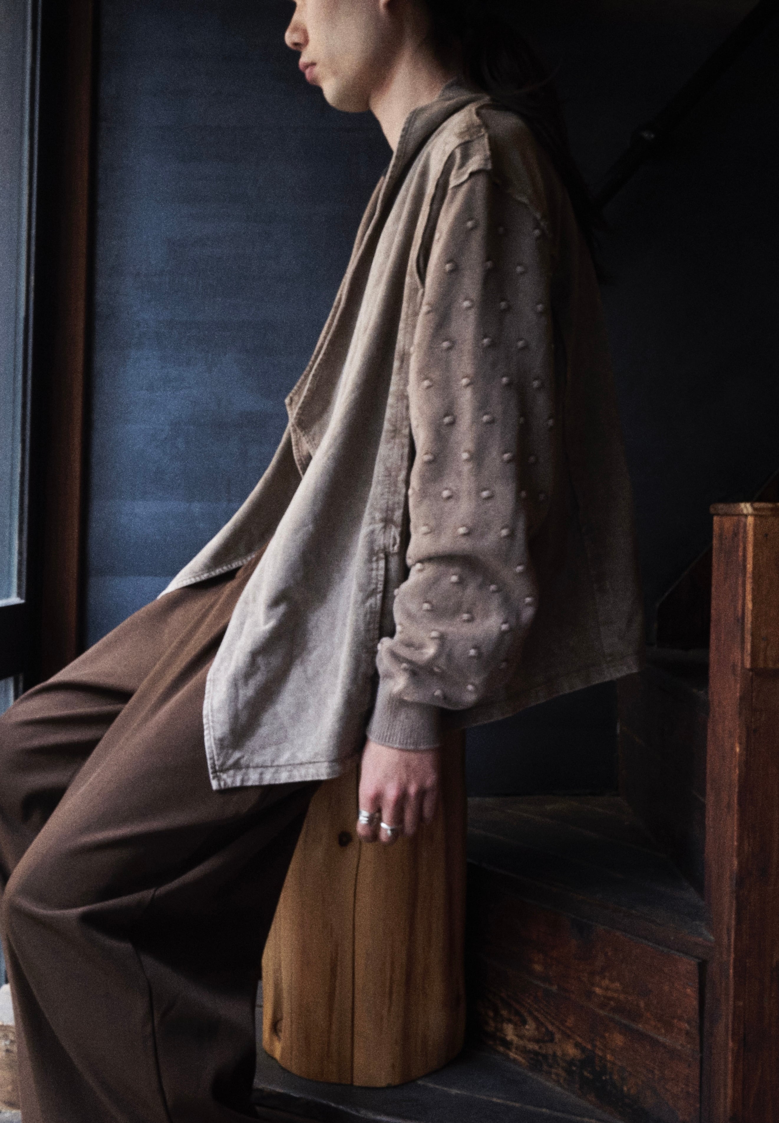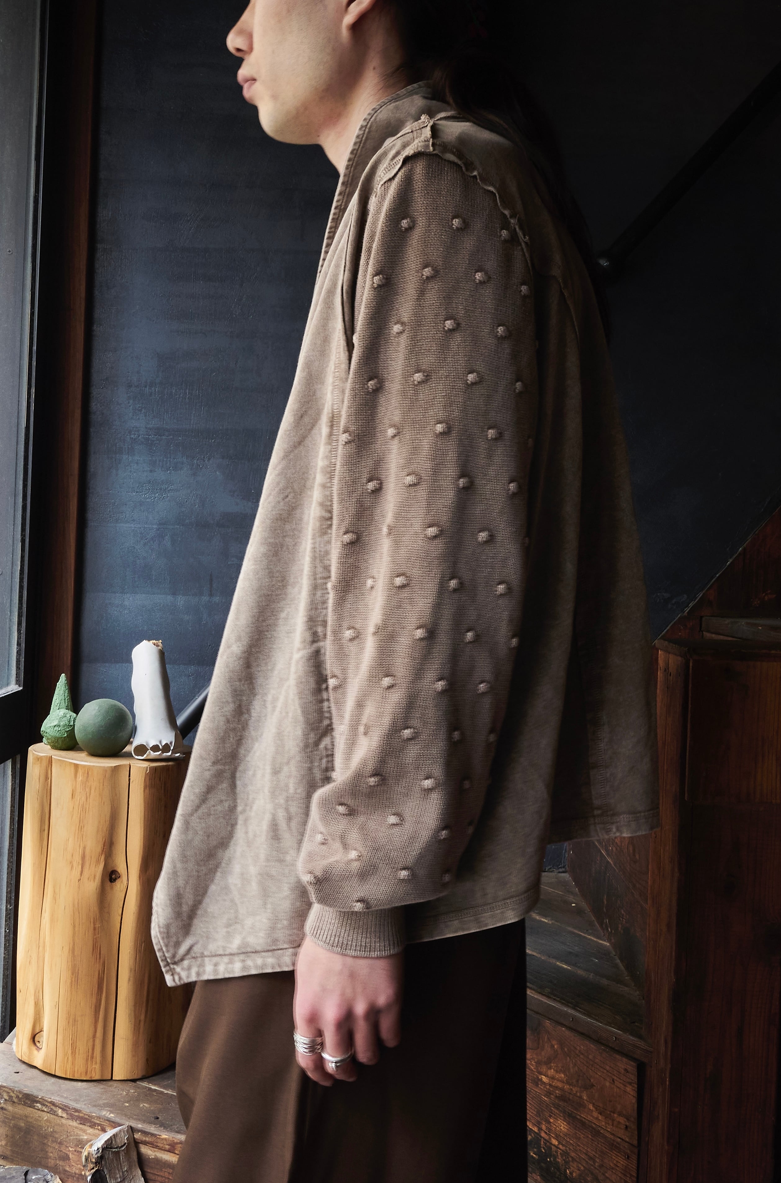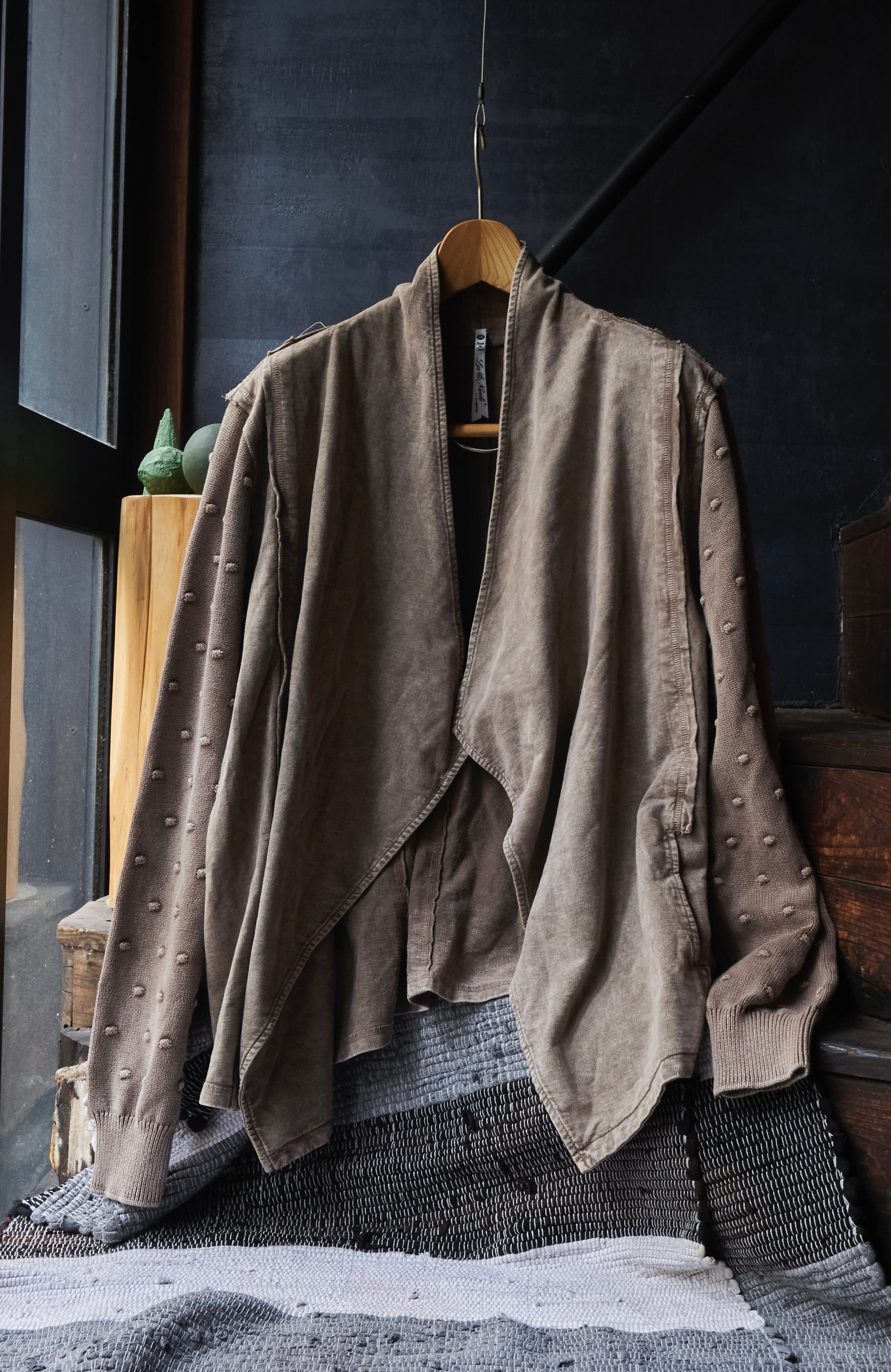 オーバーダイブラウンに程よく色味染まった羽織りジャケット。