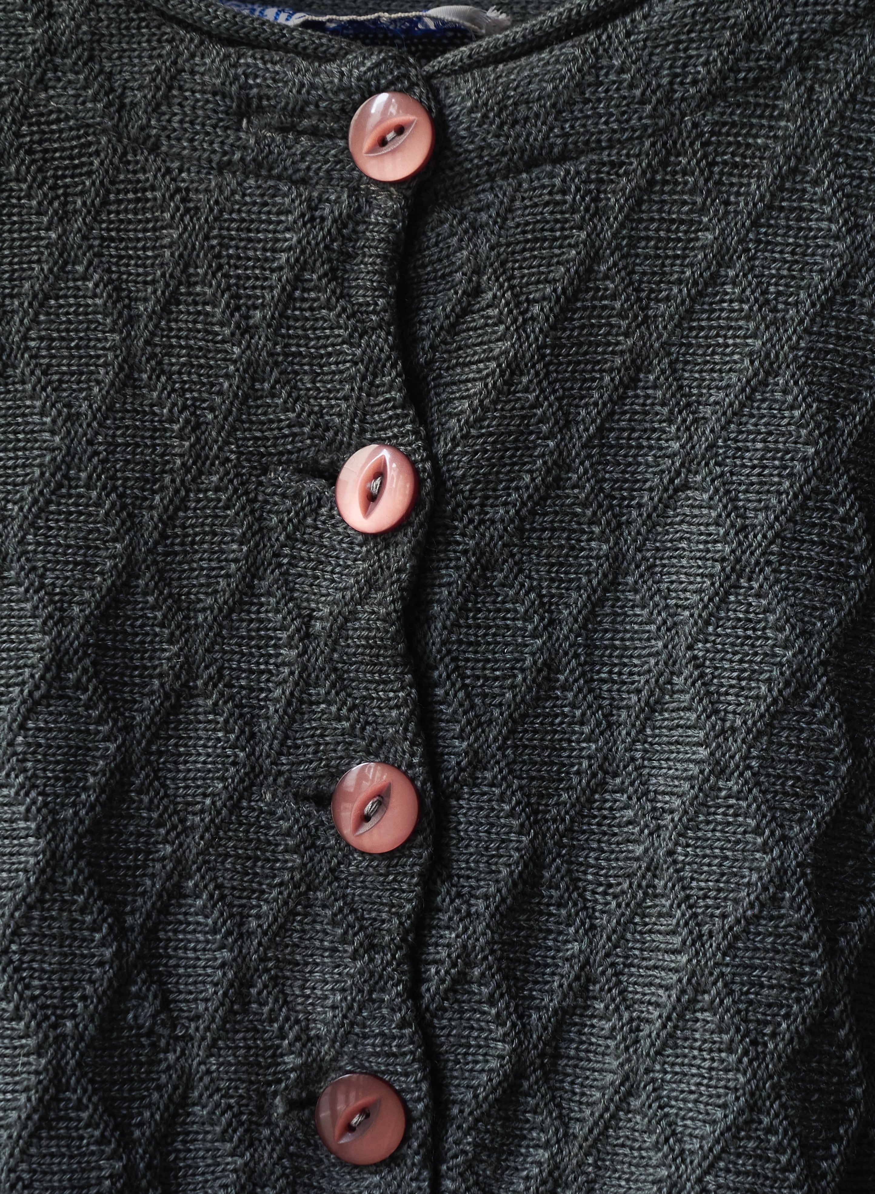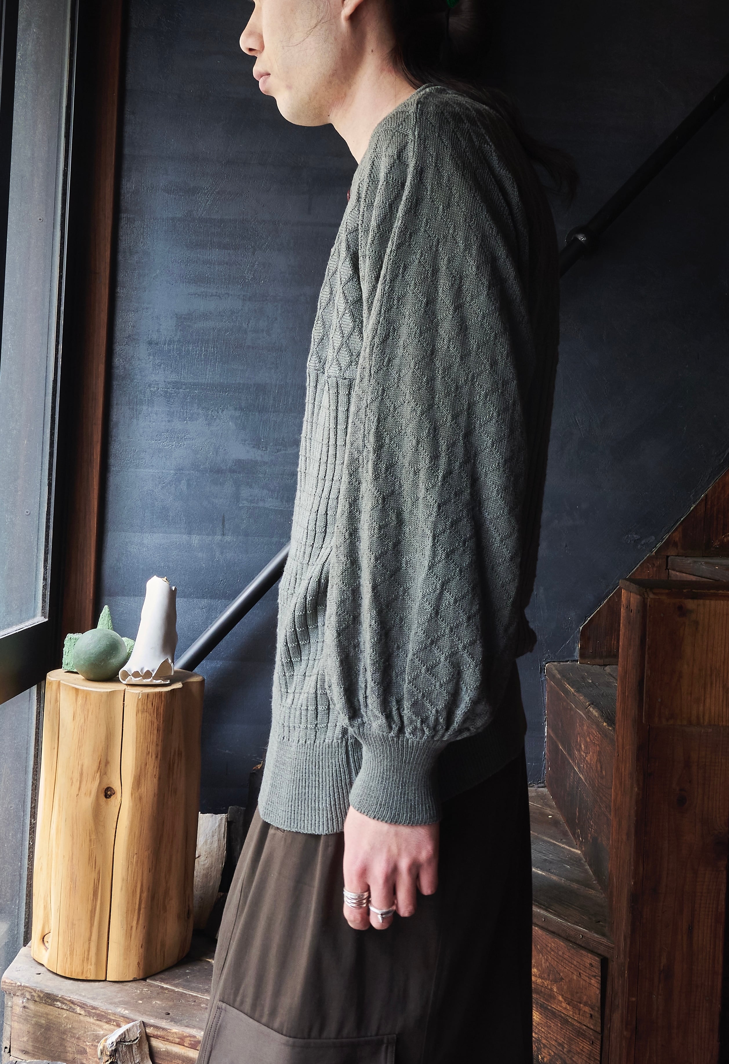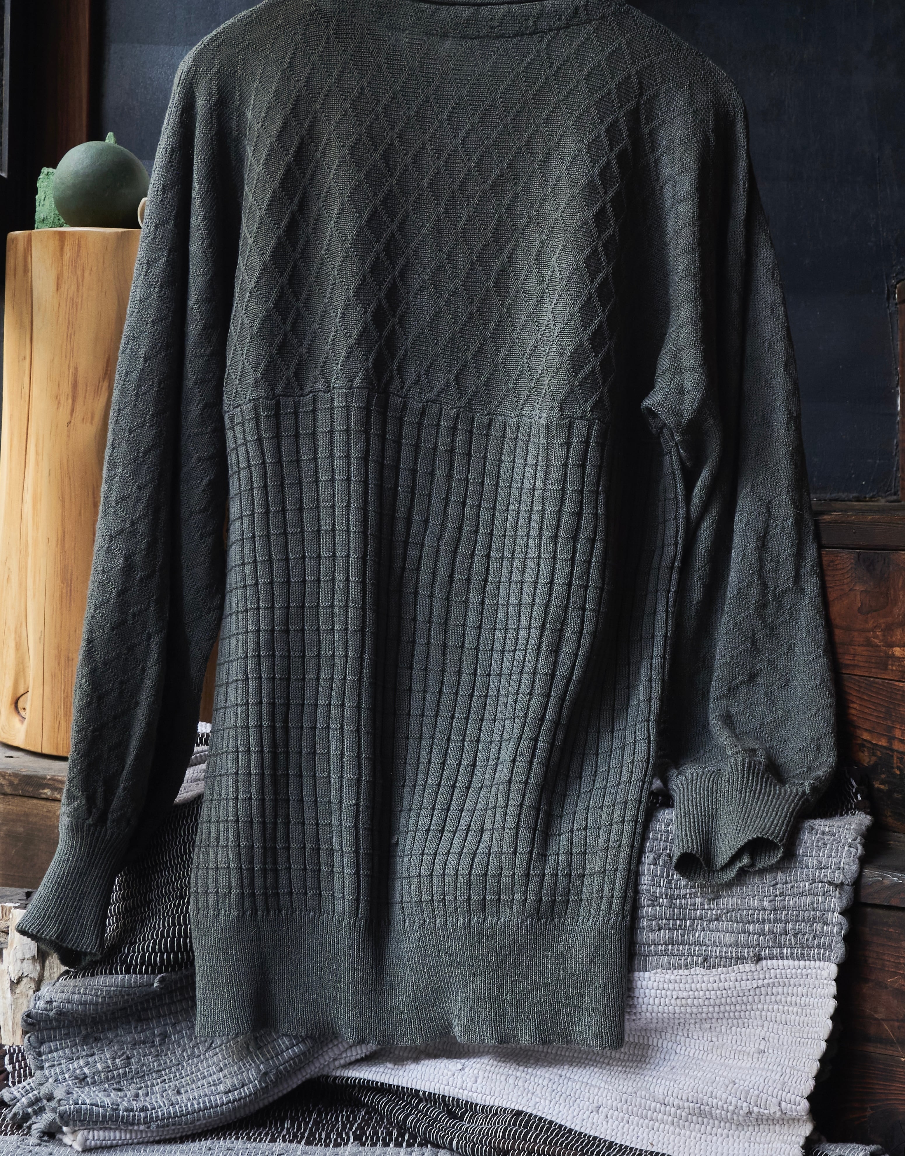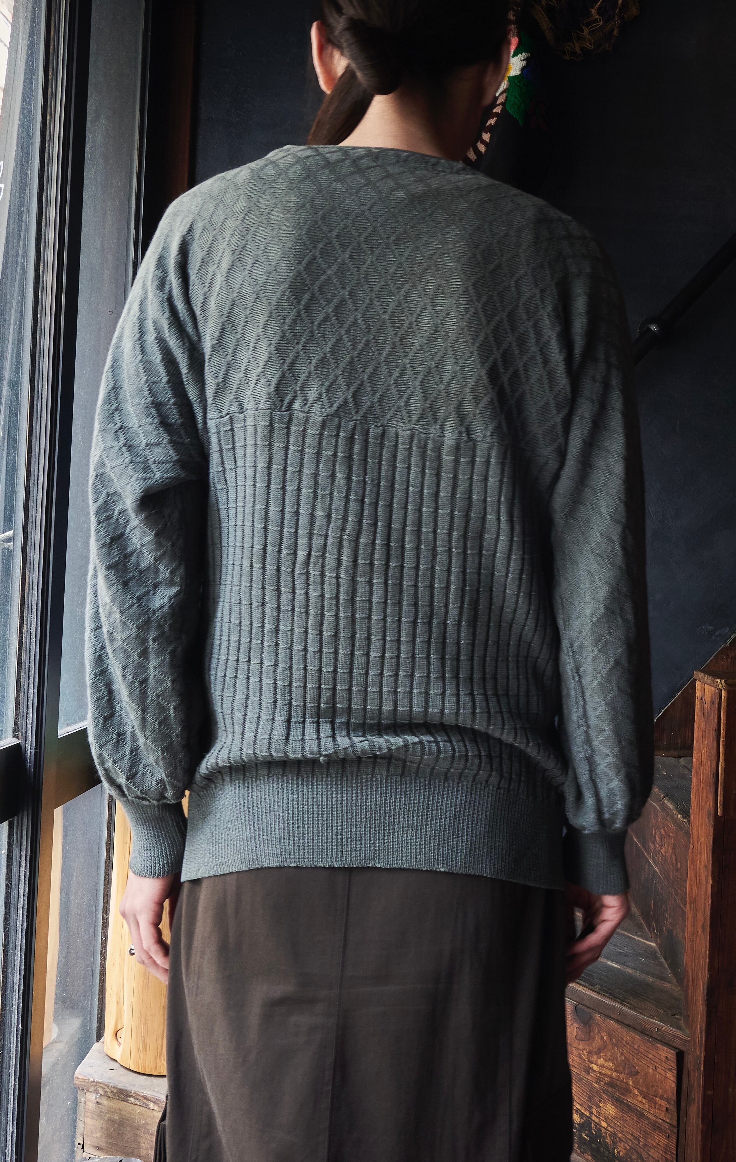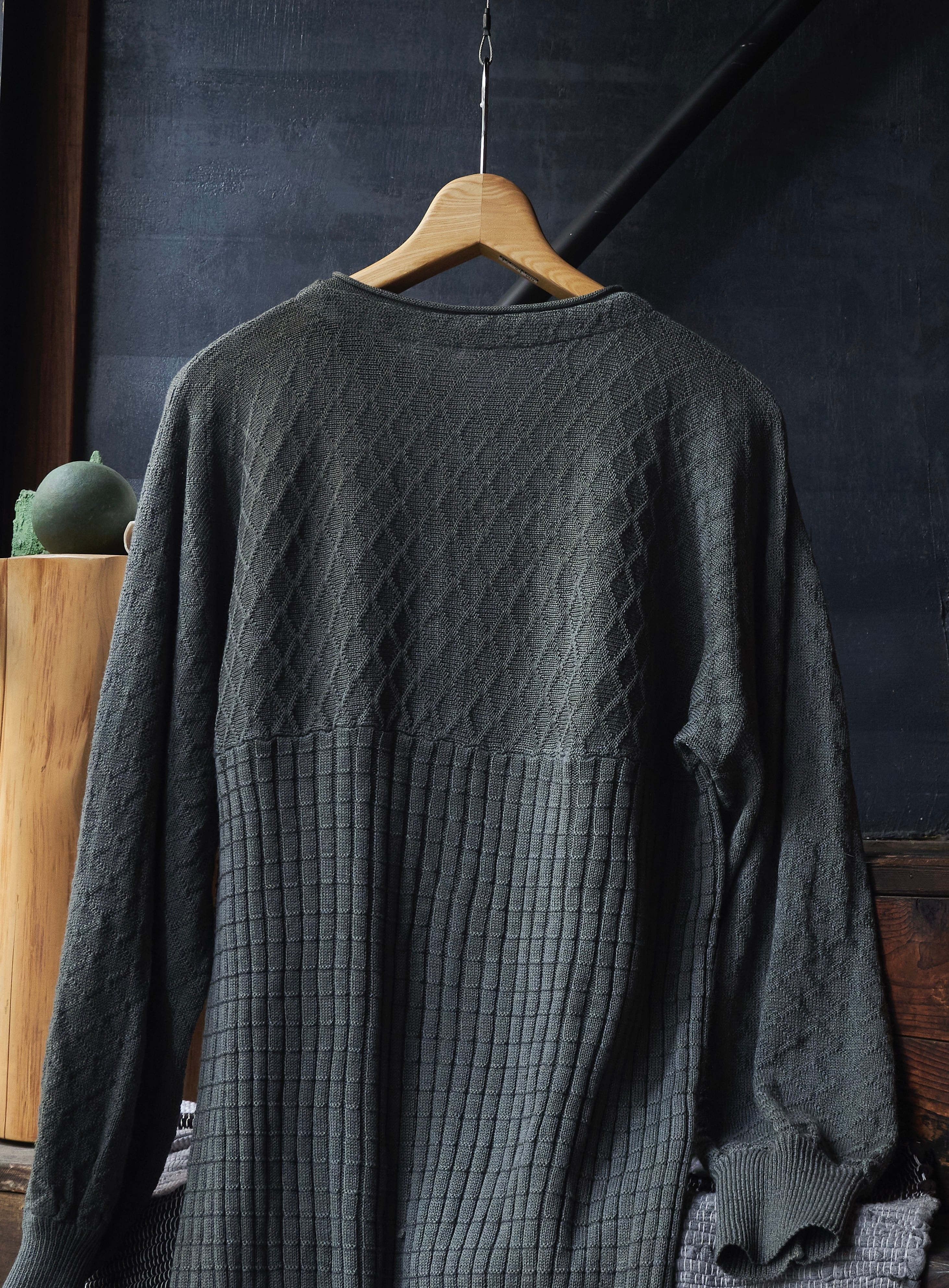 袖の編み地はまるでアンティークのシャツのようにプリーツの入った編みで。