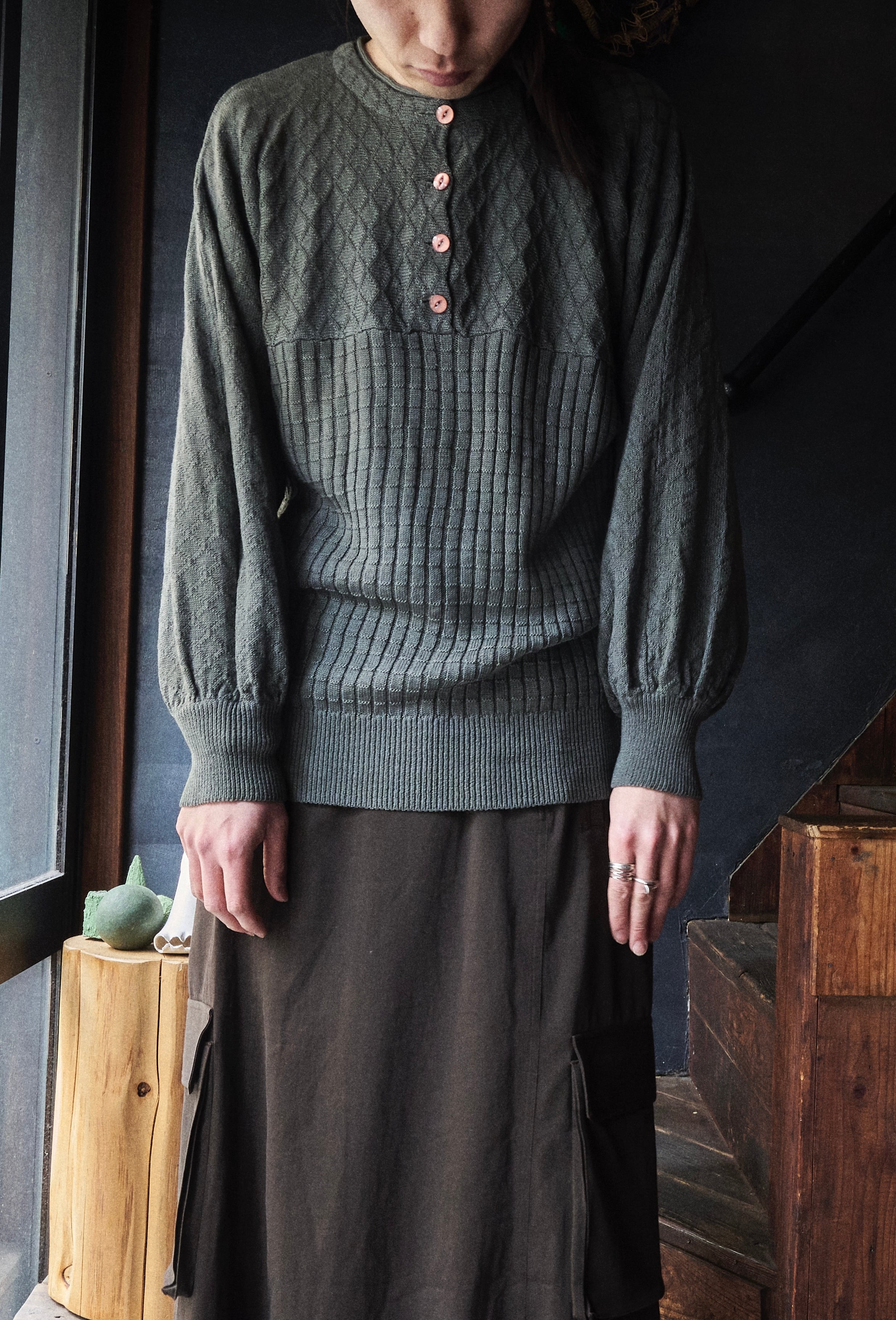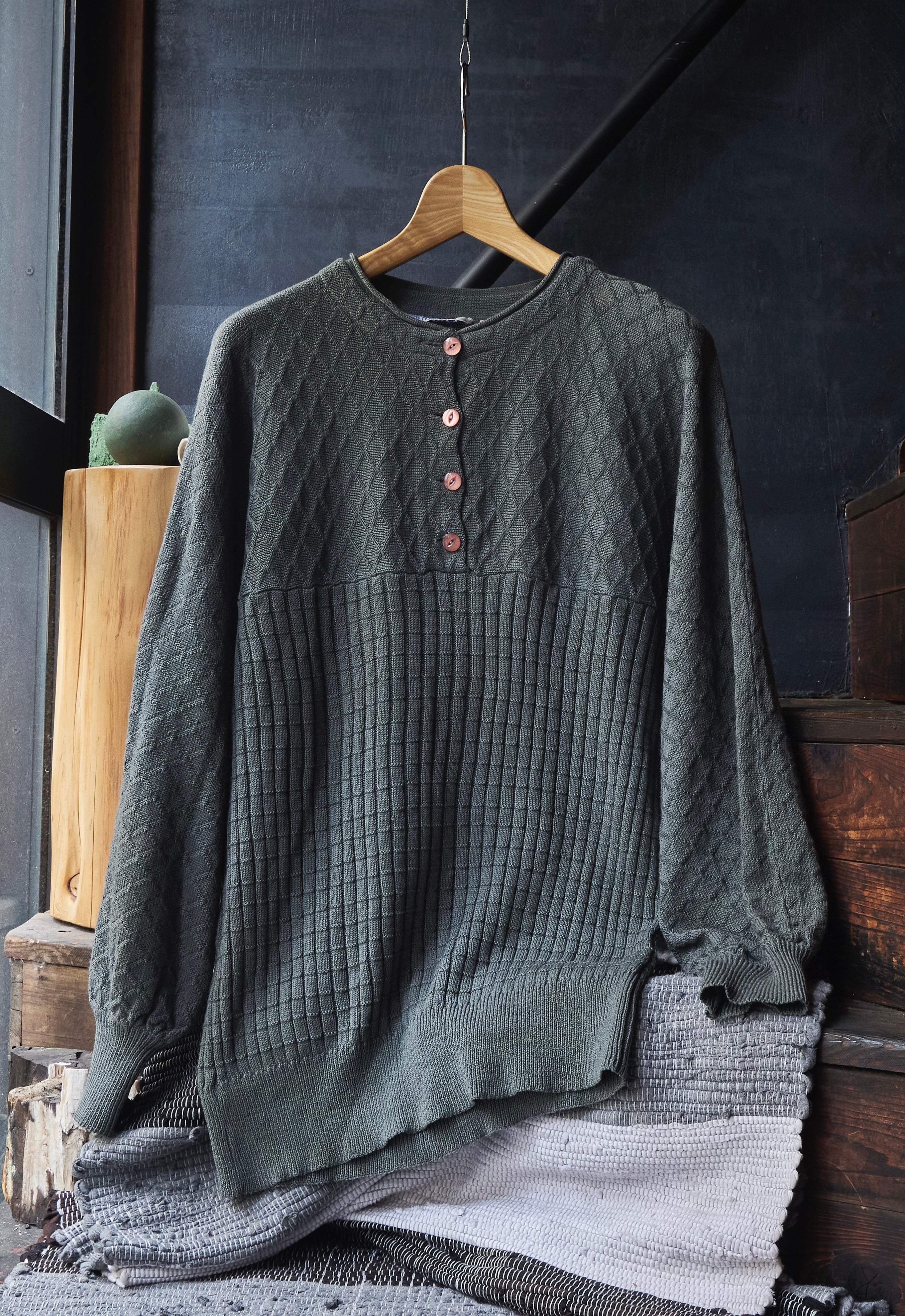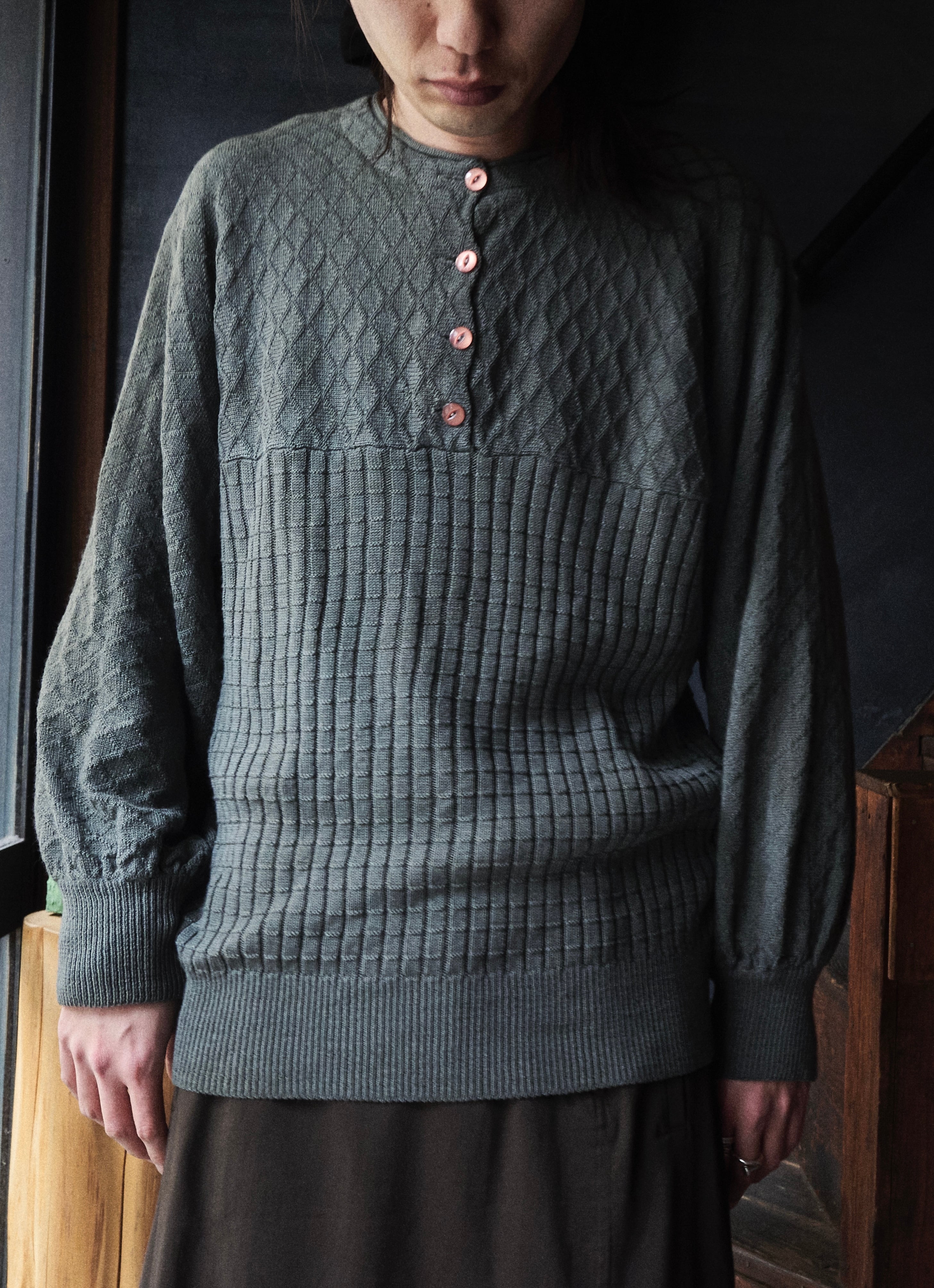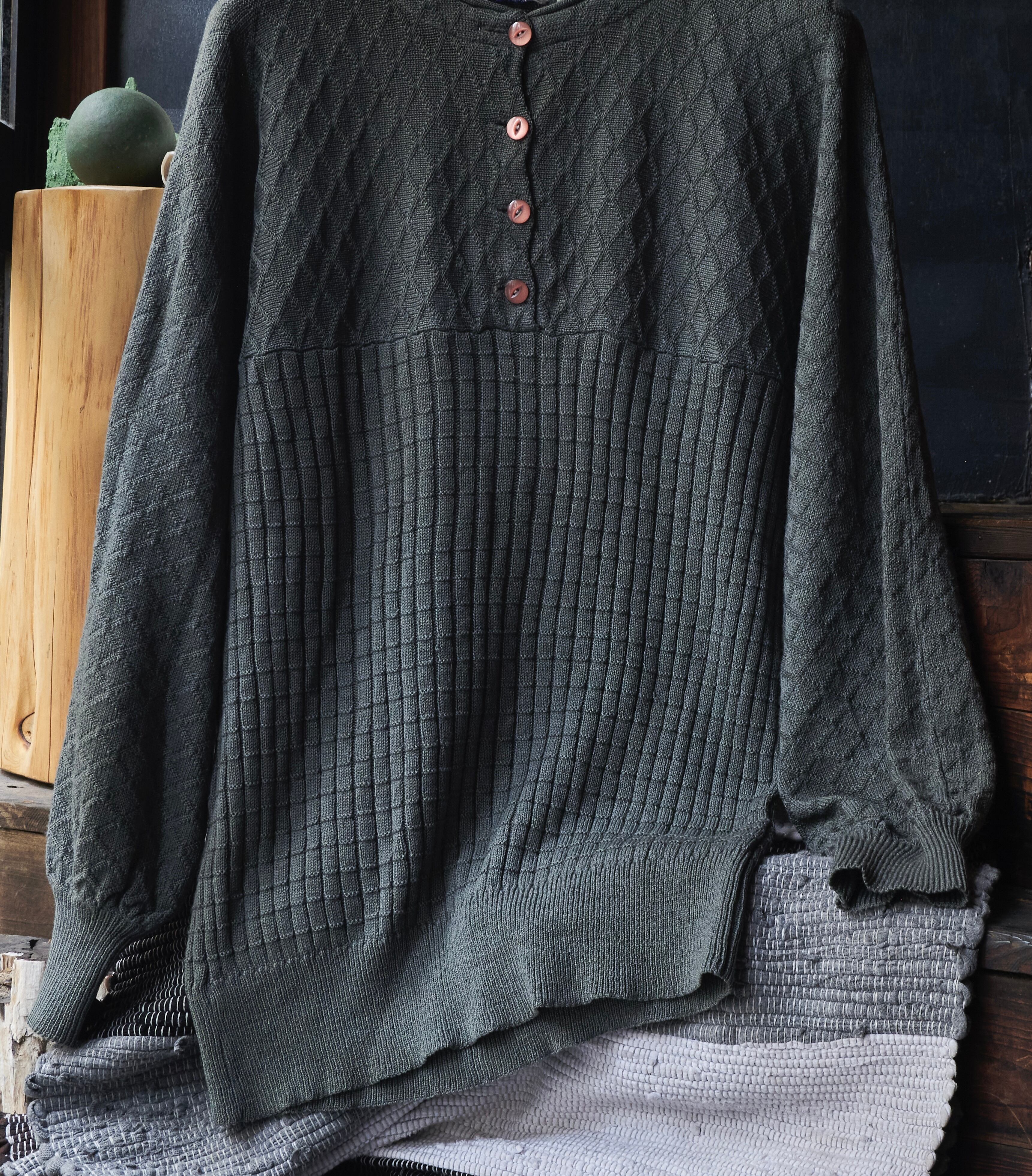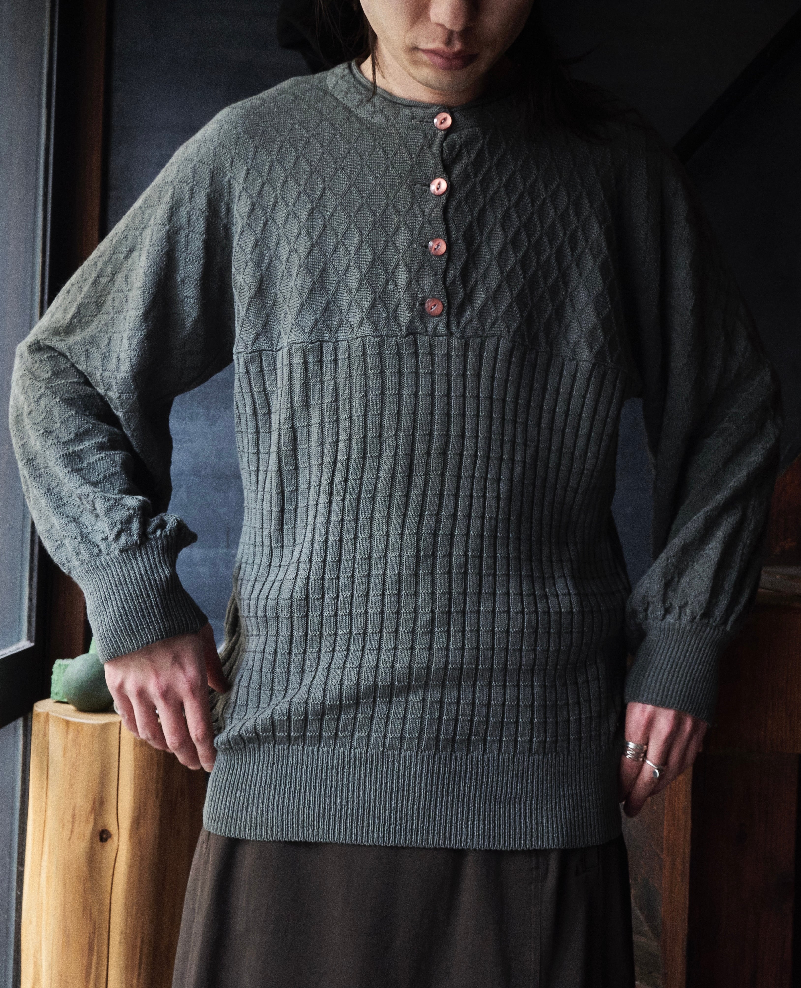 80s euro Two-knit Henley neck pattern knit