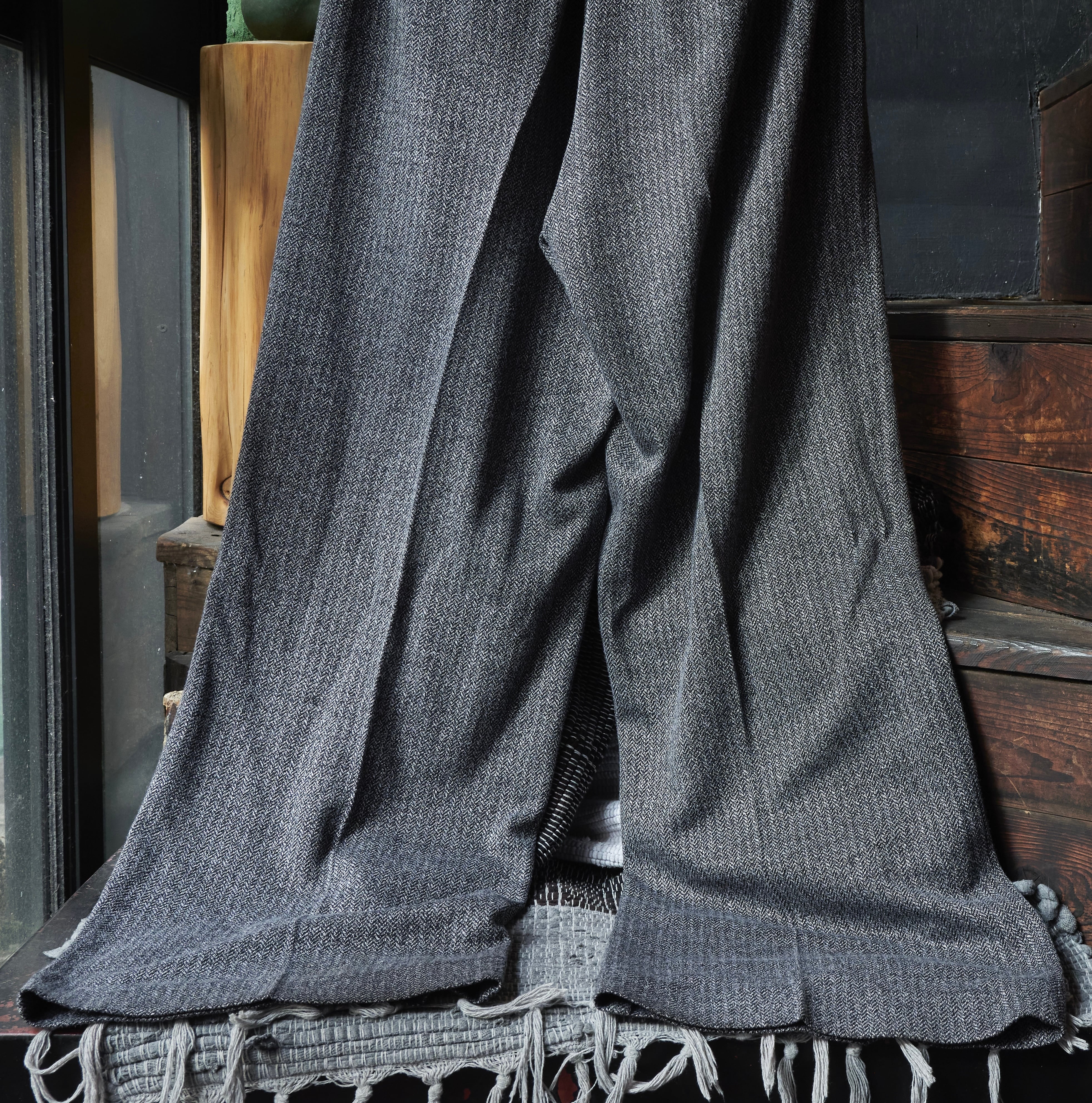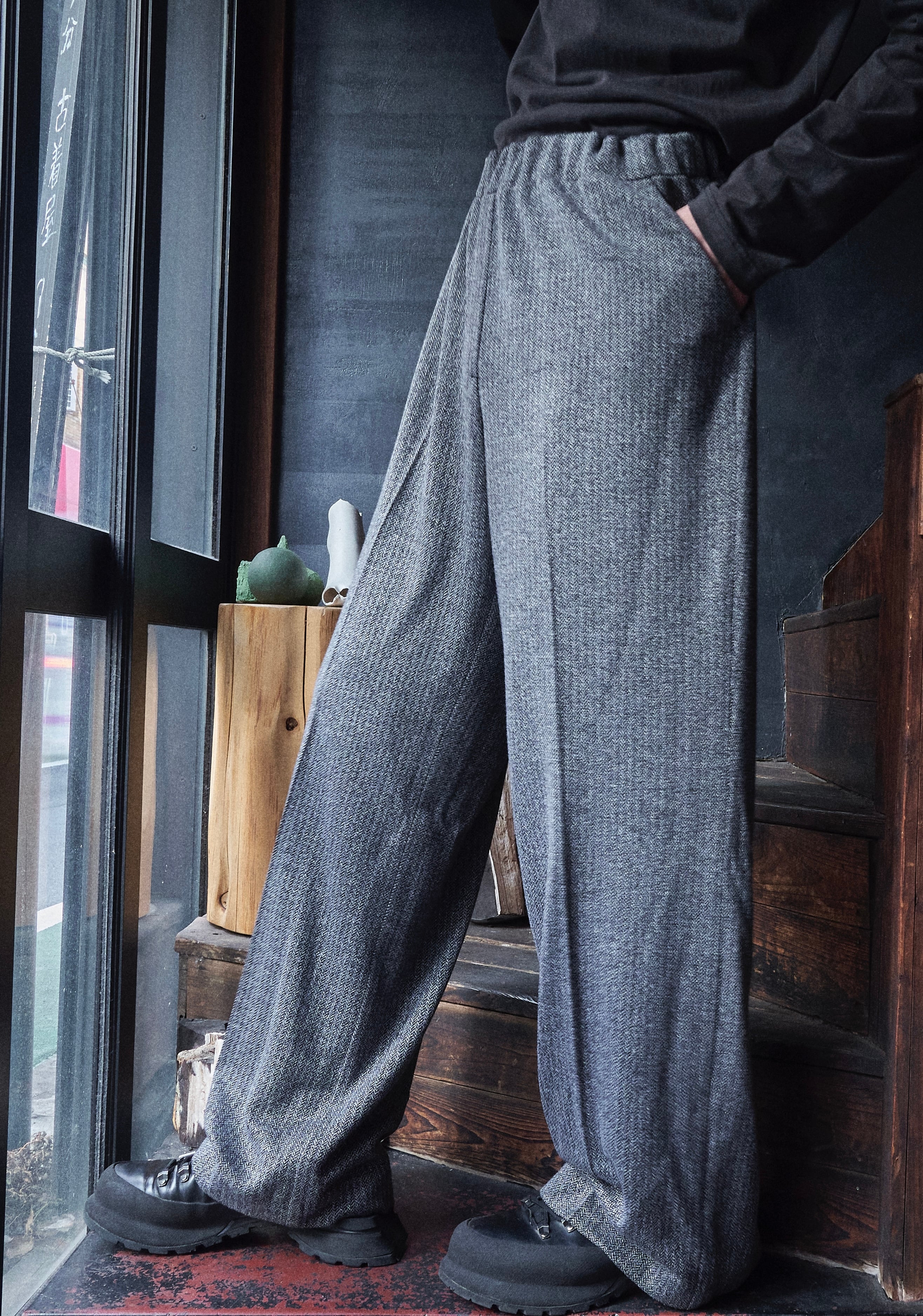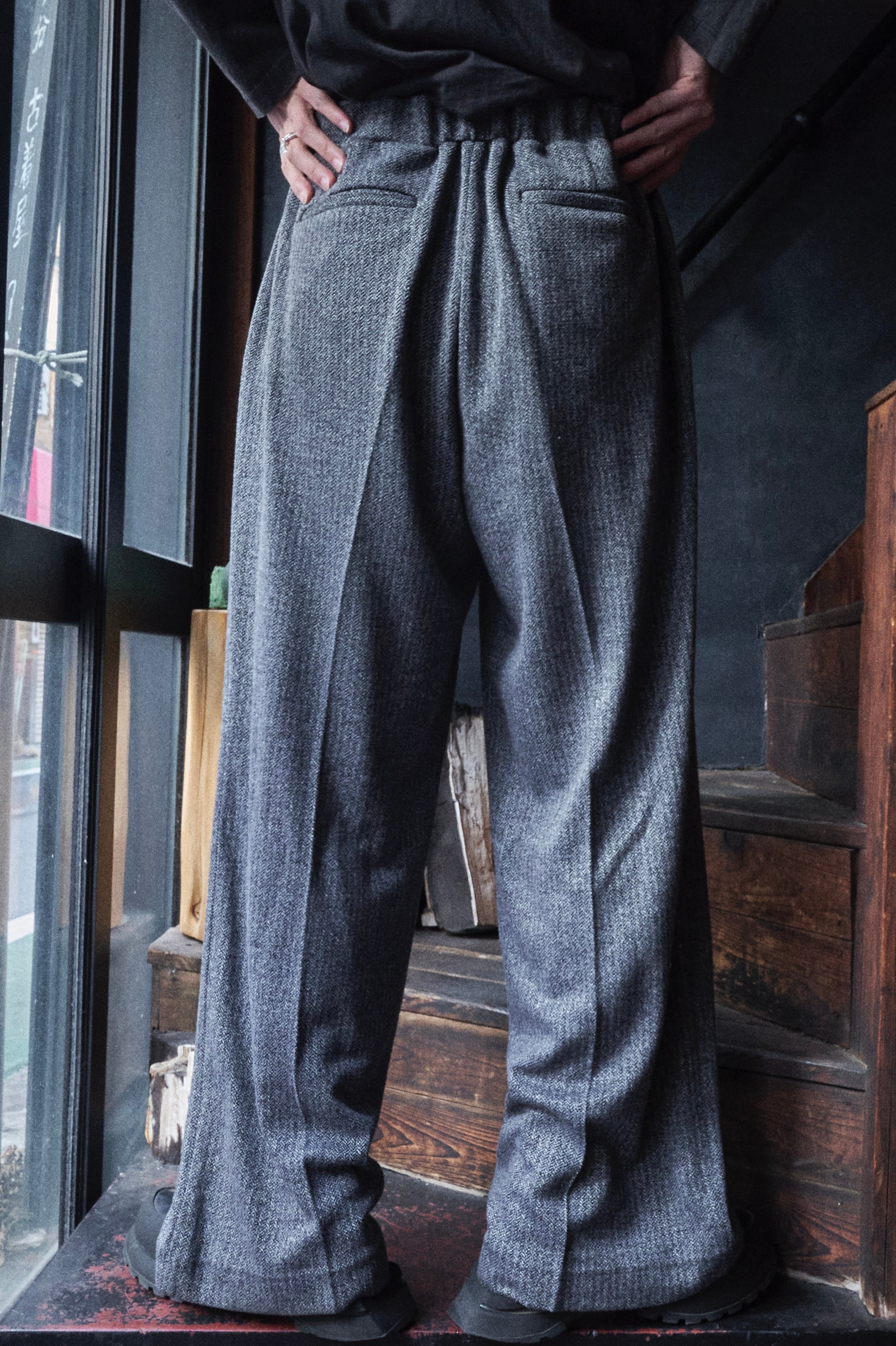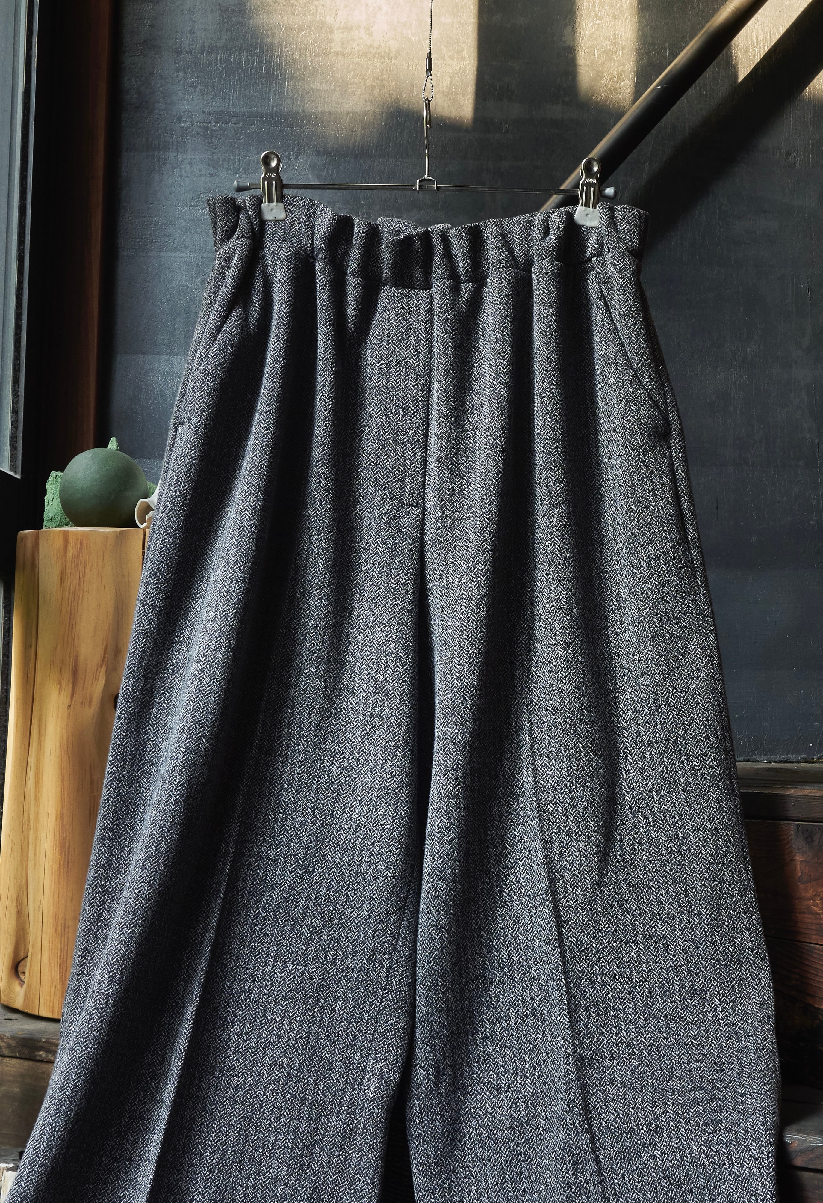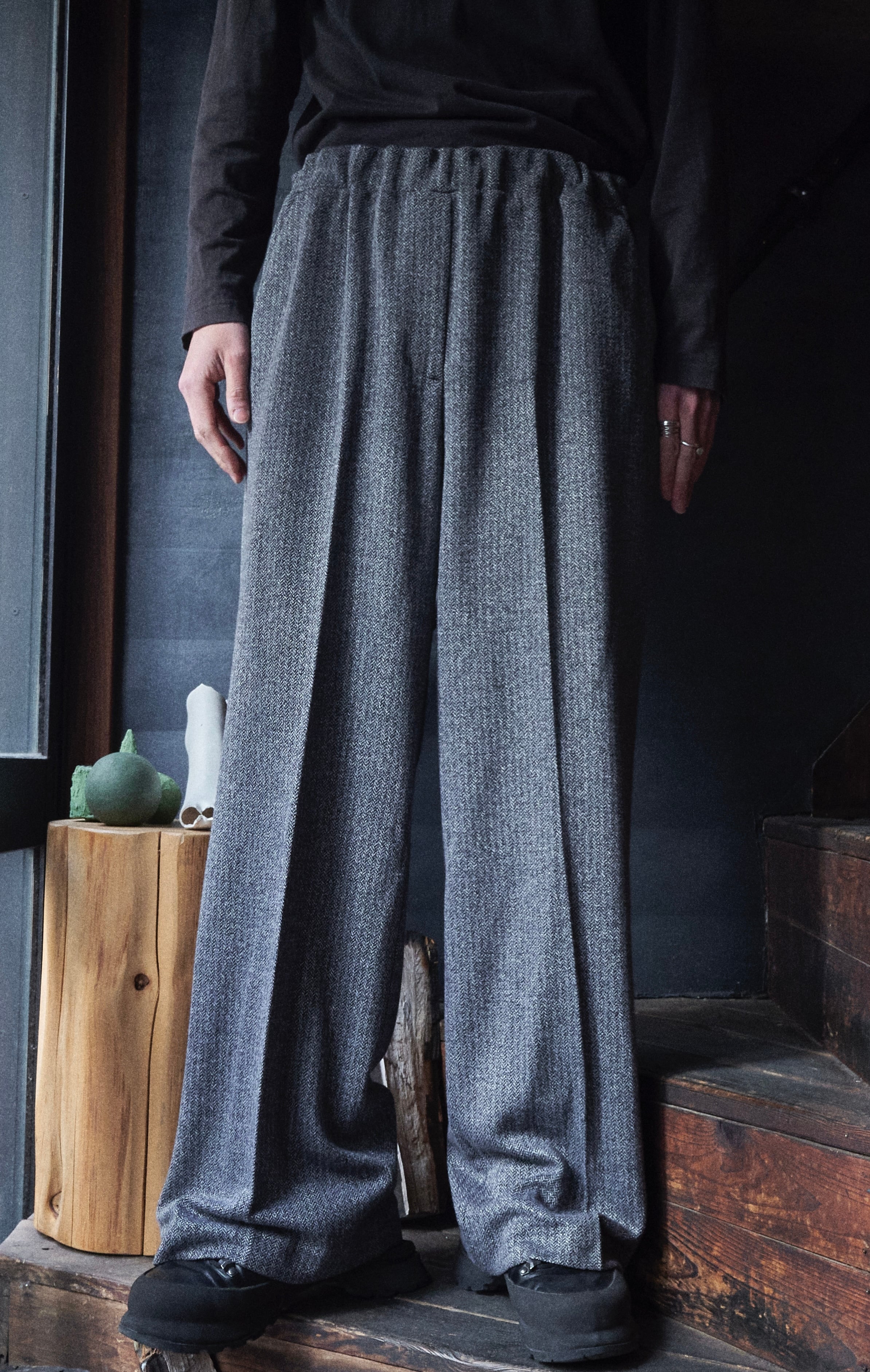 現代的ヘリンボーンの織りを使用したバギーイージースラックス。