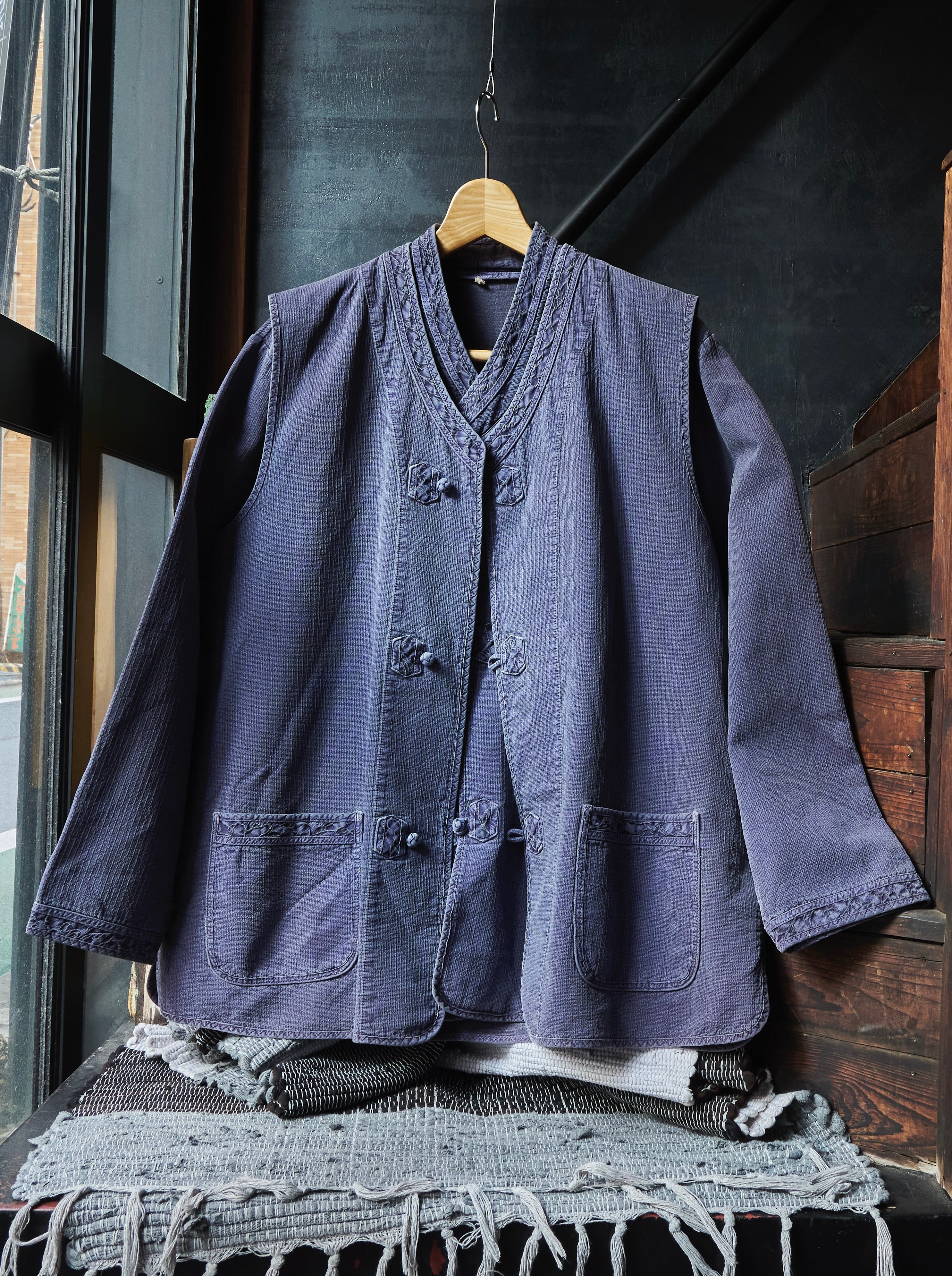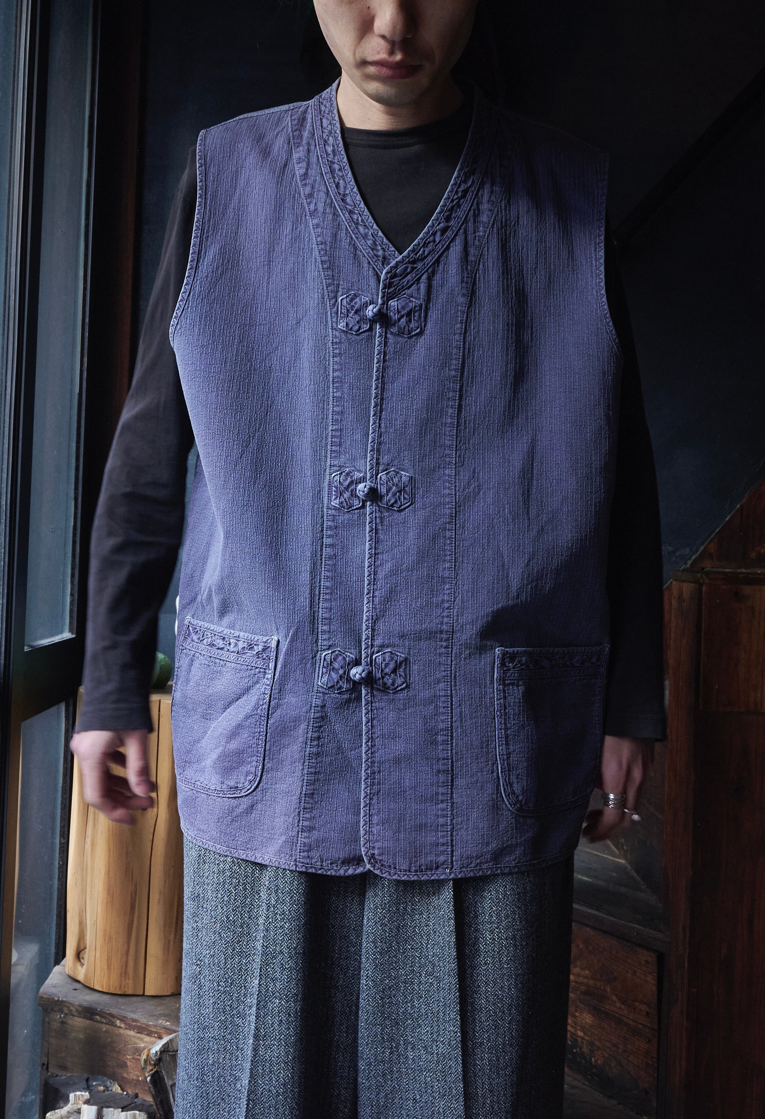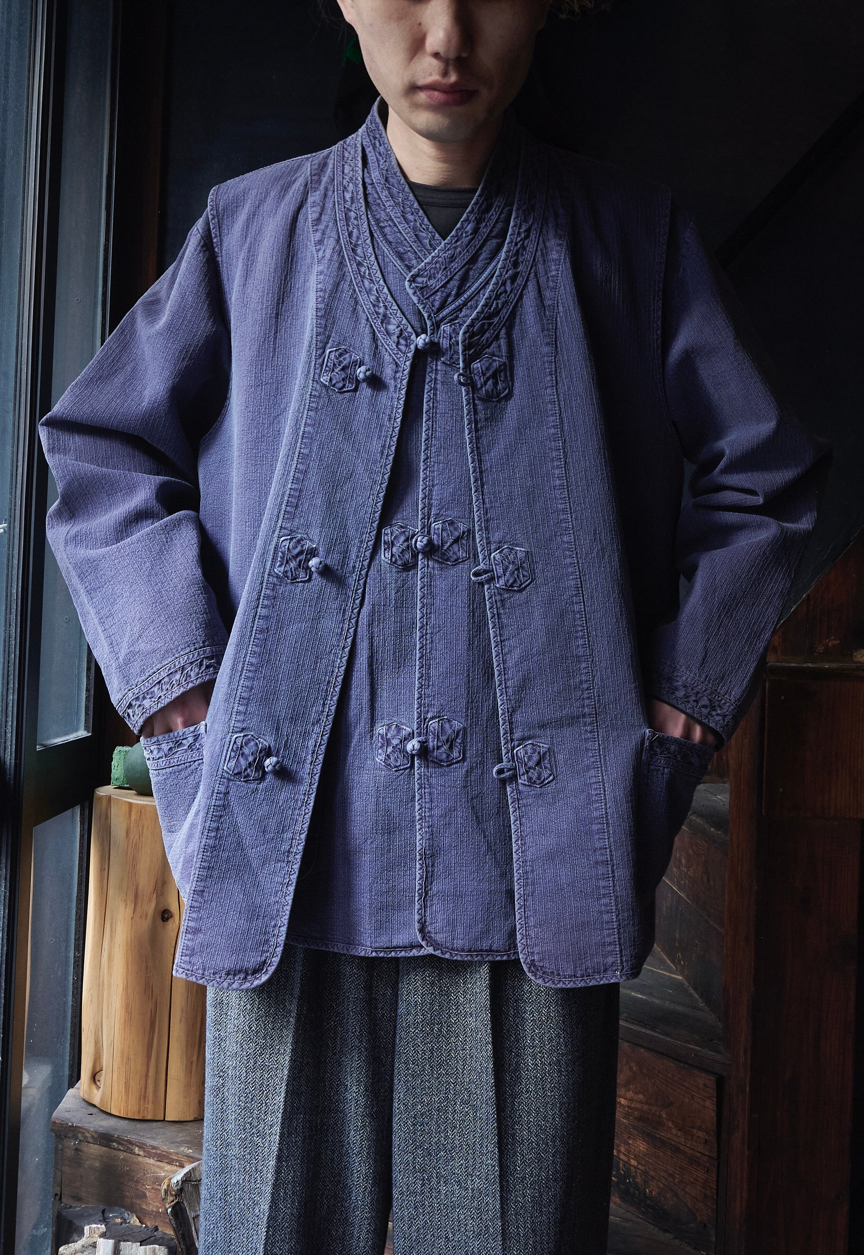 チャイナジャケットってよりチャイナすぎると着づらさありますが、このジャケットとベストは染め感よく、フェード感も良いので、少し太さあるパンツとかと合わせたらかっこいいかと思ってます。