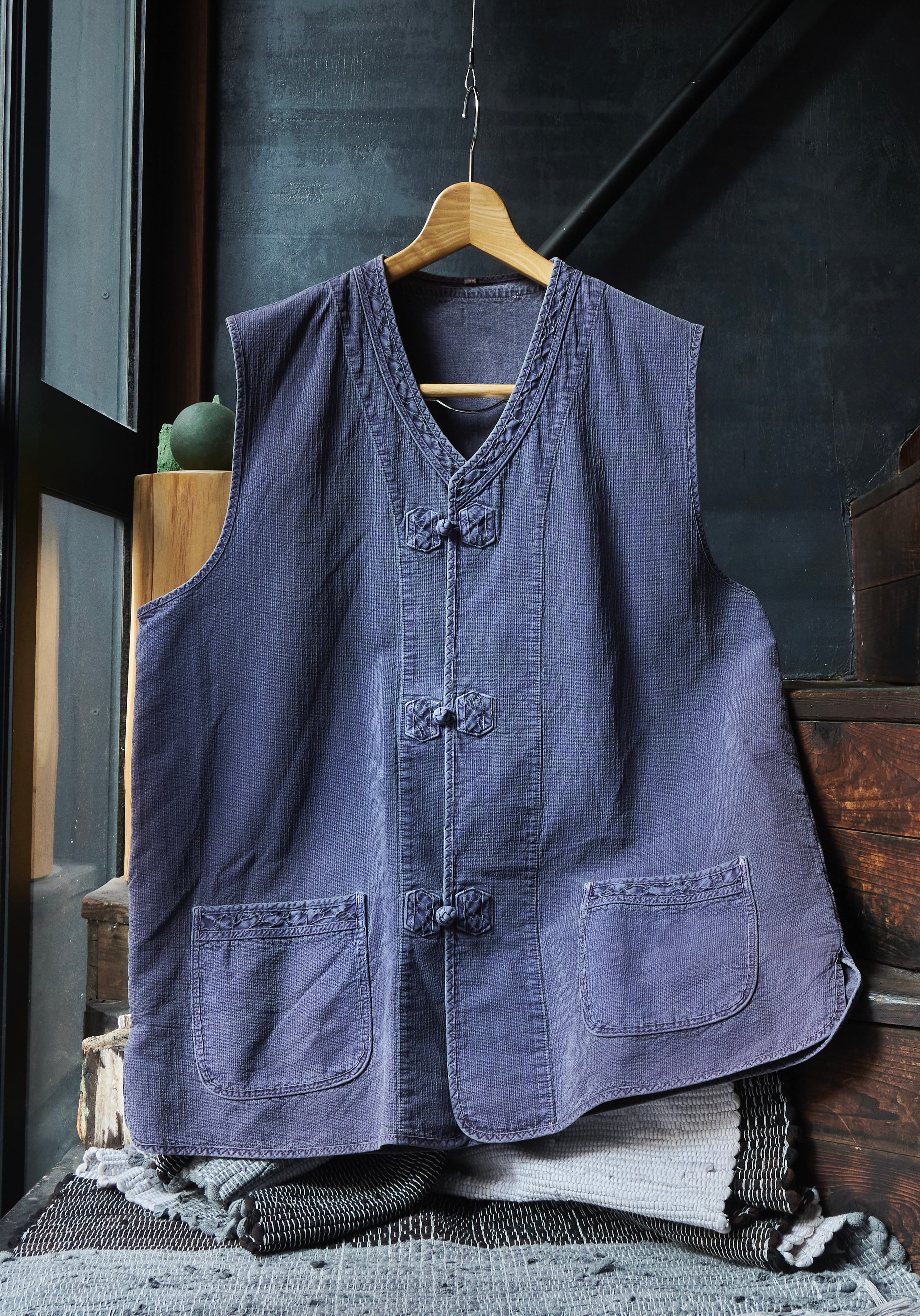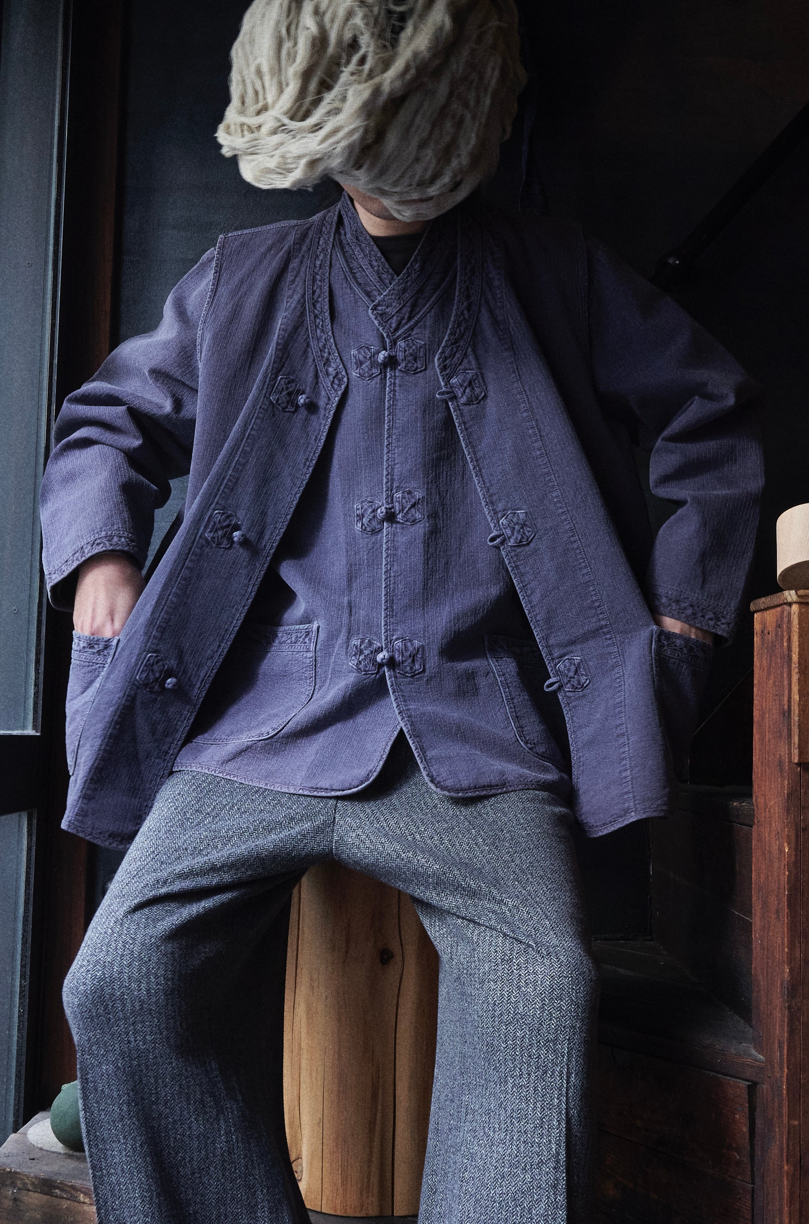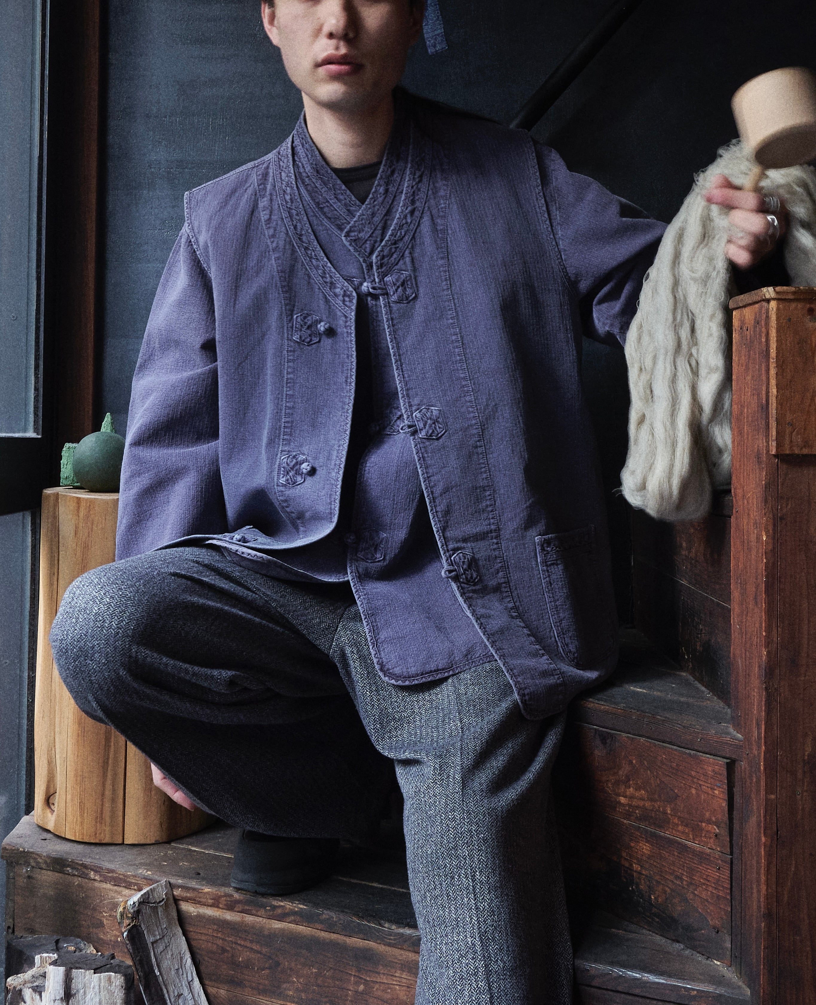 チャイナジャケットってよりチャイナすぎると着づらさありますが、このジャケットとベストは染め感よく、フェード感も良いので、少し太さあるパンツとかと合わせたらかっこいいかと思ってます。