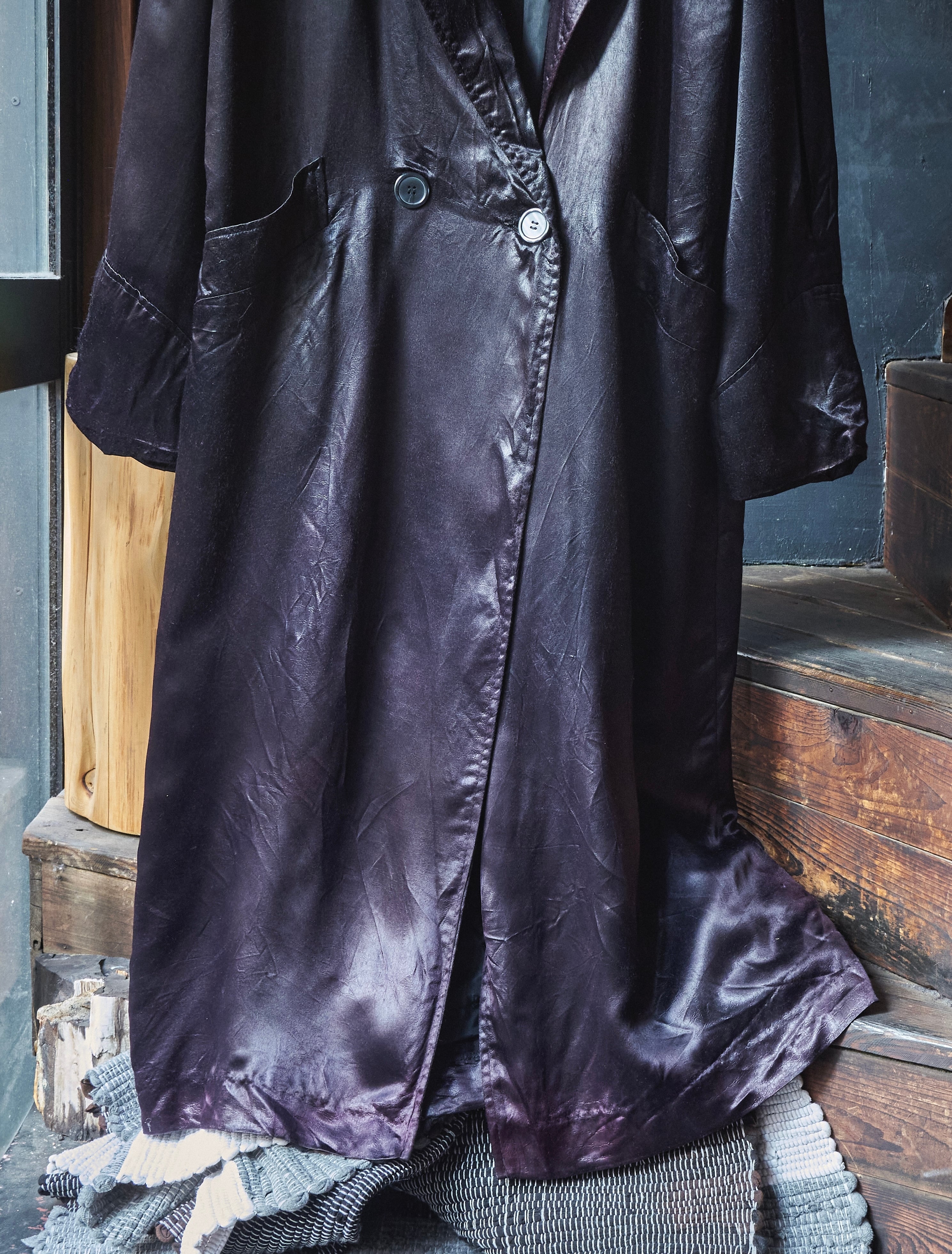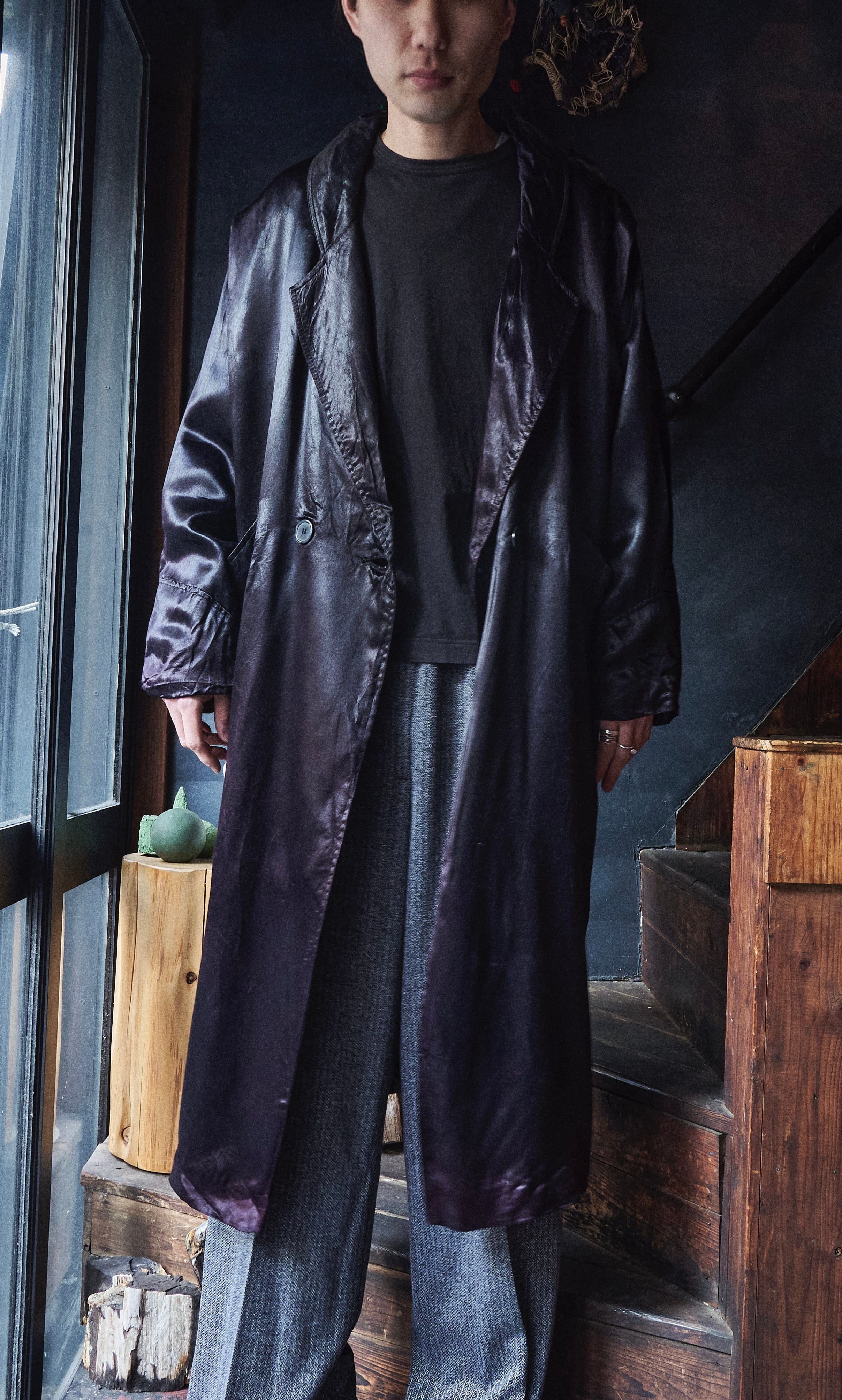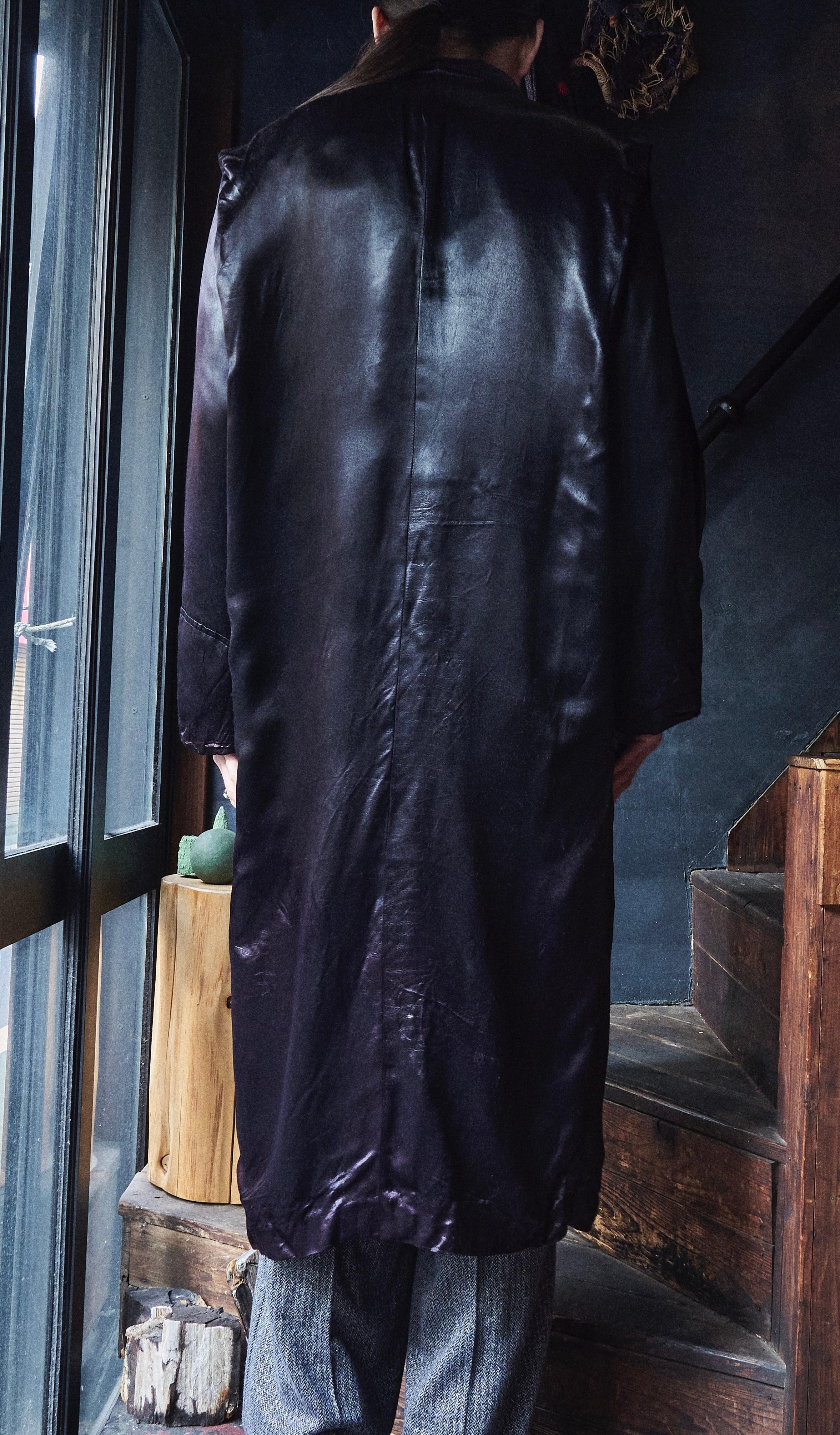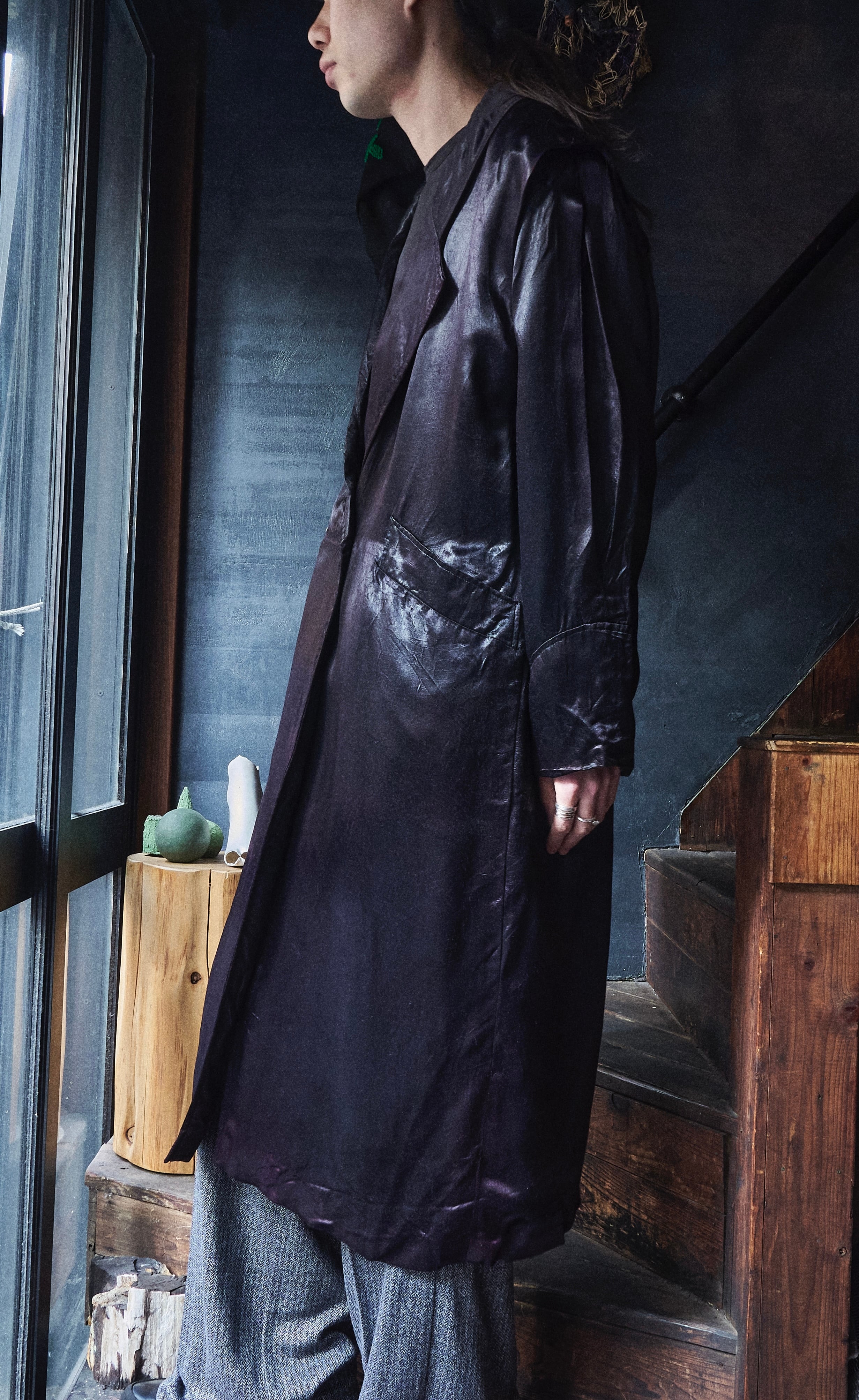 100%アセテート生地を使用した、パープルの色味の暗雲のような色でありながら光沢放つガウンコート。