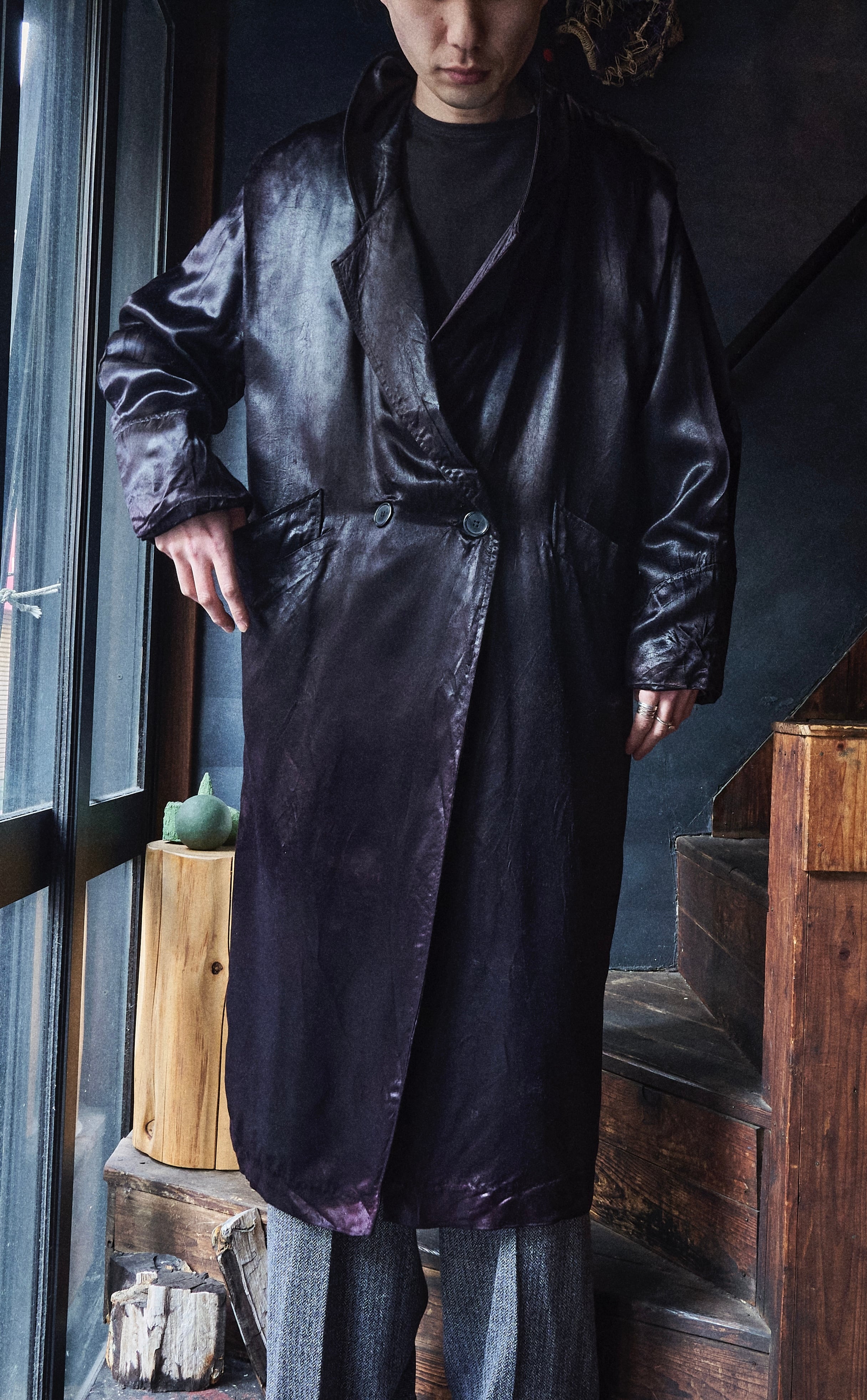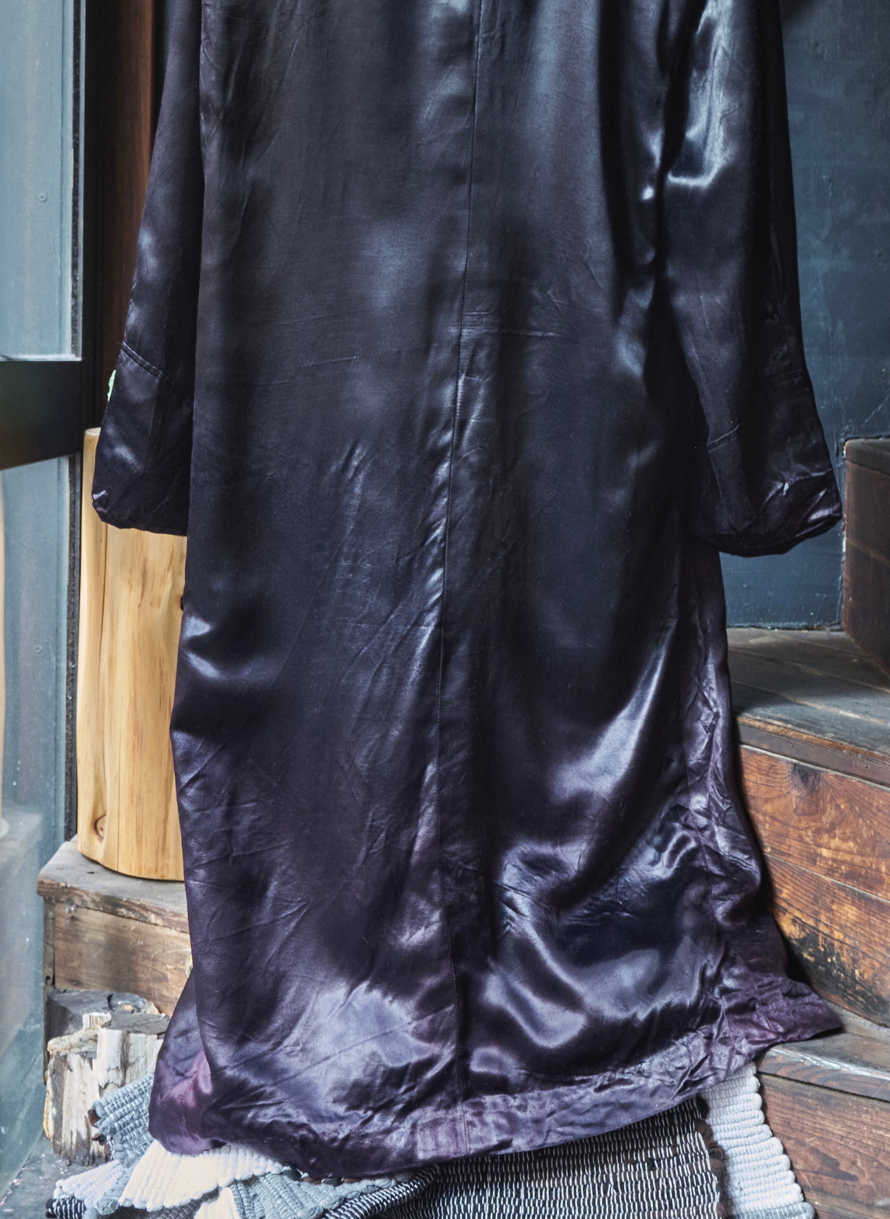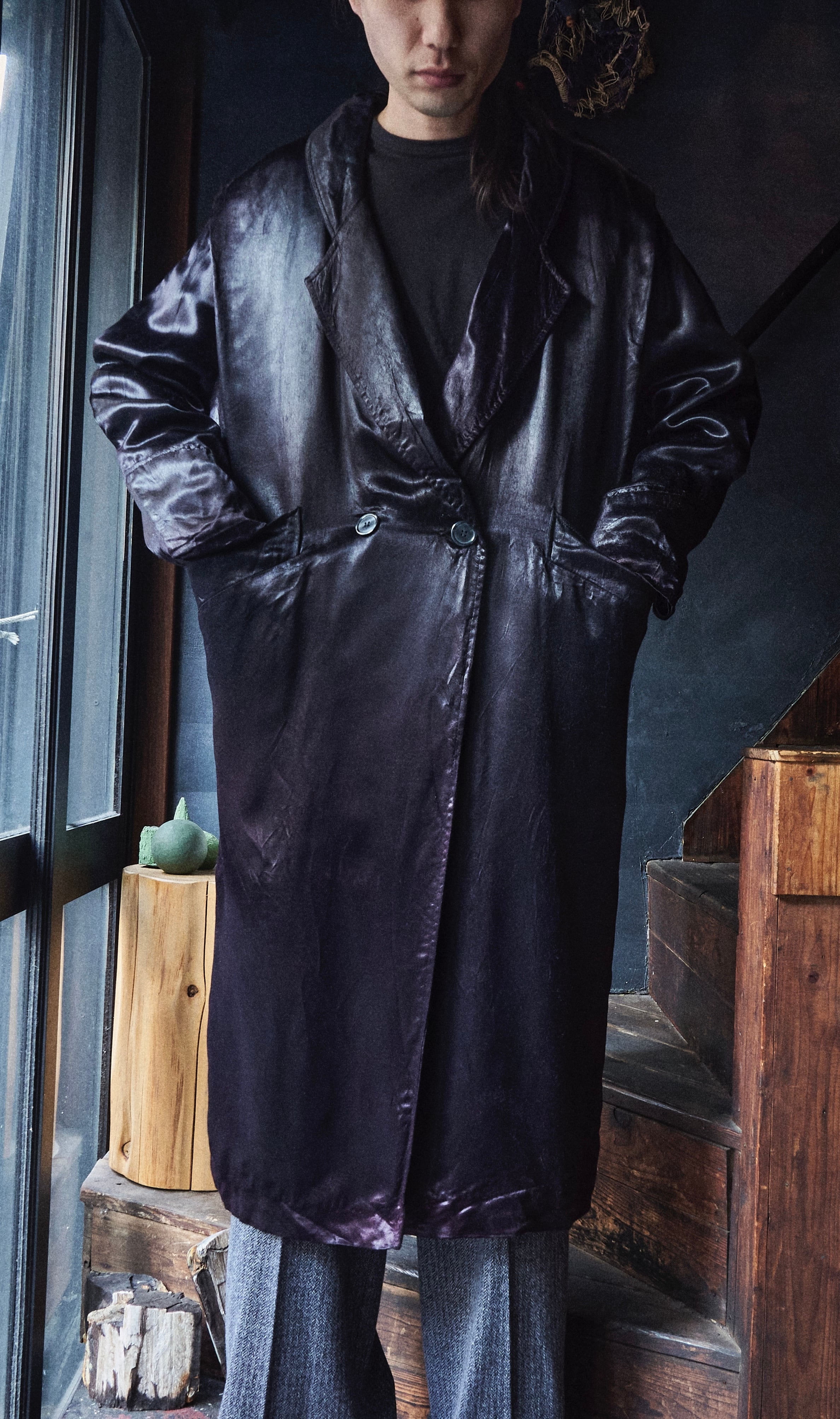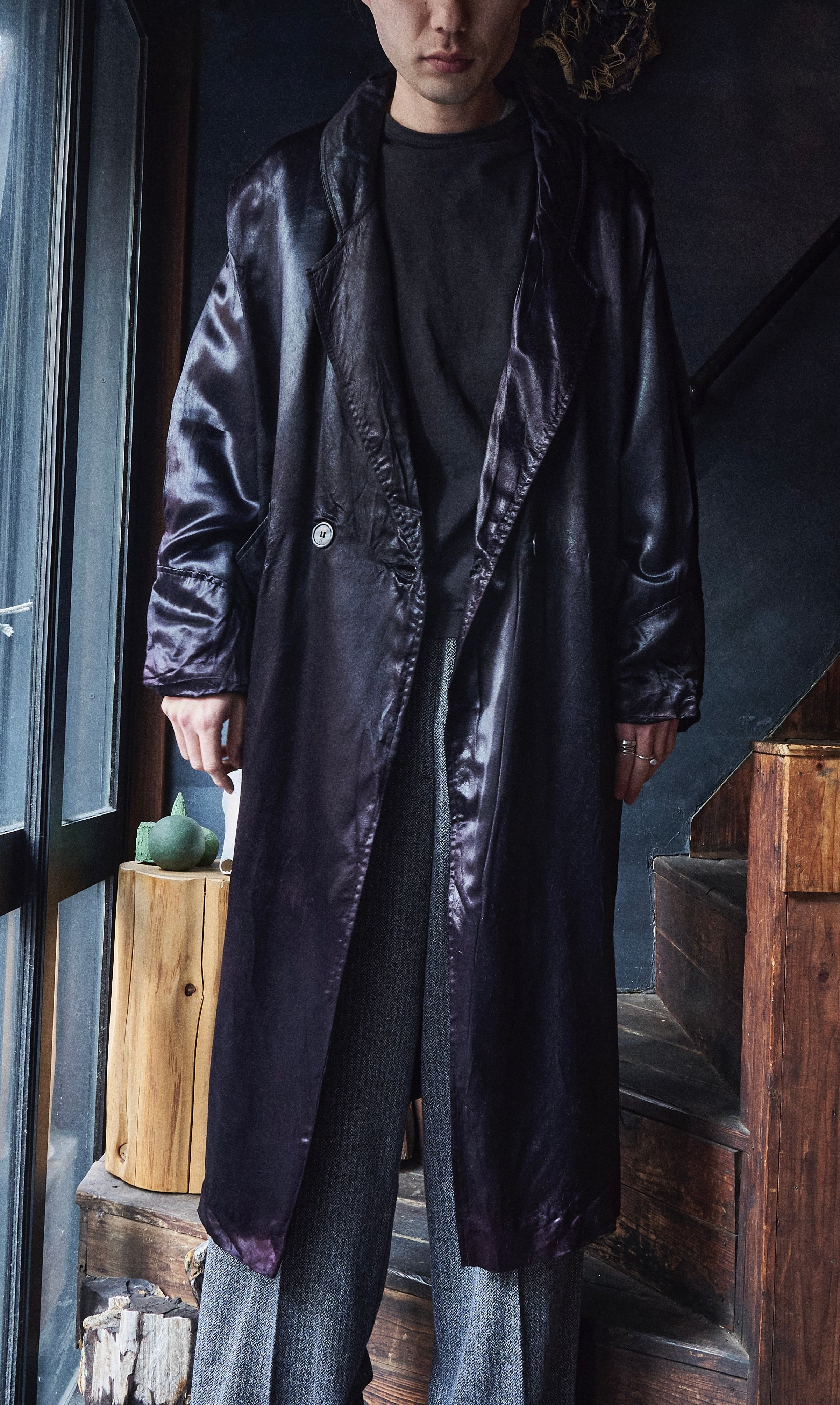 100%アセテート生地を使用した、パープルの色味の暗雲のような色でありながら光沢放つガウンコート。