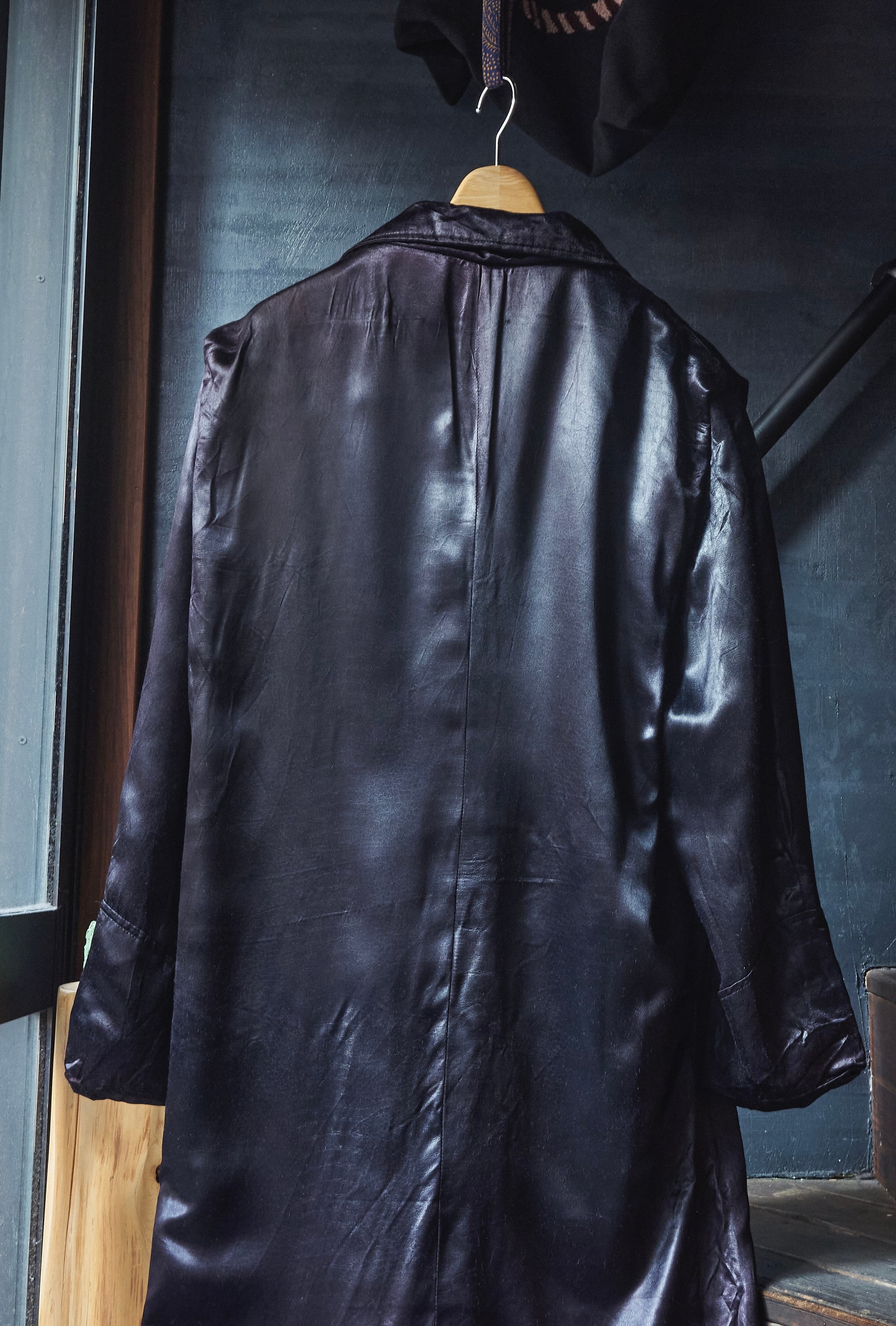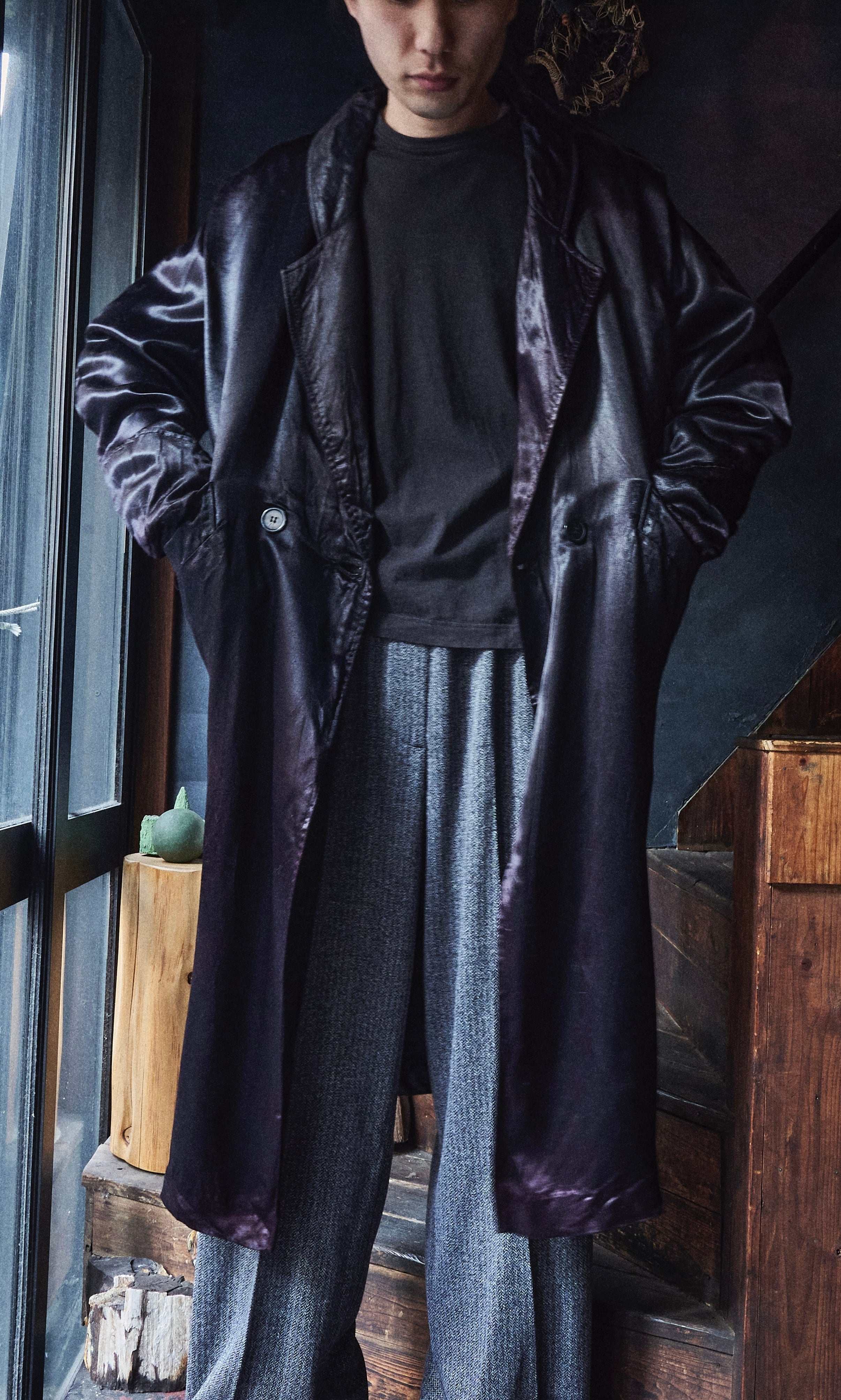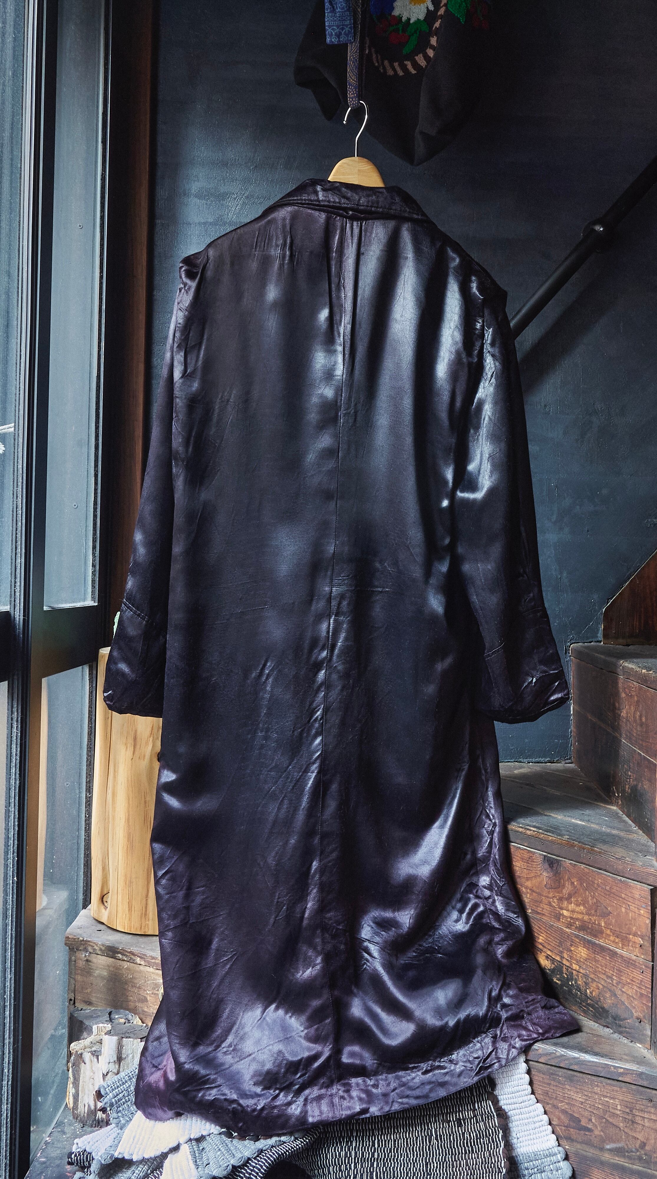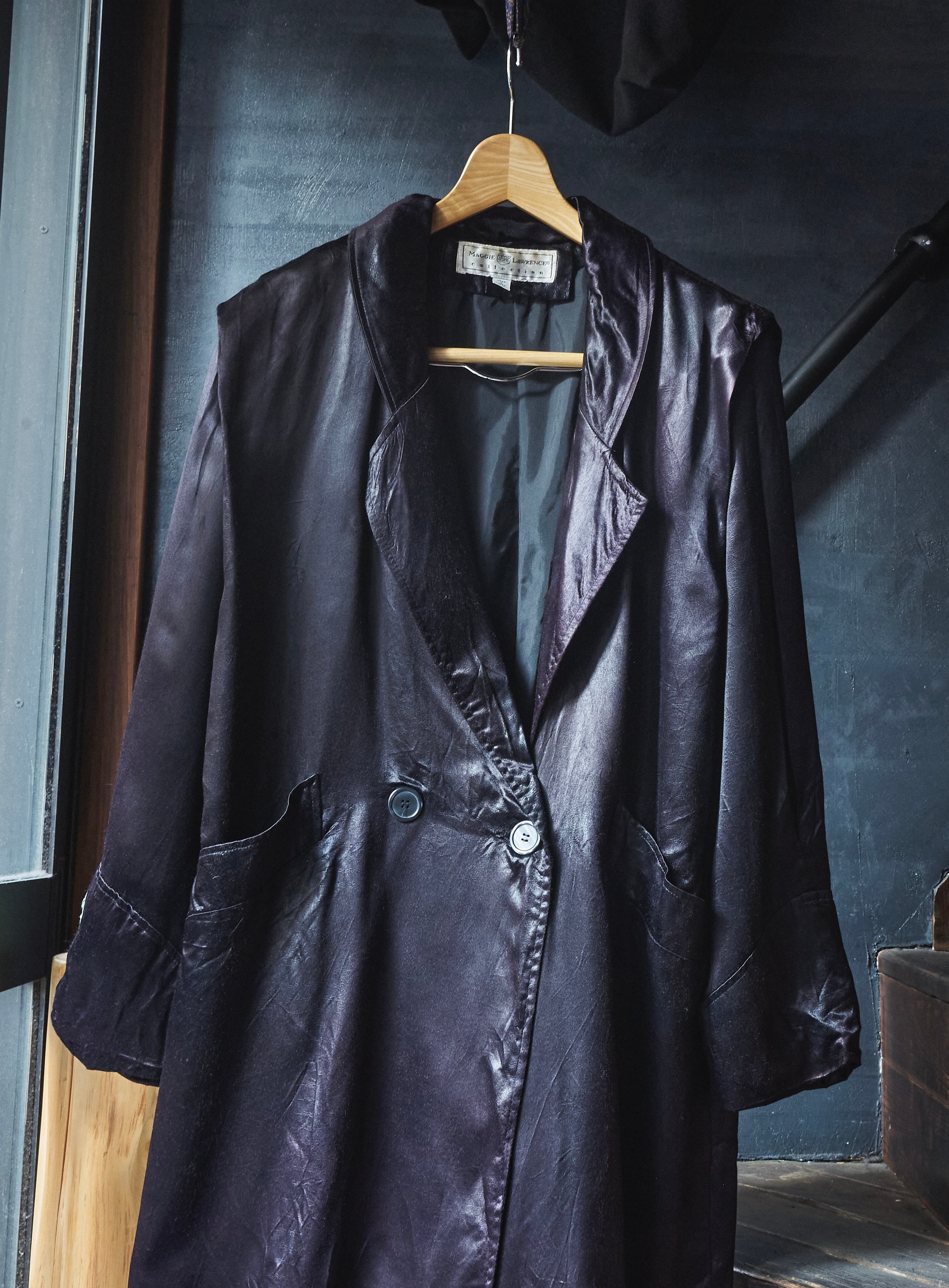 100%アセテート生地を使用した、パープルの色味の暗雲のような色でありながら光沢放つガウンコート。