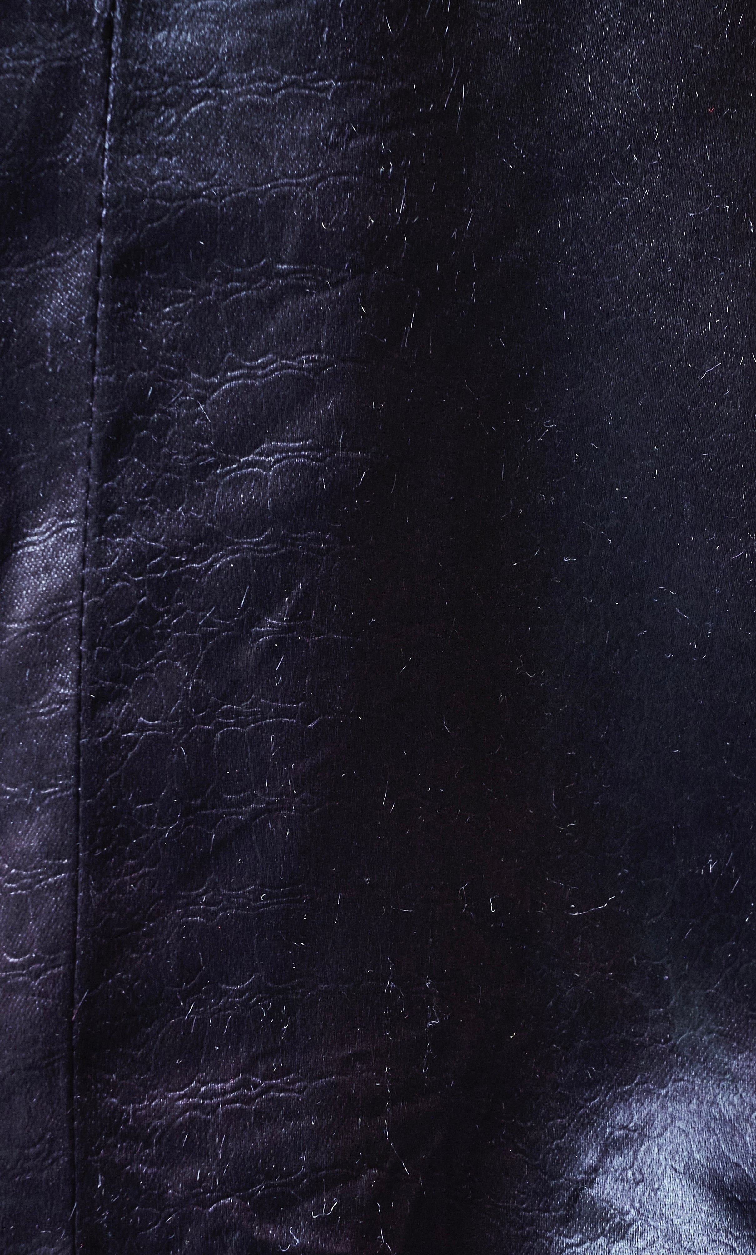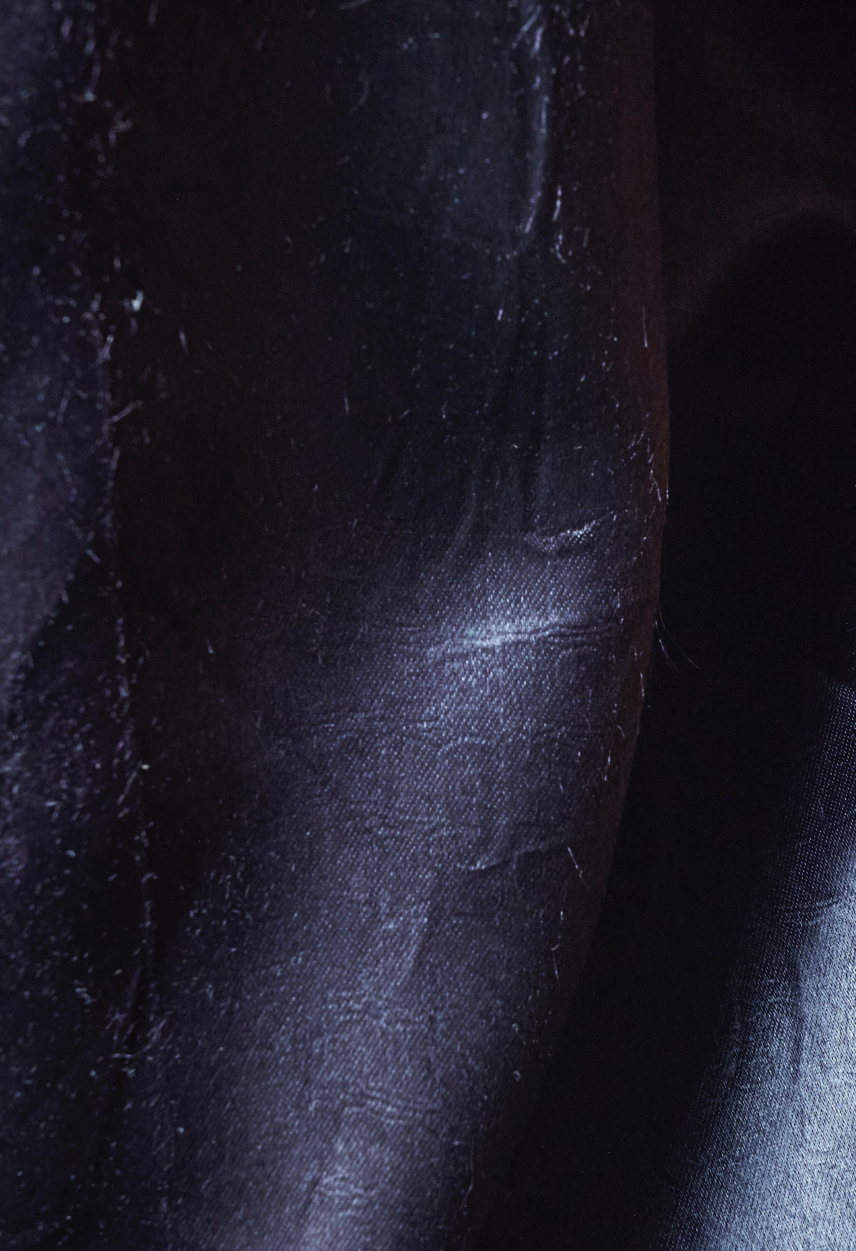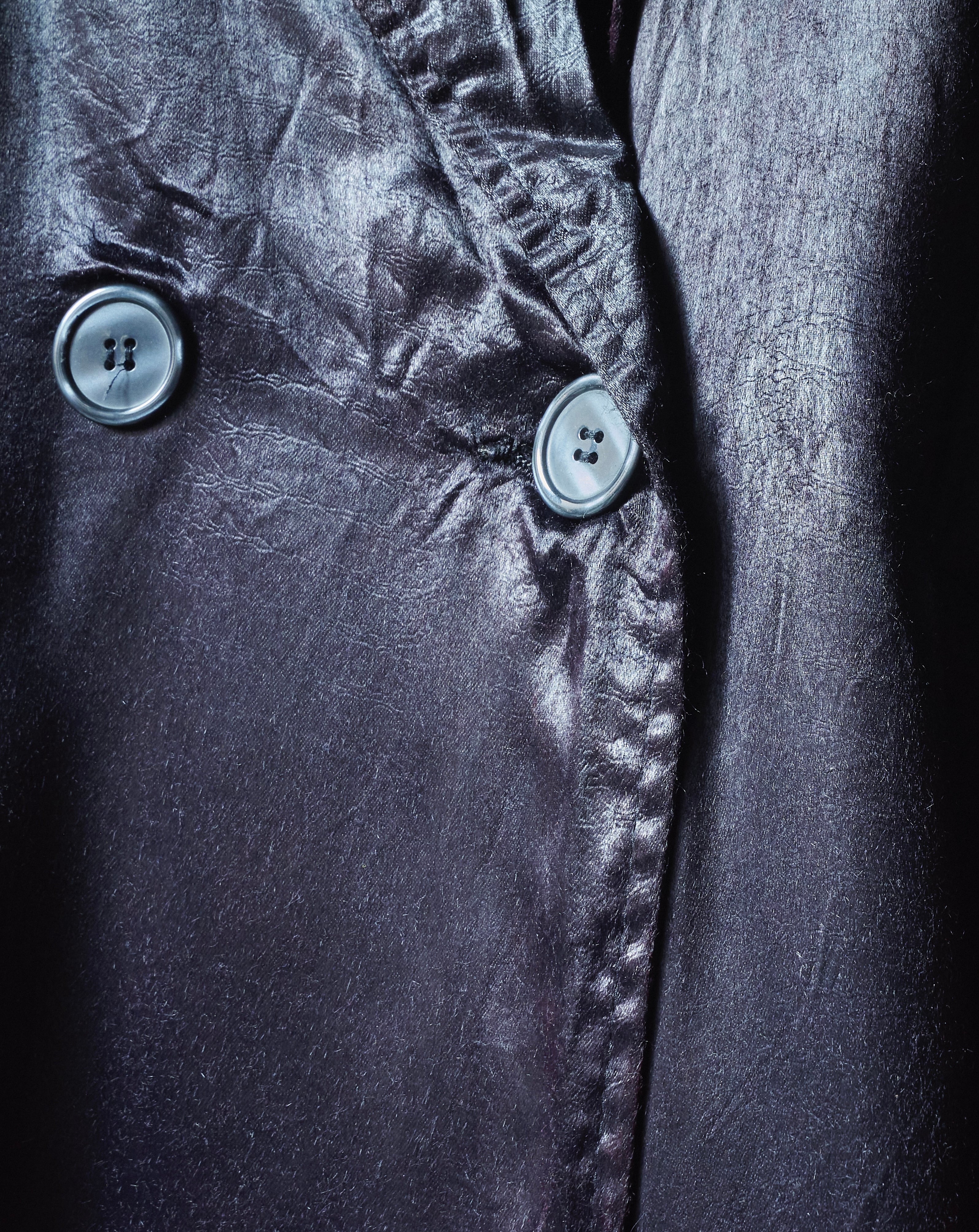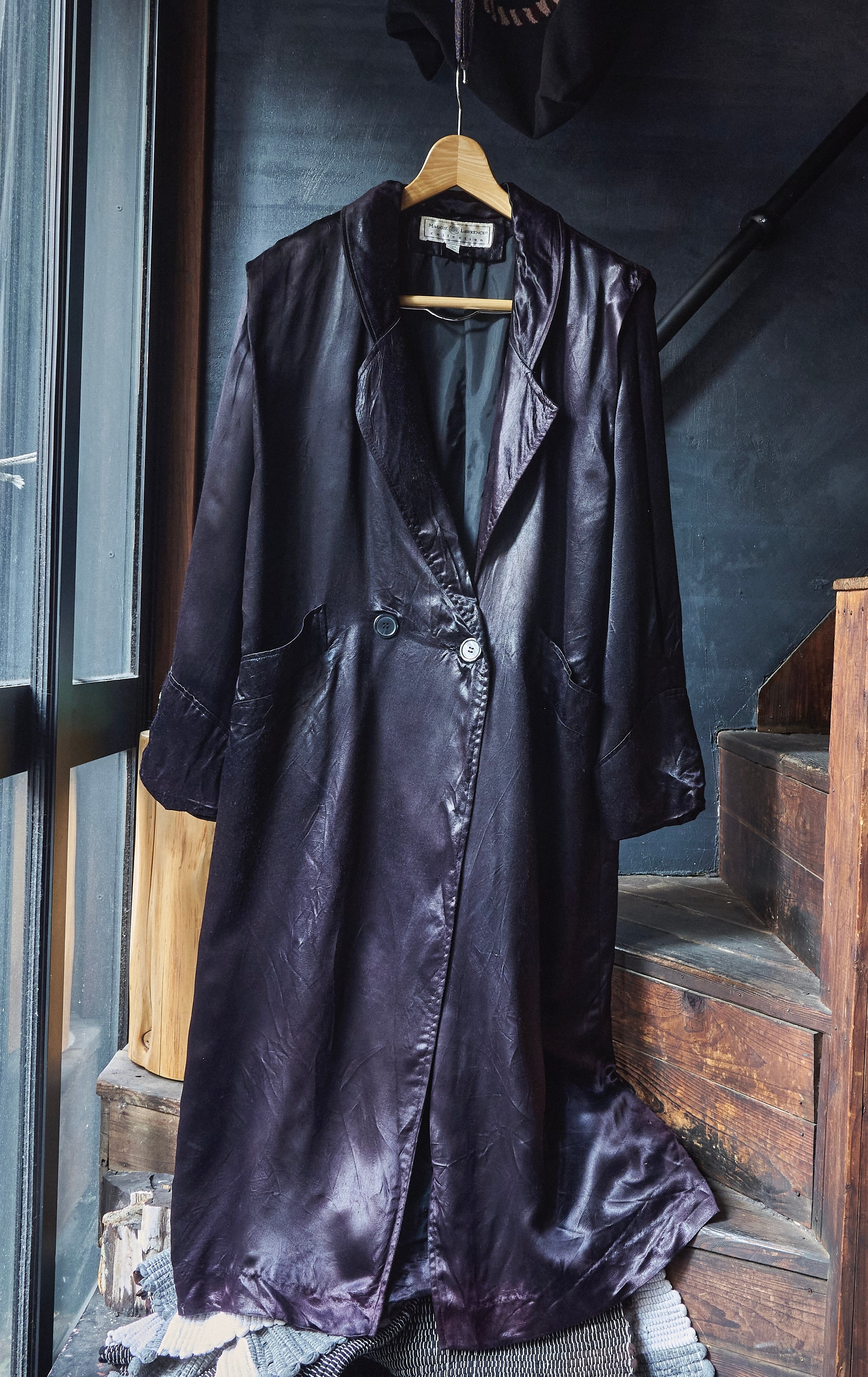 100%アセテート生地を使用した、パープルの色味の暗雲のような色でありながら光沢放つガウンコート。