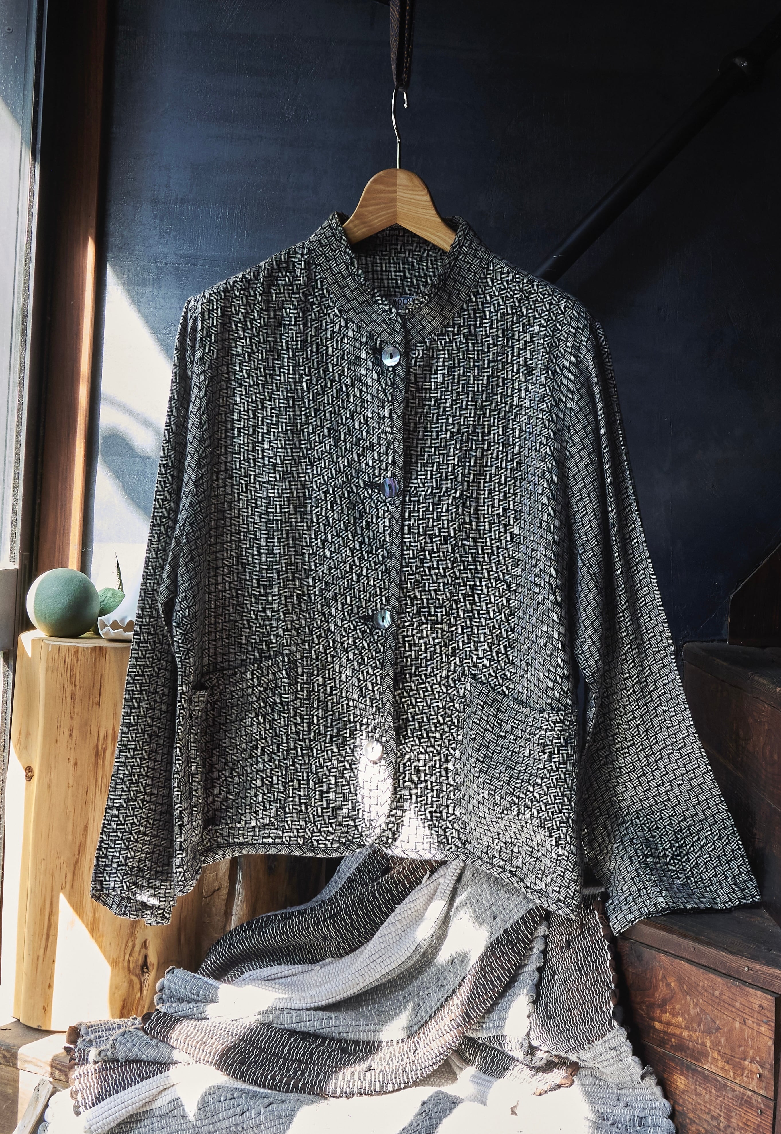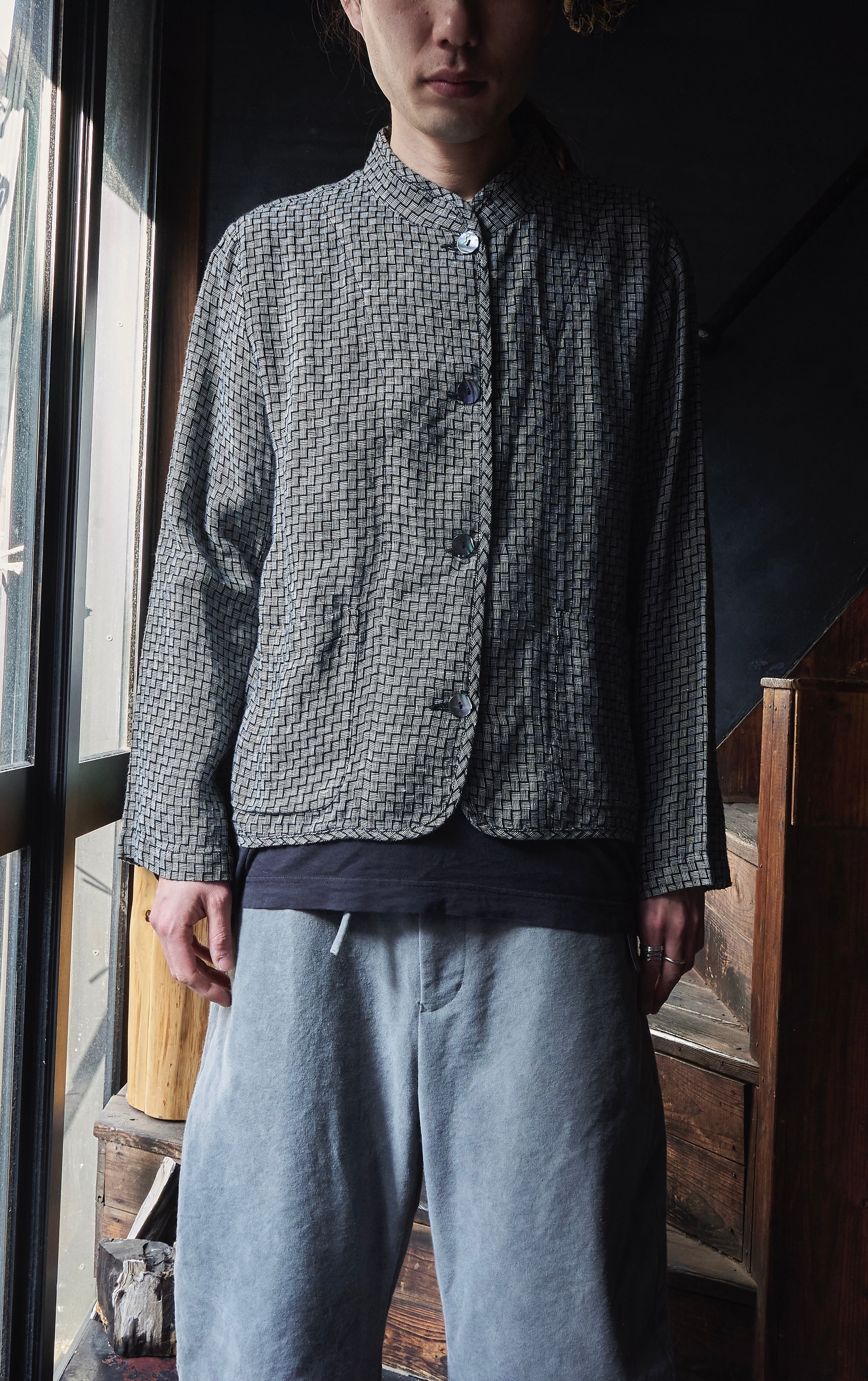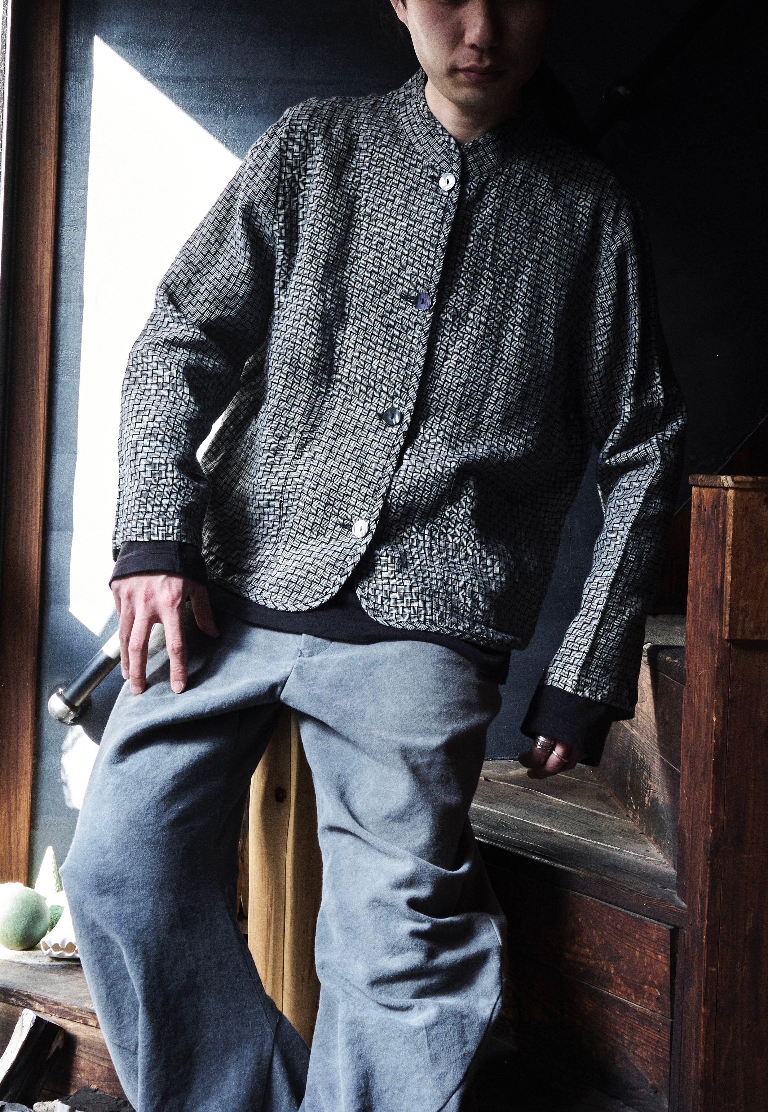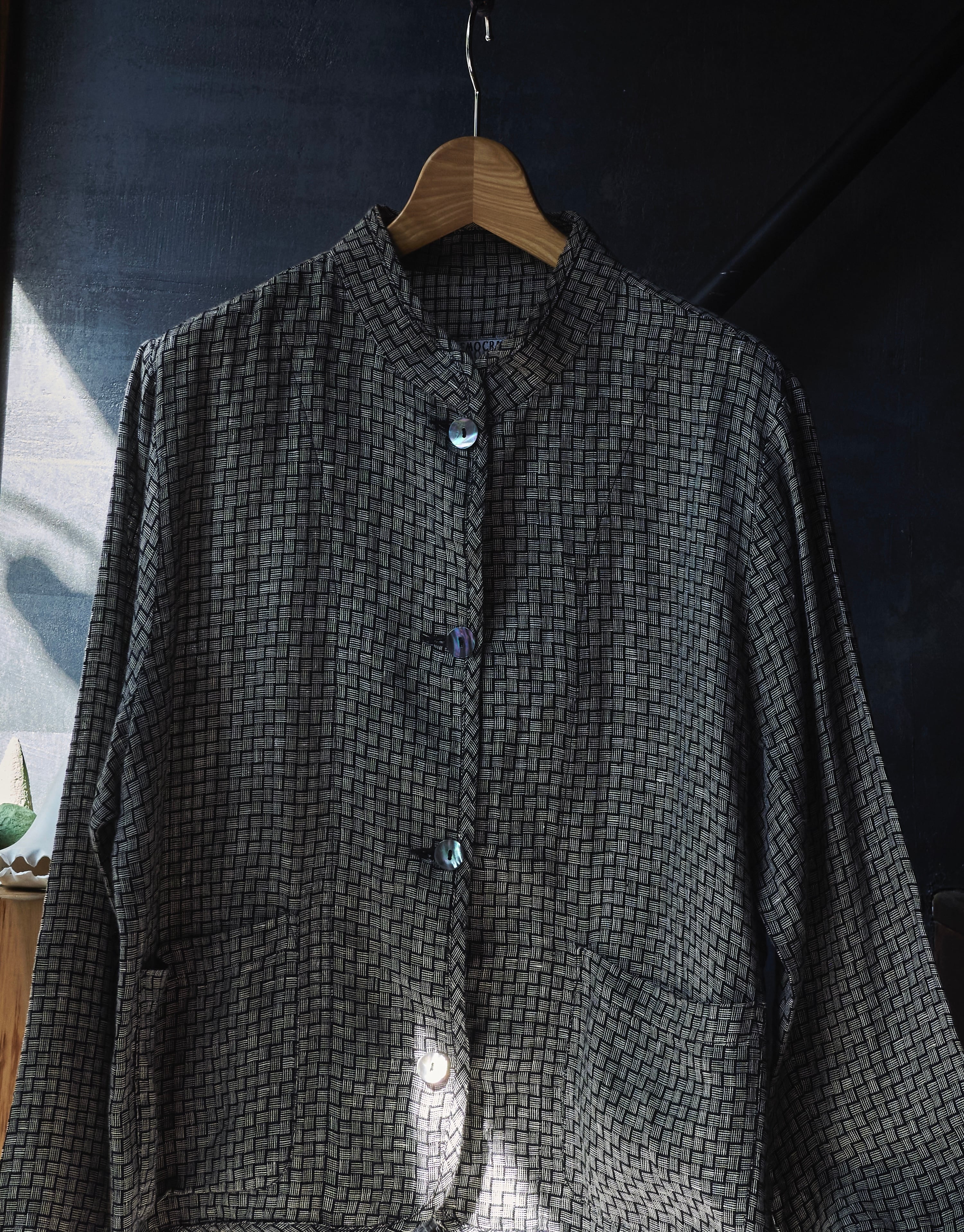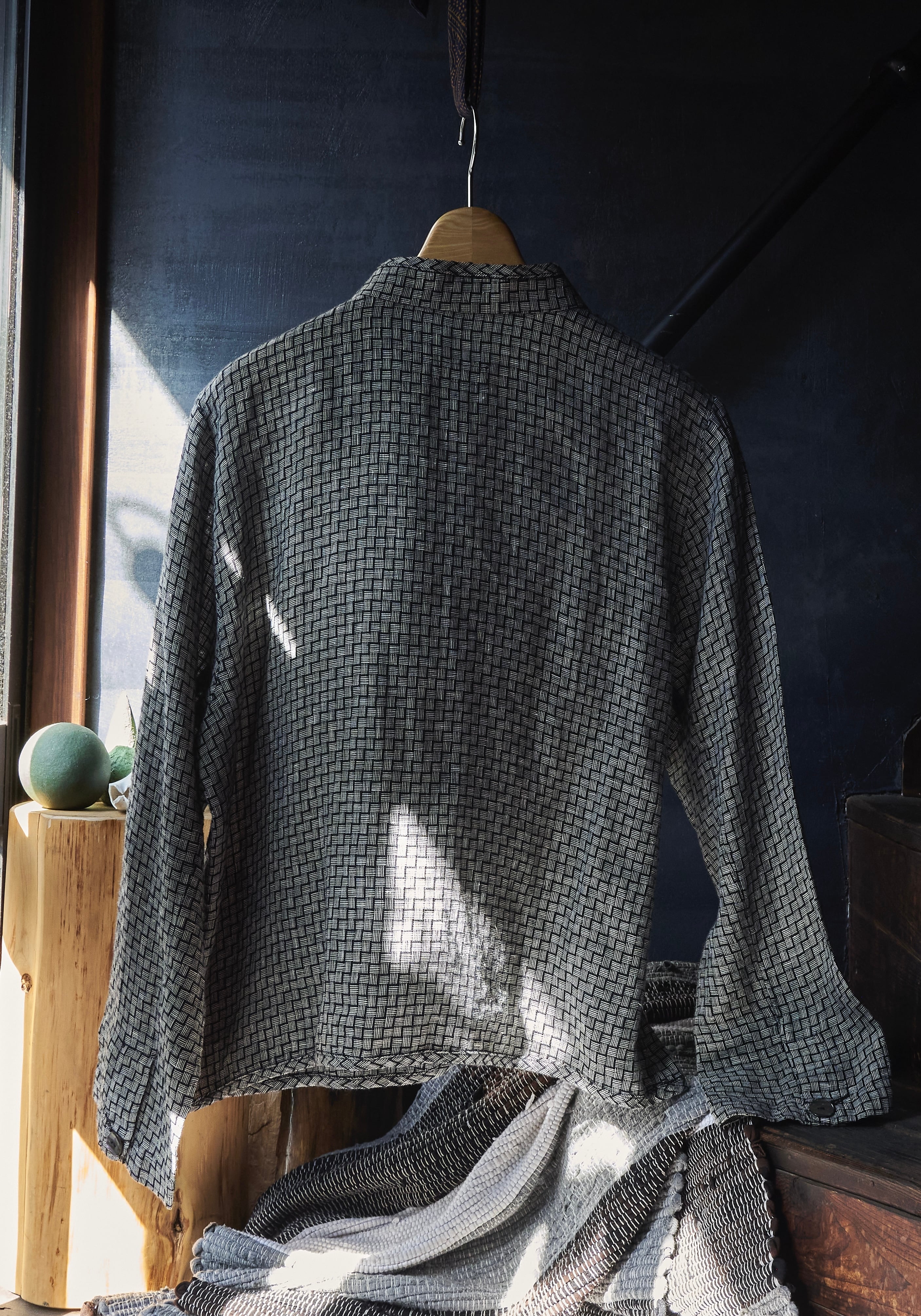 織り生地リネンを使用したスタンドカラーシャツジャケット。