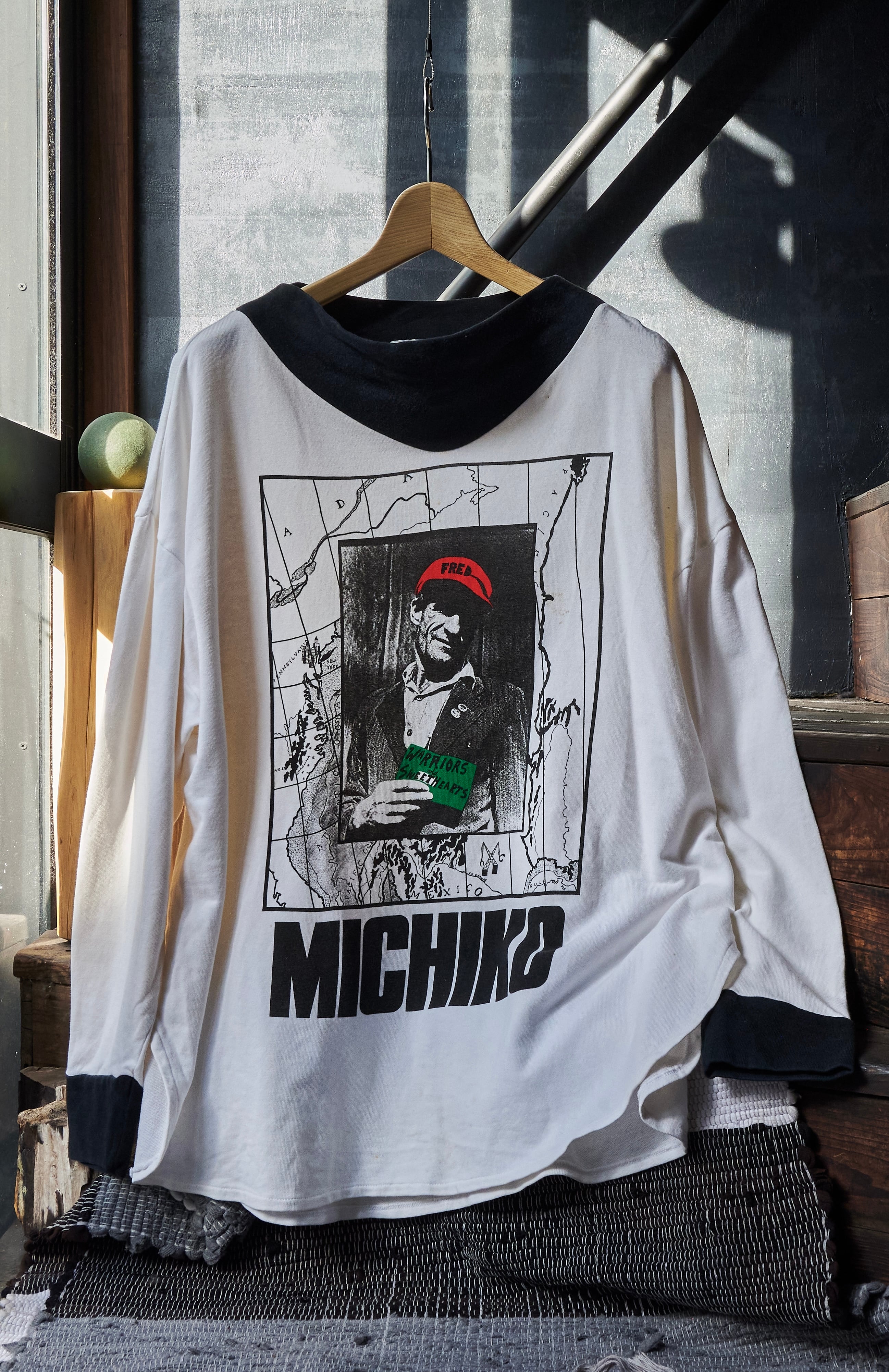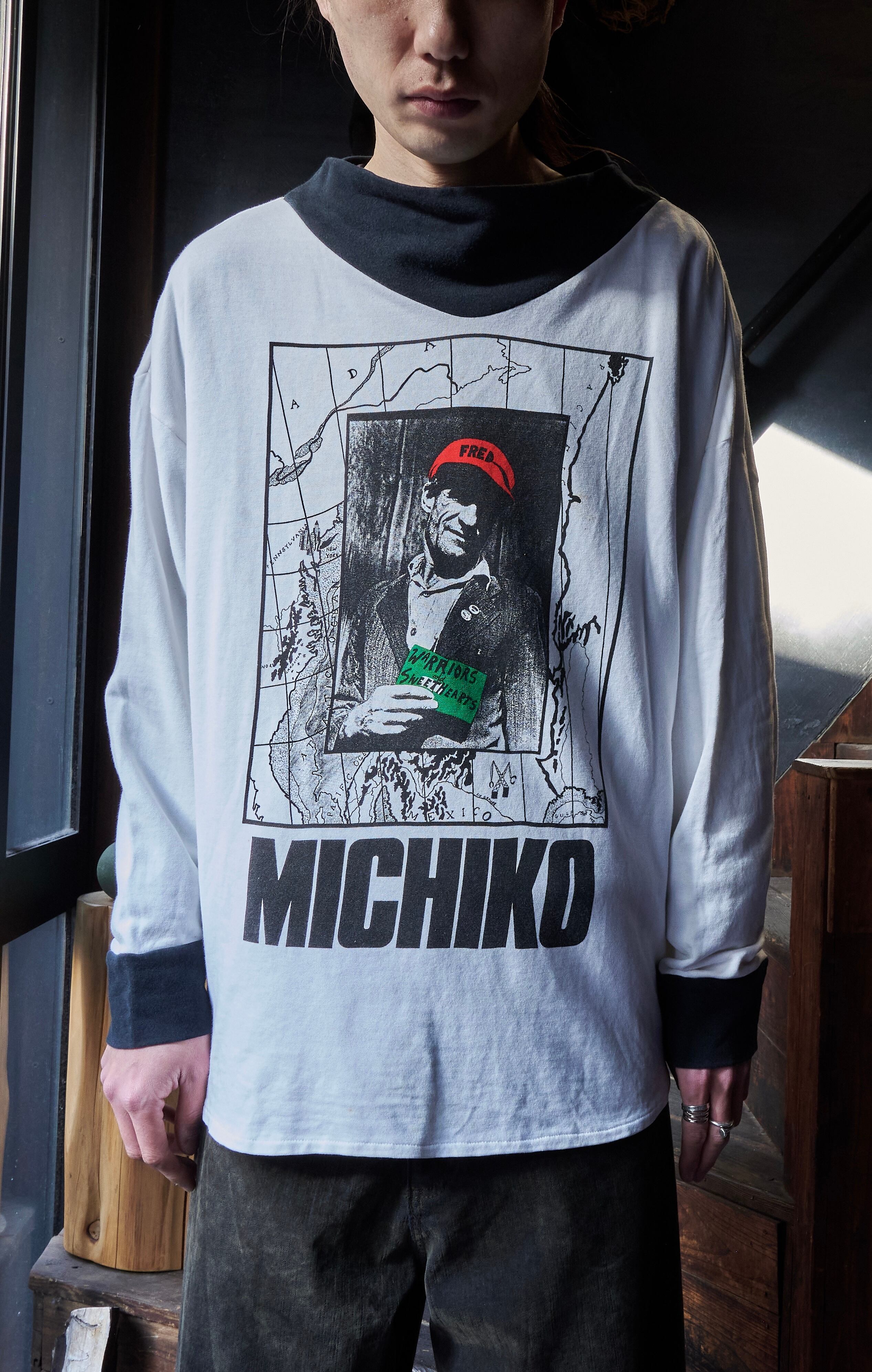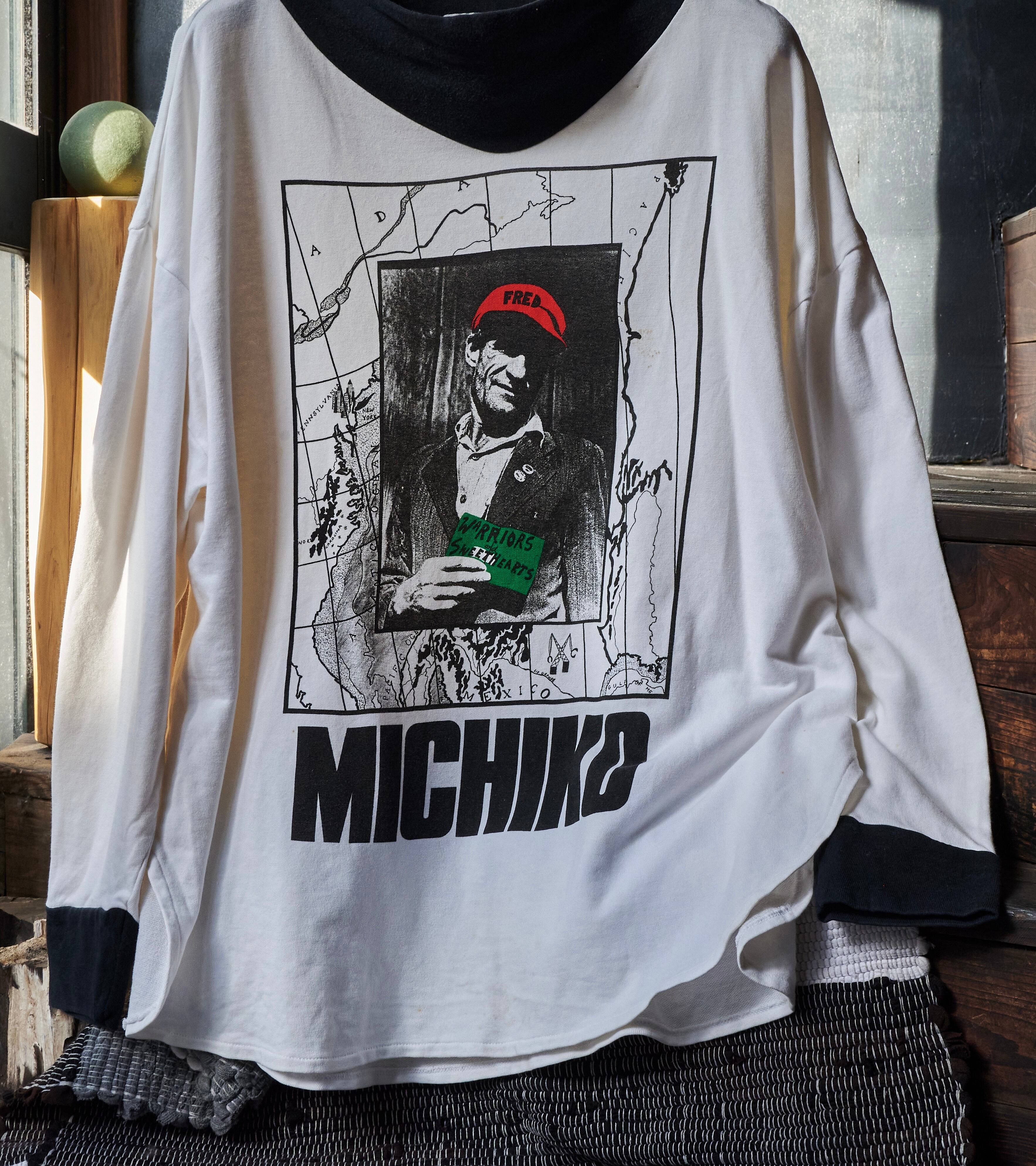 だけれどかっこいいと思えるグラフィックがプリントされたコシノミチコさんのモックネック型スウェット。