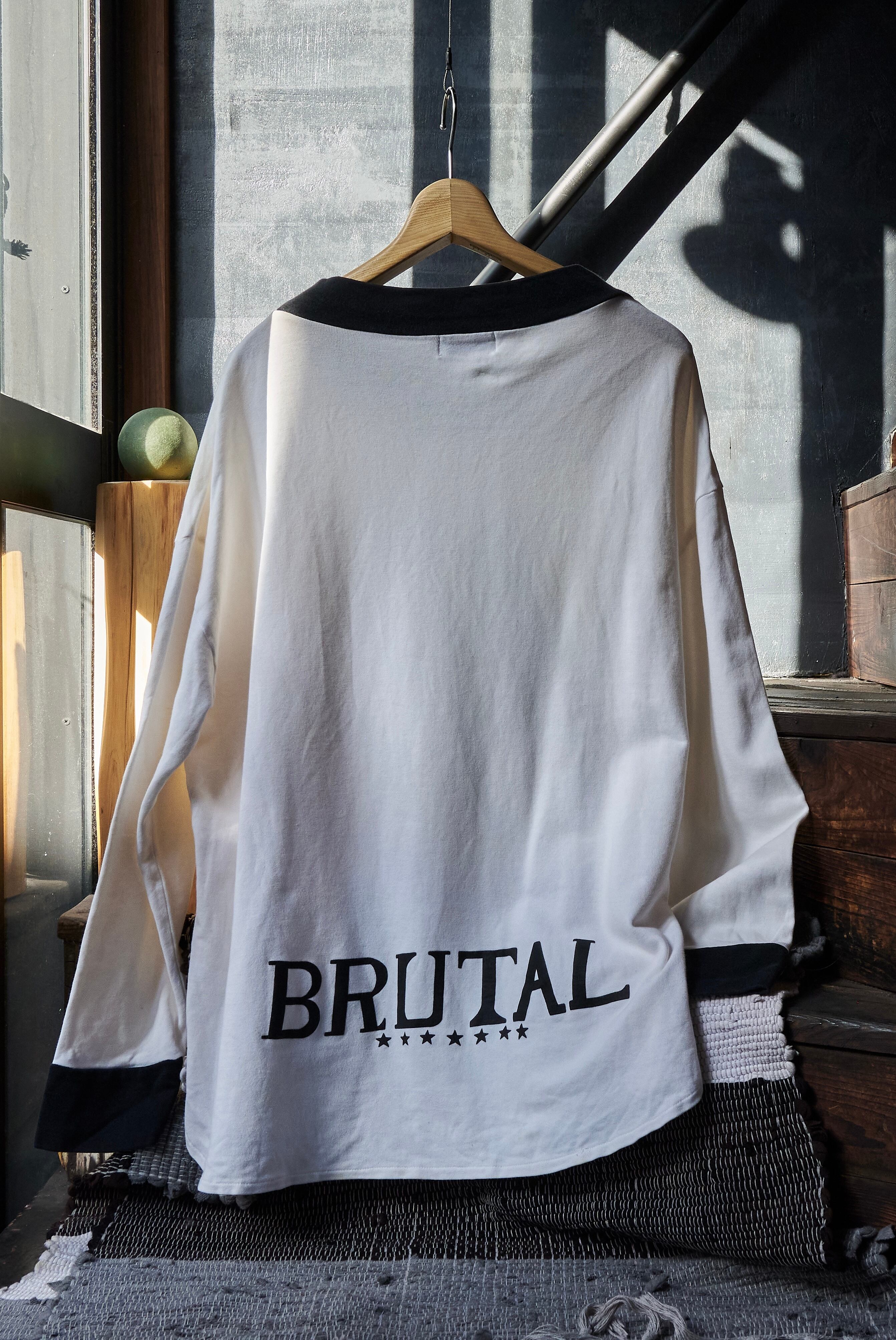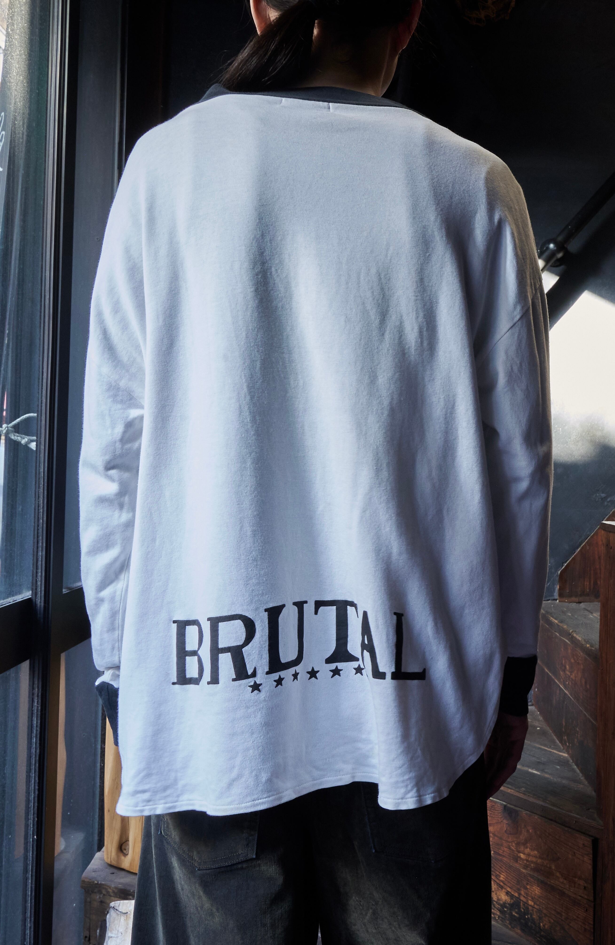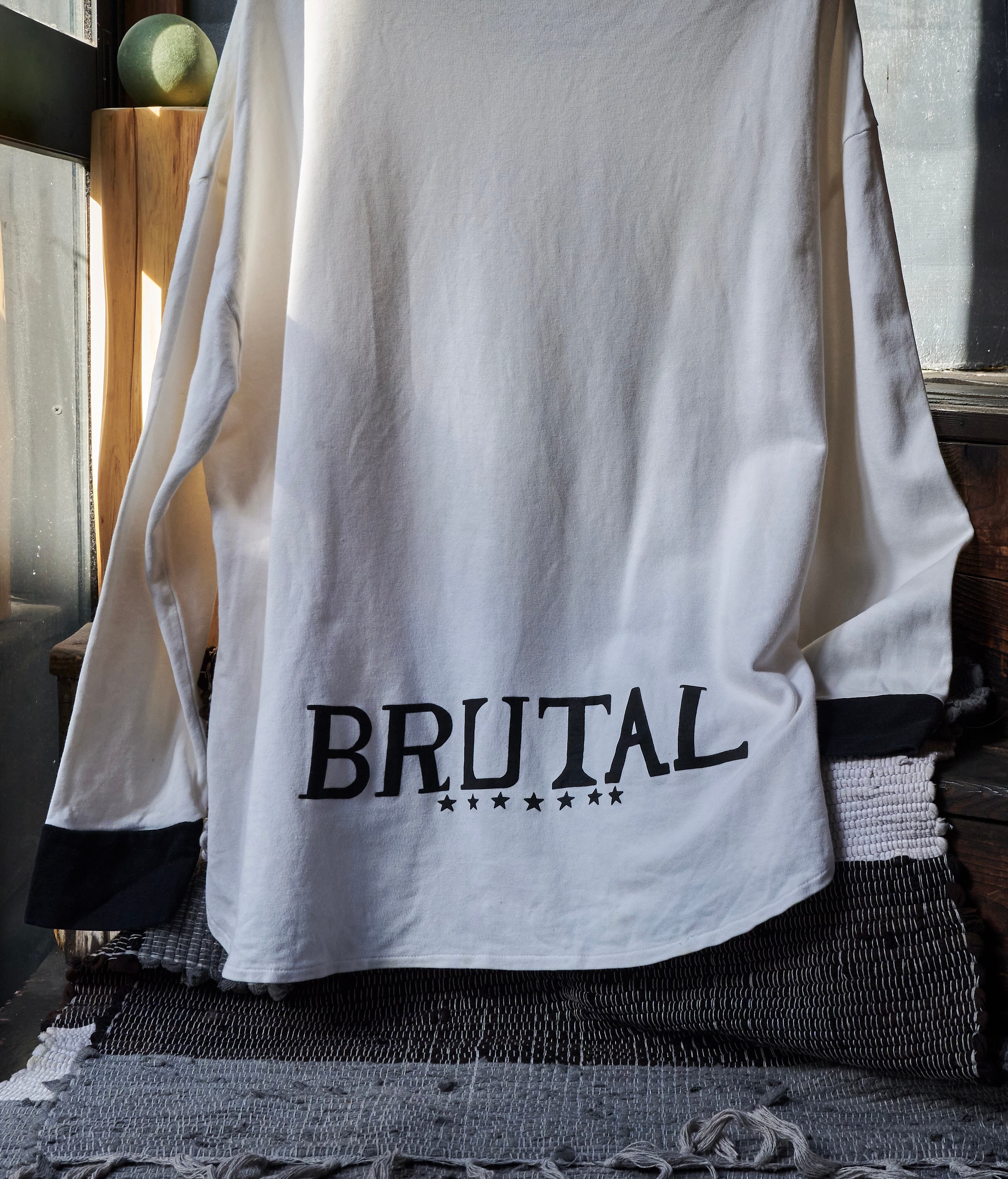 だけれどかっこいいと思えるグラフィックがプリントされたコシノミチコさんのモックネック型スウェット。