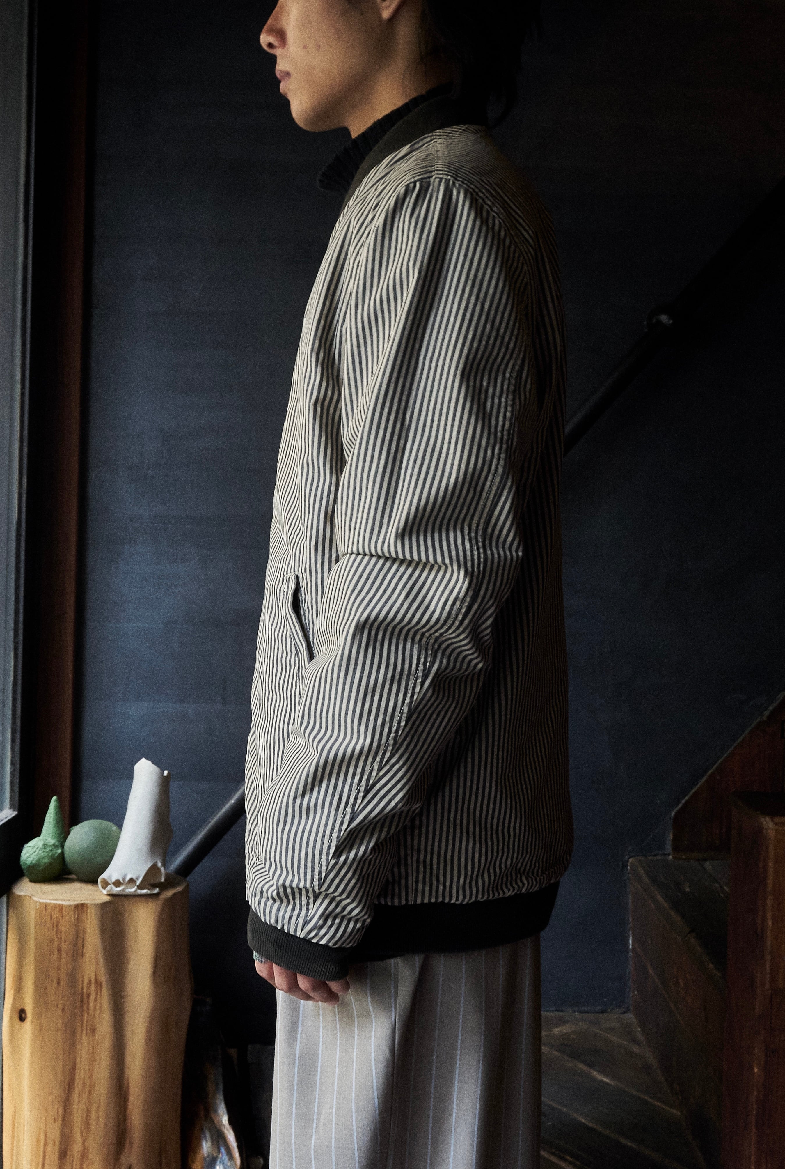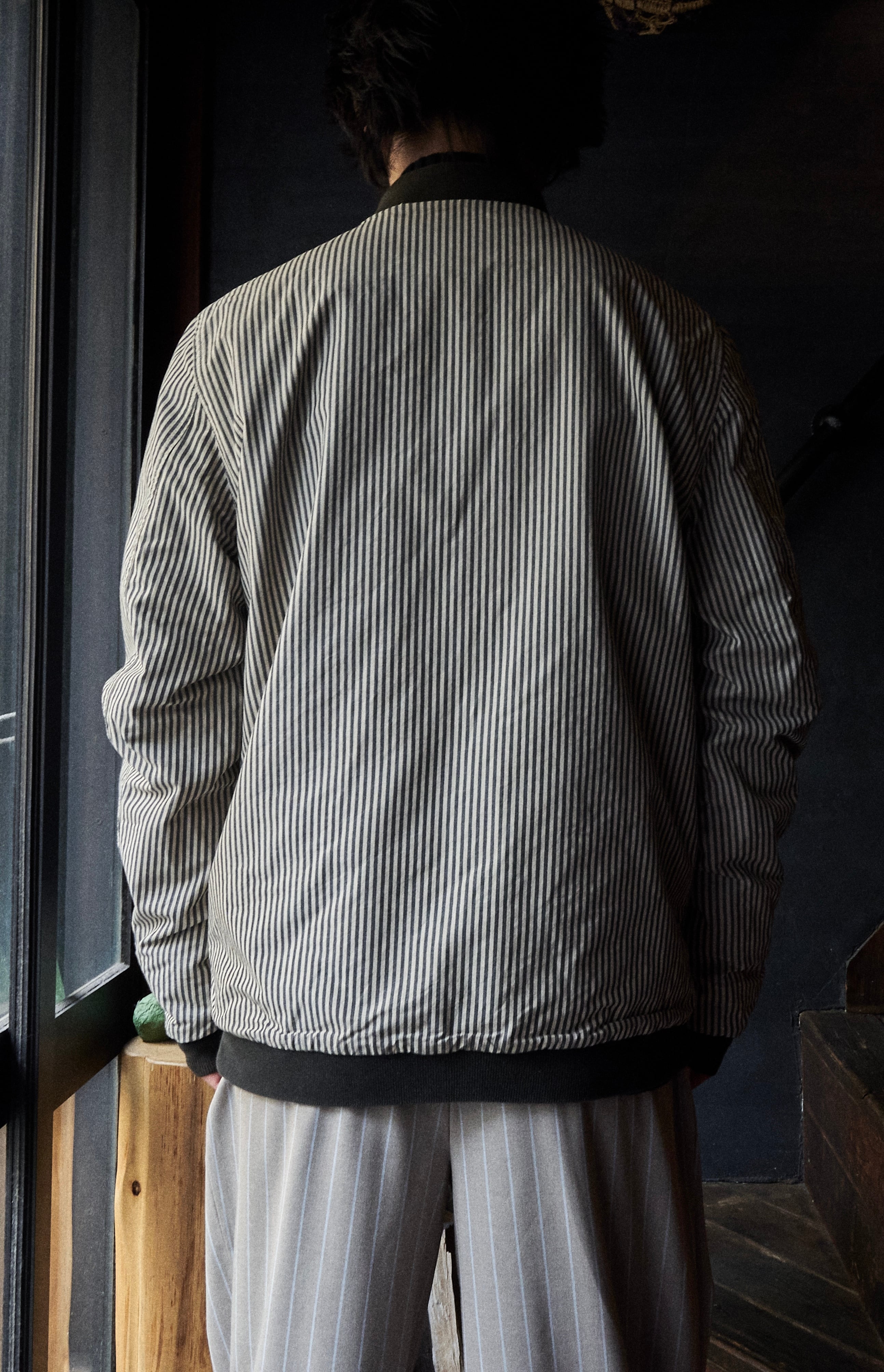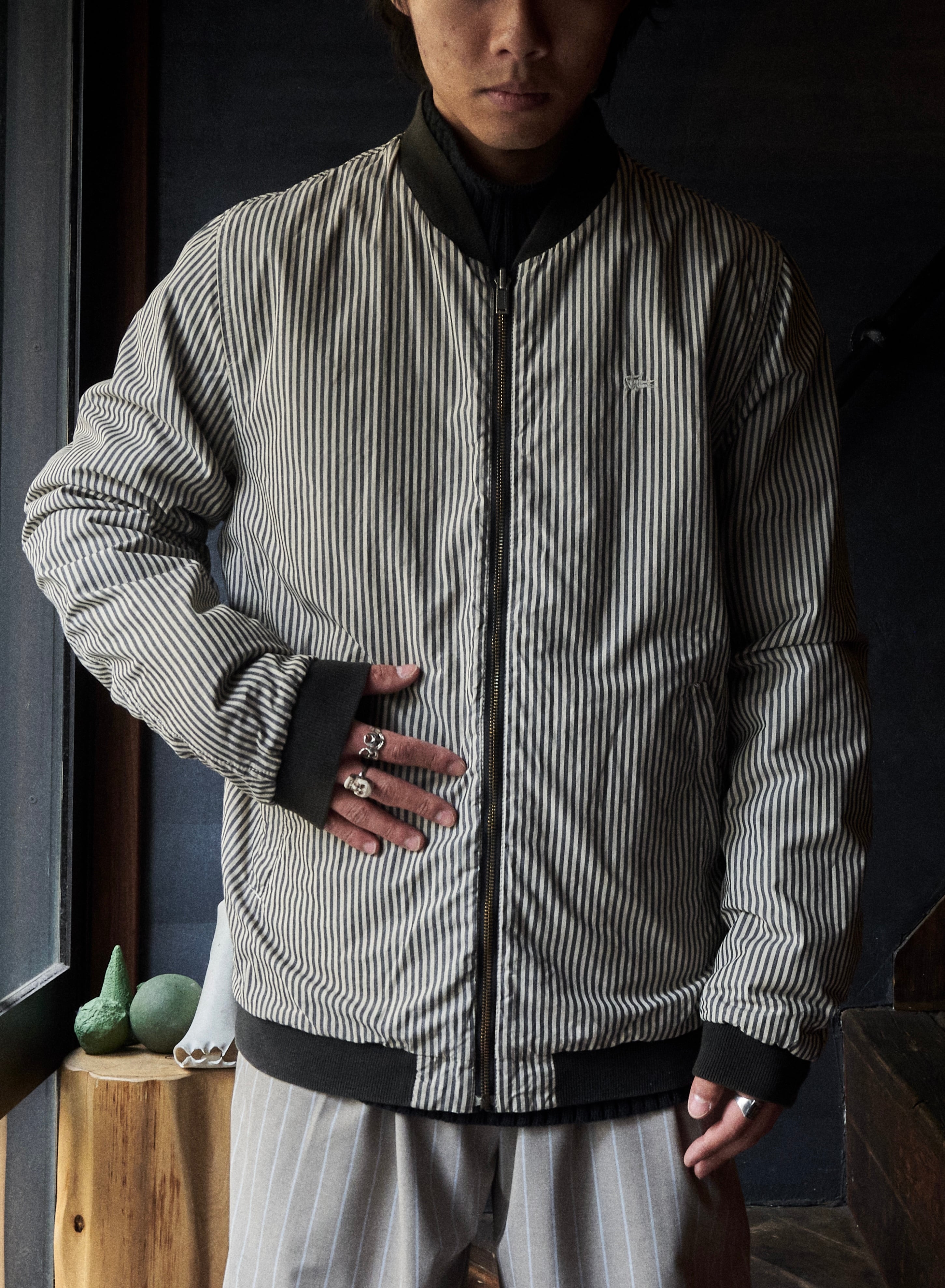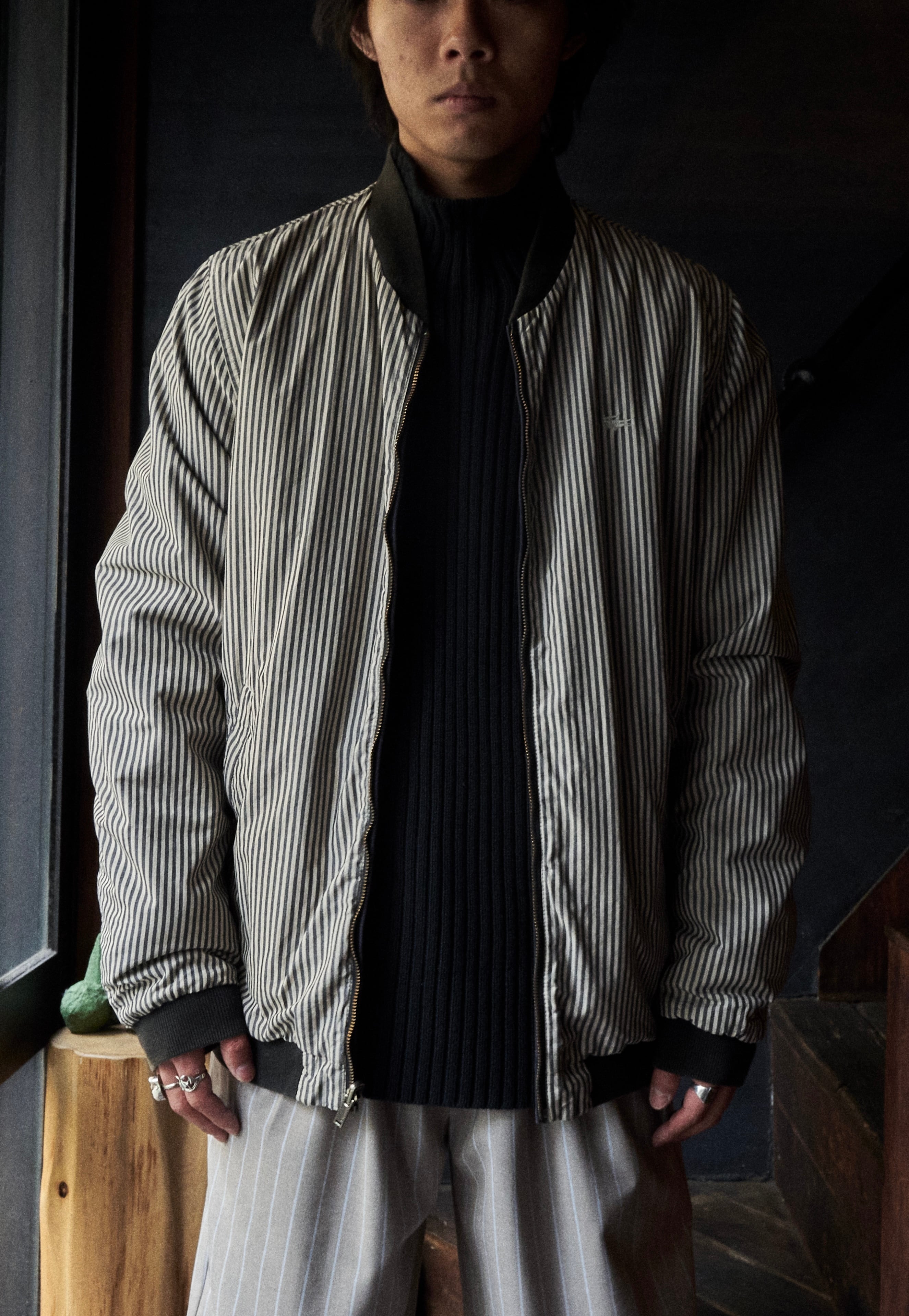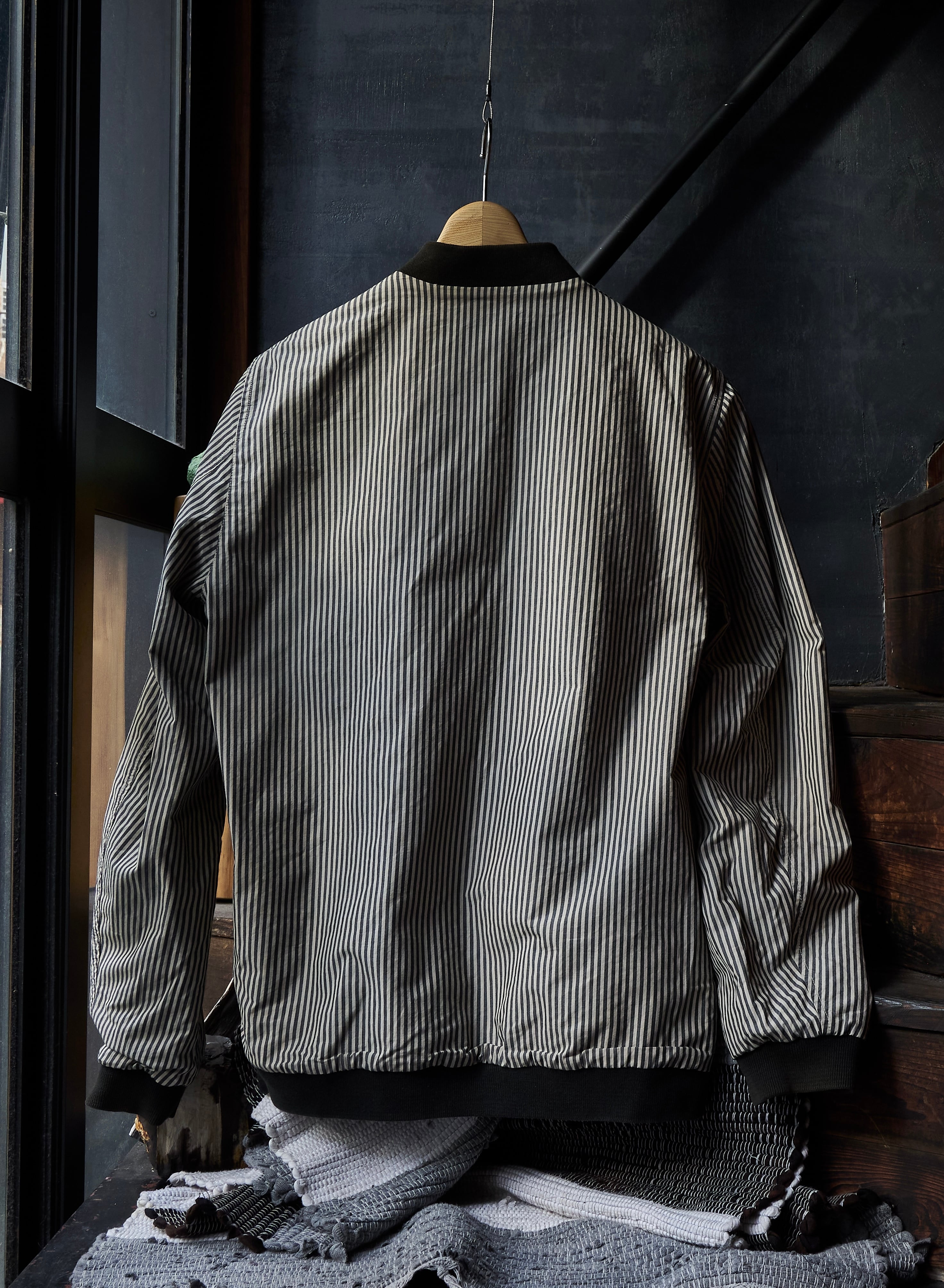 ストライプと黒のリバーシブル面で着られるボンバージャケット。