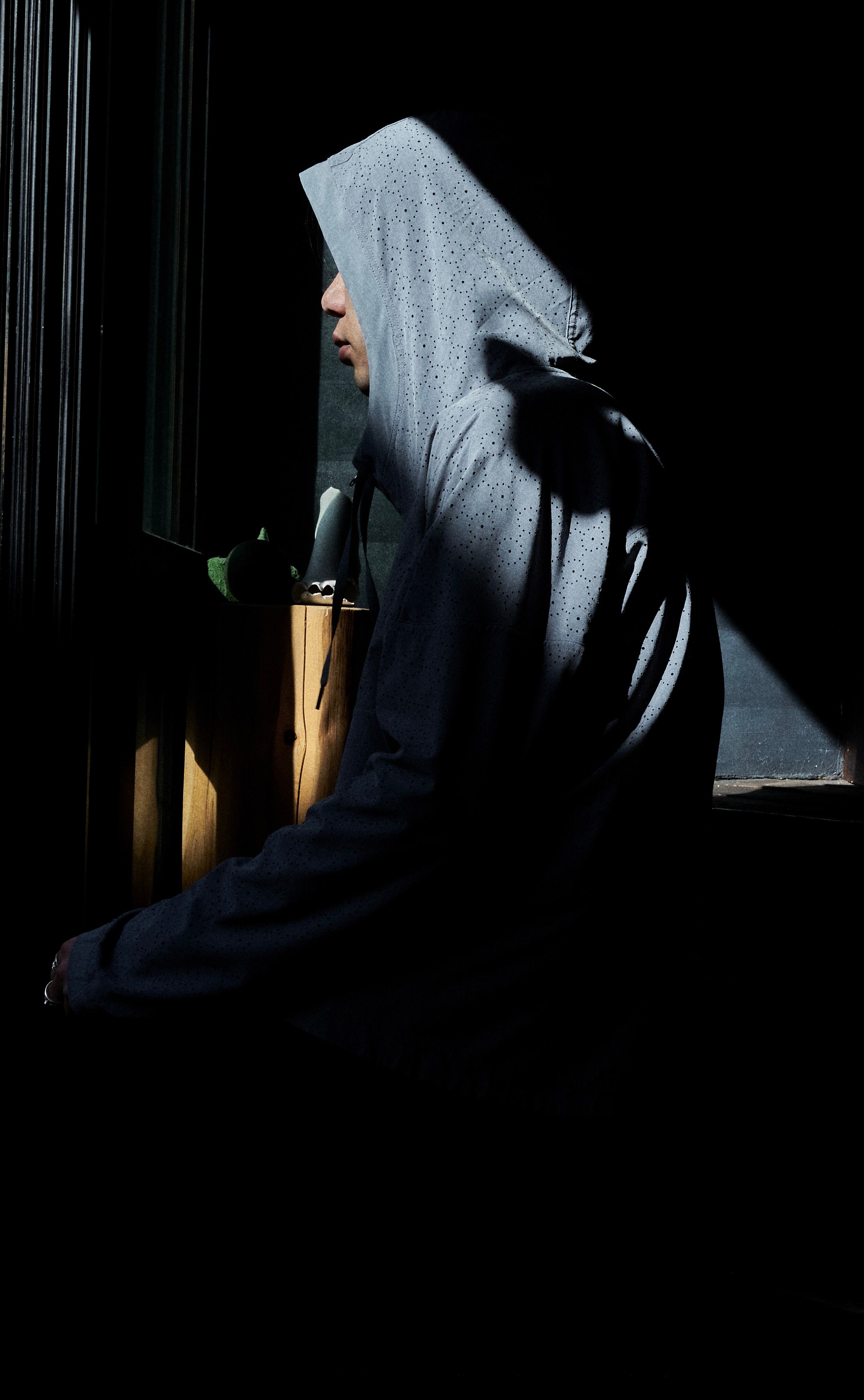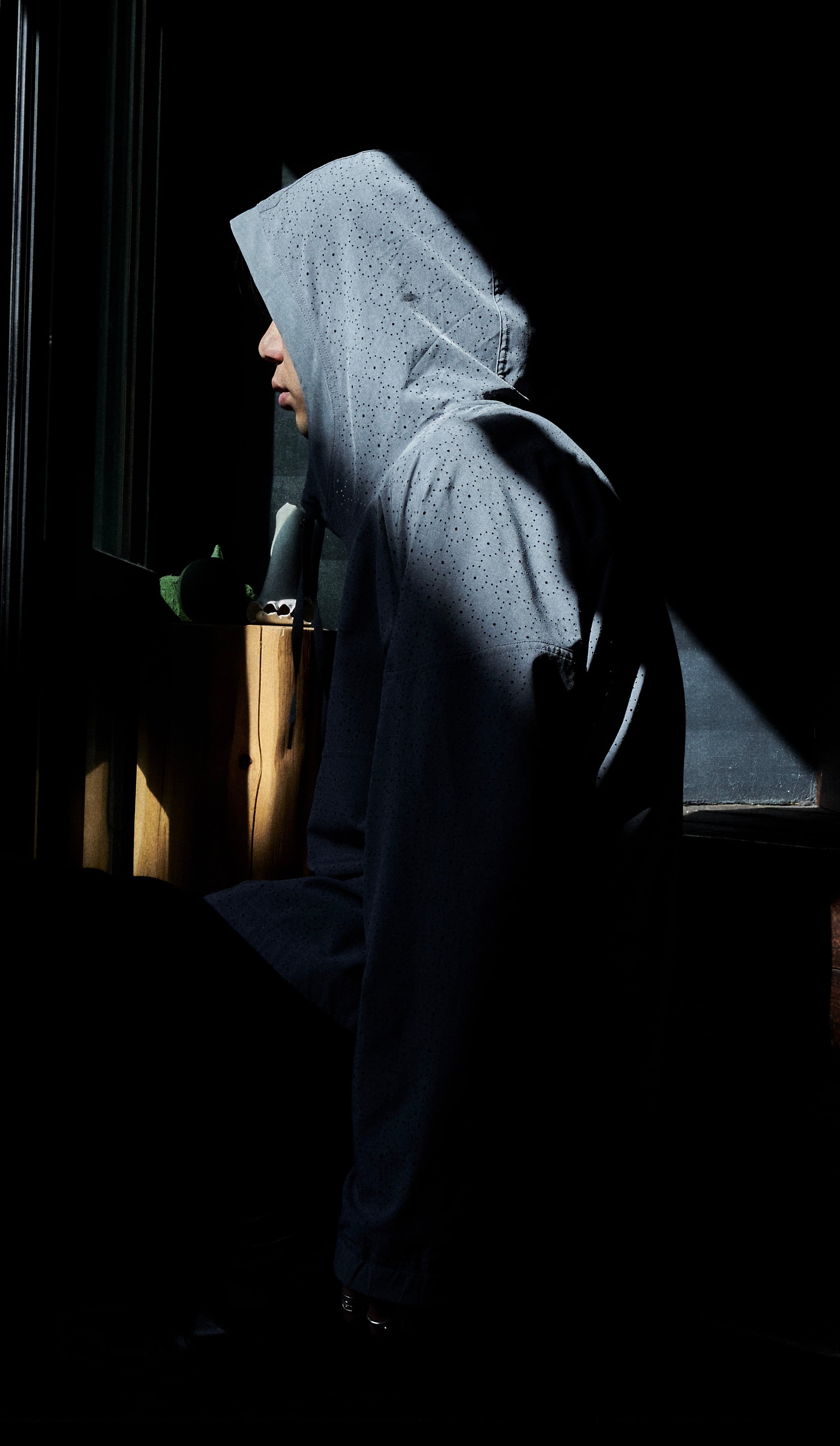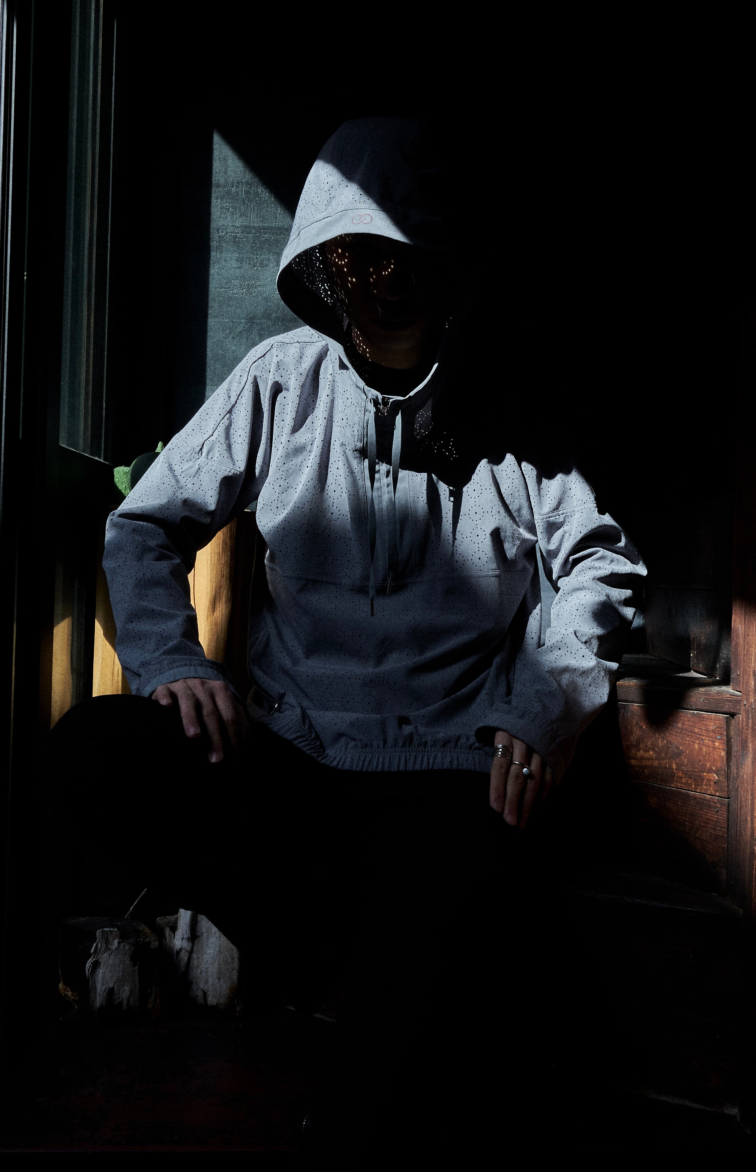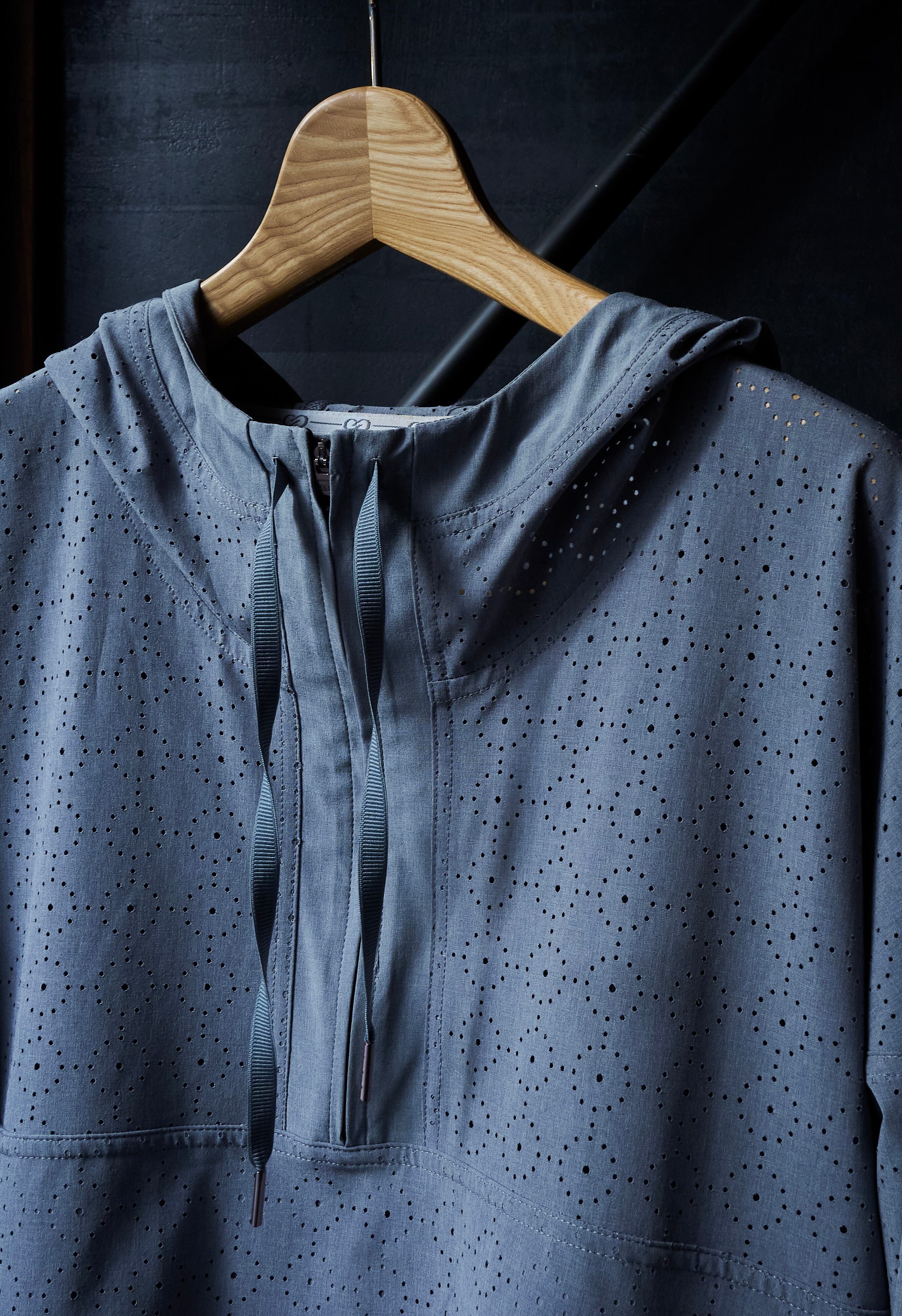 レーザーカット加工により、作られた面白い生地を使用したアノラックパターンフーディプルオーバー。
