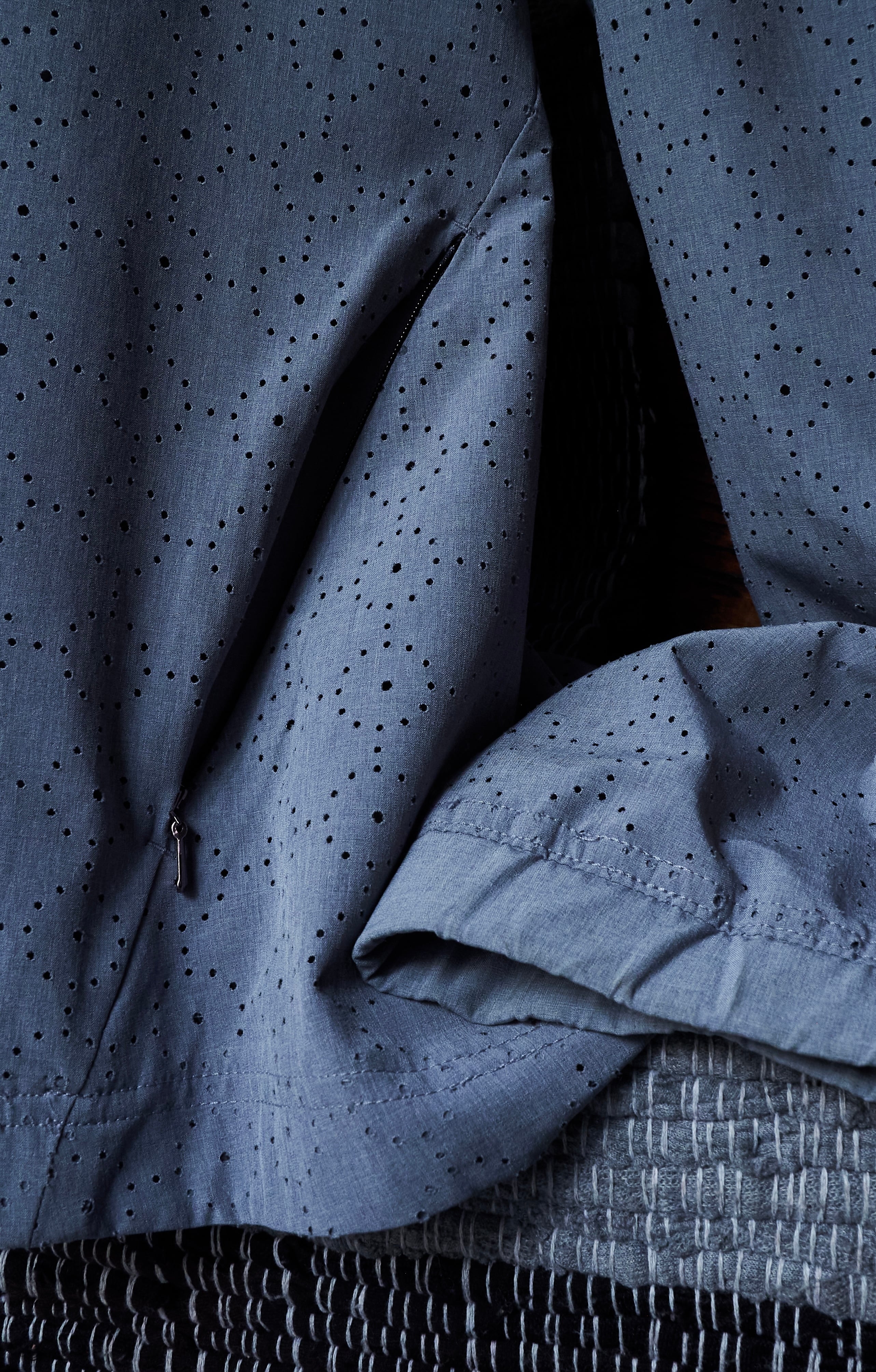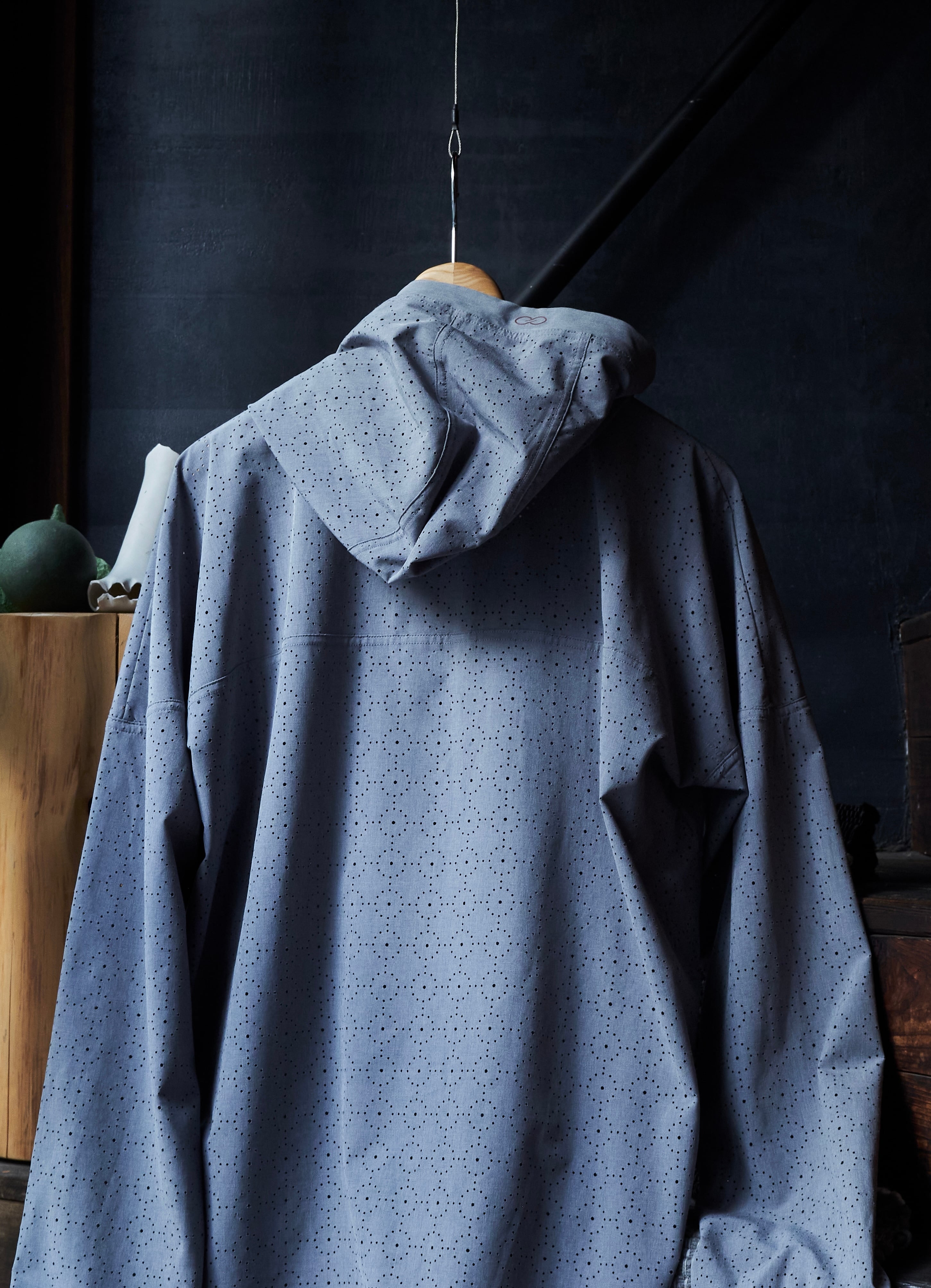 紋様を描くように切り抜かれた生地は衣服としては不思議なオーラを放ちます。