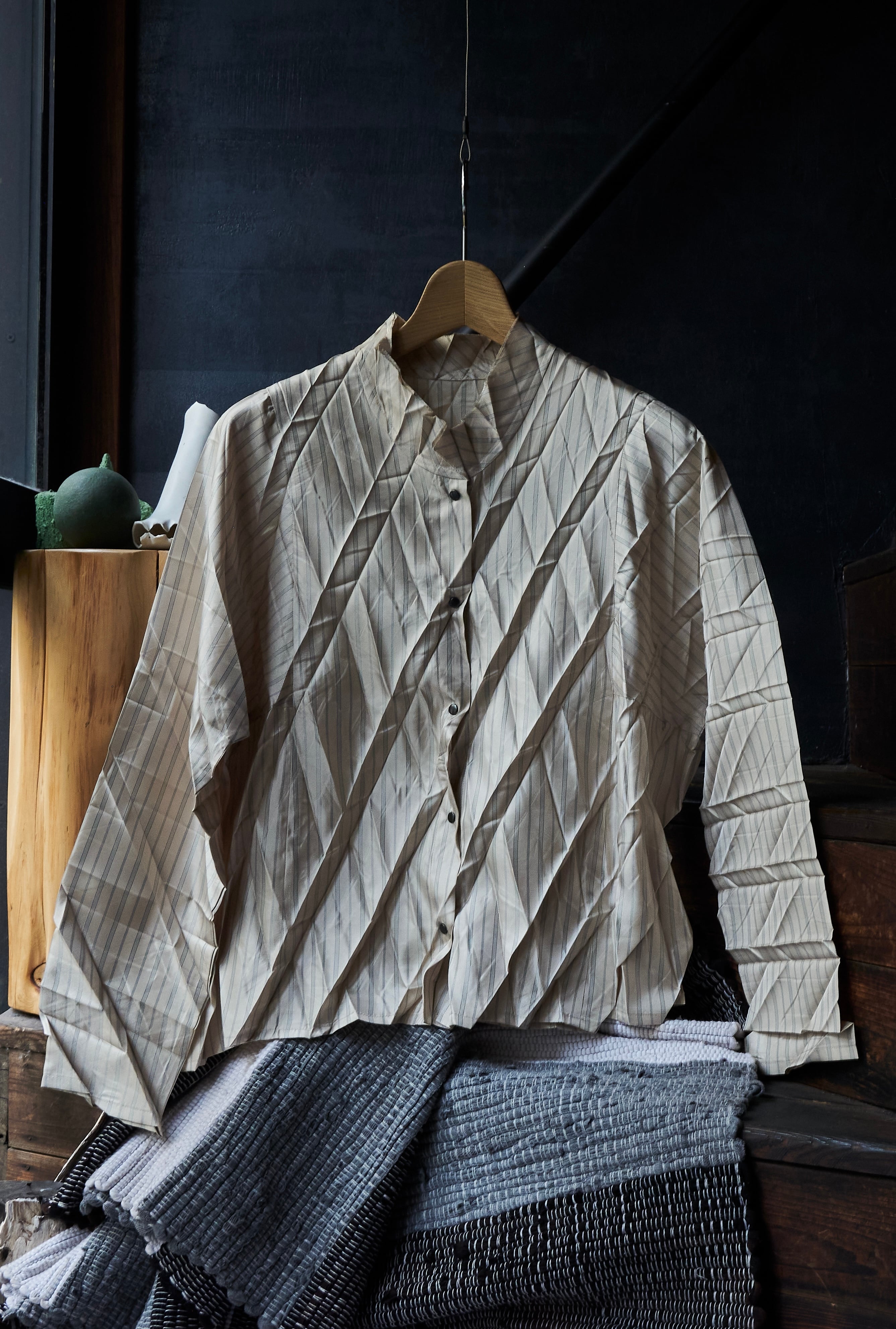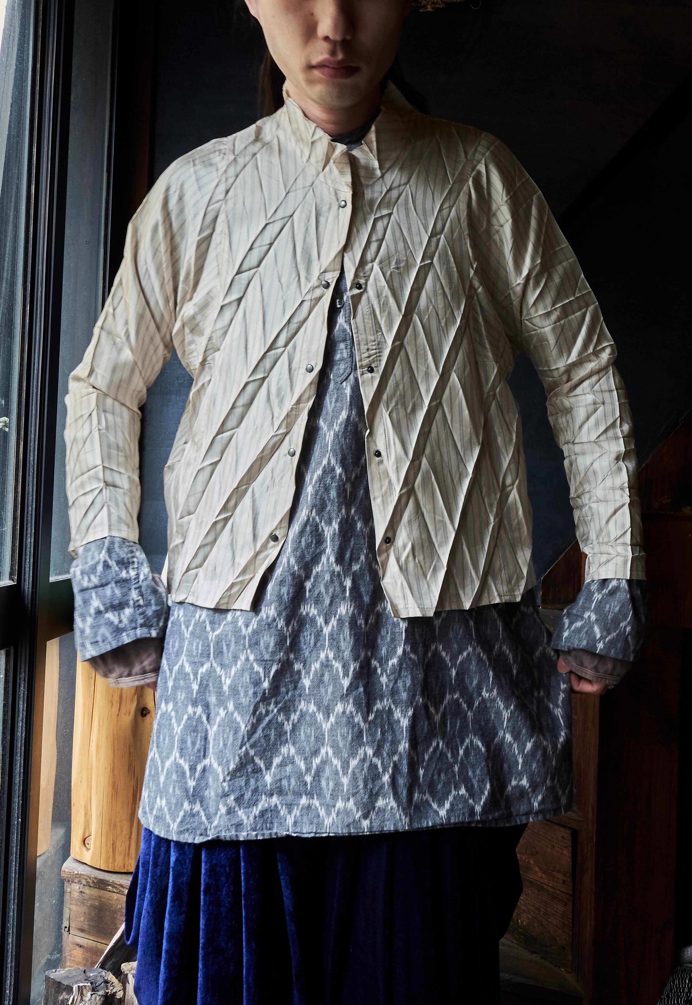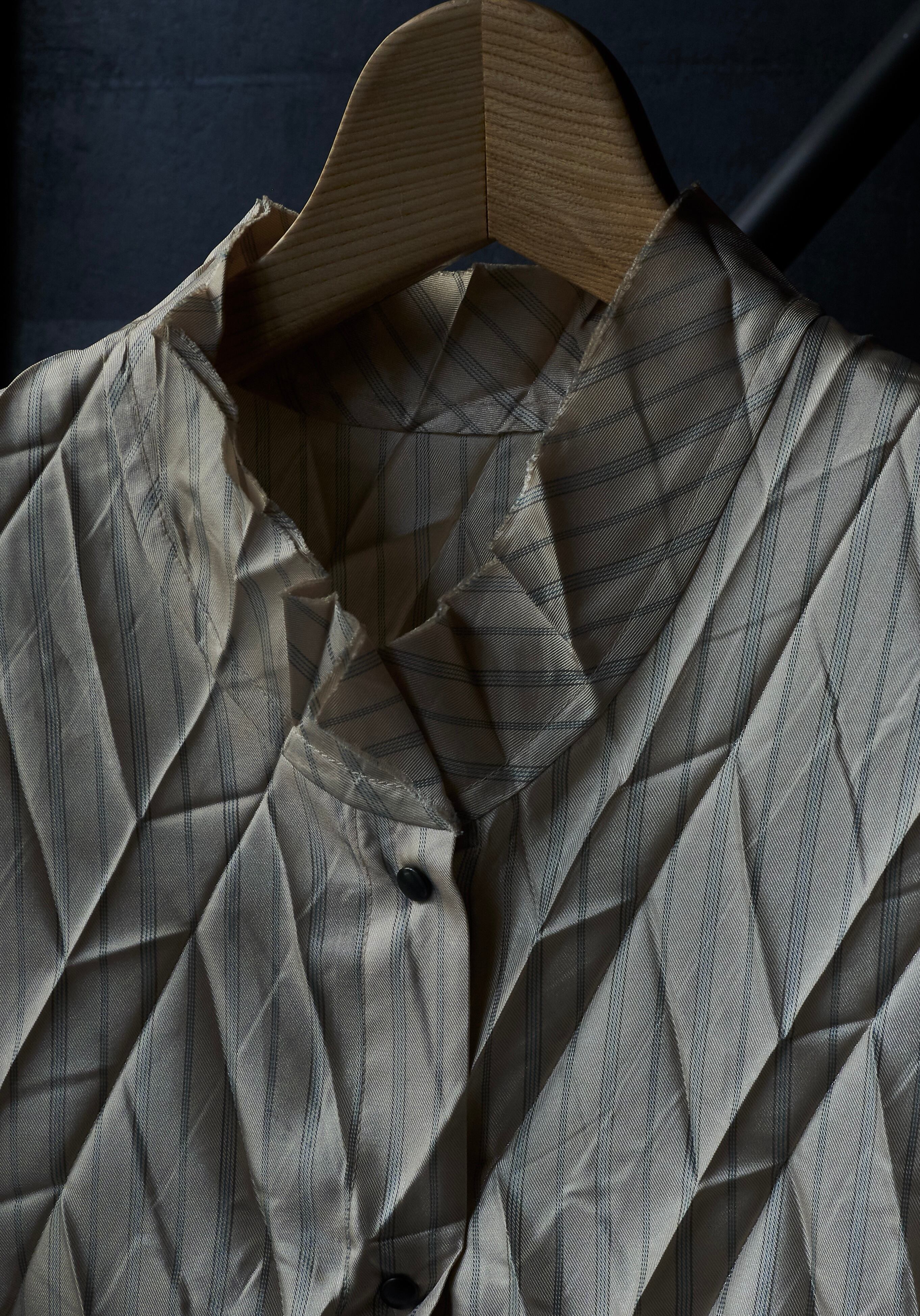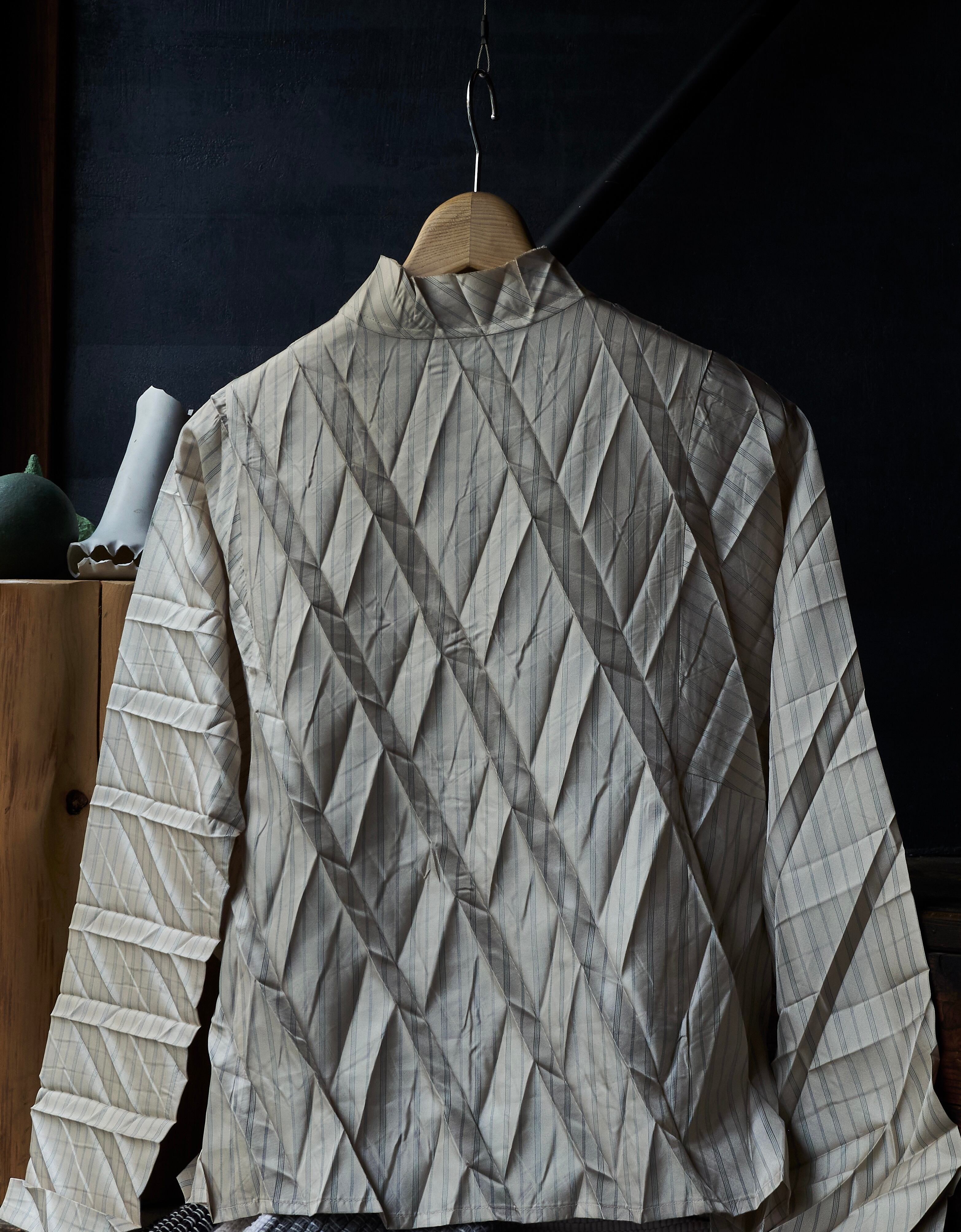 伸縮あるプリーツ感にシワ加工が施されたシャツ。