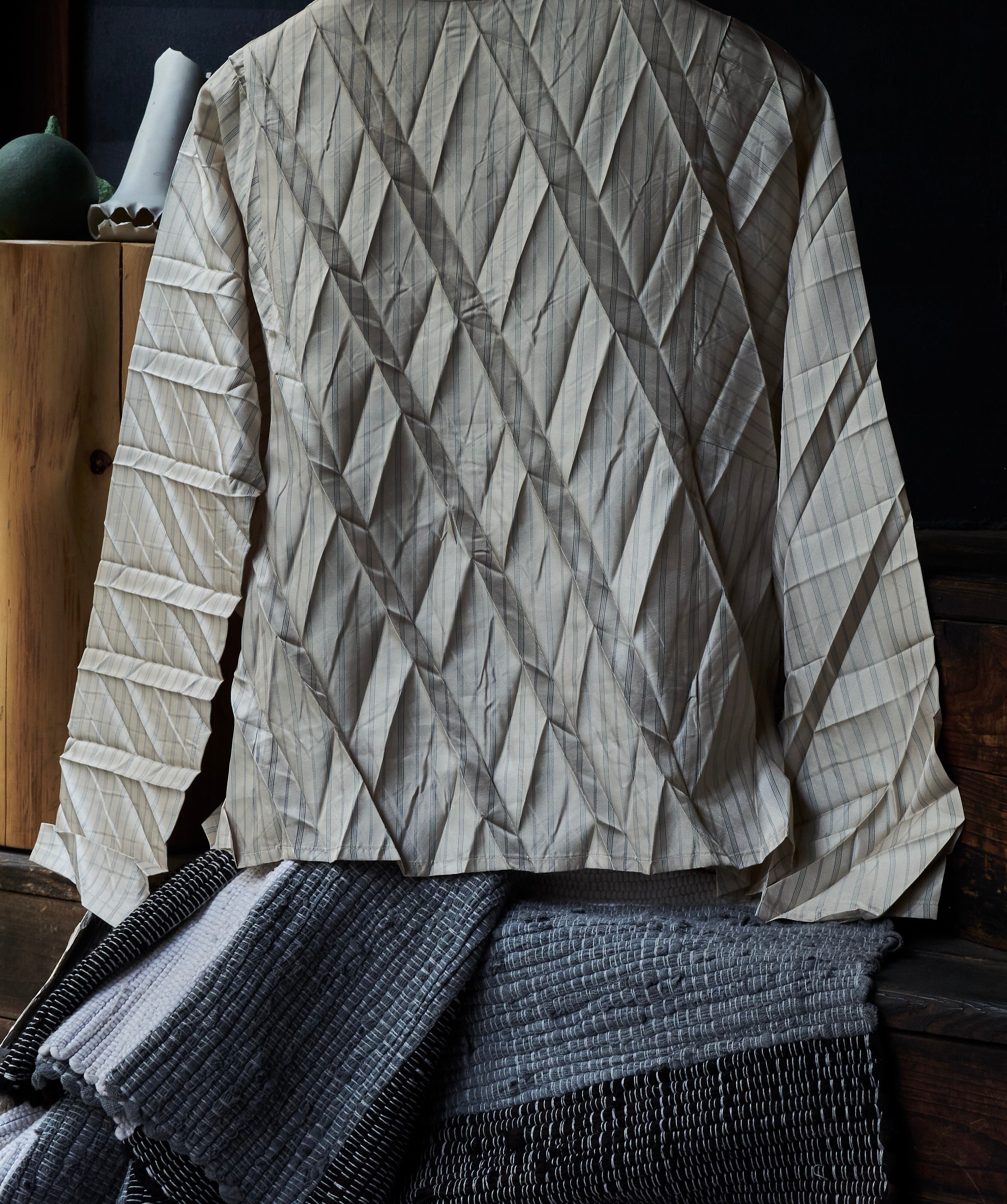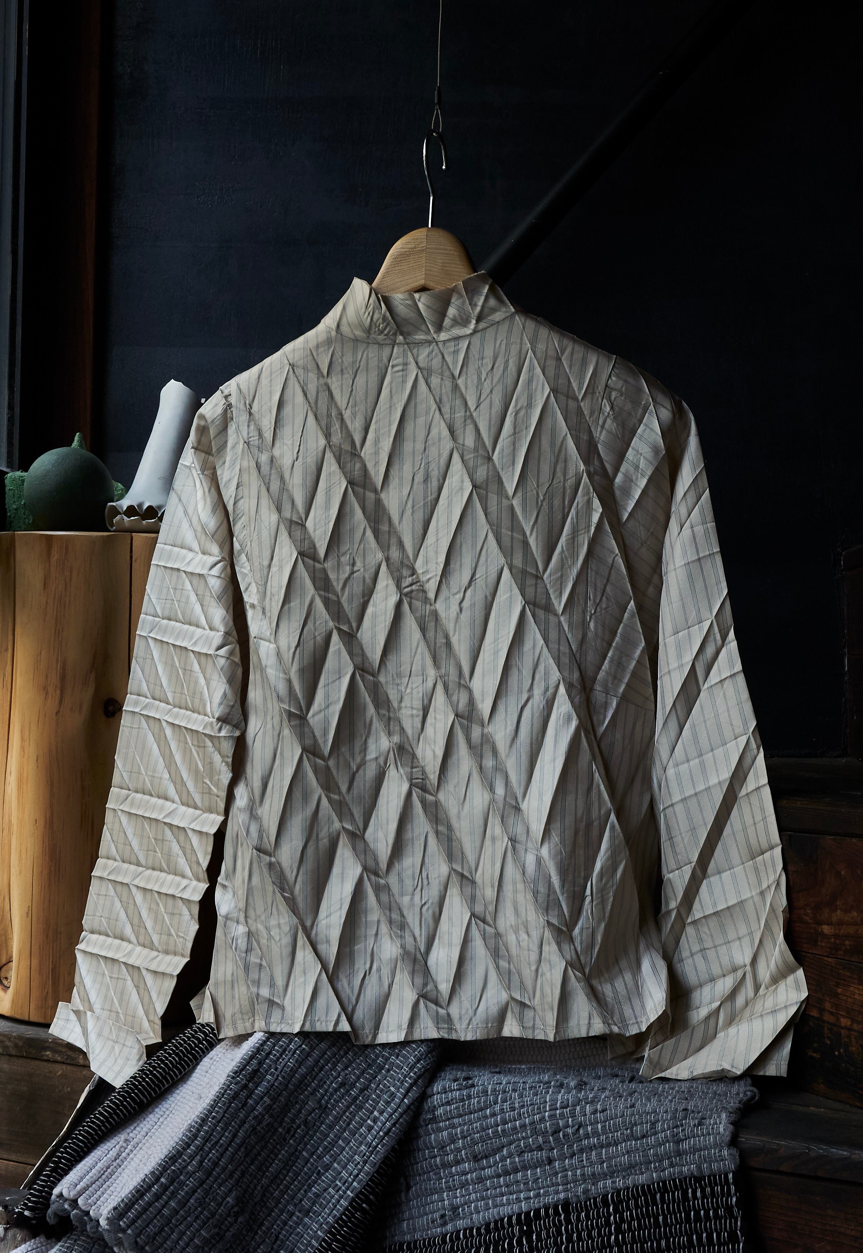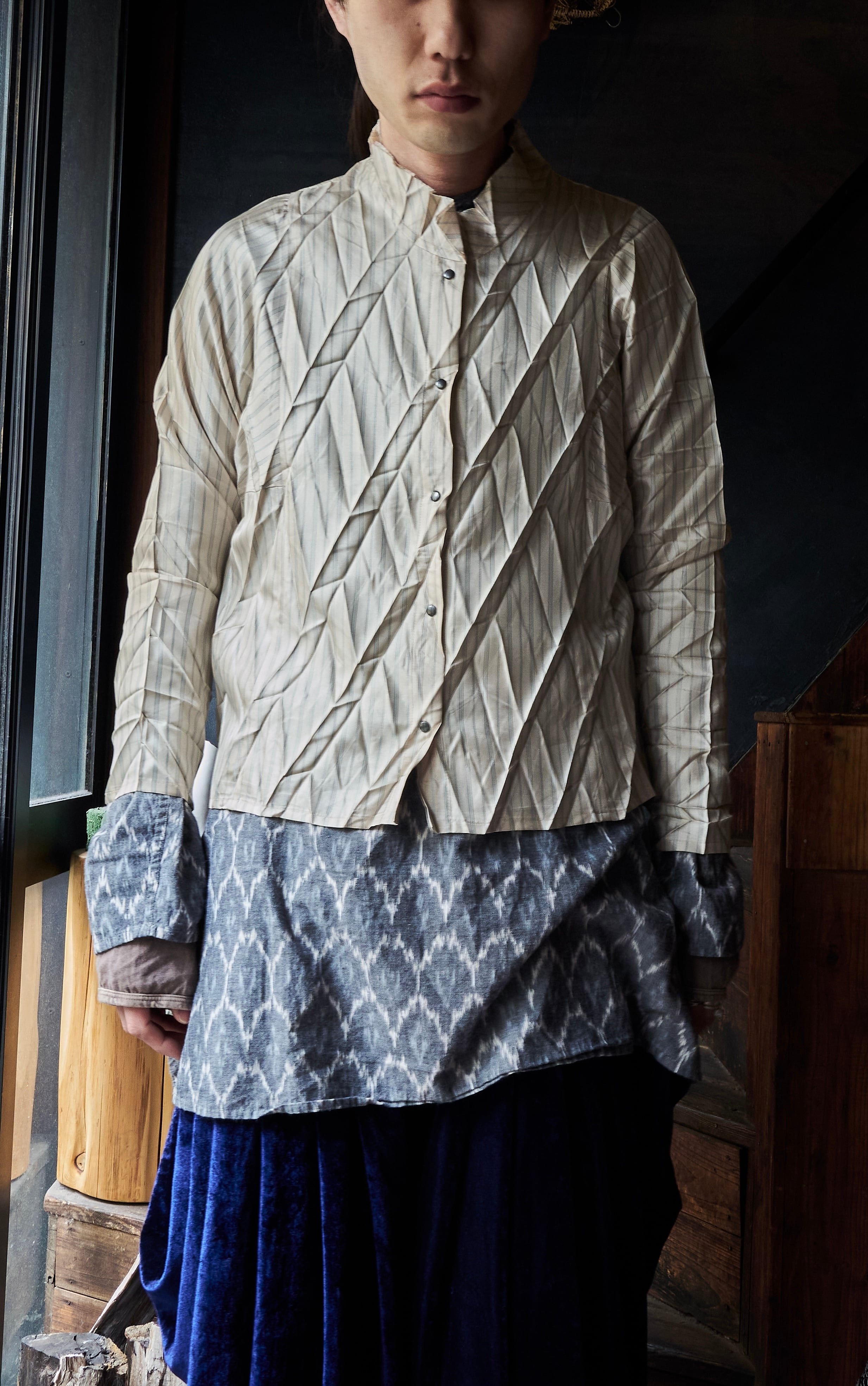 伸縮あるプリーツ感にシワ加工が施されたシャツ。