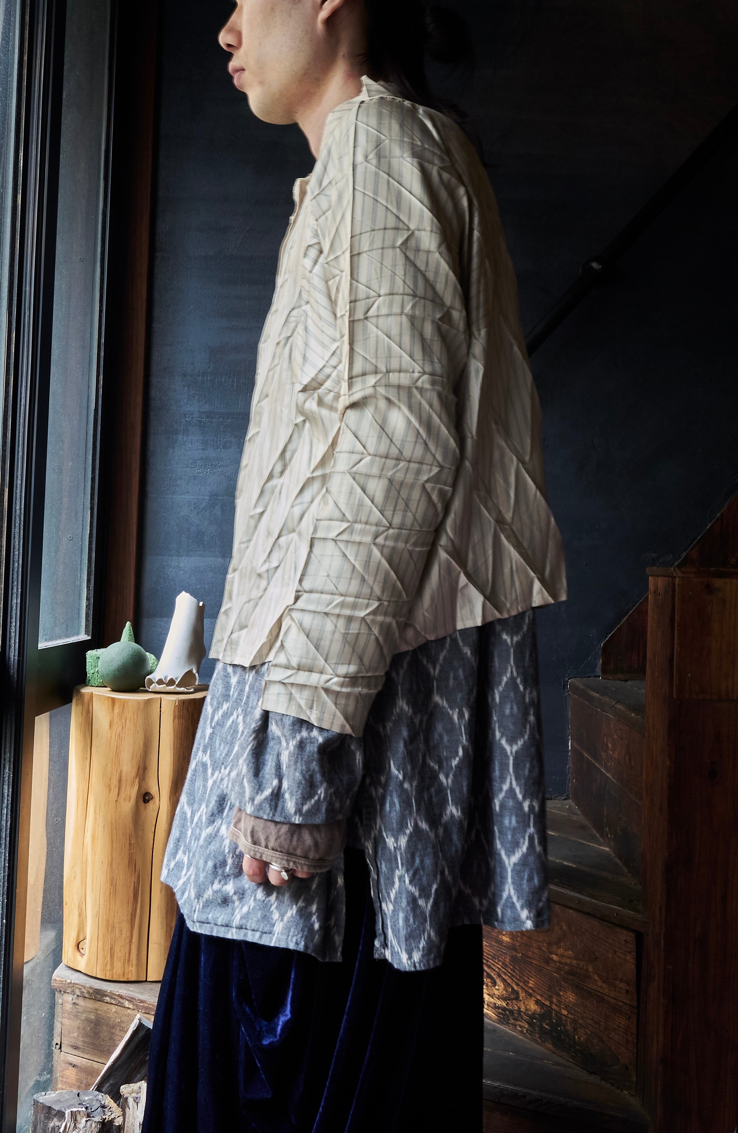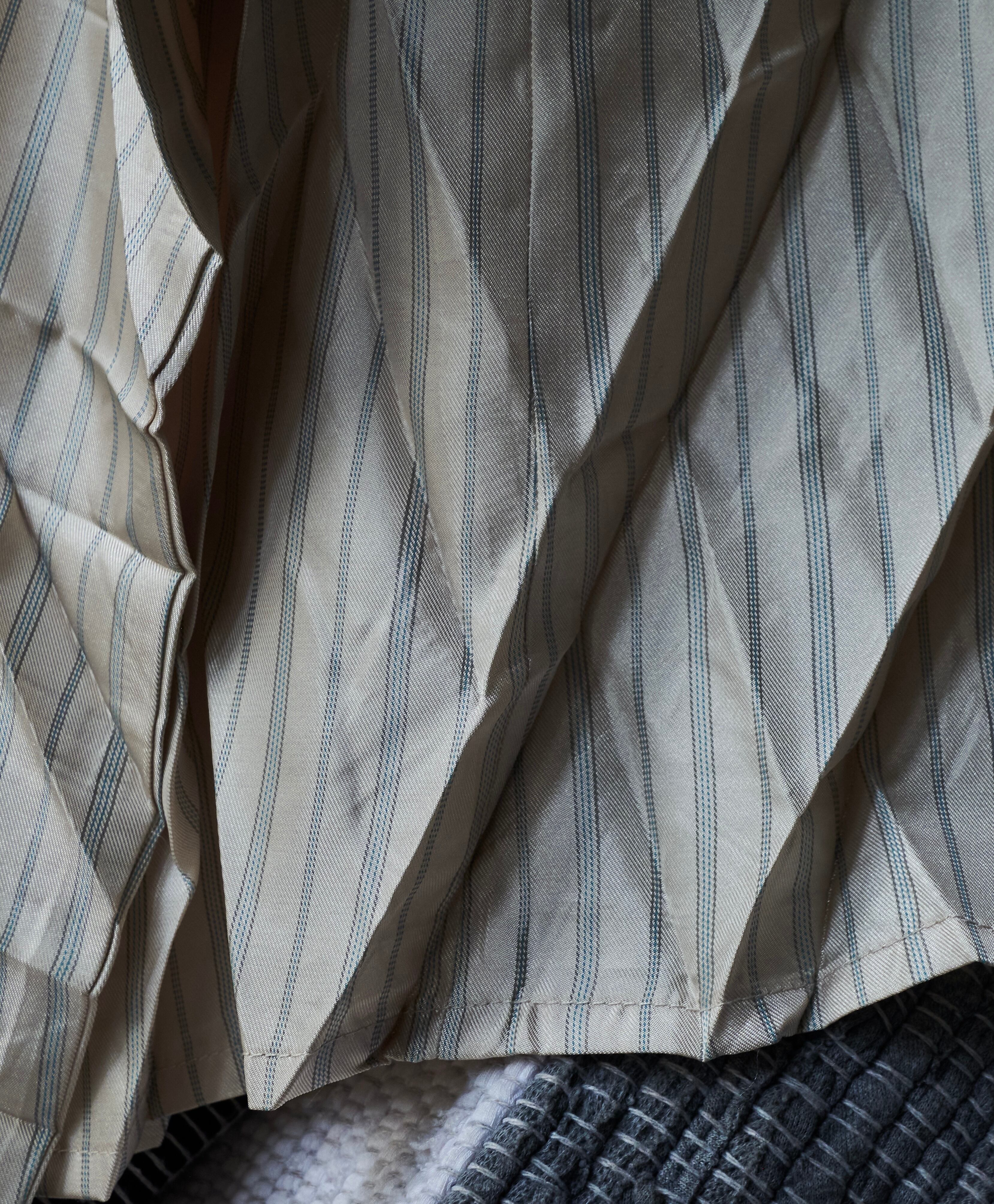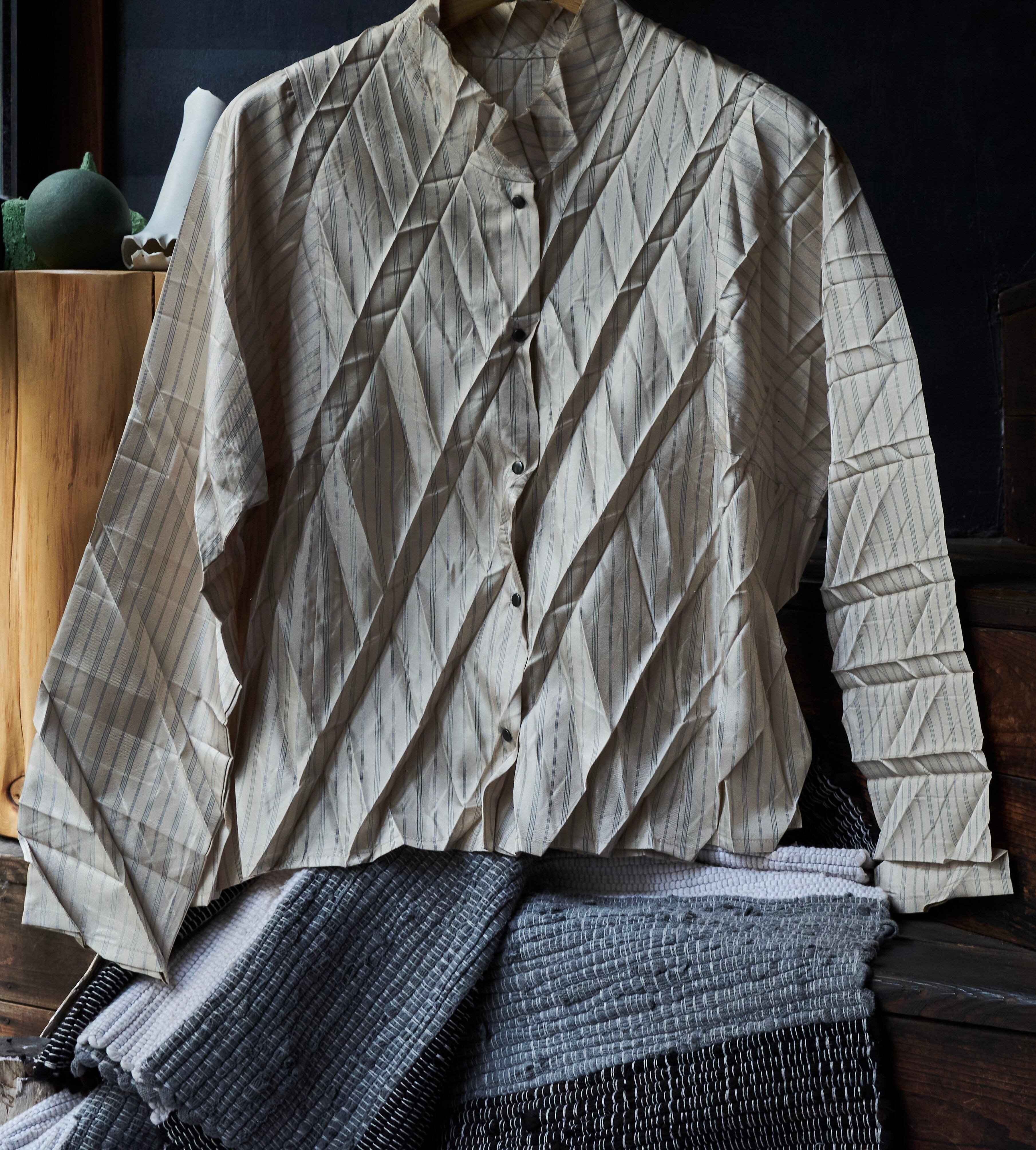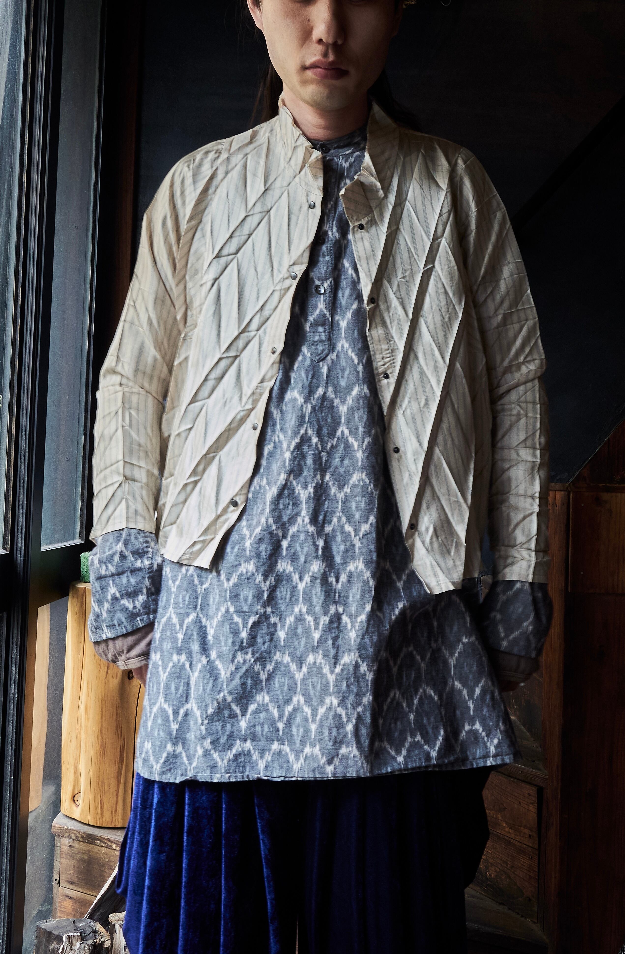 伸縮あるプリーツ感にシワ加工が施されたシャツ。