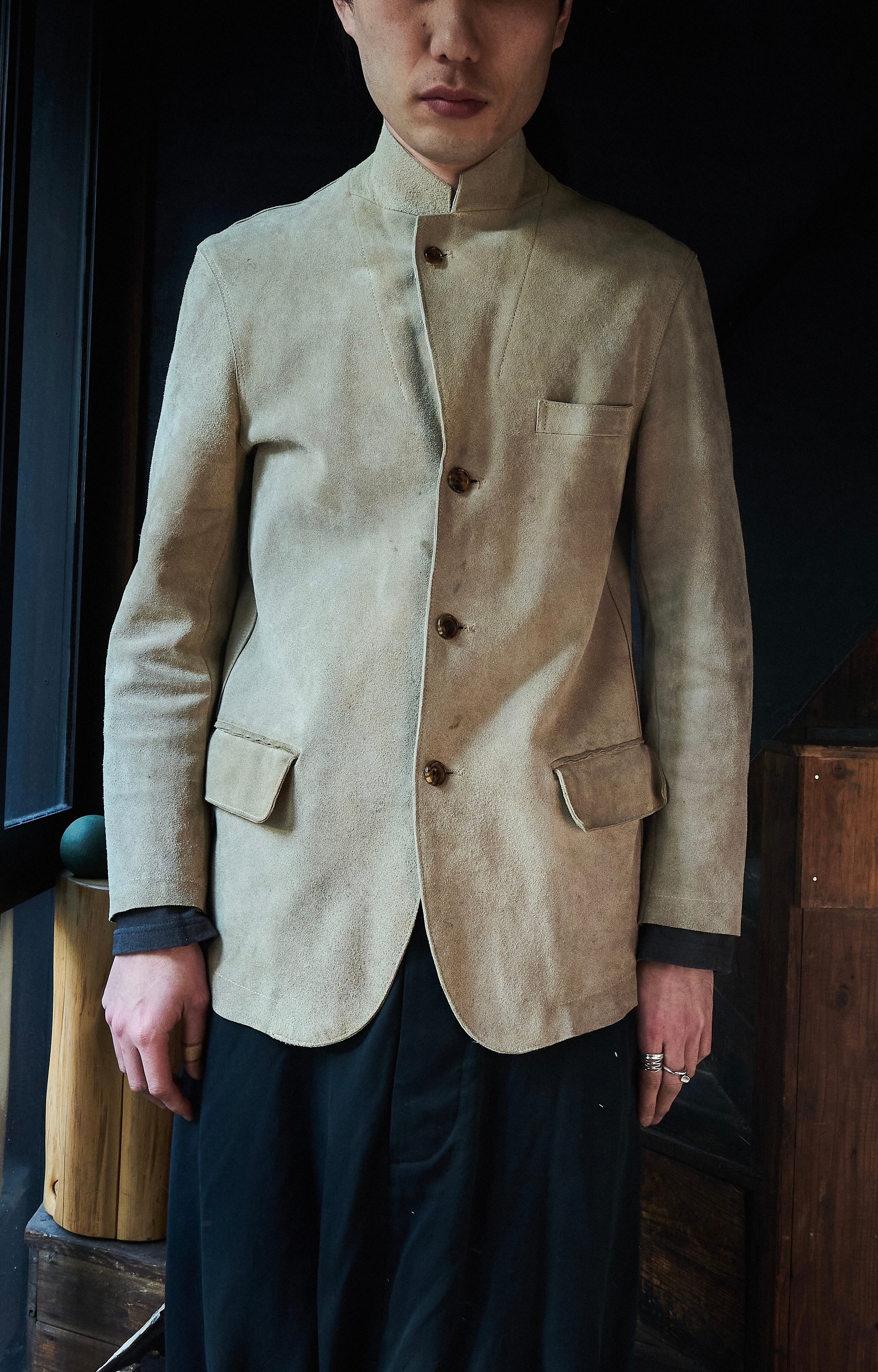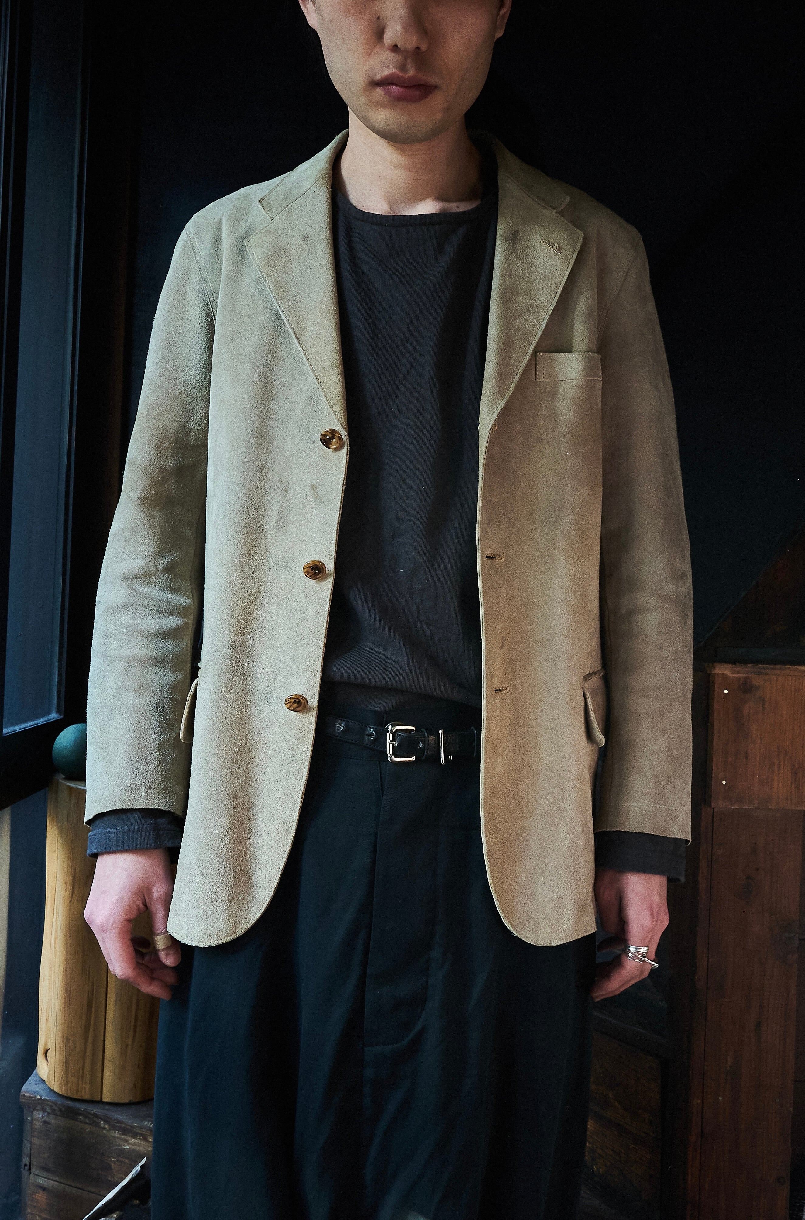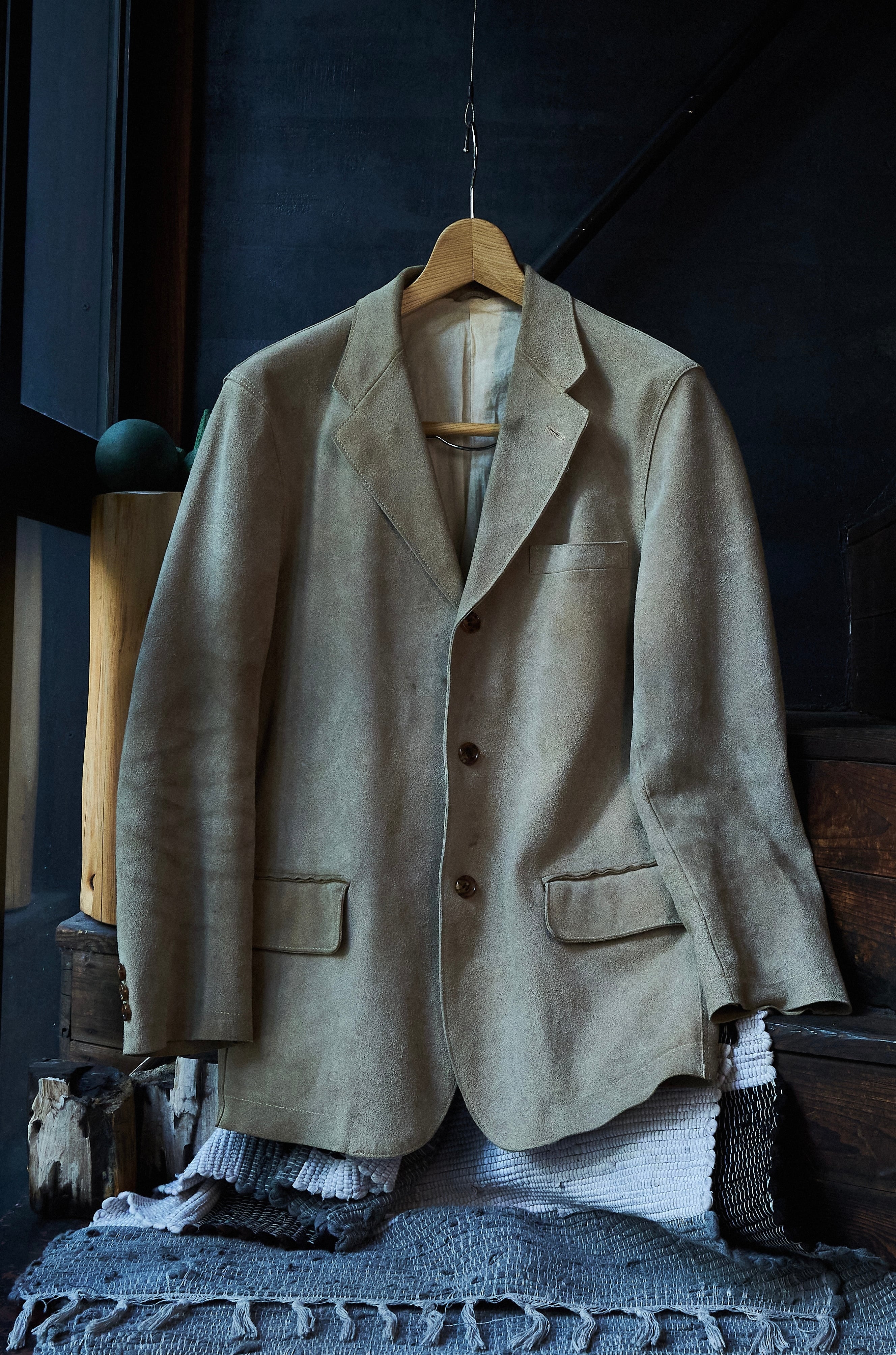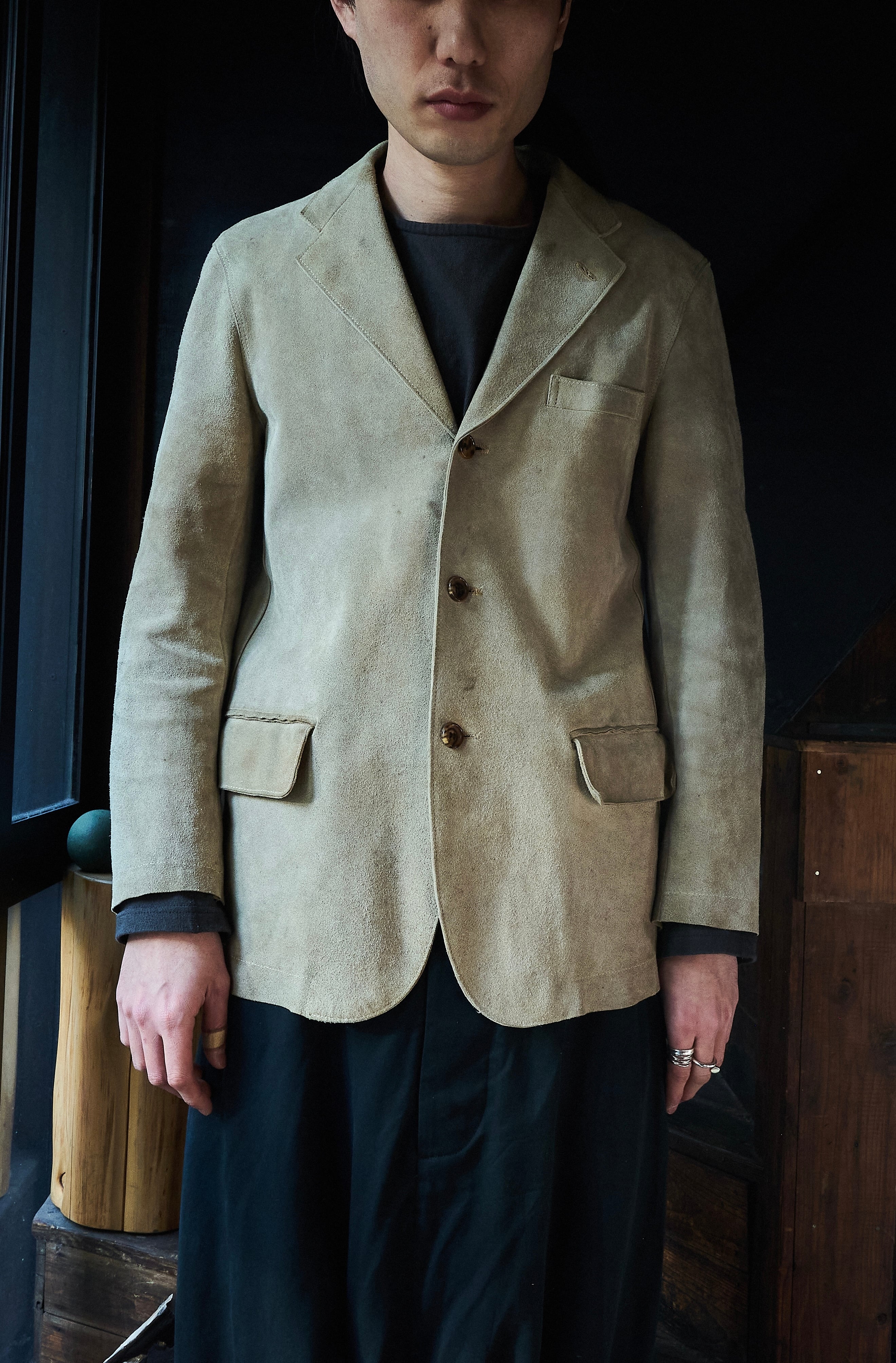 硬さあるスェードではありますが、田中先生の素晴らしいテーラリングの形も相まって不思議な格好良さ。
