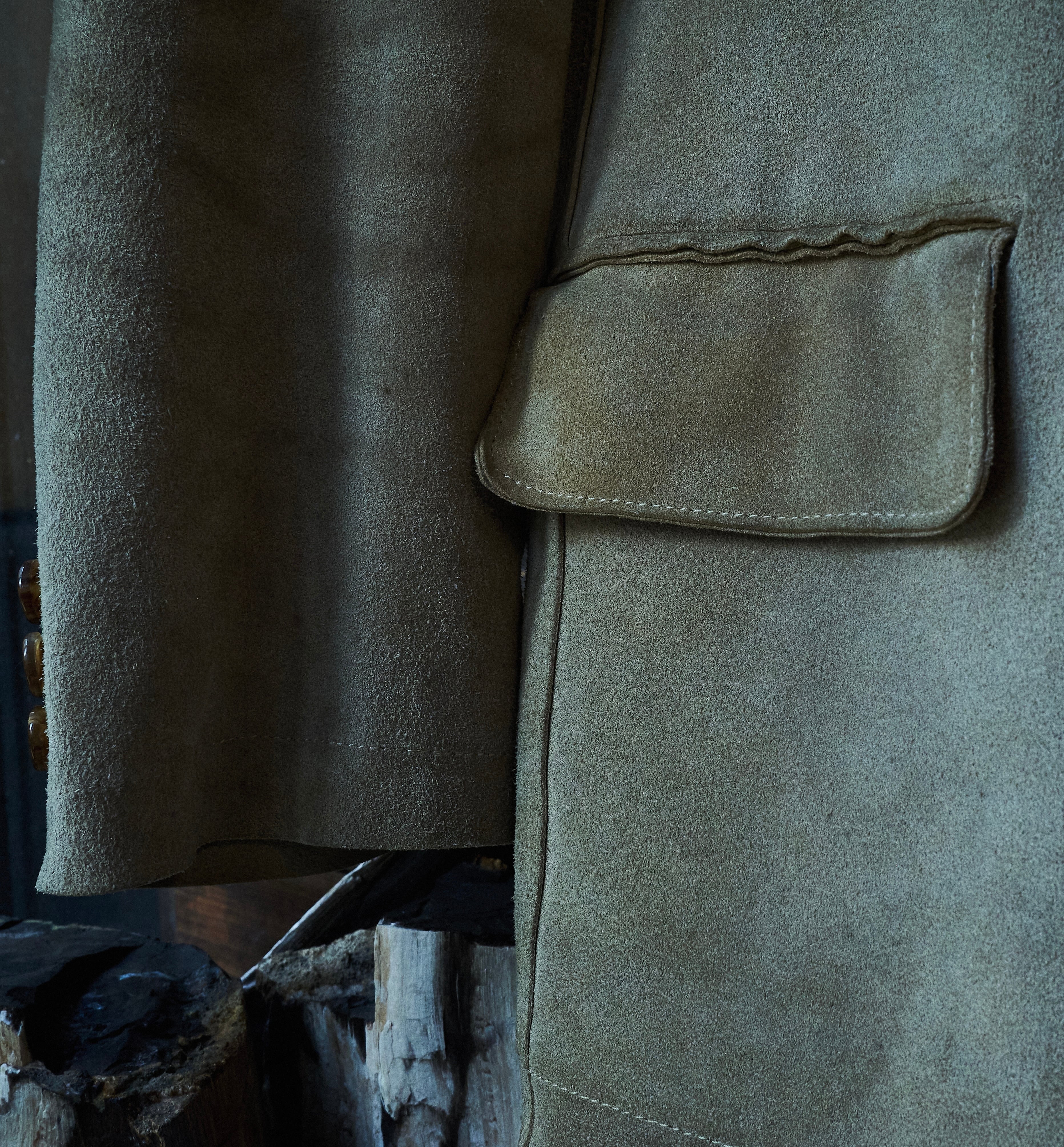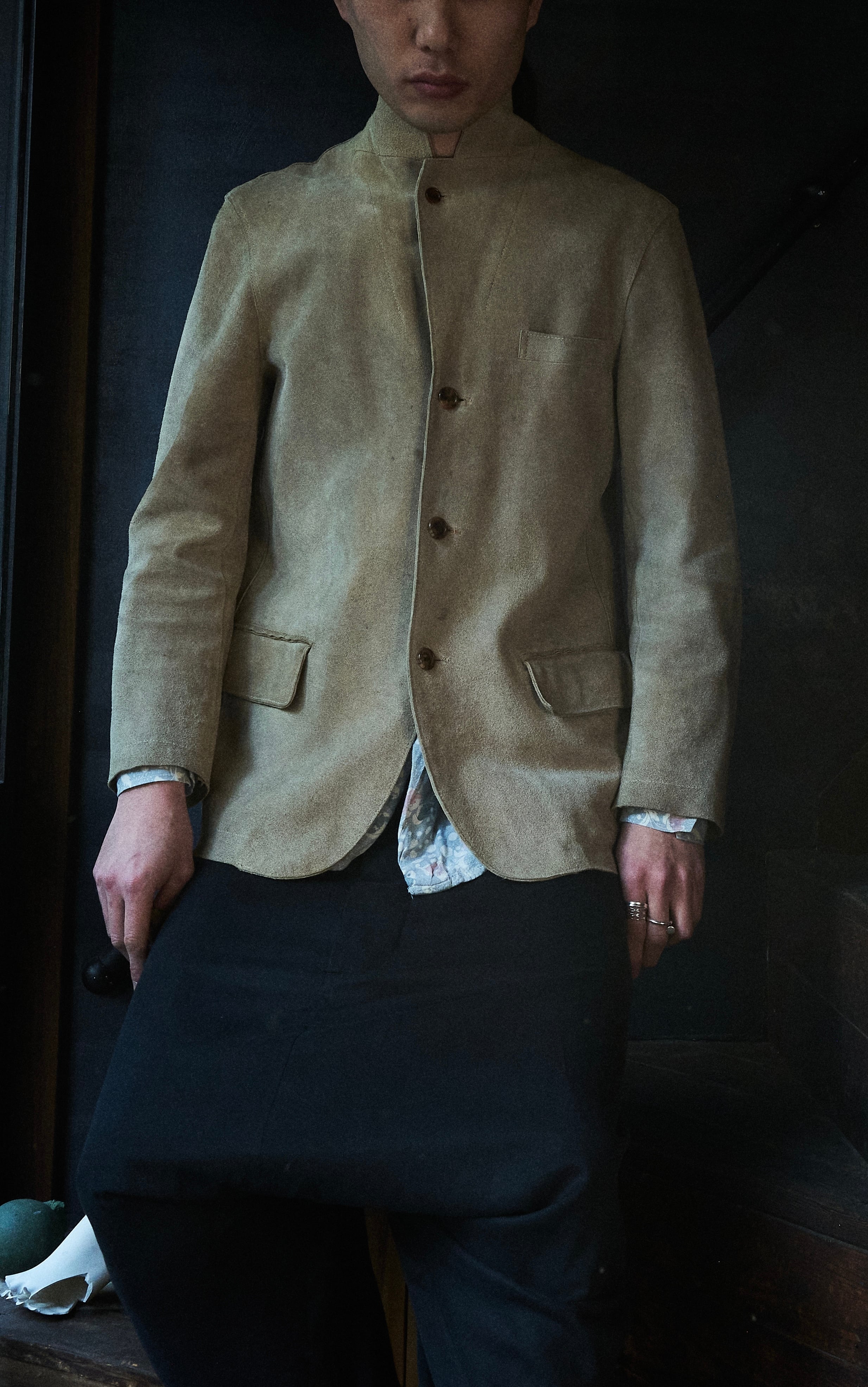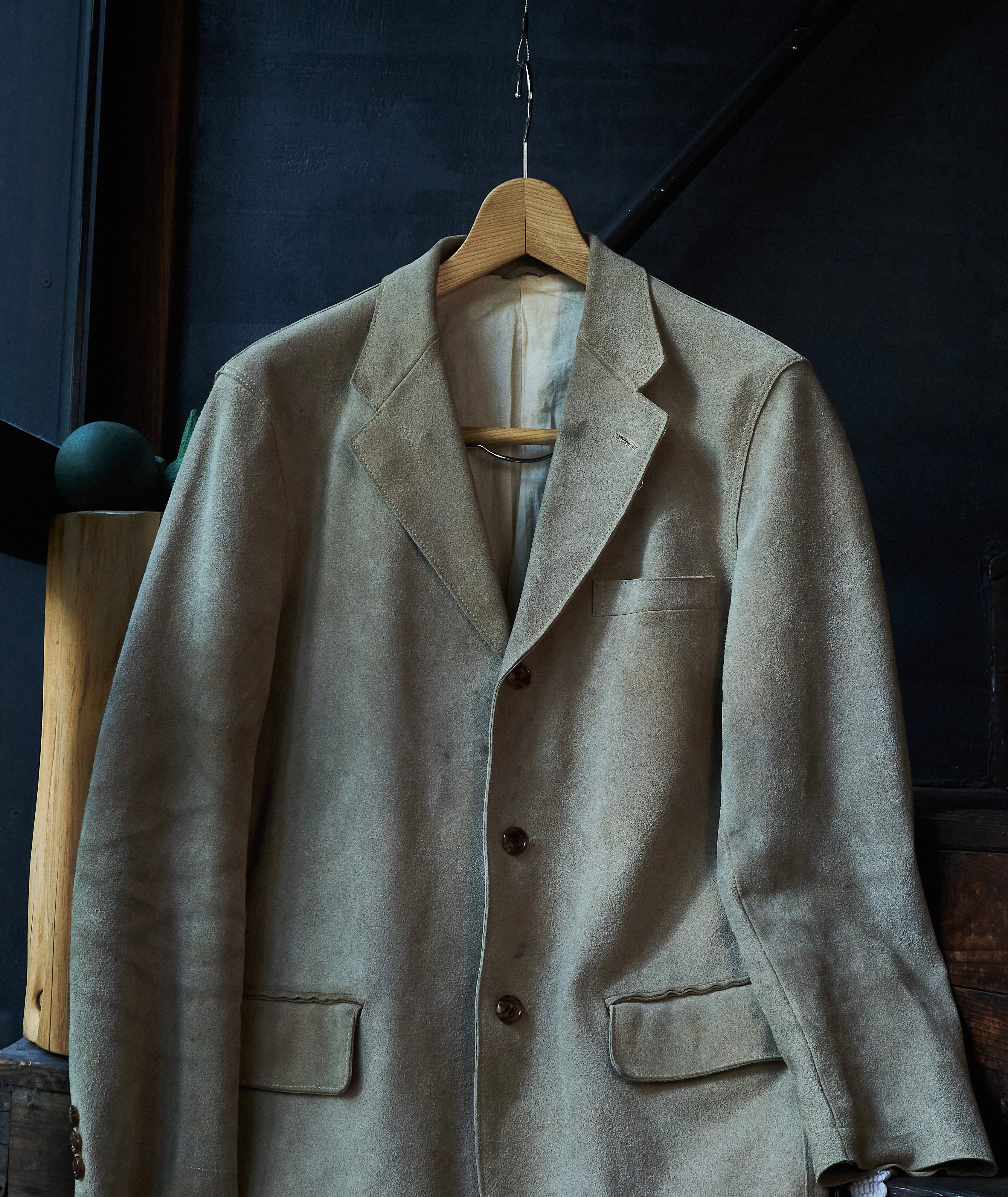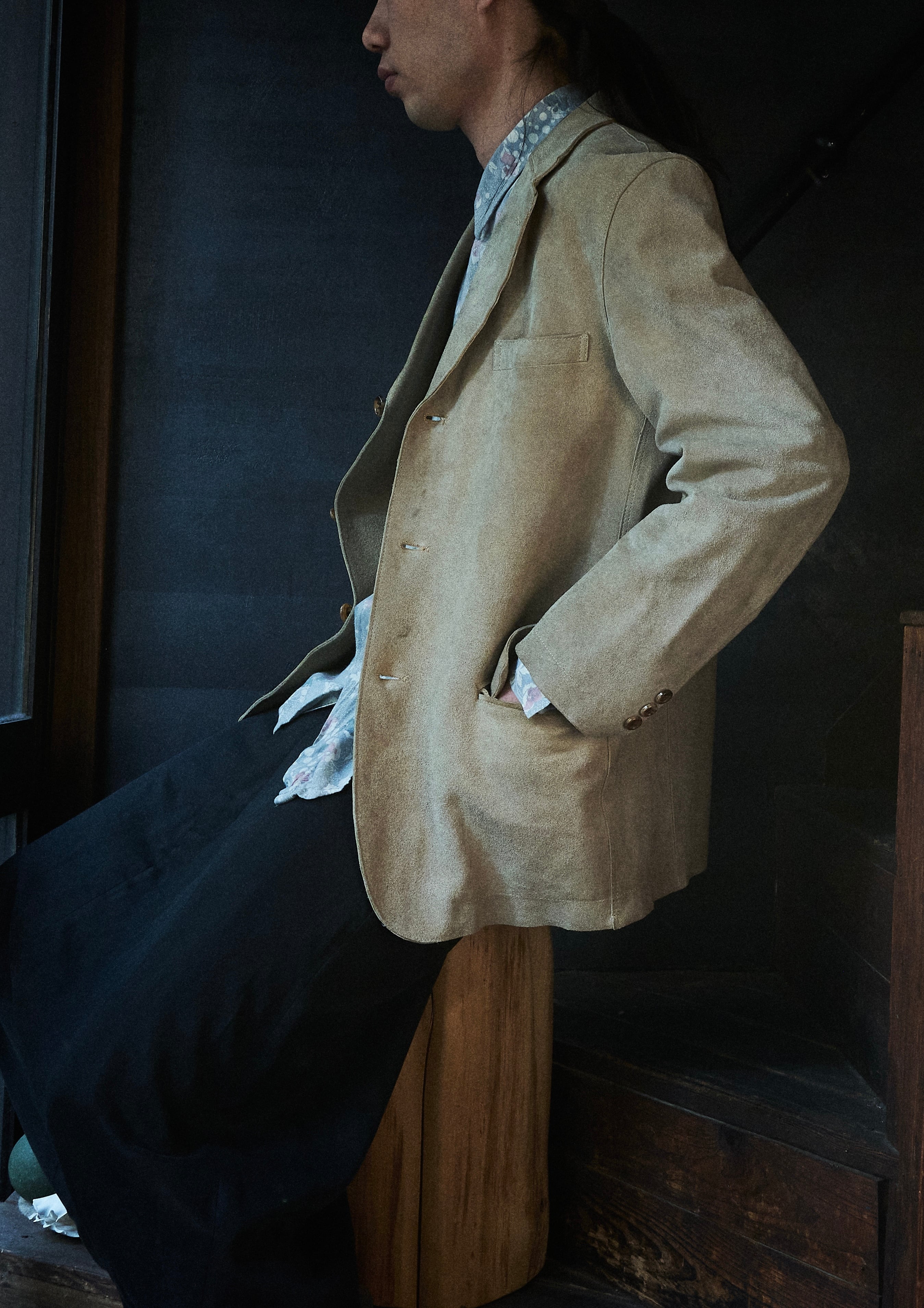 硬さあるスェードではありますが、田中先生の素晴らしいテーラリングの形も相まって不思議な格好良さ。