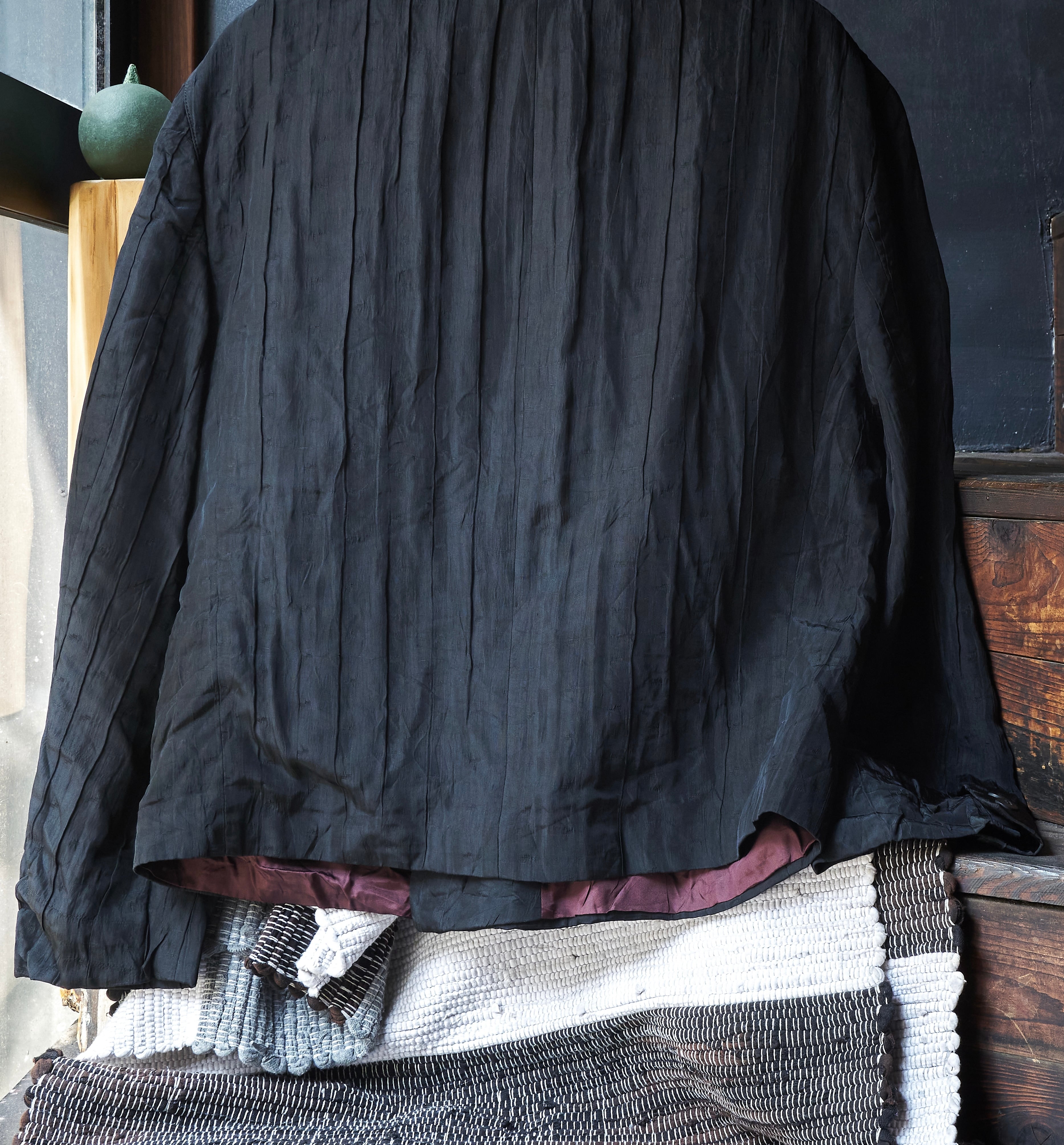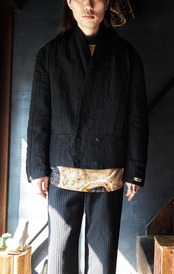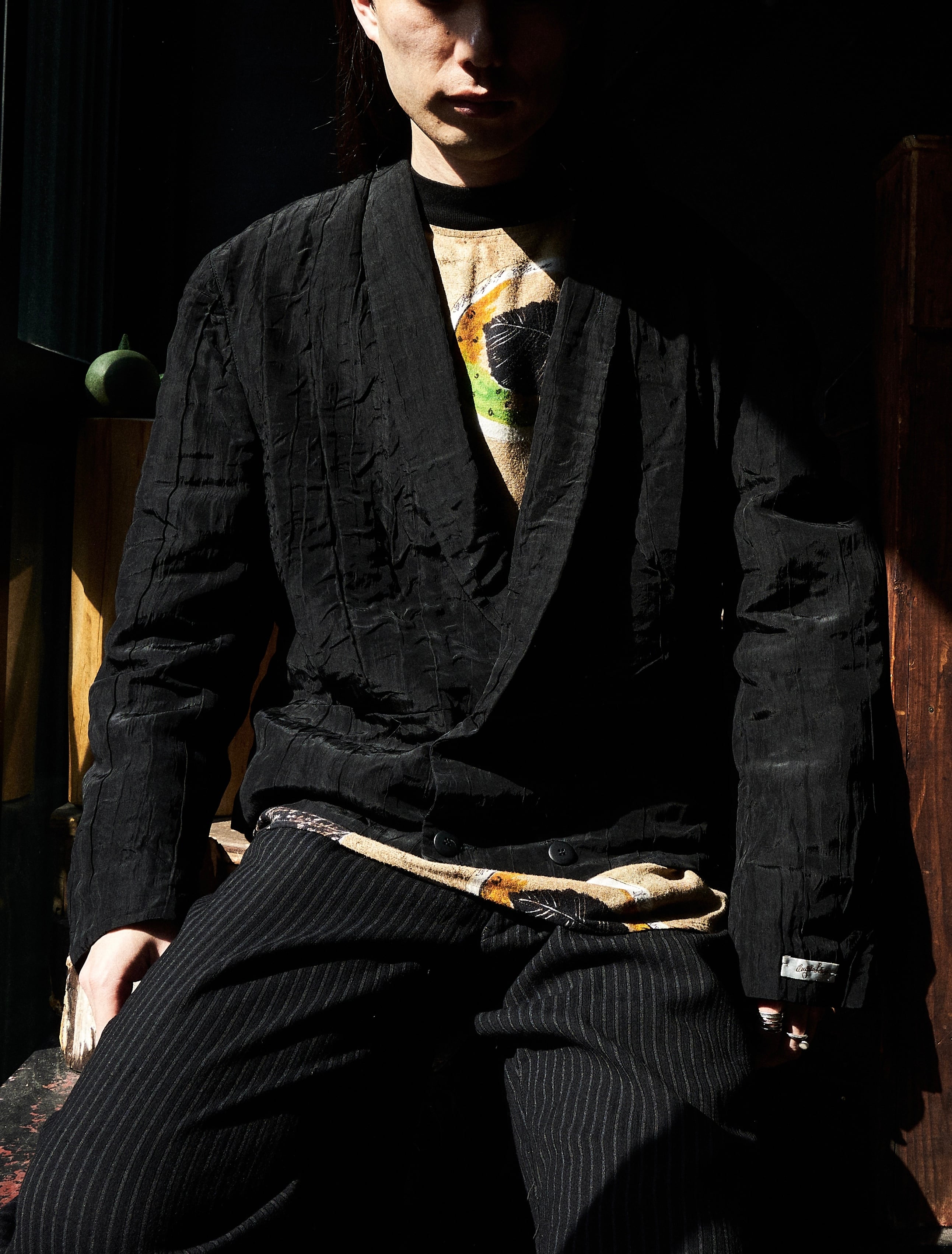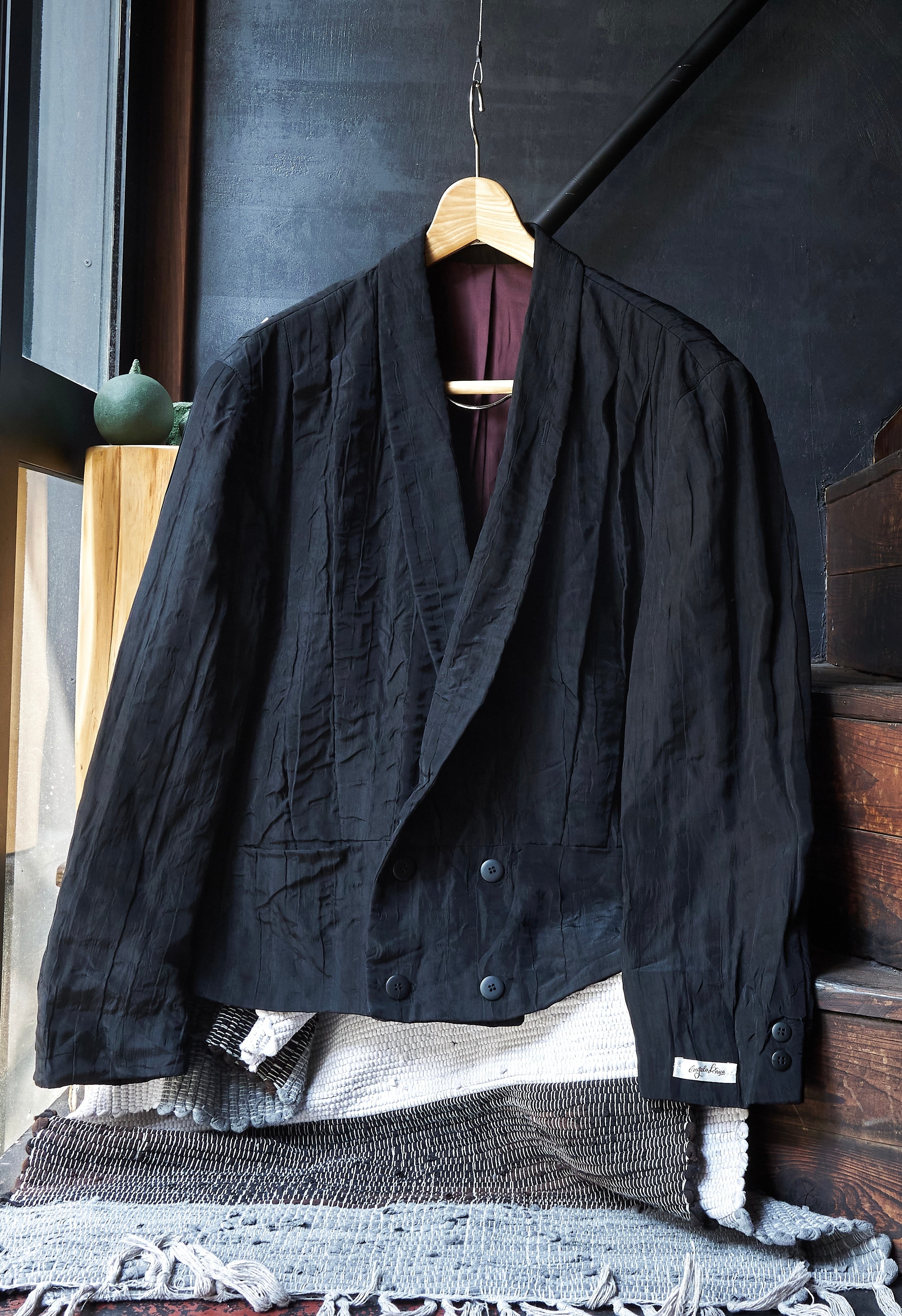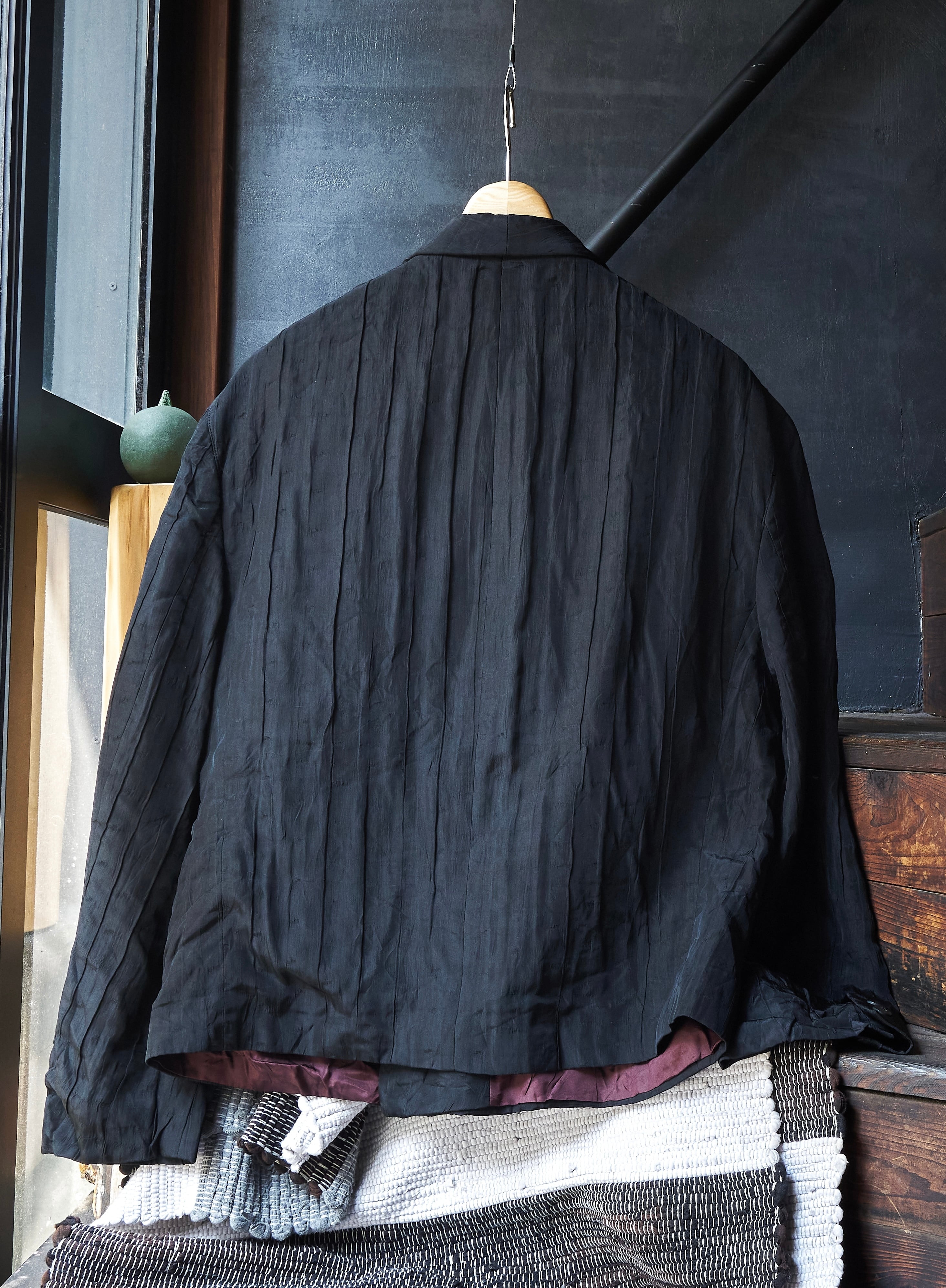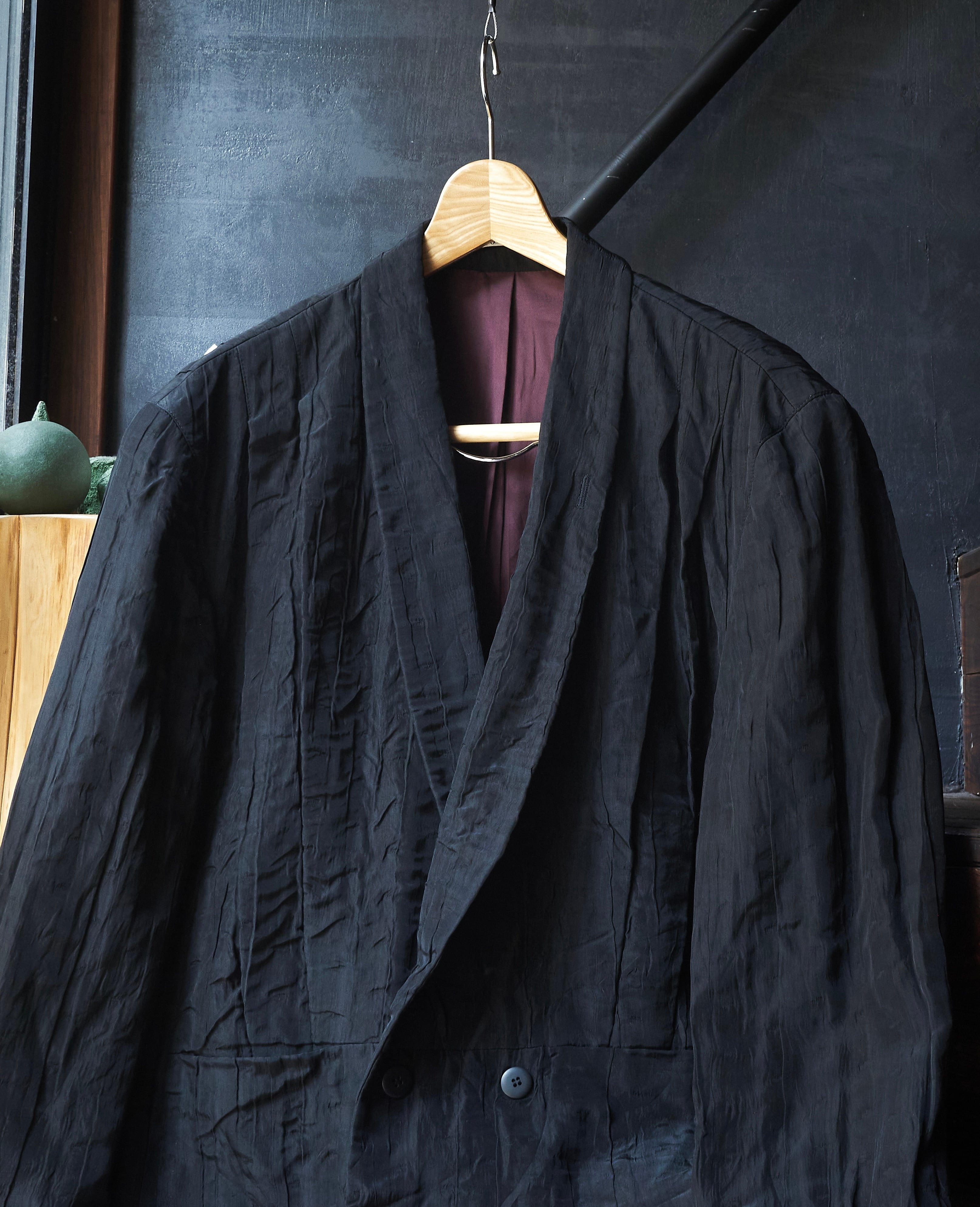 現代服としても時代にアジャストしたドレープとプリーツとシワ加工がミックスしたようなジャケット。