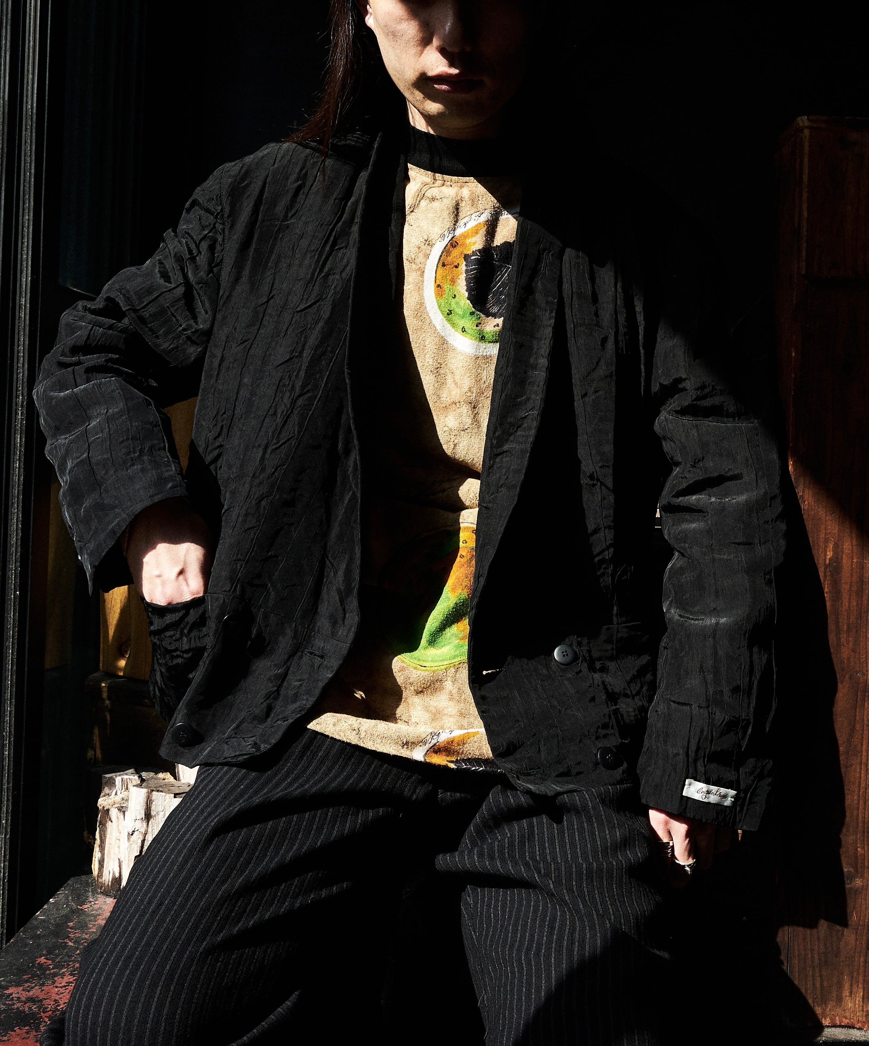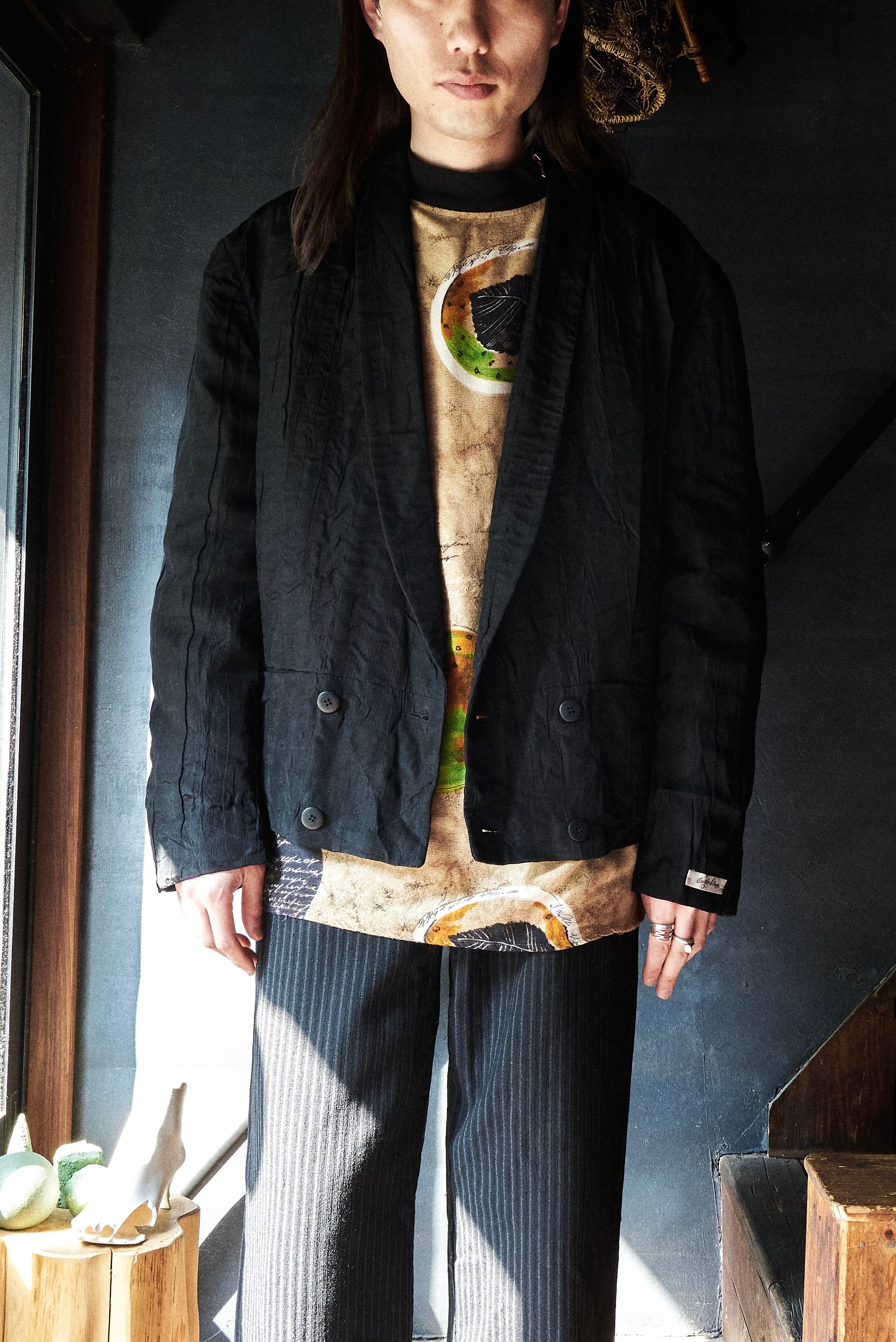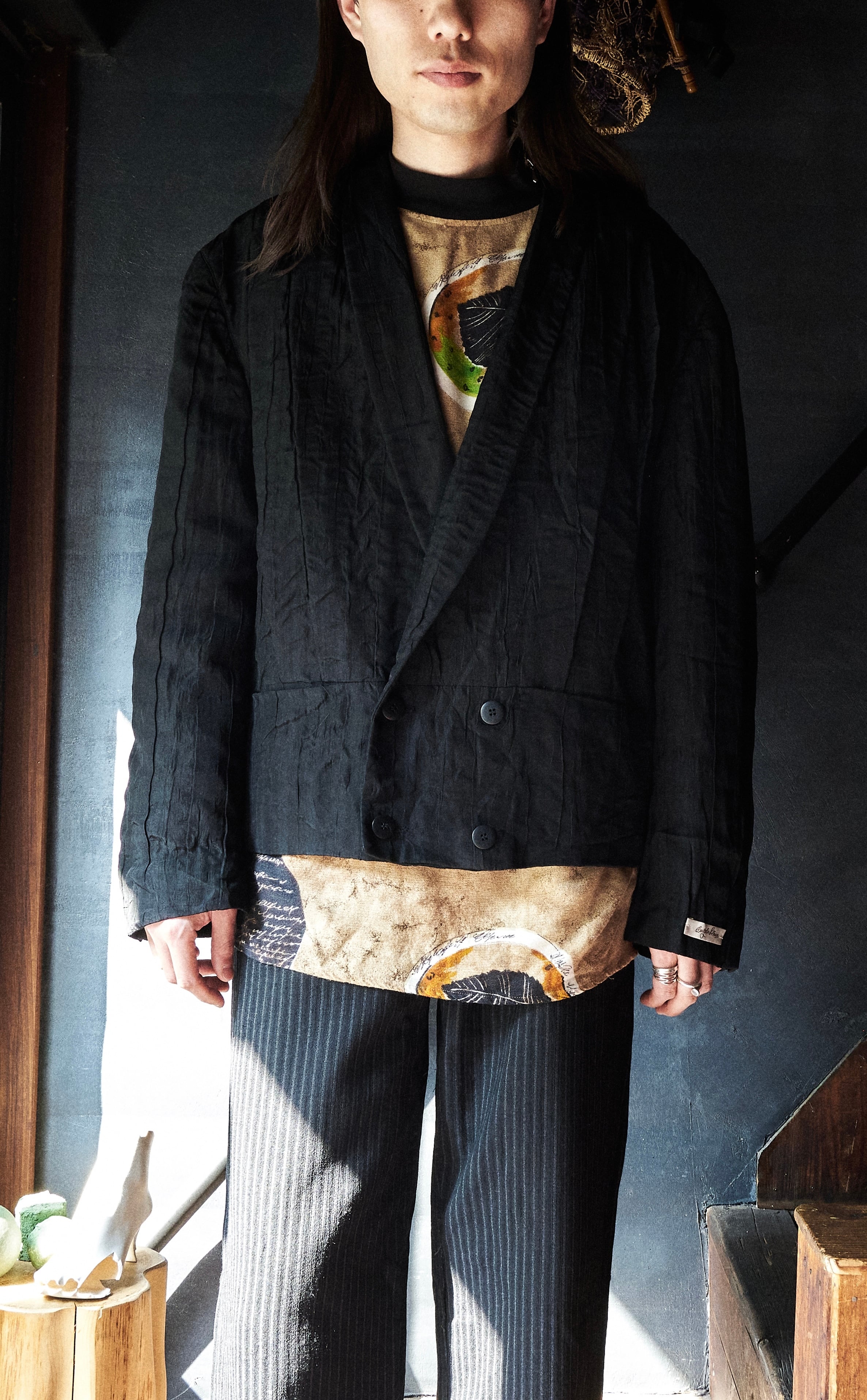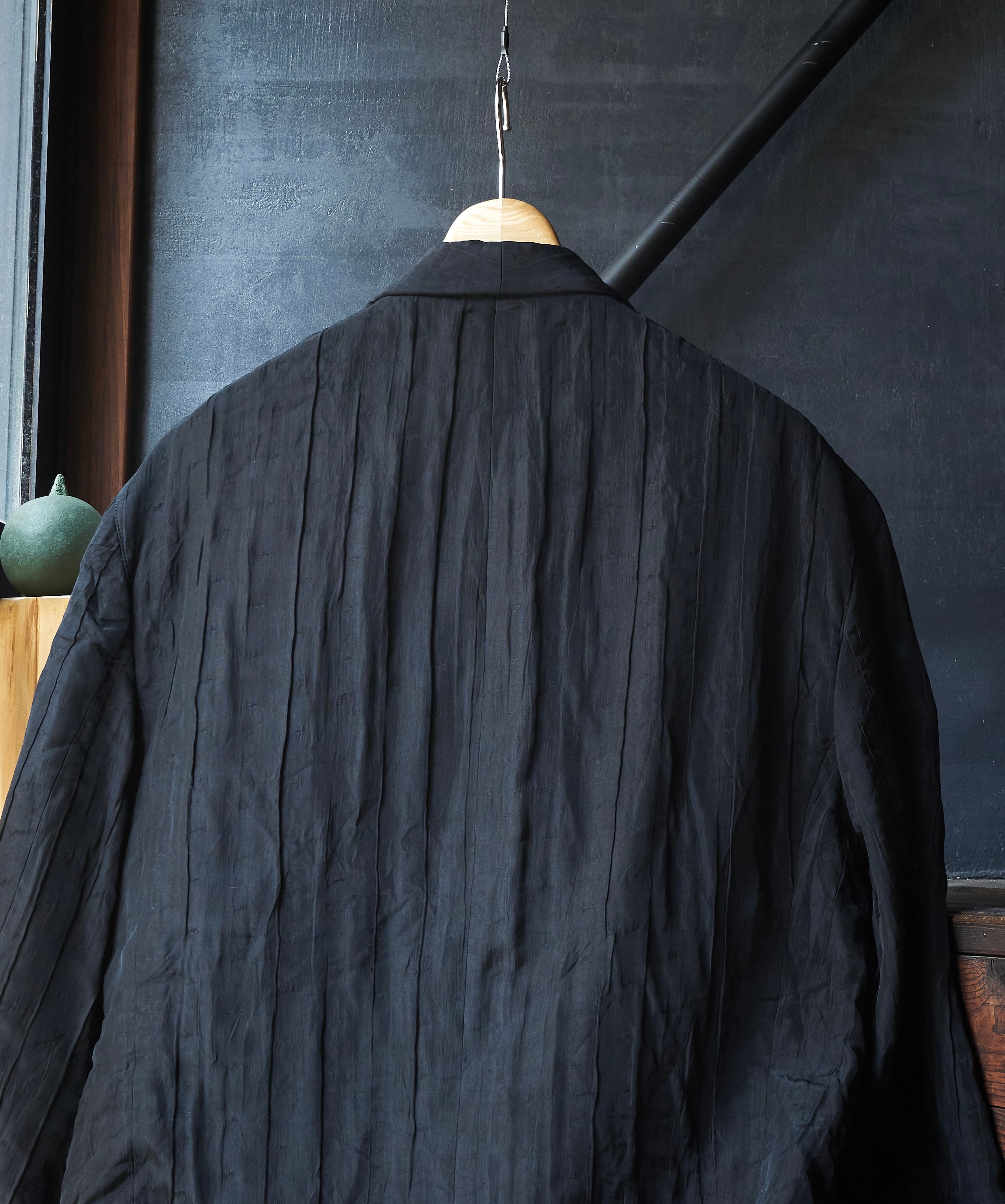 現代服としても時代にアジャストしたドレープとプリーツとシワ加工がミックスしたようなジャケット。