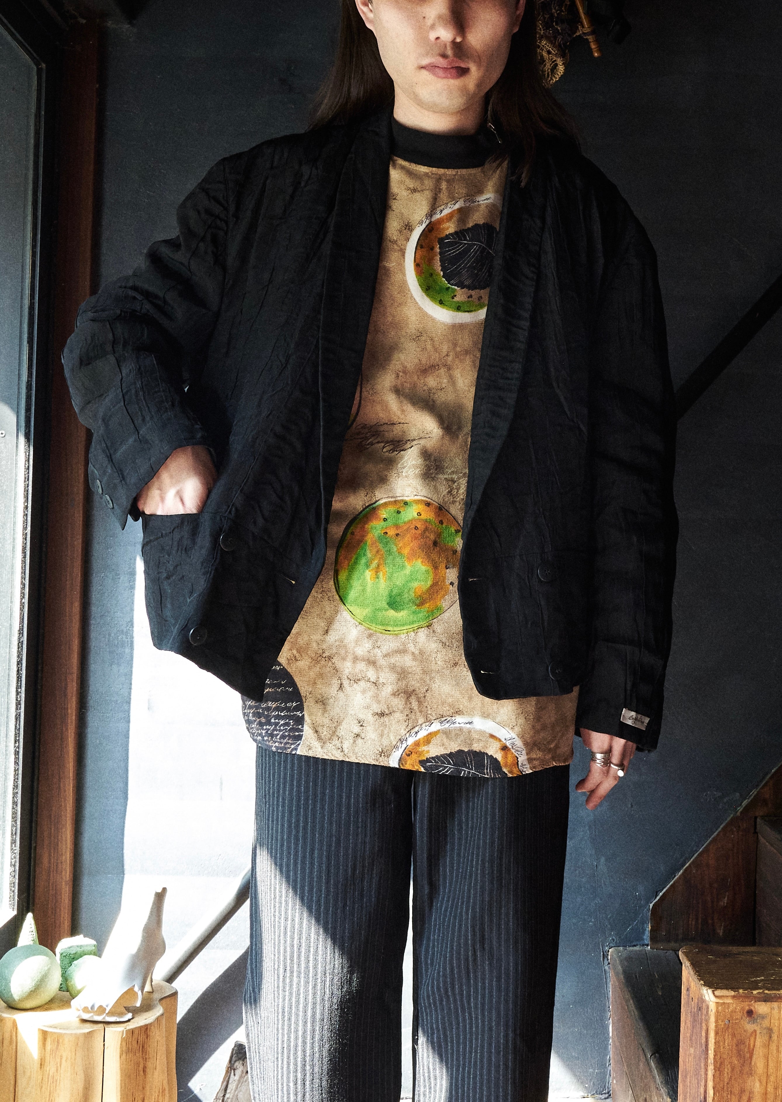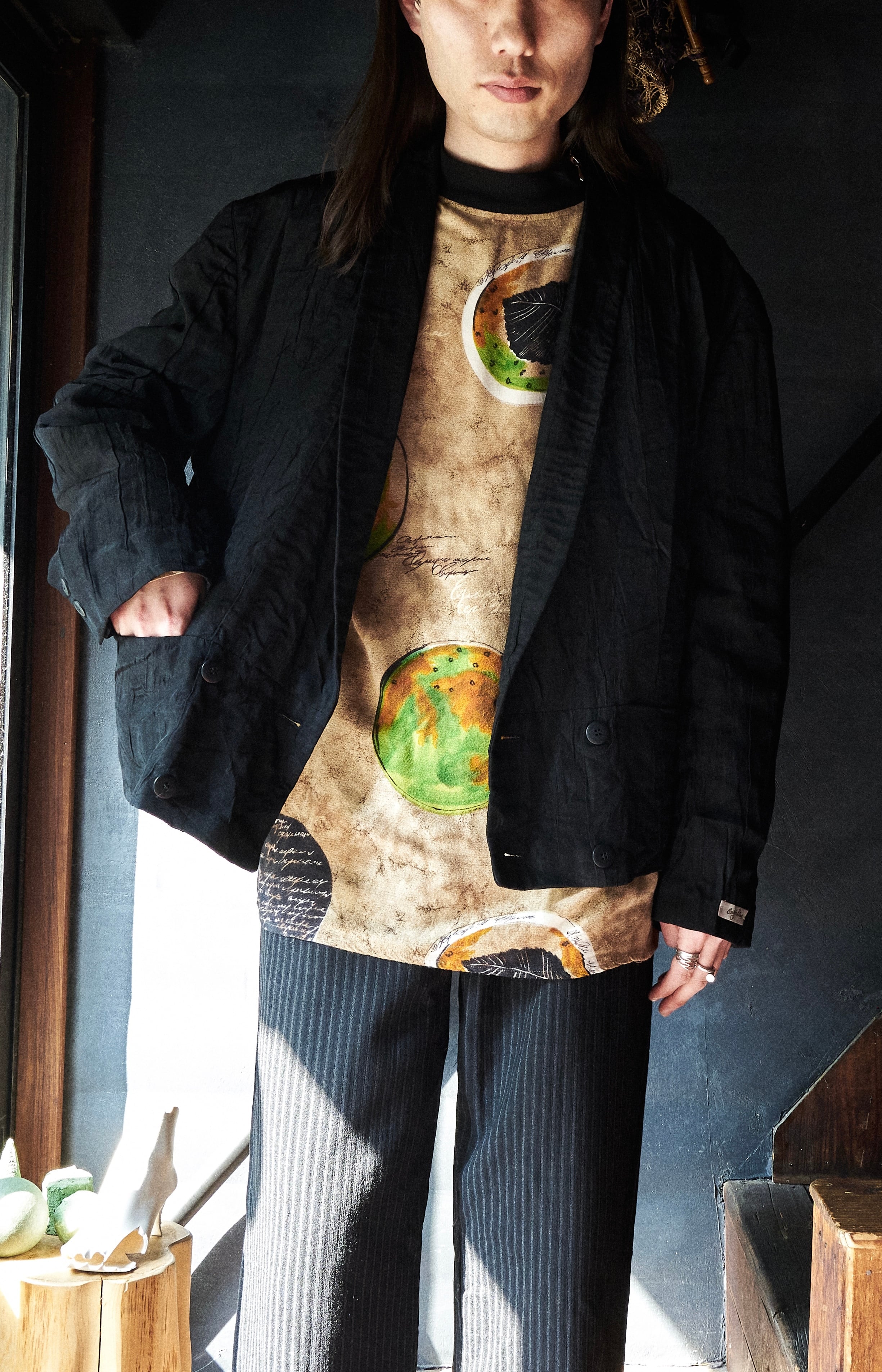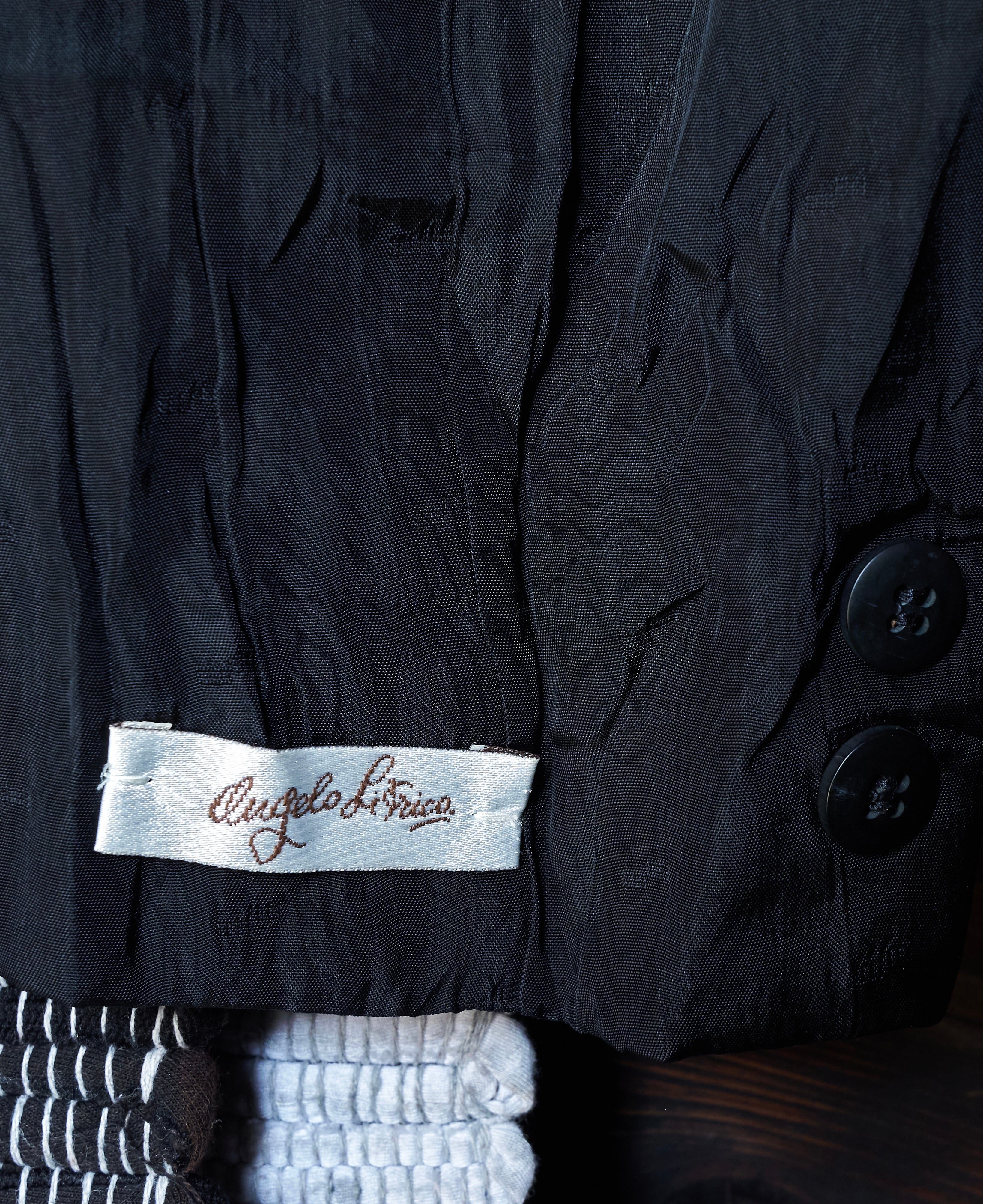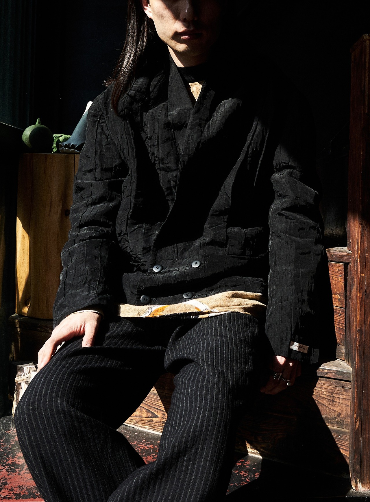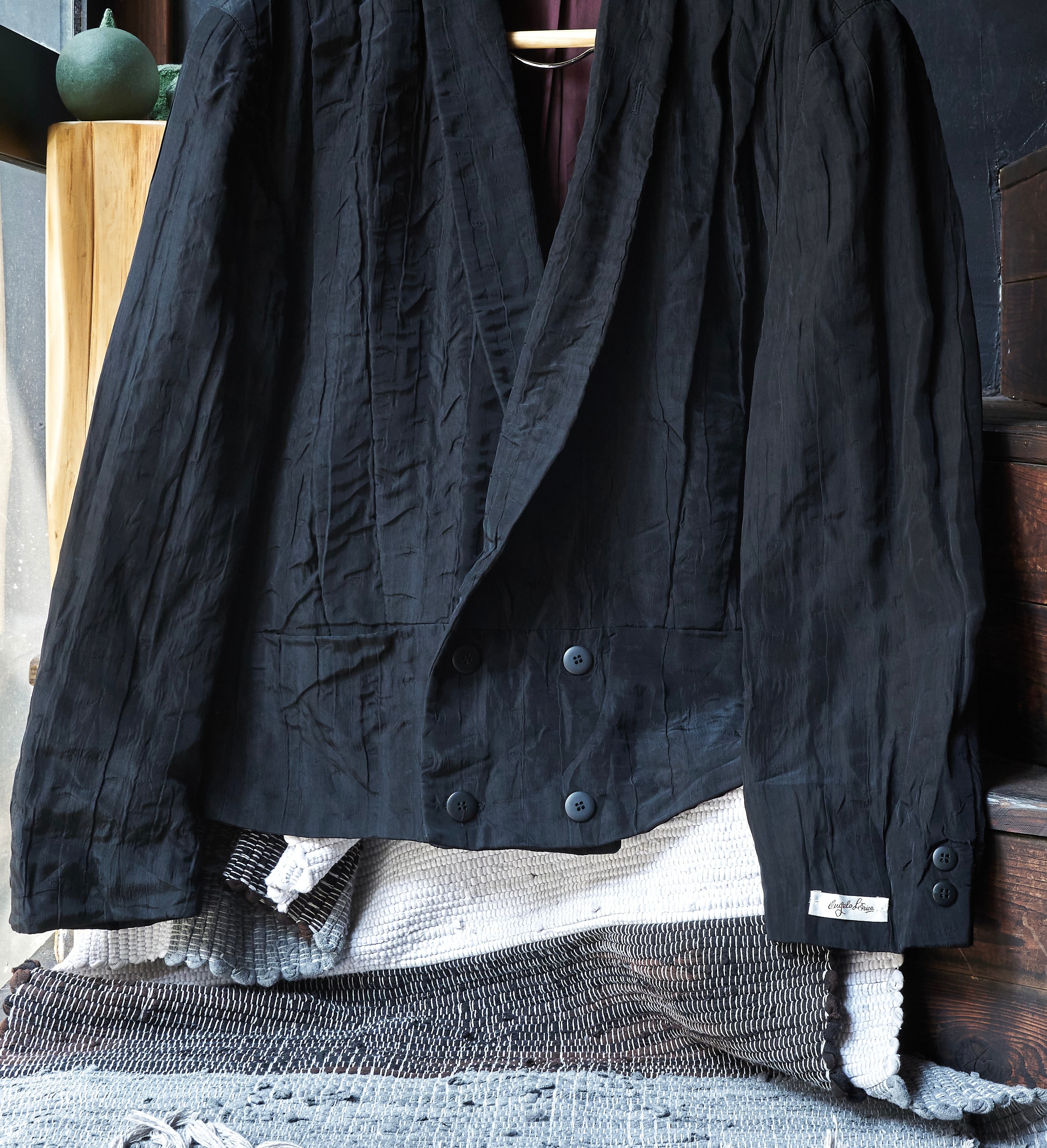 現代服としても時代にアジャストしたドレープとプリーツとシワ加工がミックスしたようなジャケット。