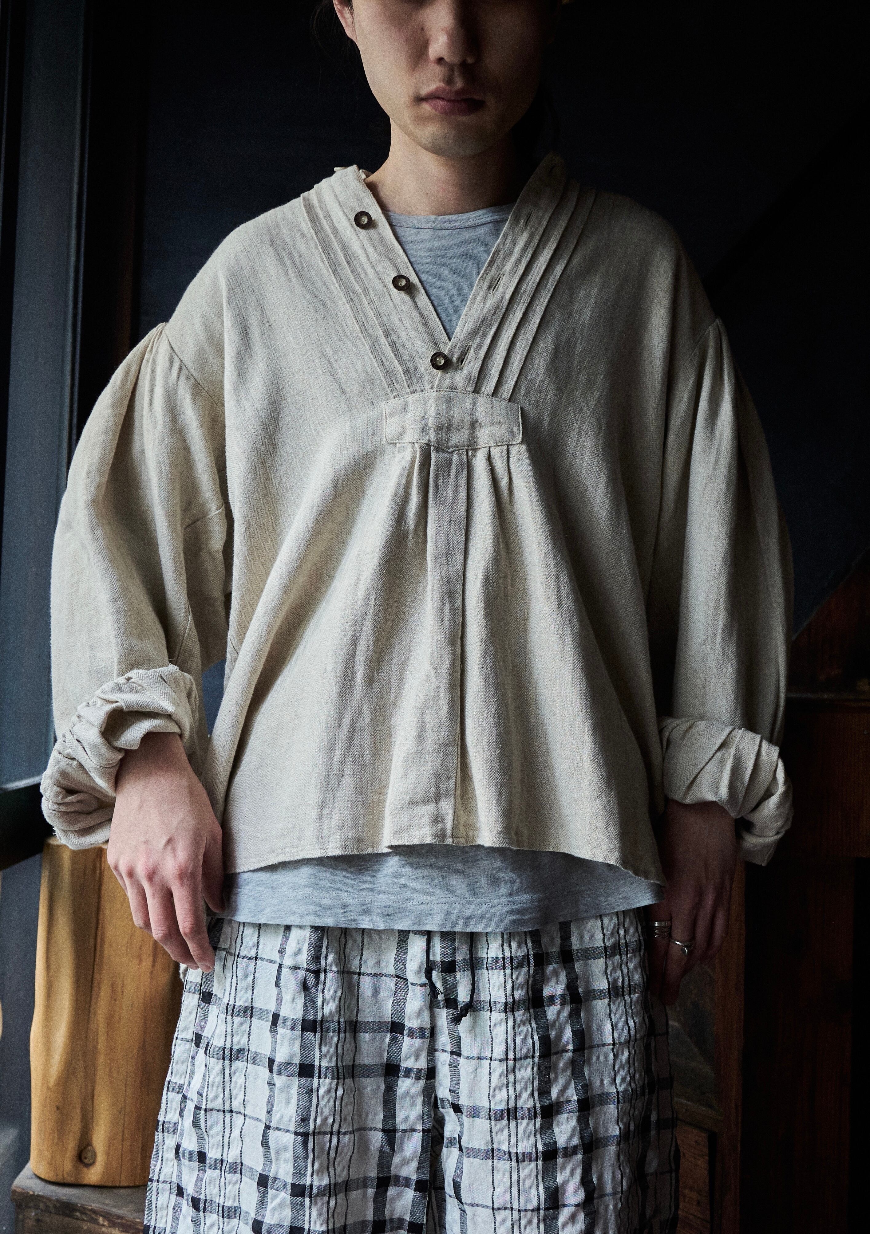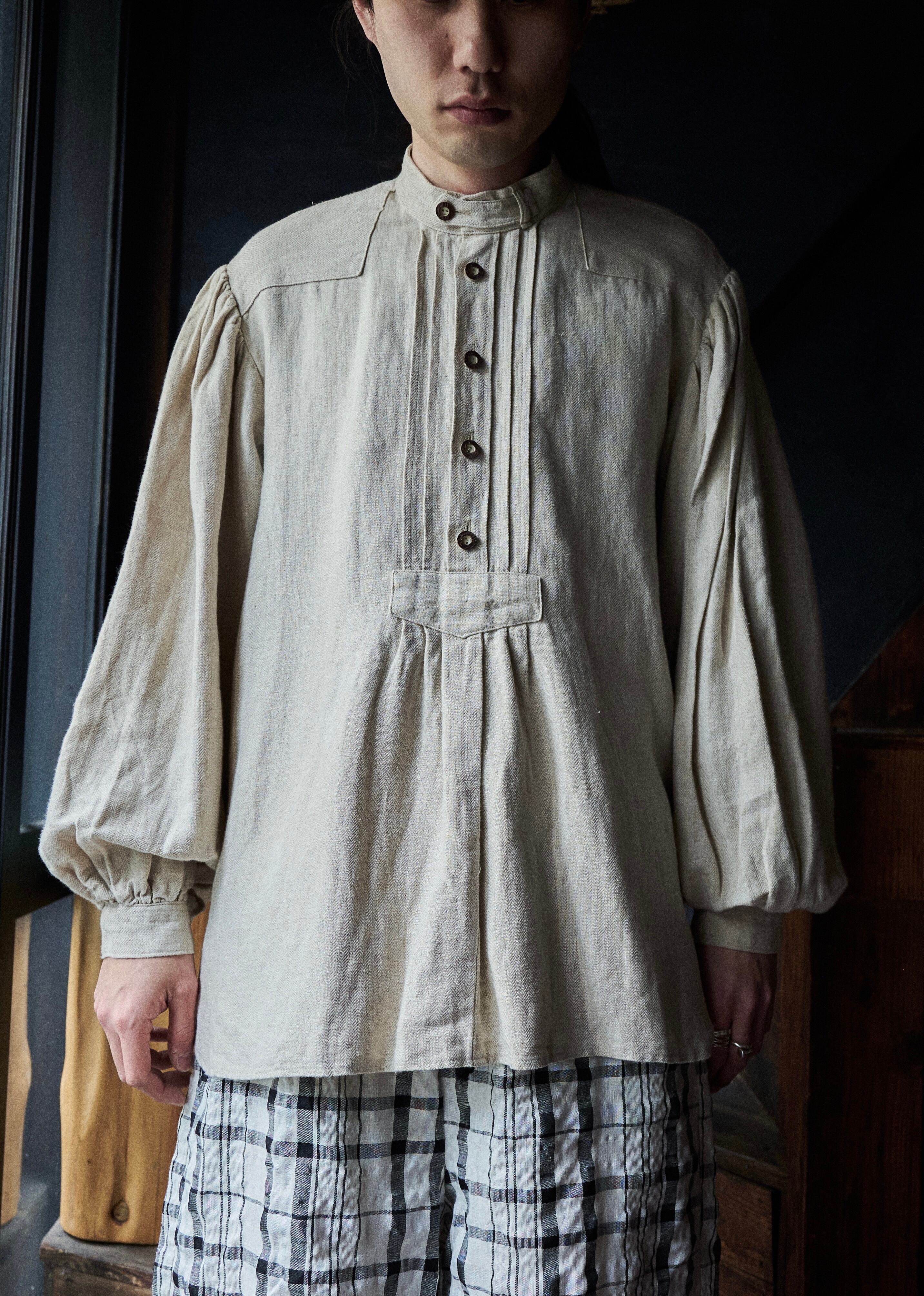 80s Austria linen x cotton fabric stand collar gathered sleeve Tyrolean shirt