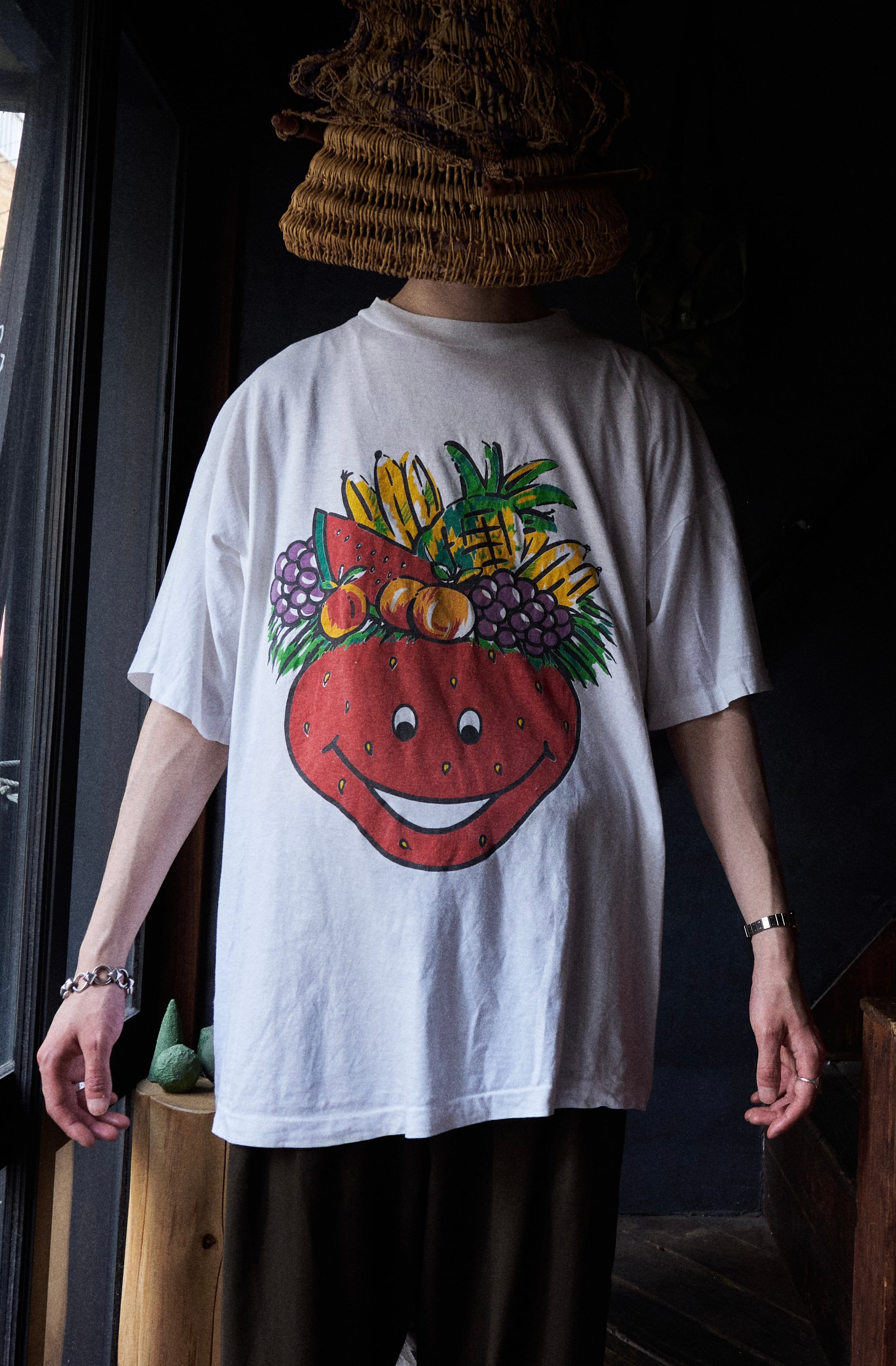 イチゴくんの顔に髪型のような帽子のようなフルーツ盛り合わせが連なったTシャツです。