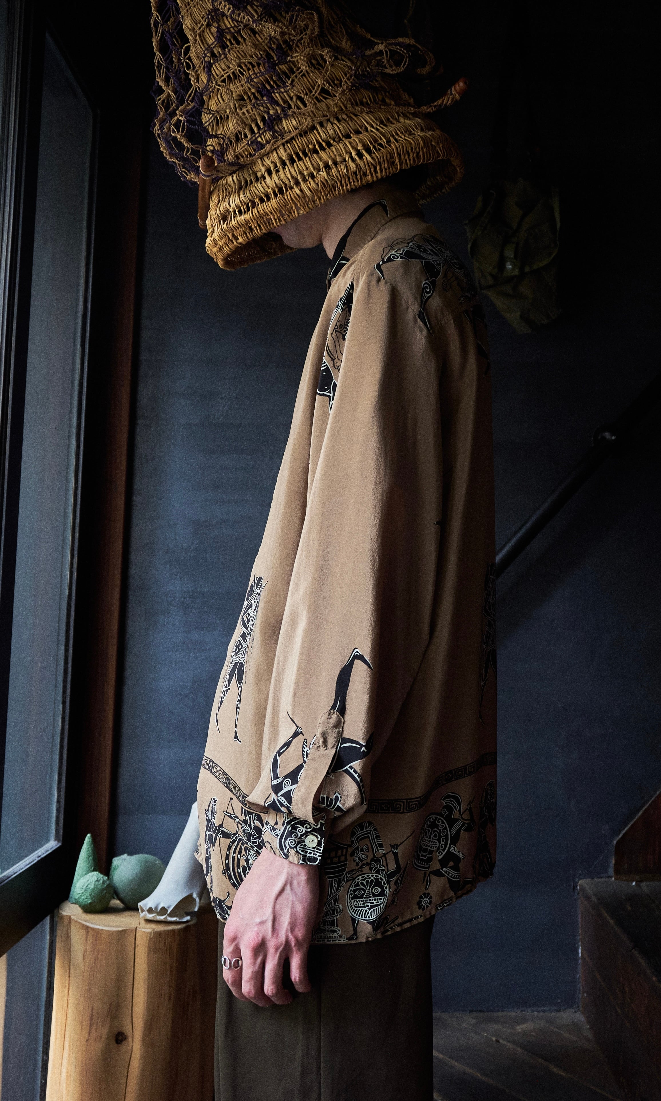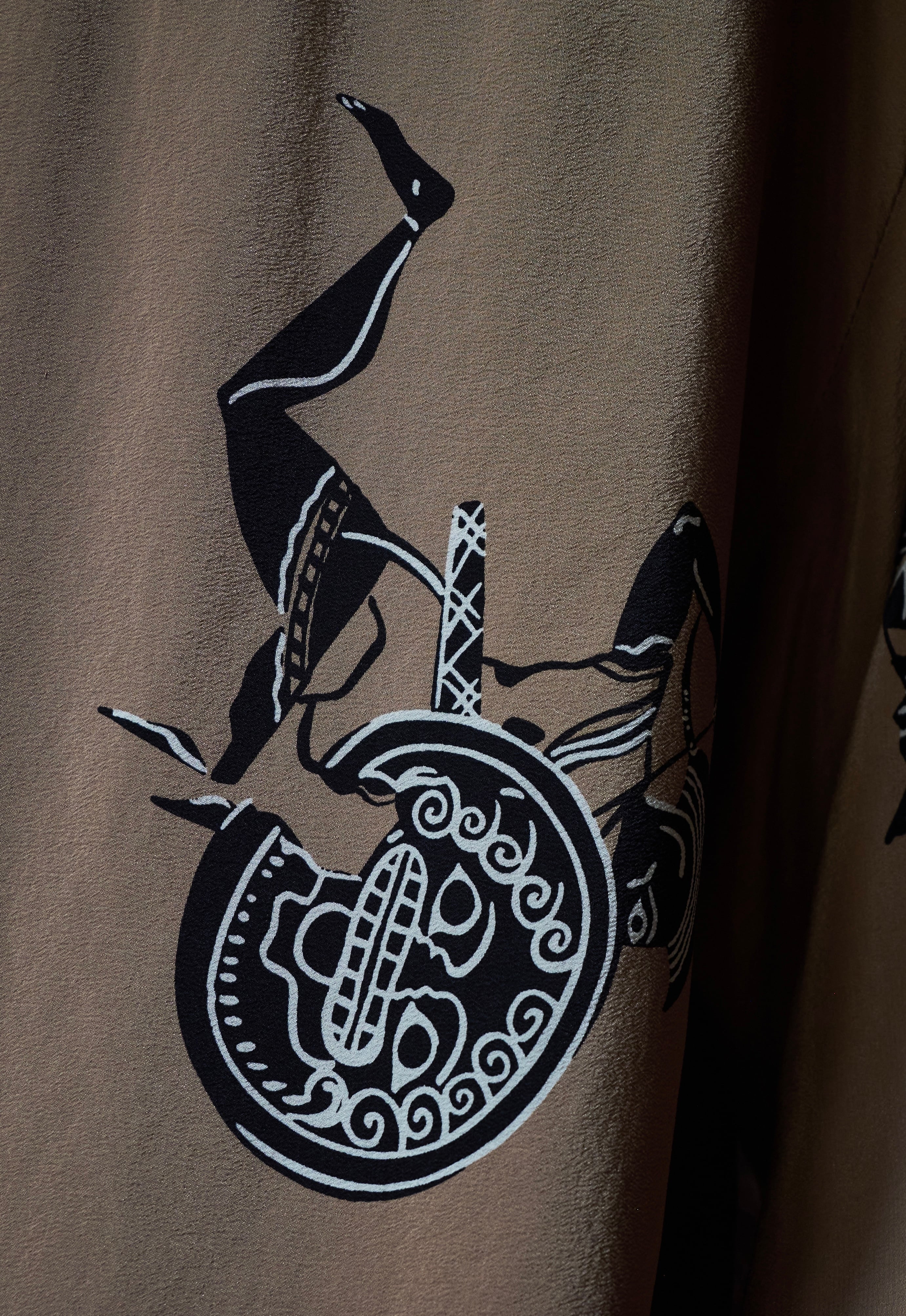 雰囲気あるプリントは古代文明を彷彿とするような柄でこの生地をきっと現代のファッションブランドは作らないであろうデザインです。