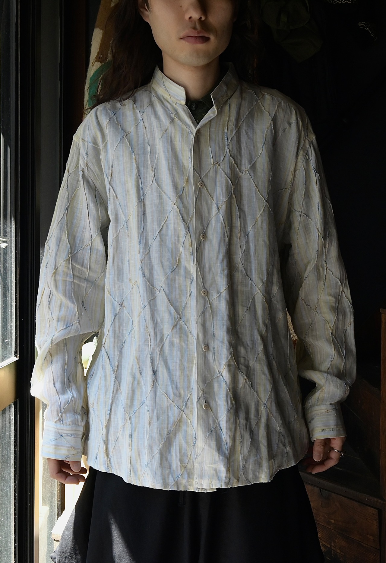 US woven linen fabric stand-up collar shirt