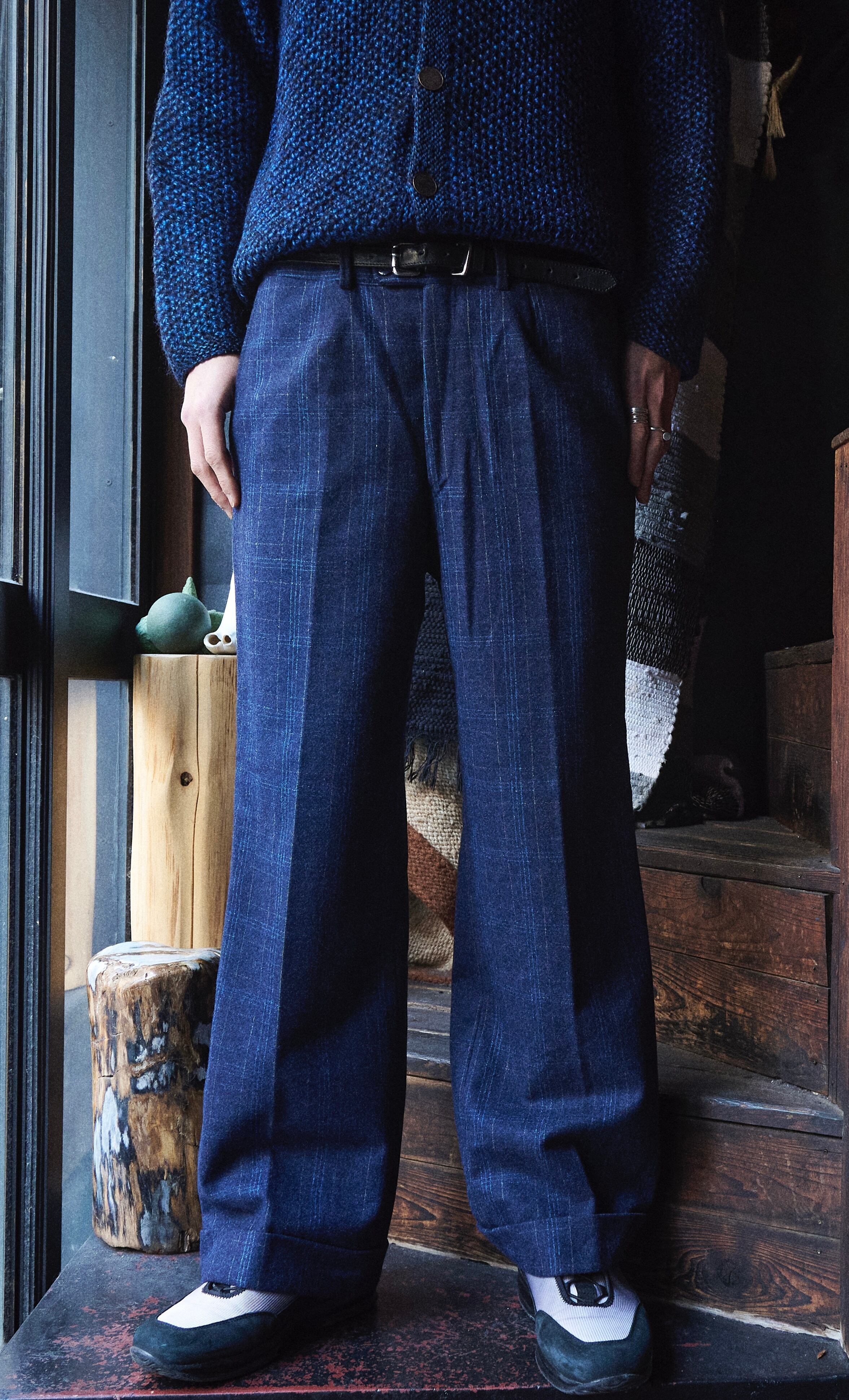 ITALY Sartoria Blue Check Wool Flared Slacks