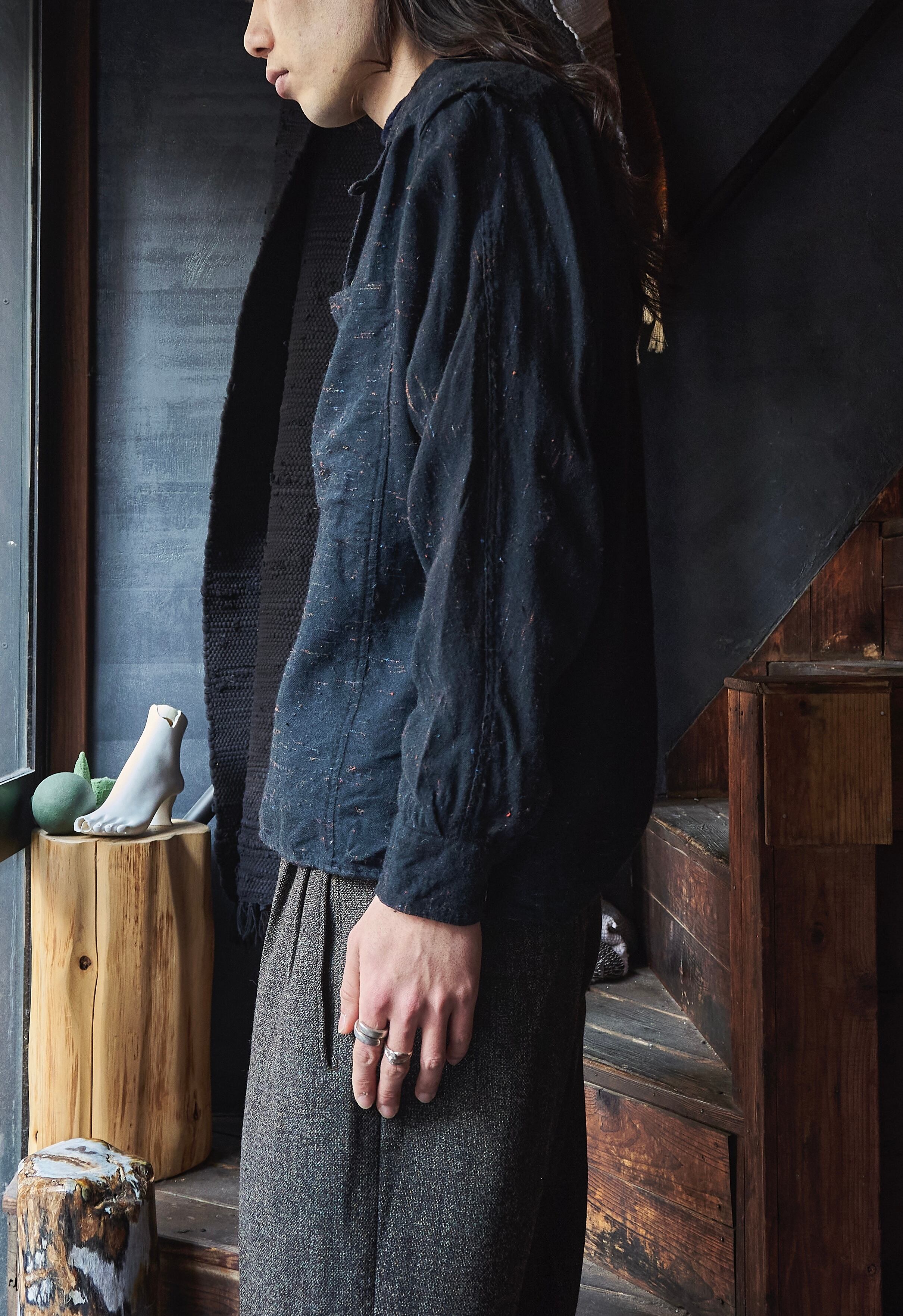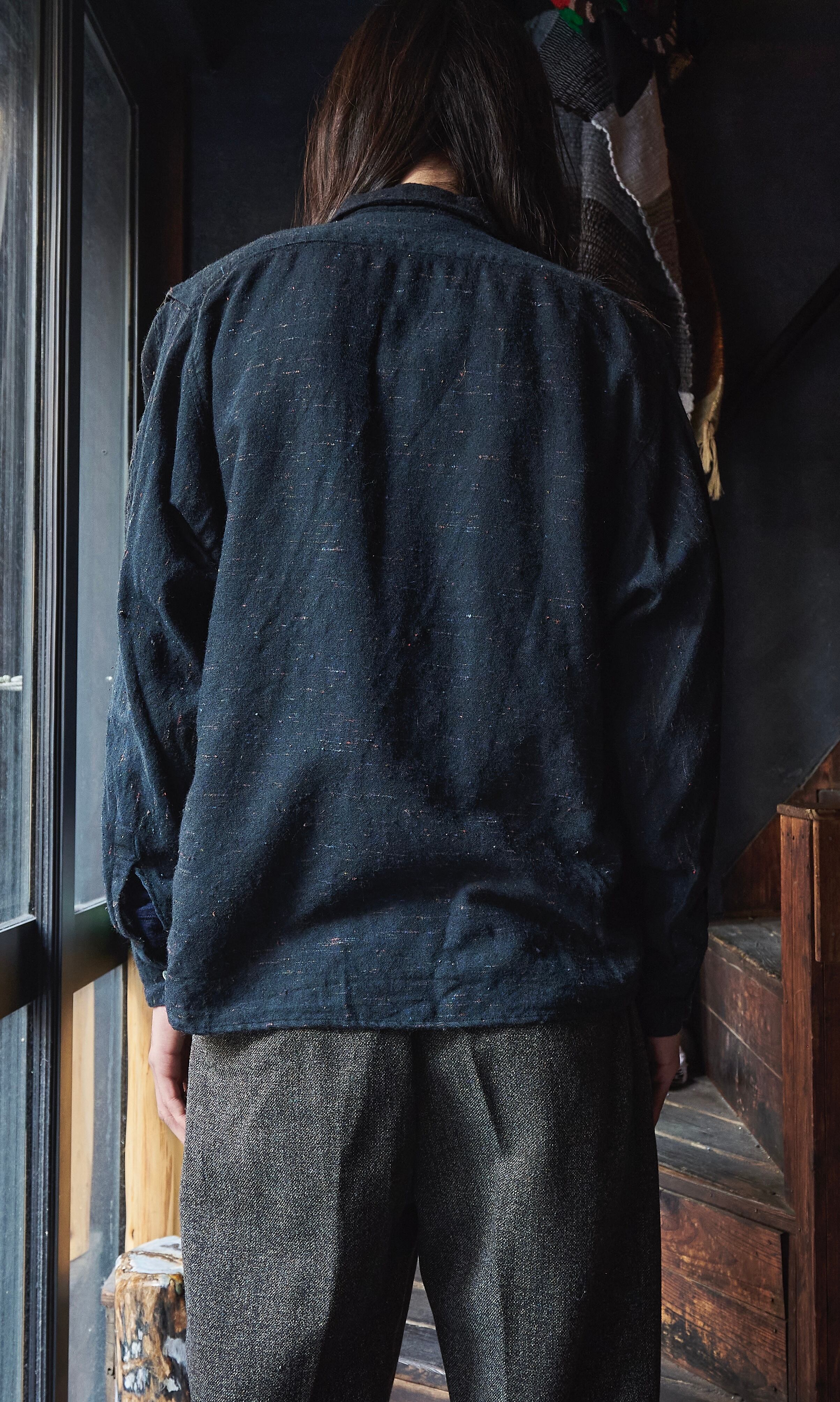 Early 2000s Euro Woven Colorful Nep Black Wool Open Collar Wide Shirt